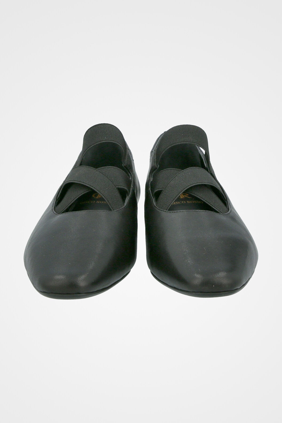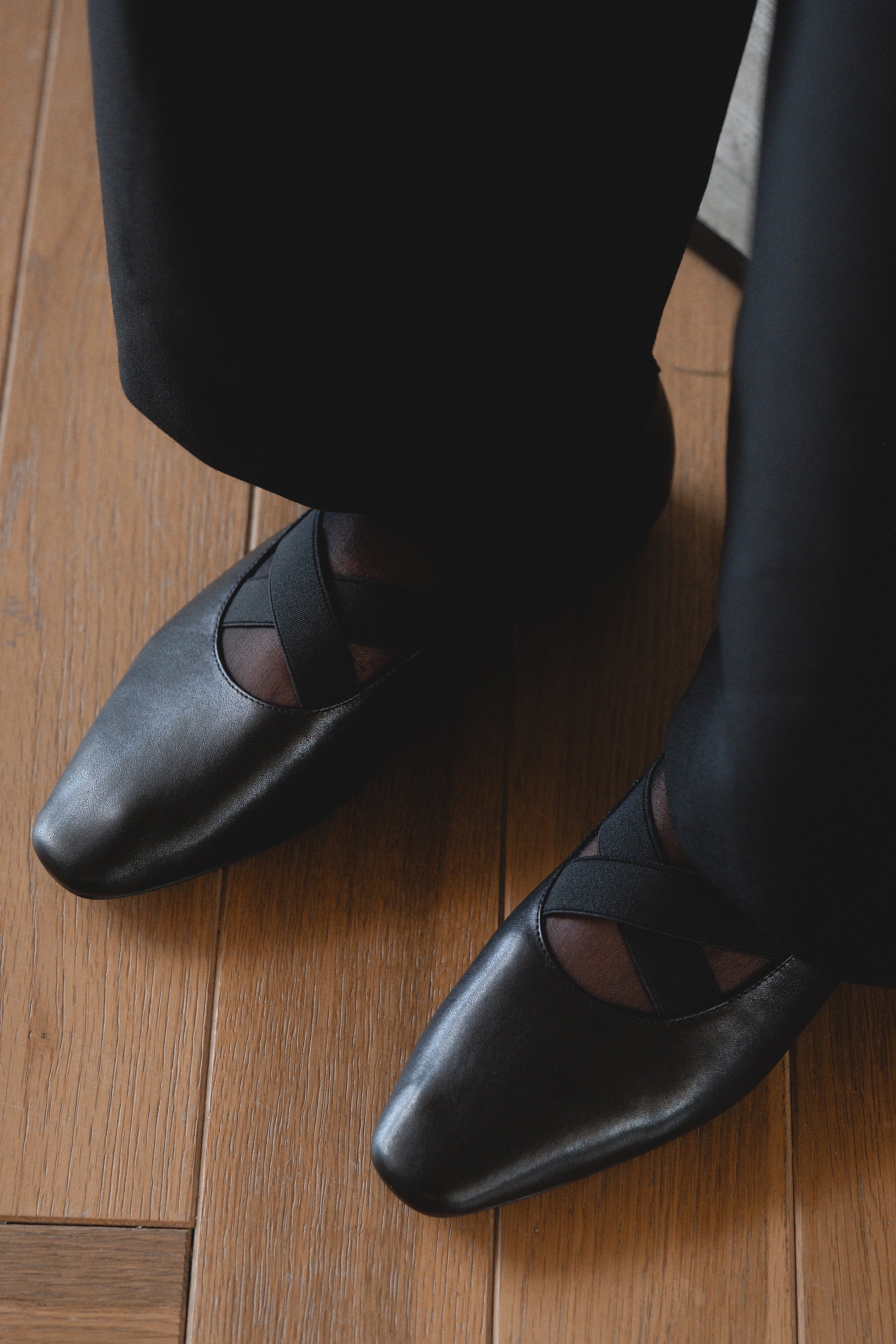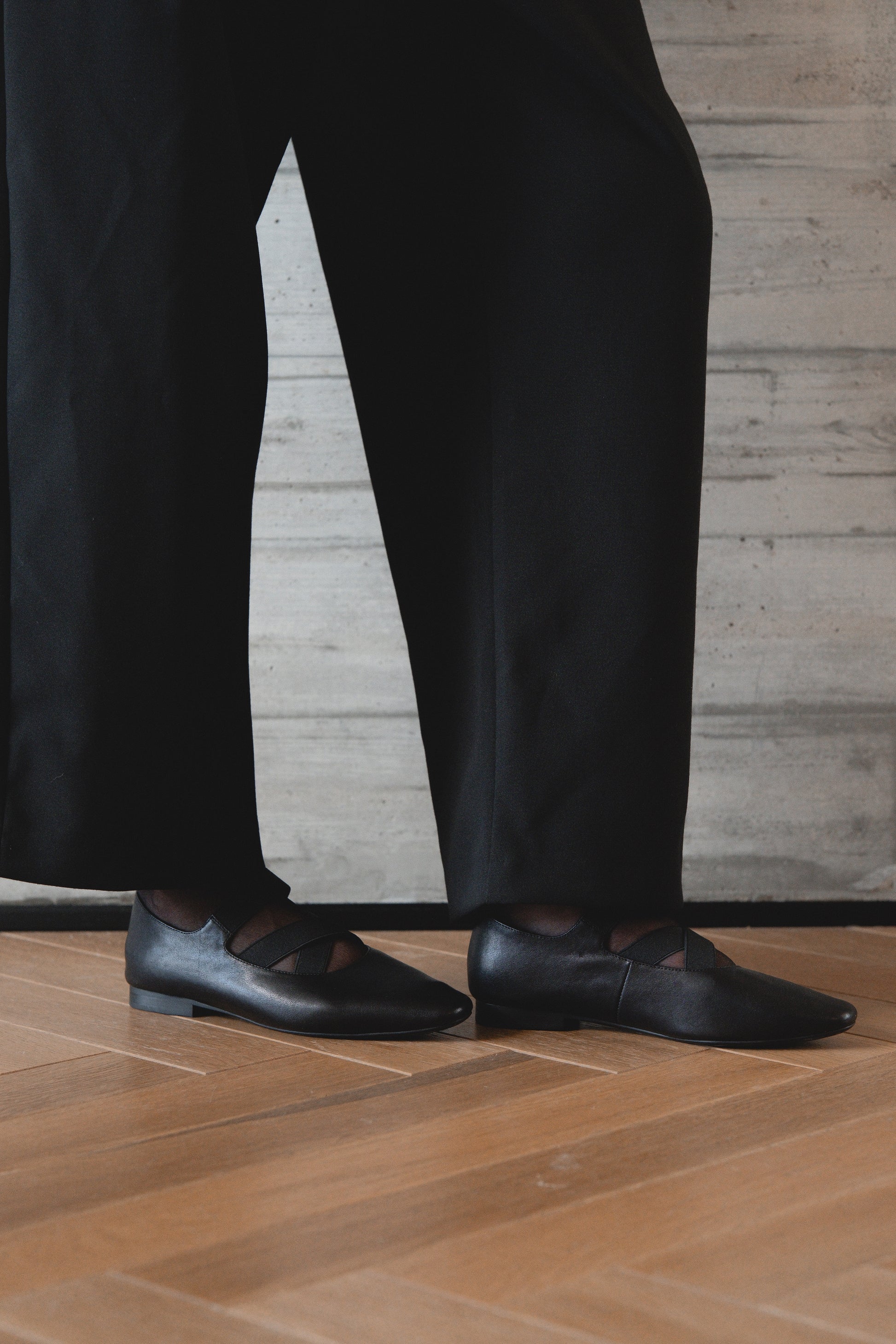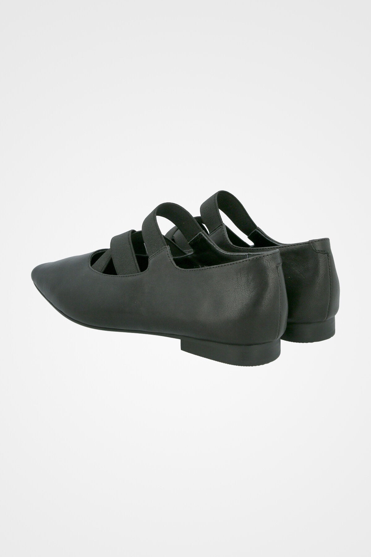 נעל שטוחה בצבע שחור, חרטום מחודד, שלוש רצועות אלכסוניות בחזית וסוליה שחורה ודקה
