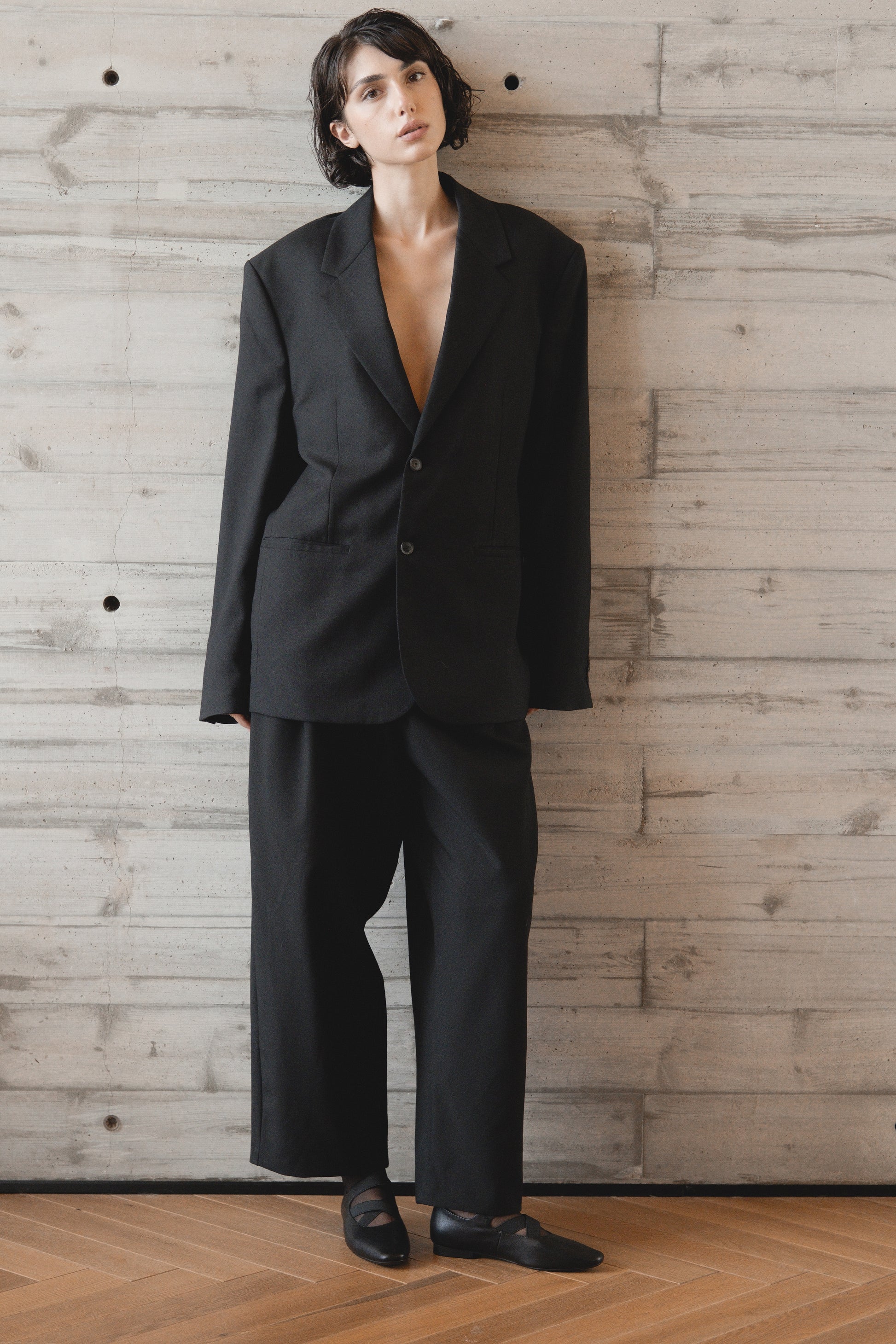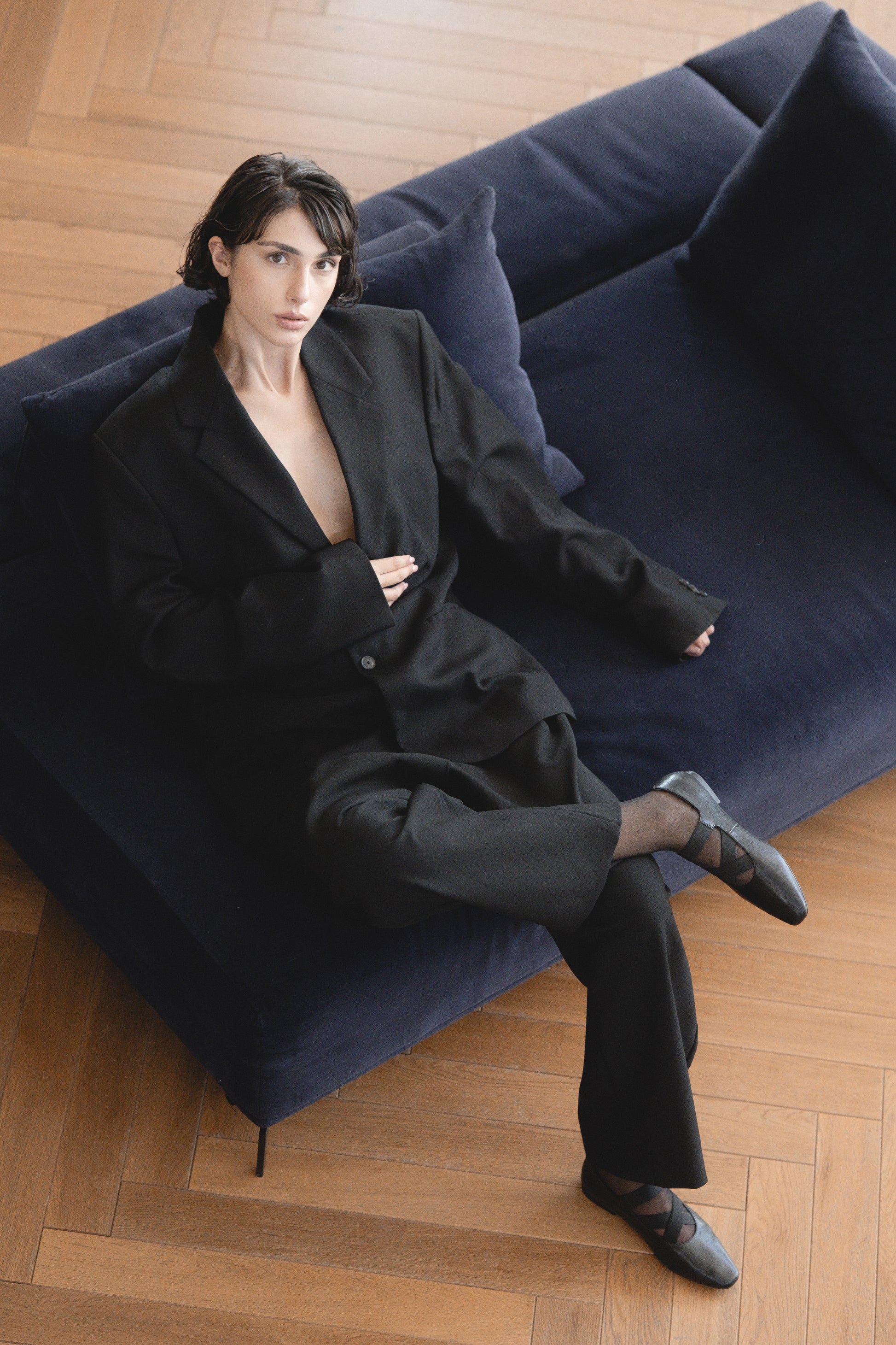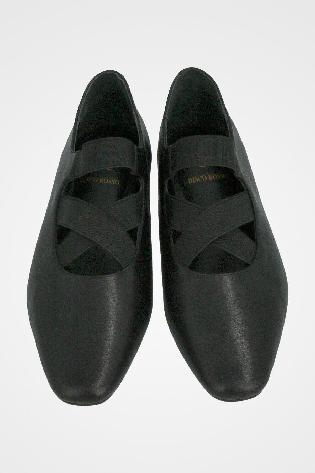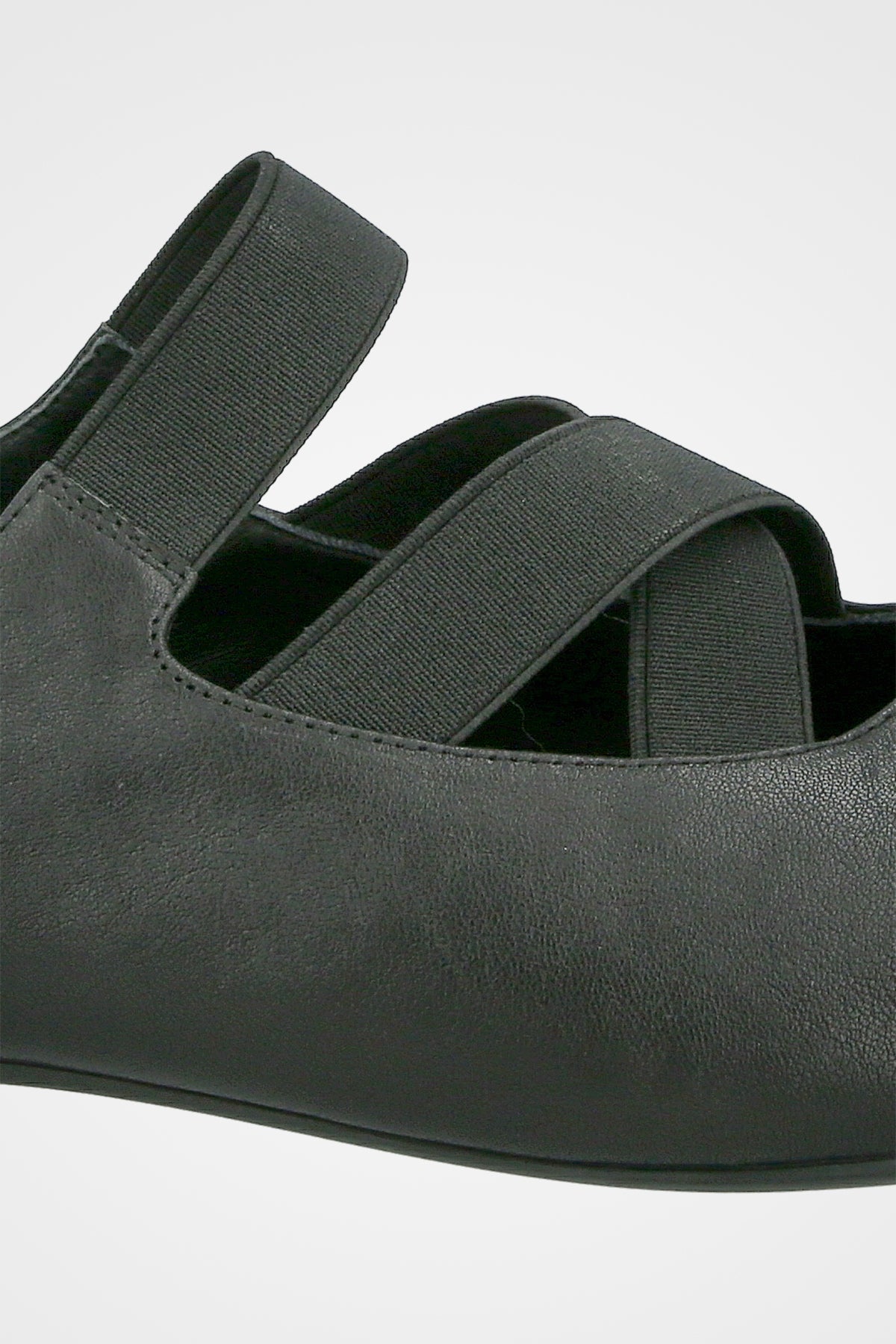 נעל שטוחה בצבע שחור, חרטום מחודד, שלוש רצועות אלכסוניות בחזית וסוליה שחורה ודקה