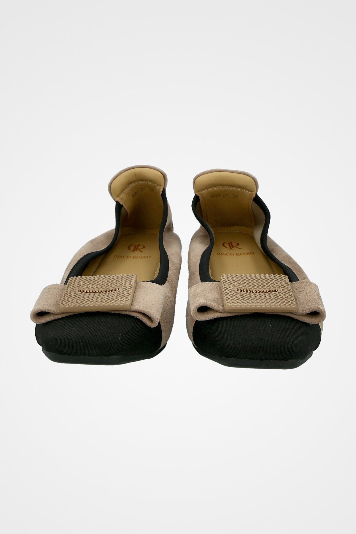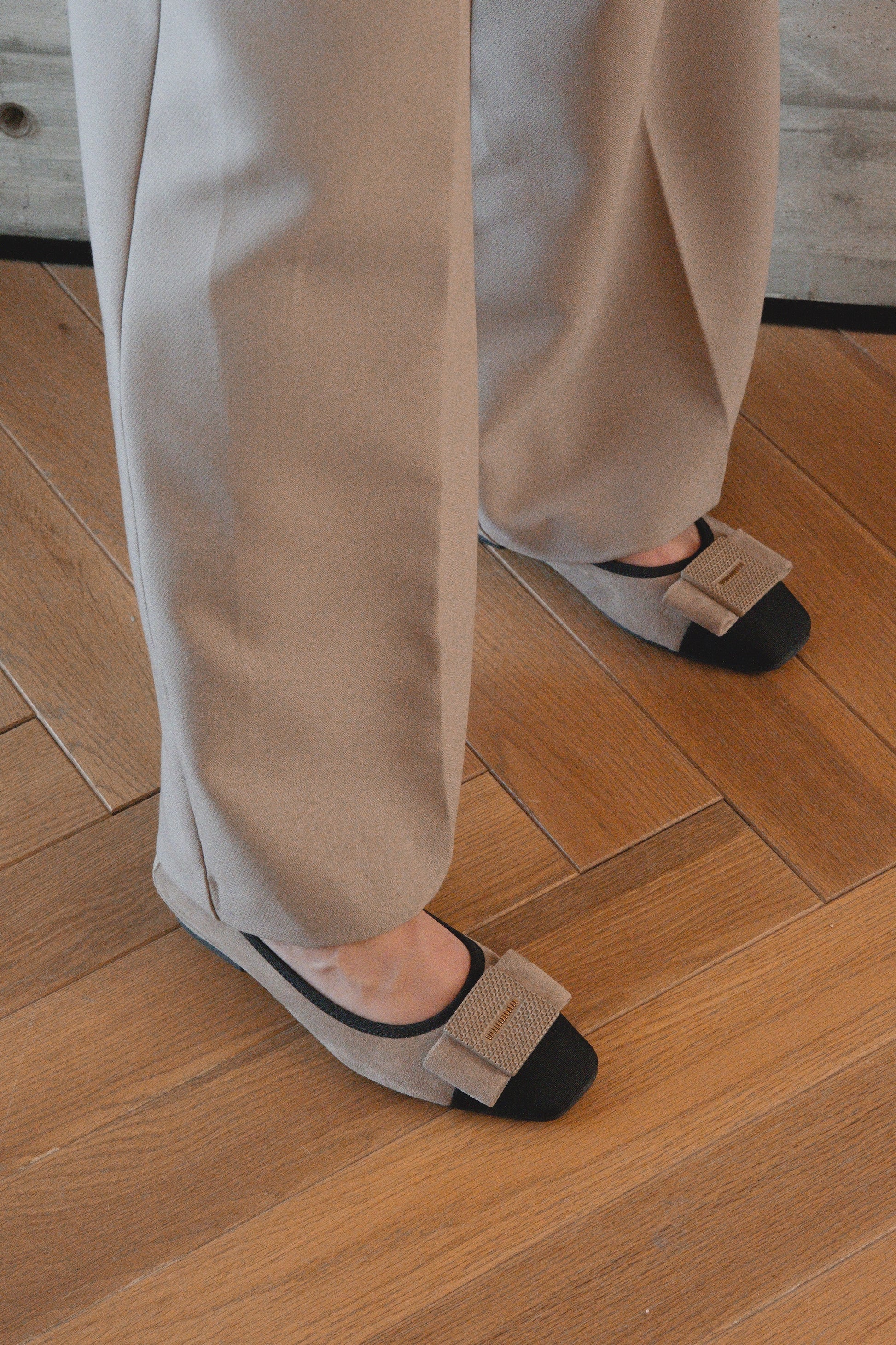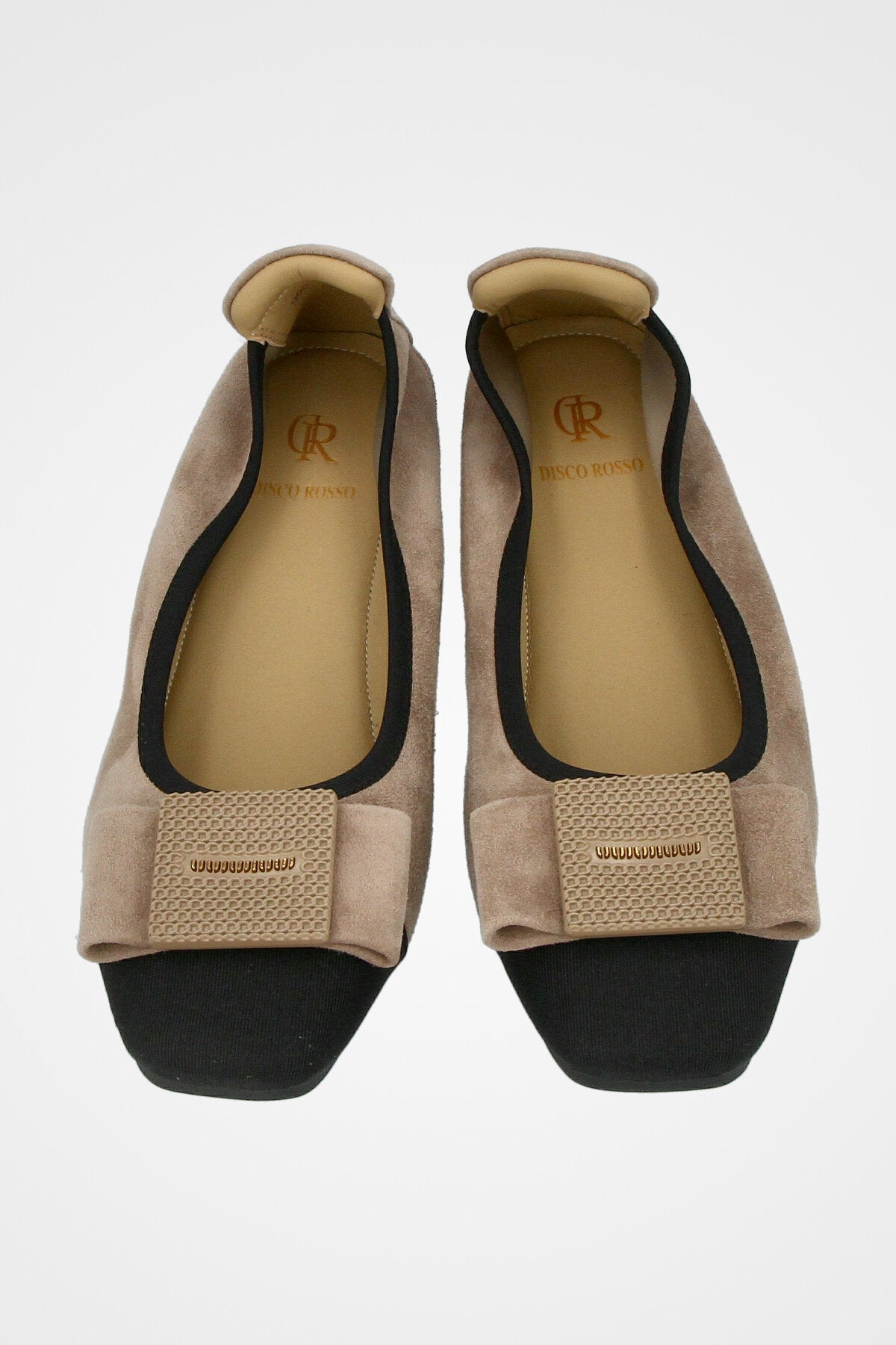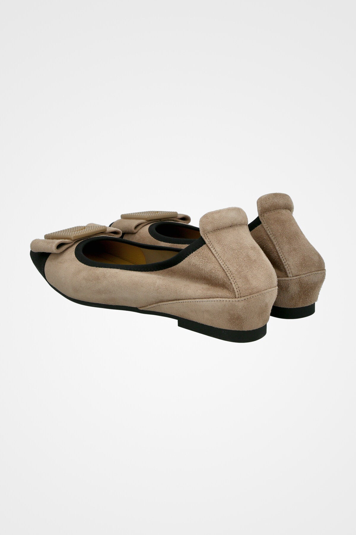 נעל בובה שטוחה בז׳, עם קדמת זמש שחורה מעוטרת אבזם ריבועי תואם בעל מראה אלגנטי וקלאסי