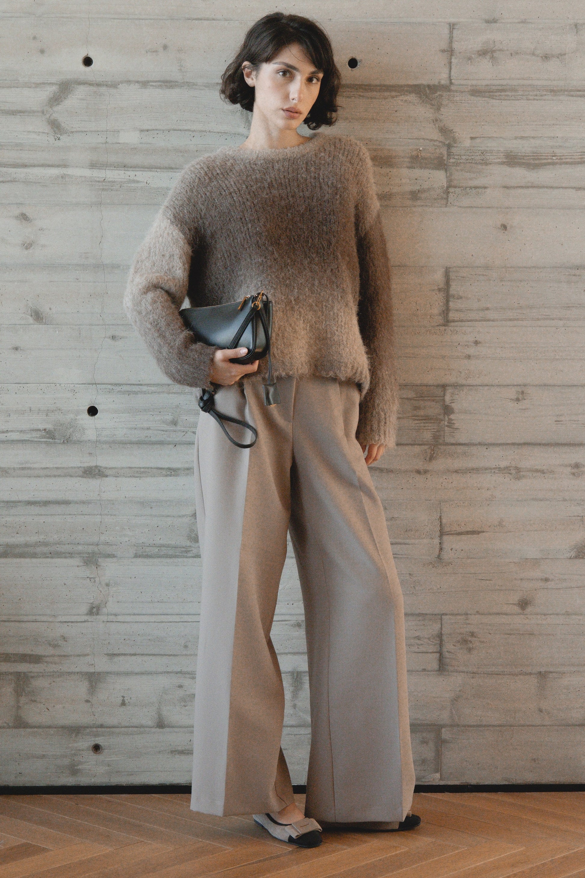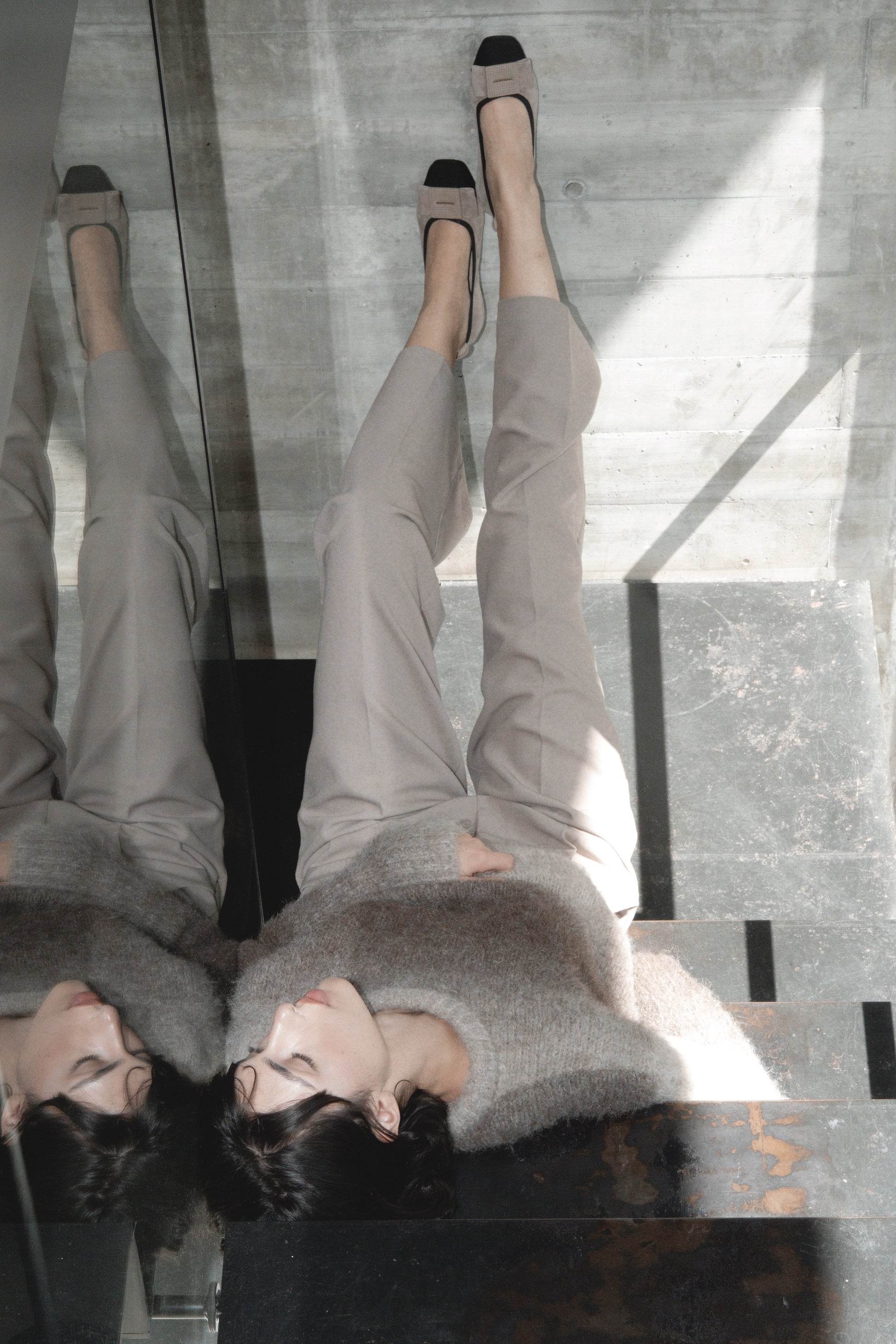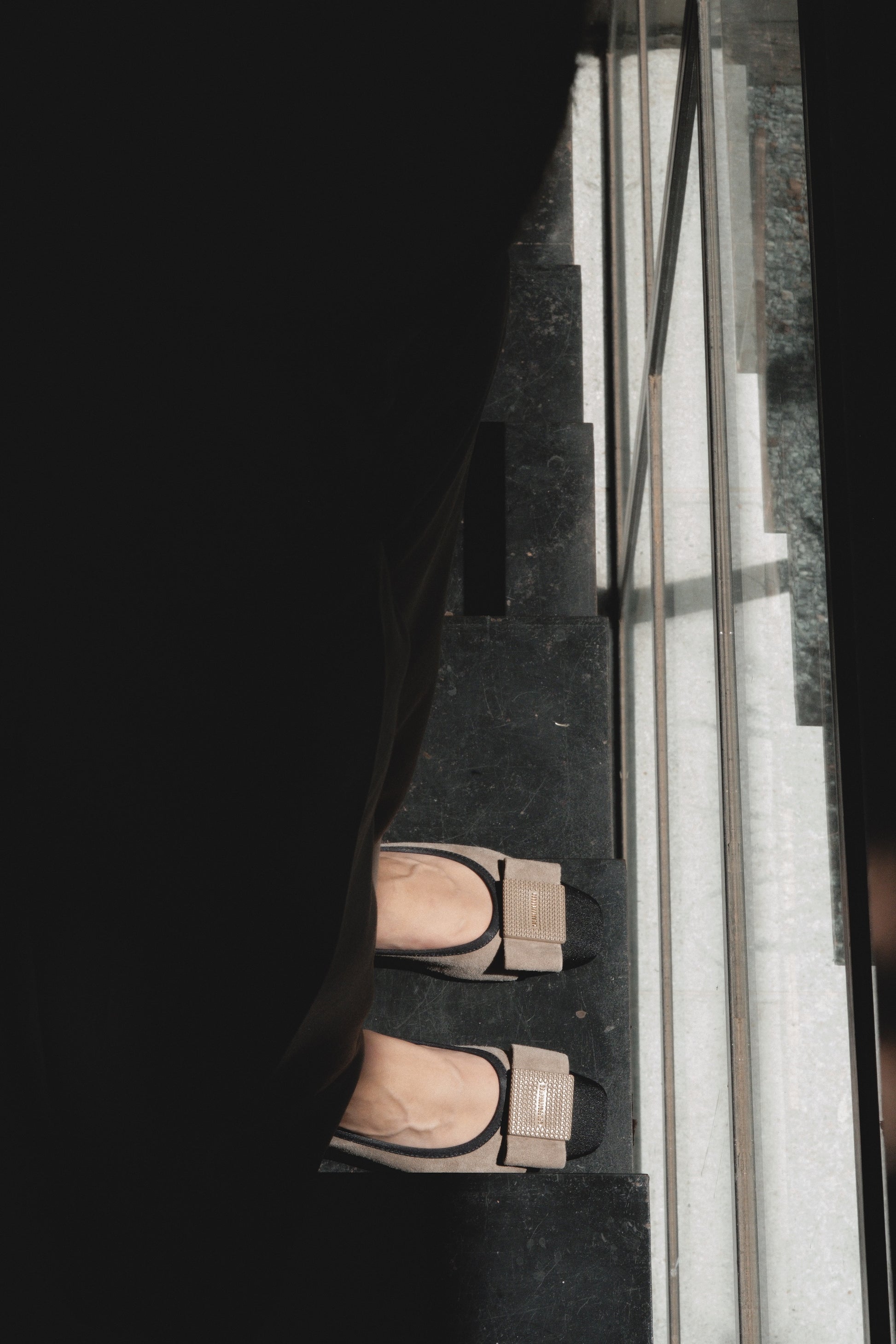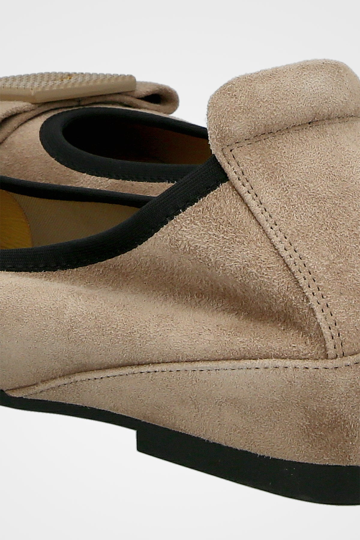נעל בובה שטוחה בז׳, עם קדמת זמש שחורה מעוטרת אבזם ריבועי תואם בעל מראה אלגנטי וקלאסי