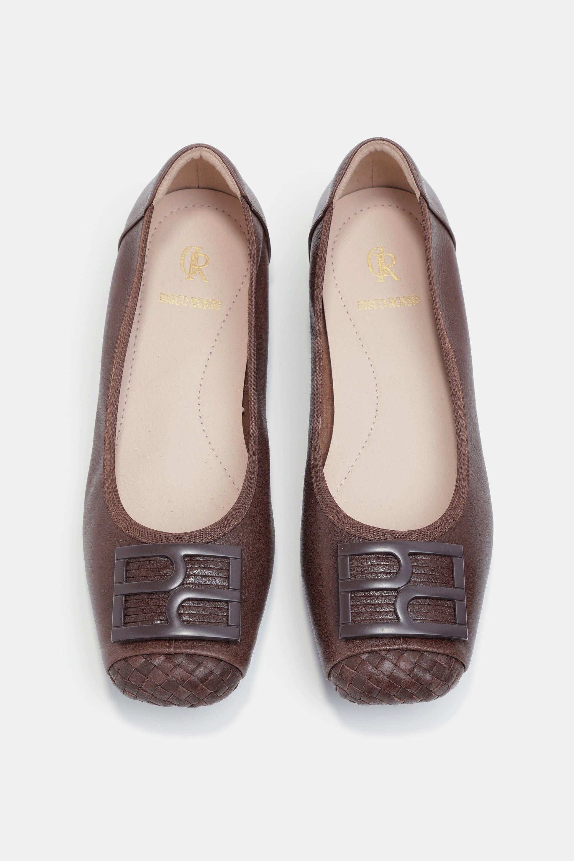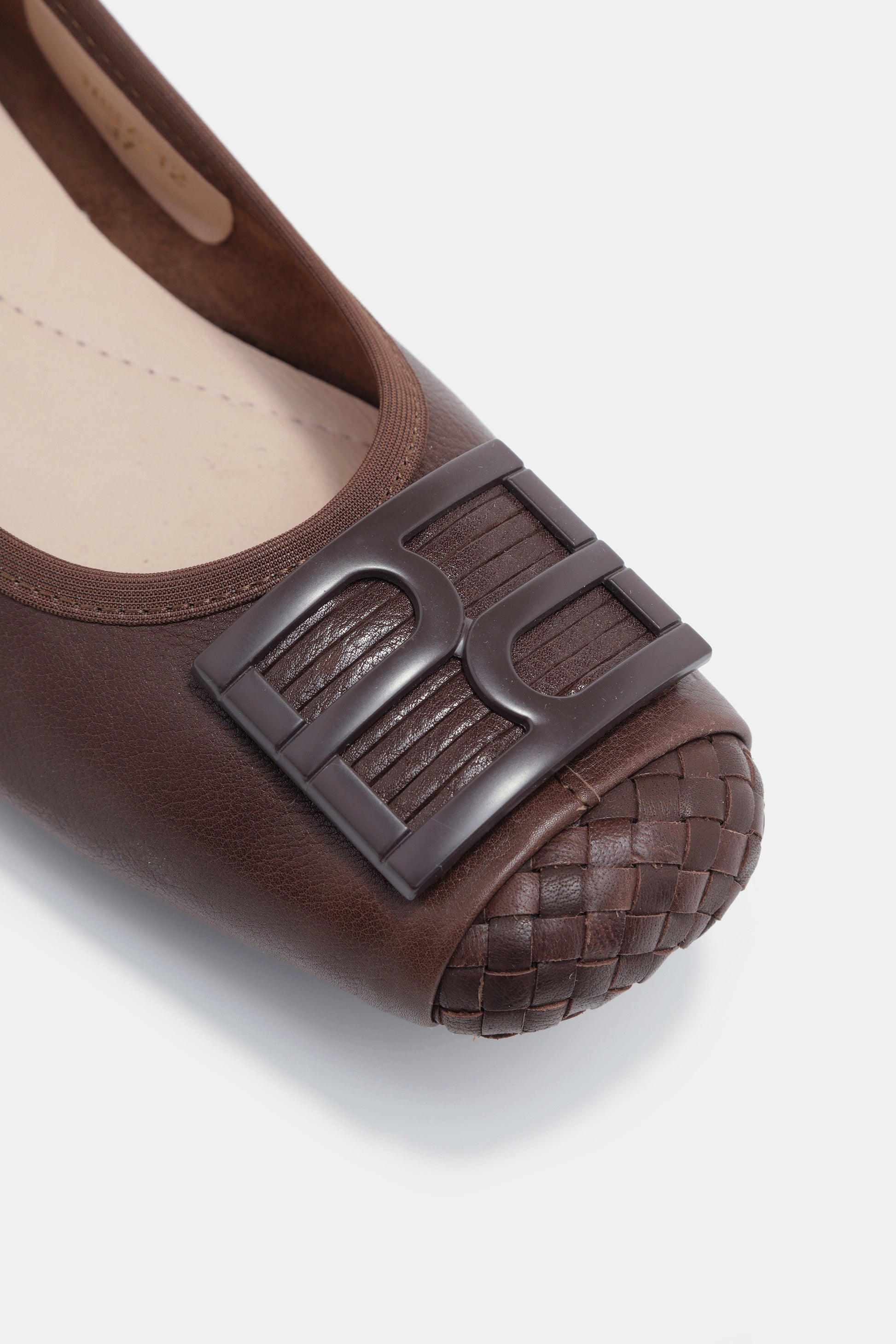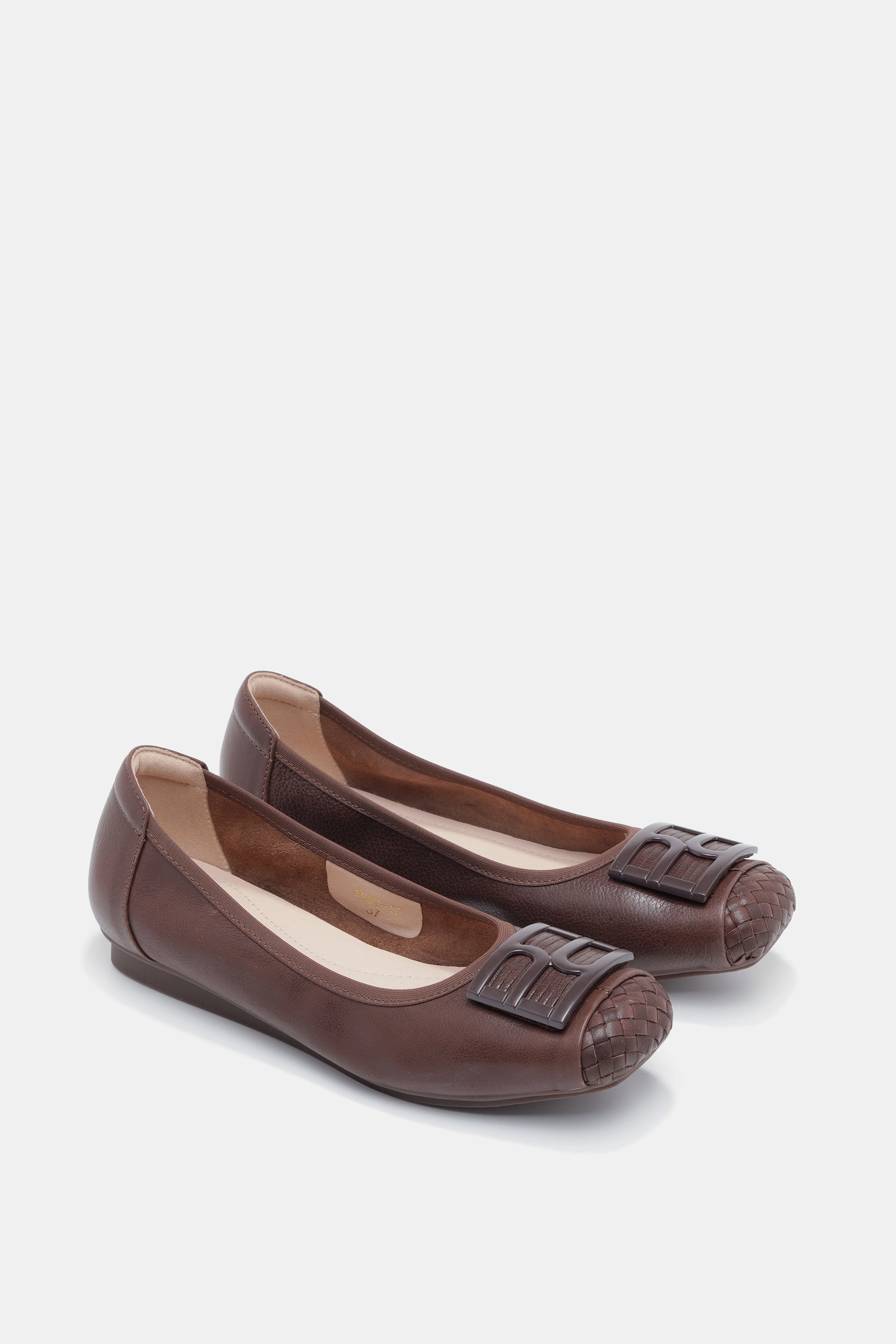 נעלי בובה בצבע קפה , עיצוב נקי ,עם חזית קלועה ואבזם תואם בשילוב סוליה שטוחה ונוחה