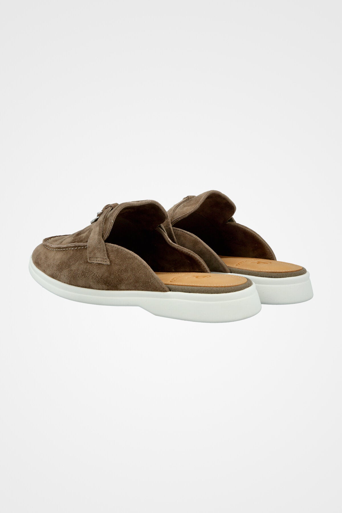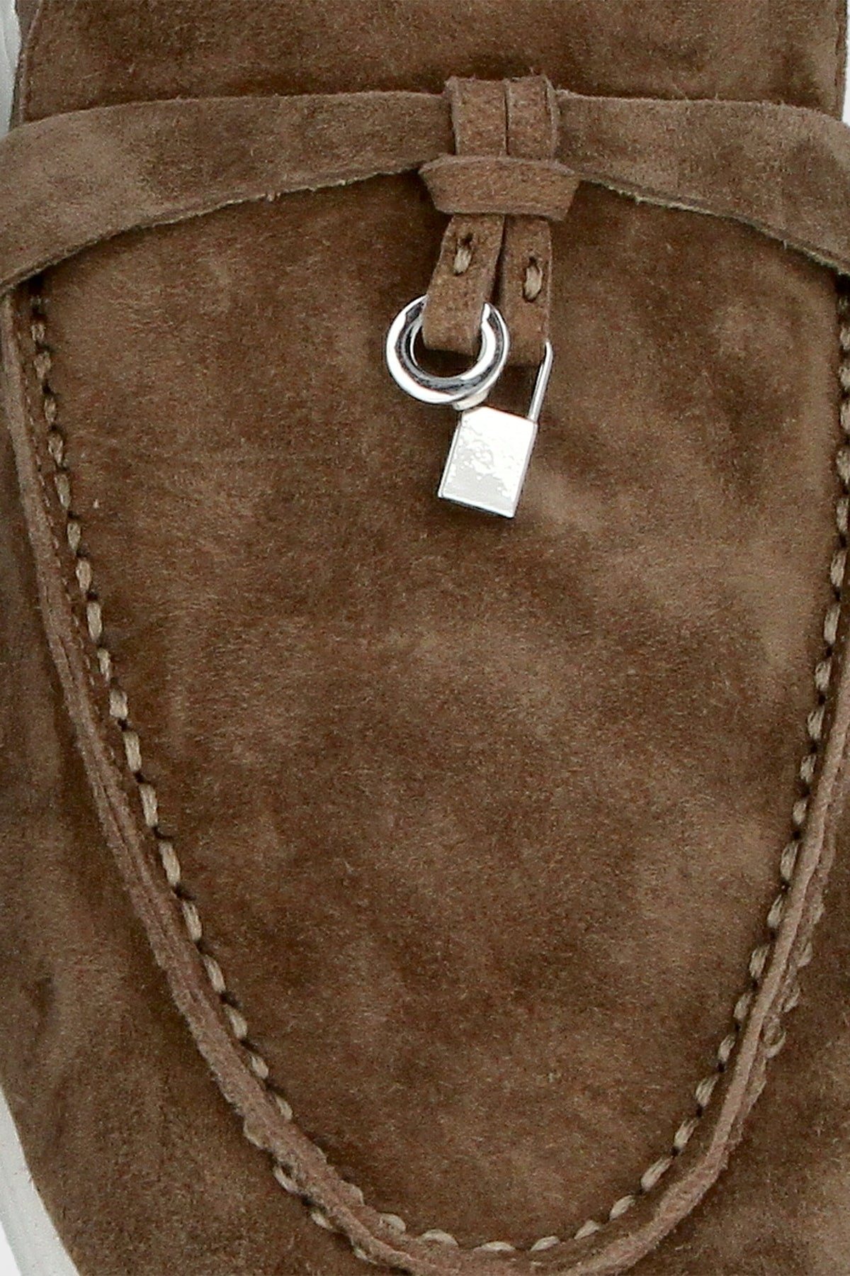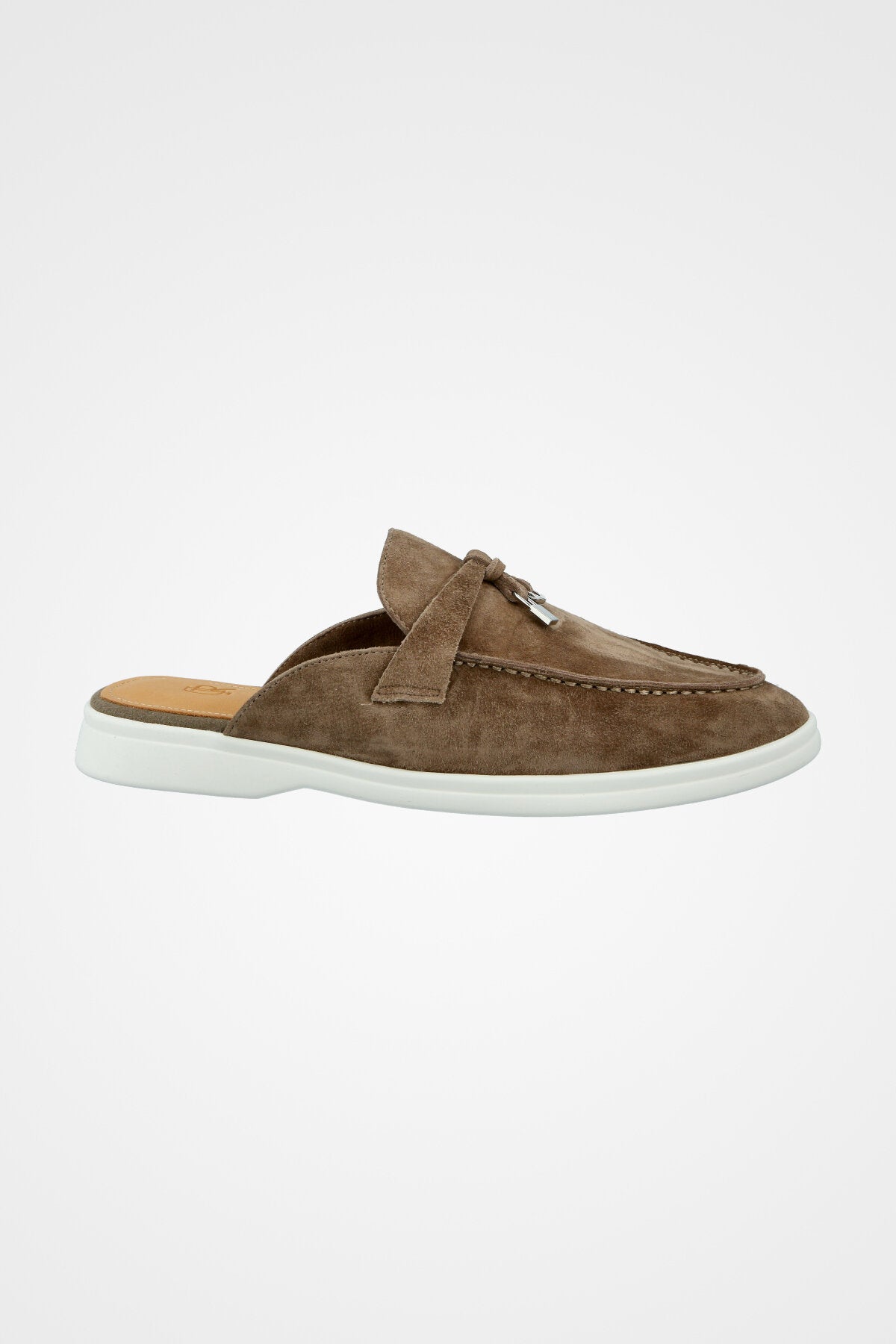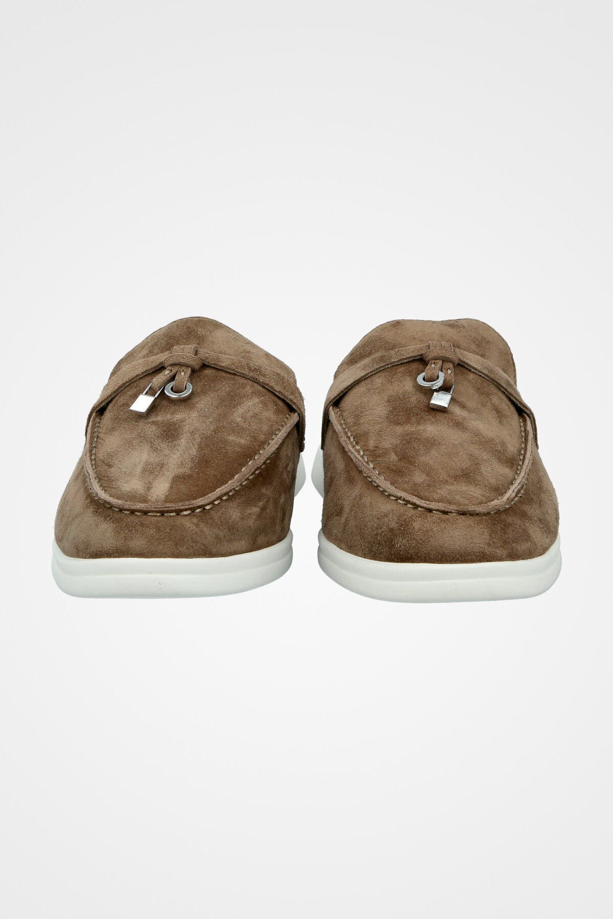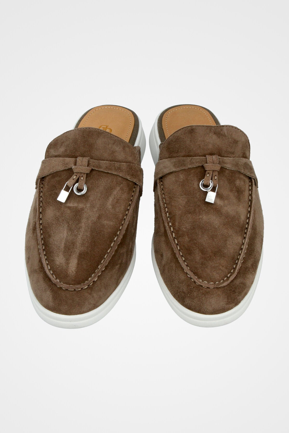 מוקסין כפכף בצבע חומה זמש, עם תפירה בולטת וקישוט מתכתי אלגנטי על העליונה