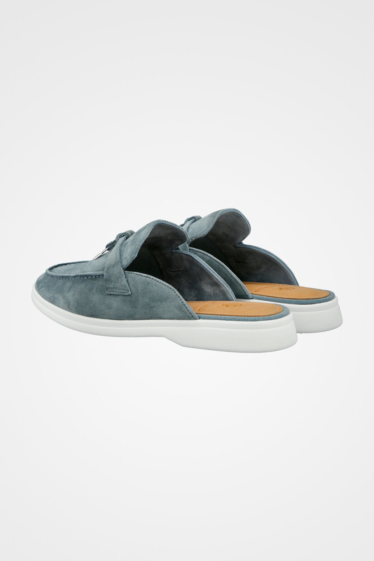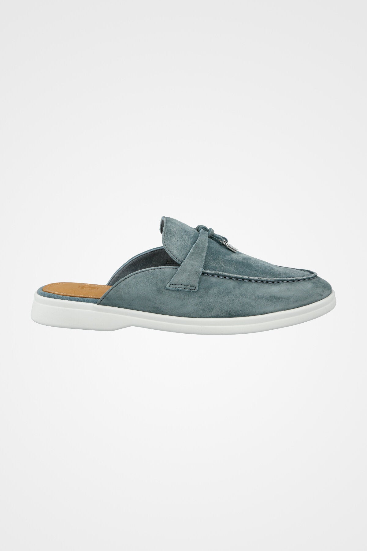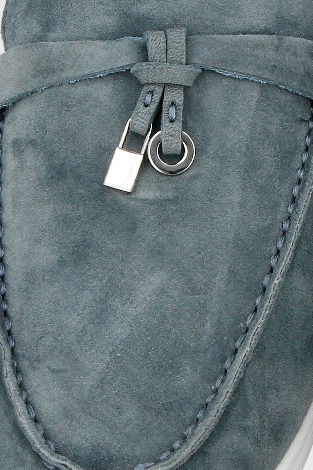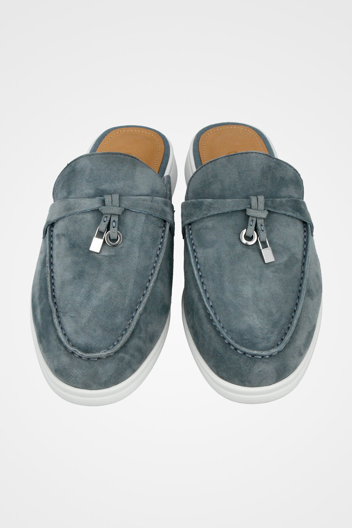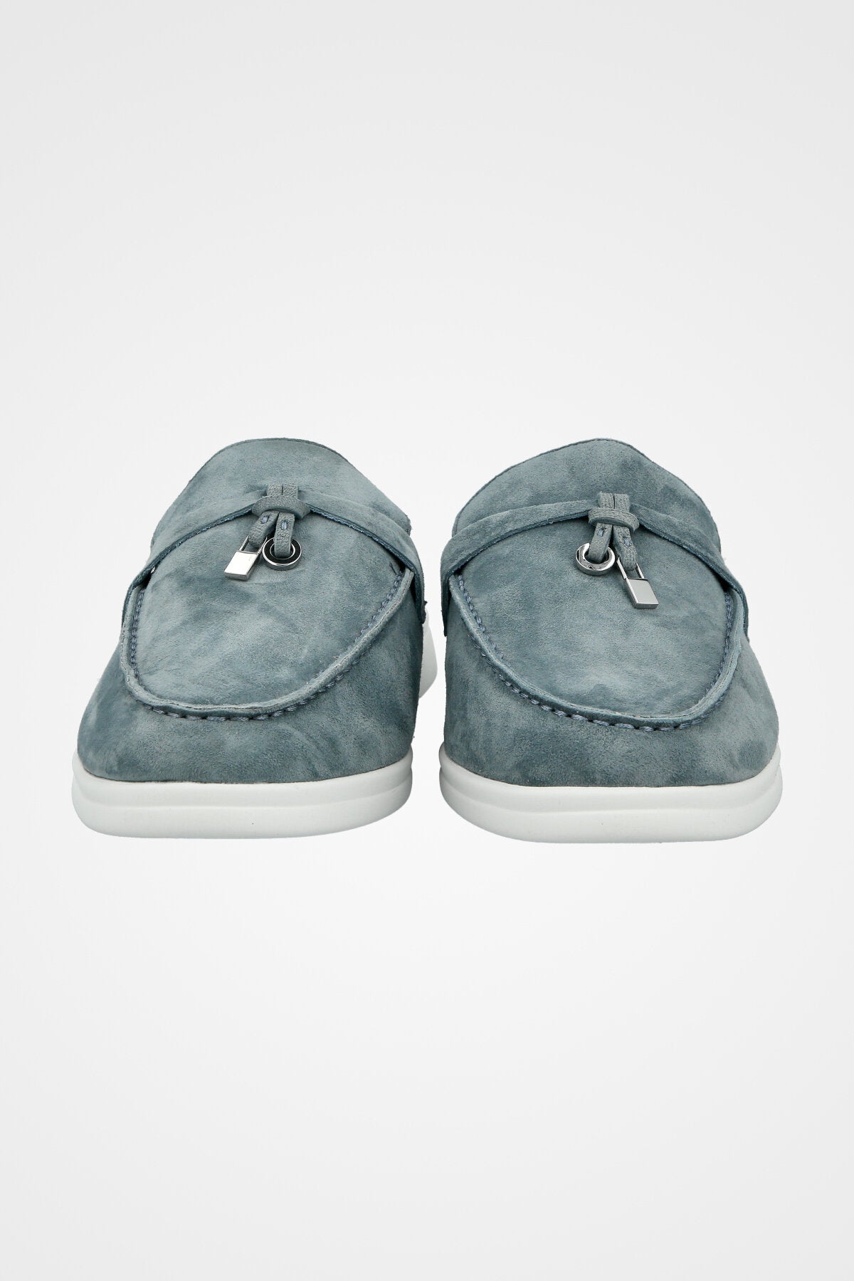 מוקסין כפכף בצבע אפור זמש, עם תפירה בולטת וקישוט מתכתי אלגנטי על העליונה