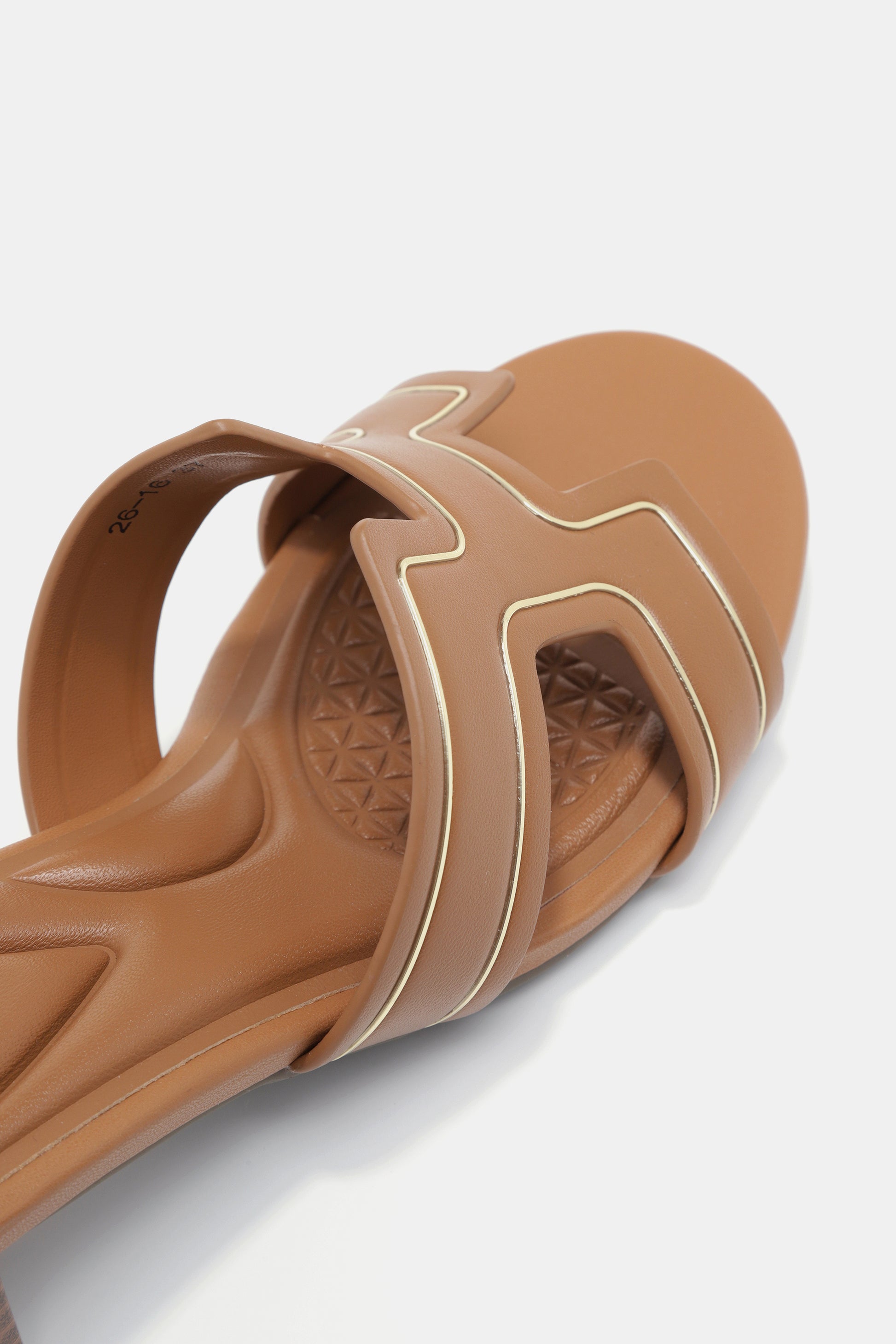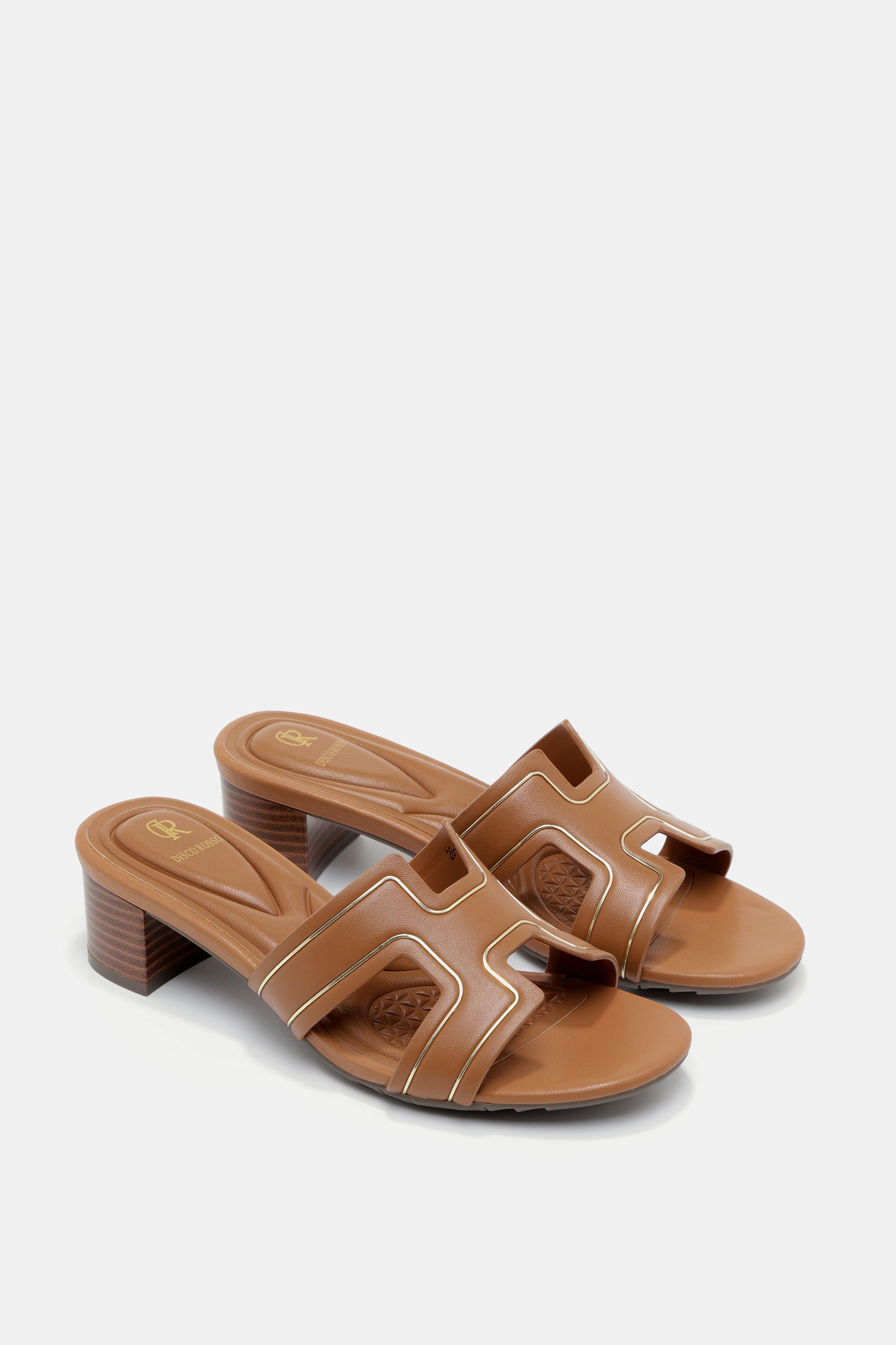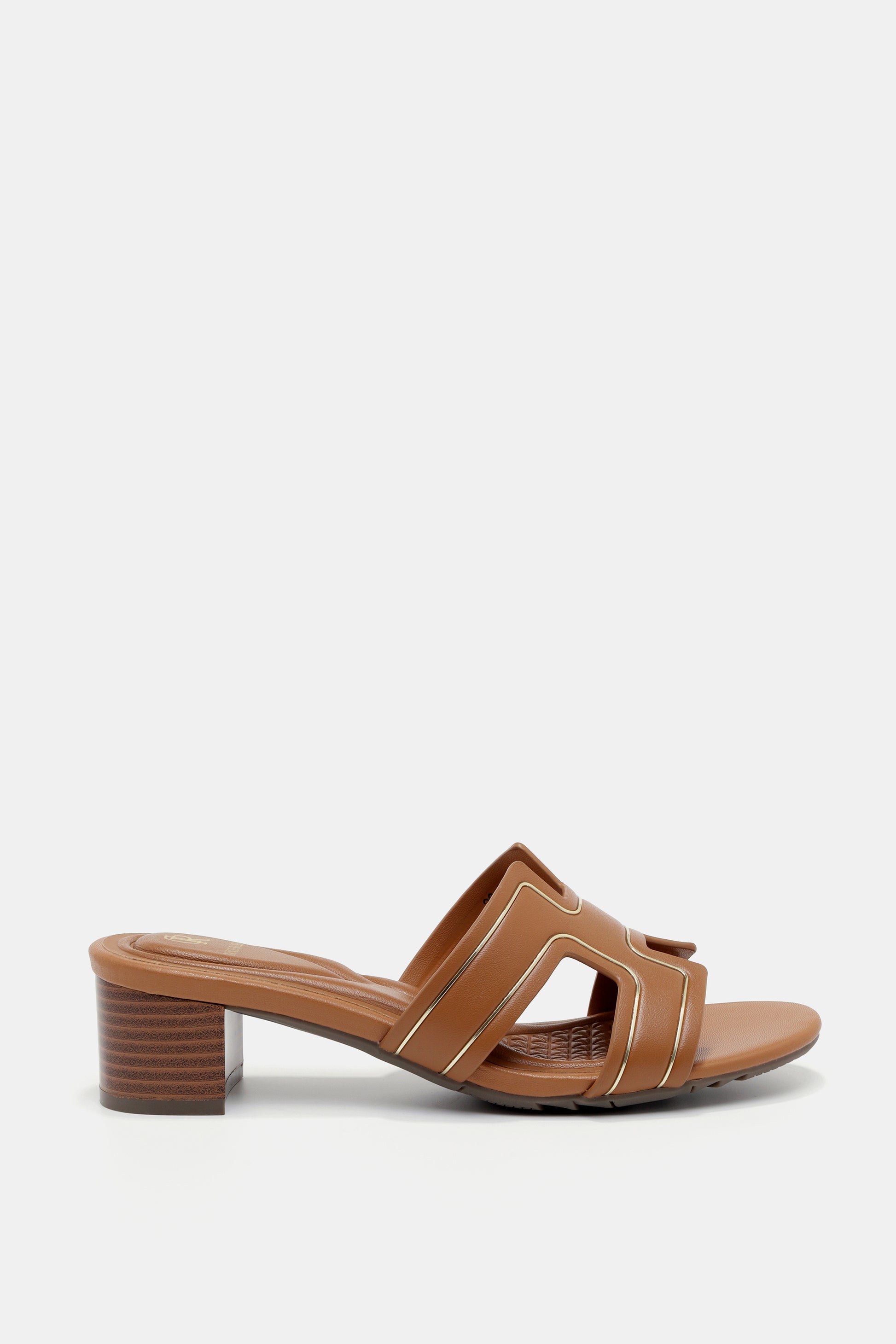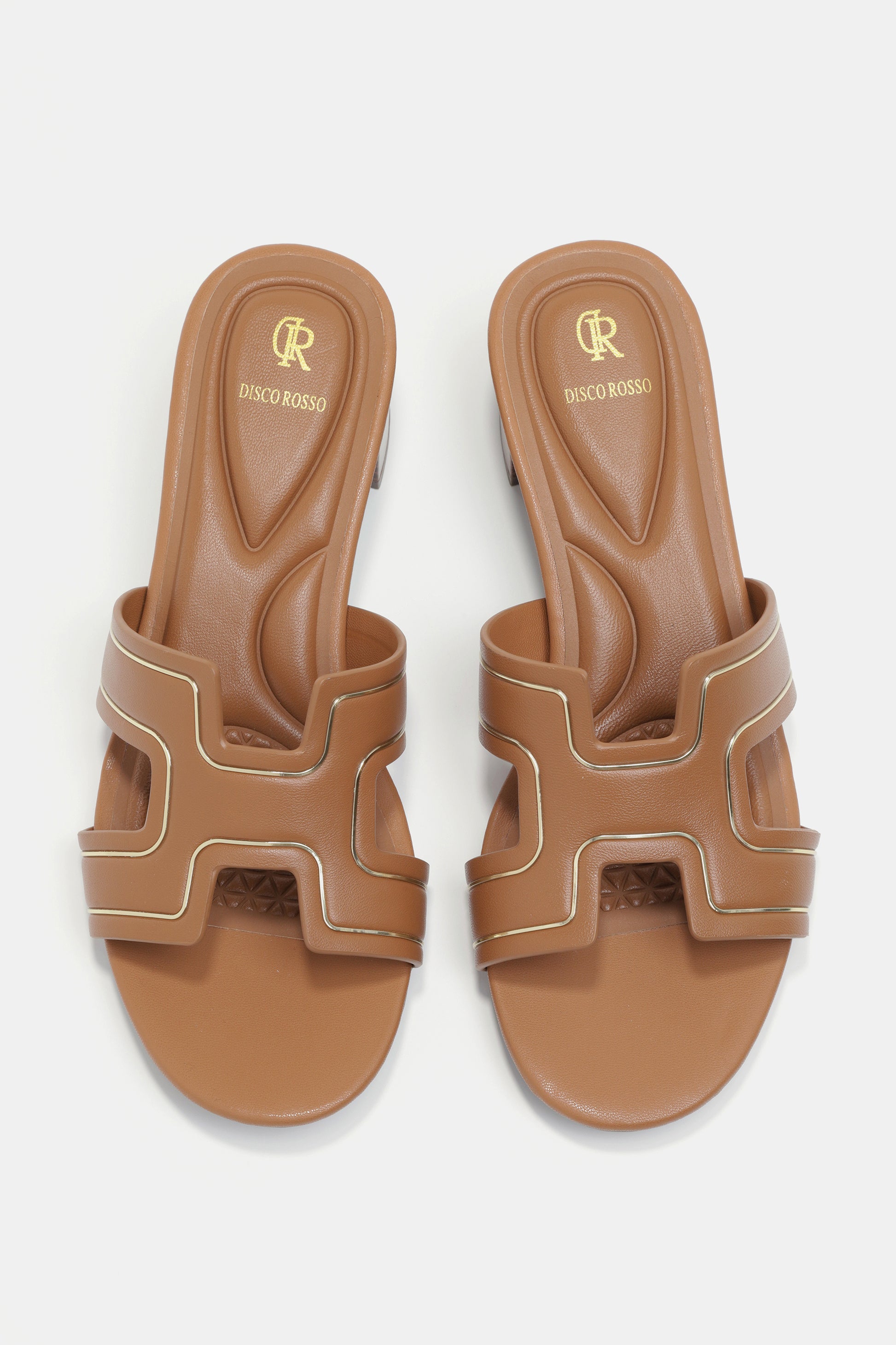 כפכפי עקב בצבע חום עור, רצועה מעוצבת ותפרים מודגשים, מראה אלגנטי ונשי