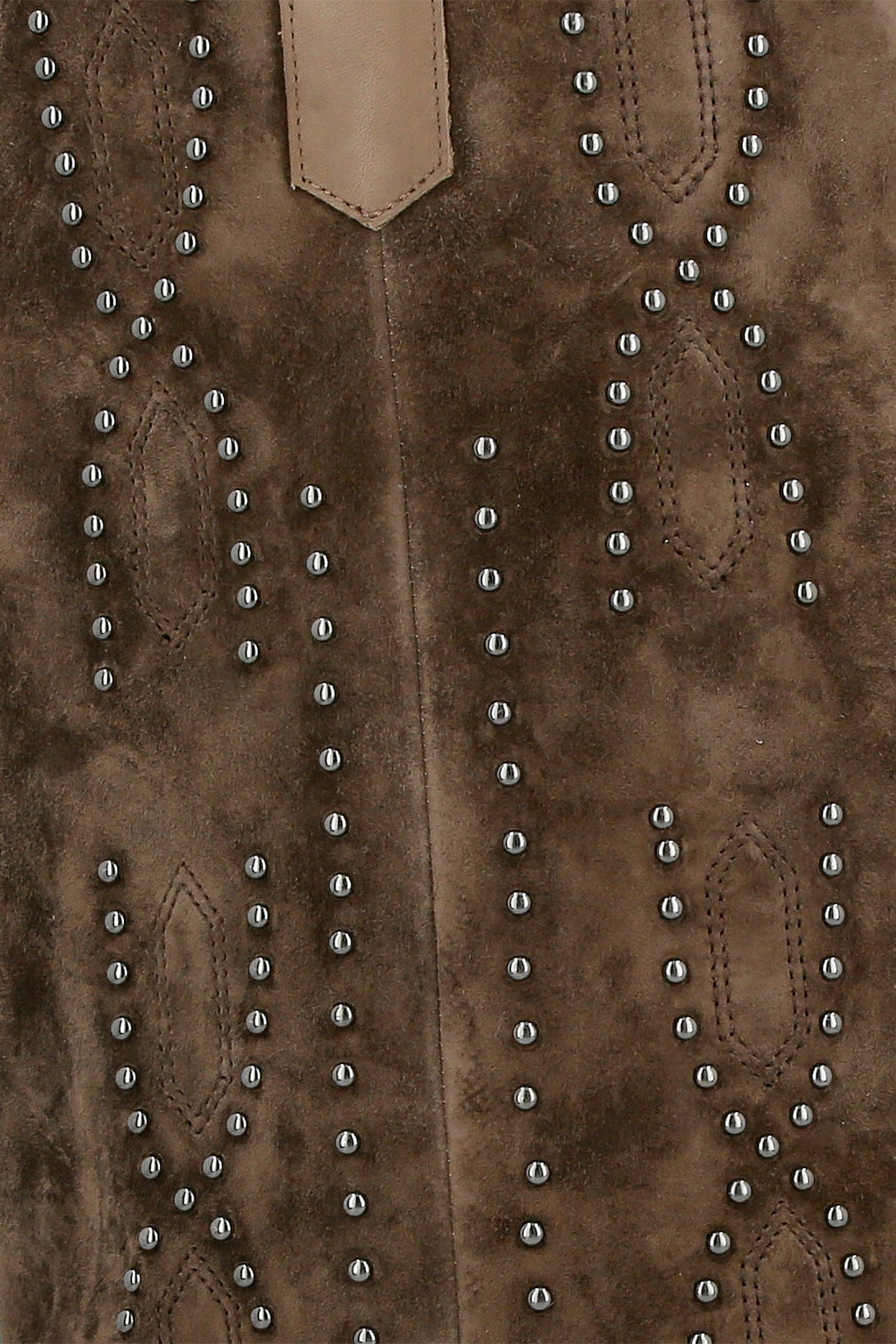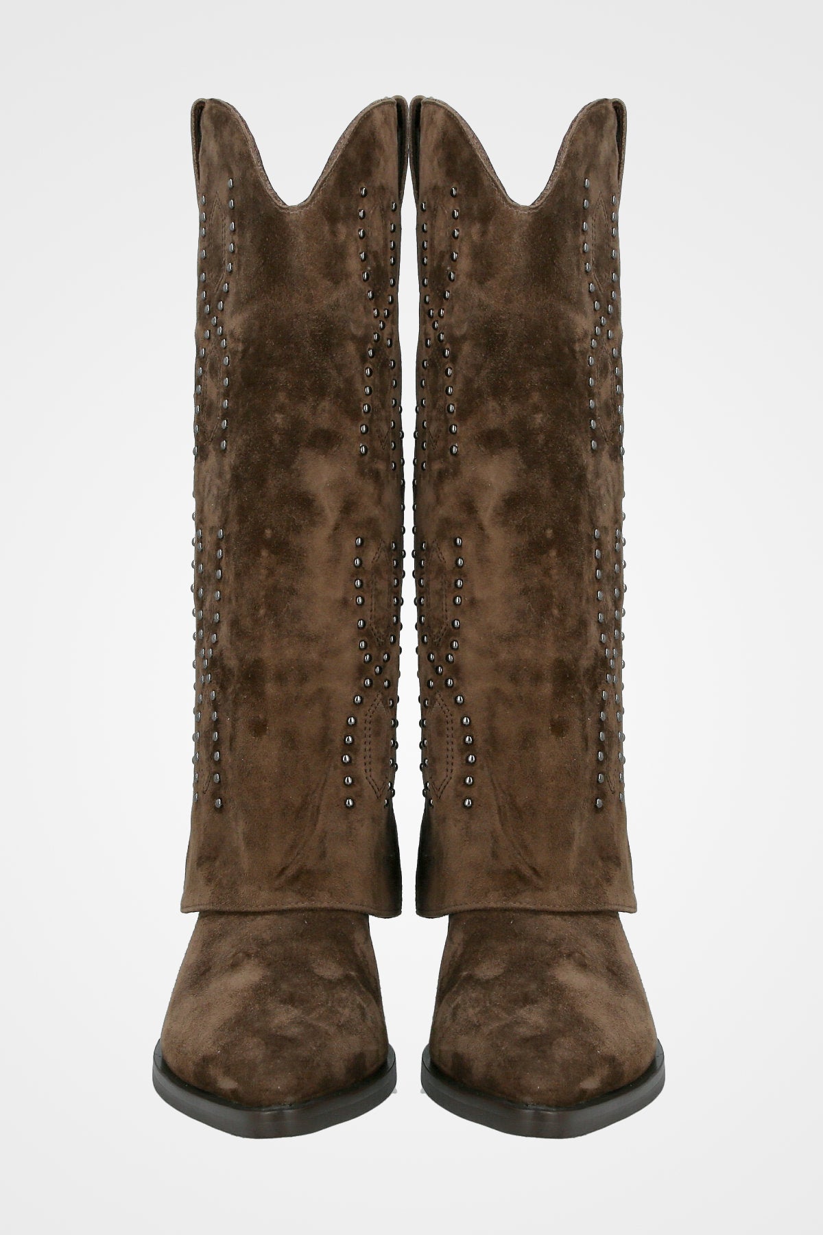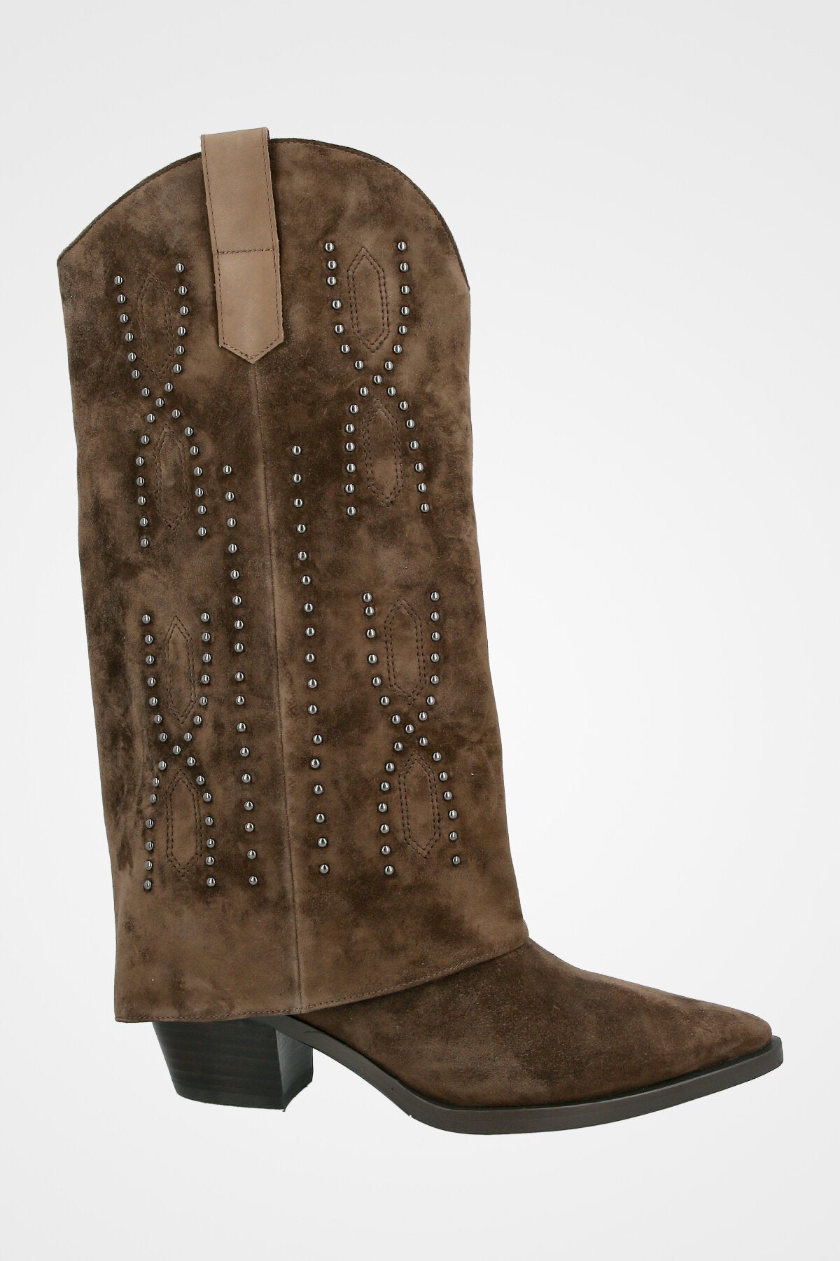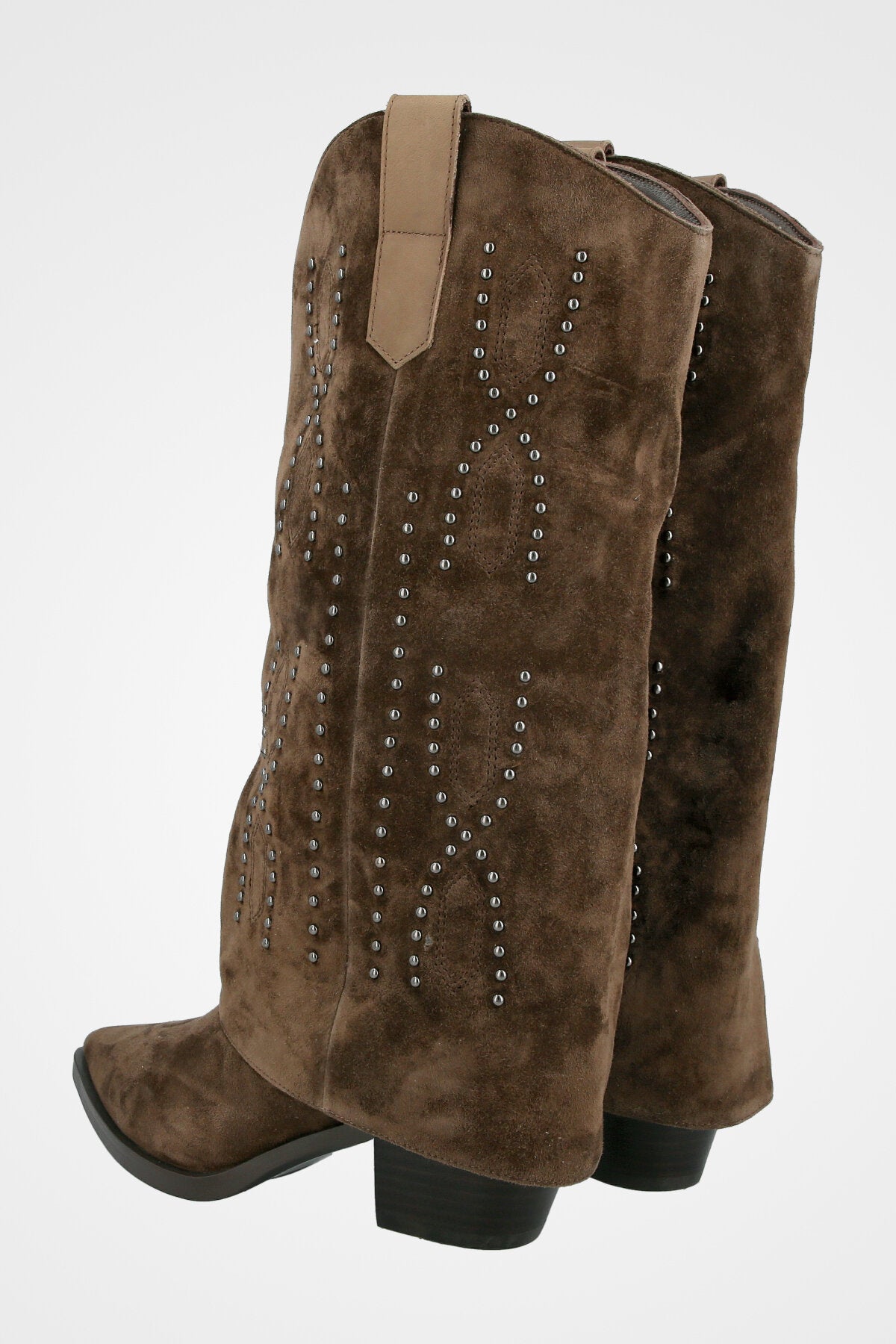 מגף חום גבוה עם גזרה רכה, חזית מחודדת, עקב בינוני רחב וקישוט ניטים מתכתיים
