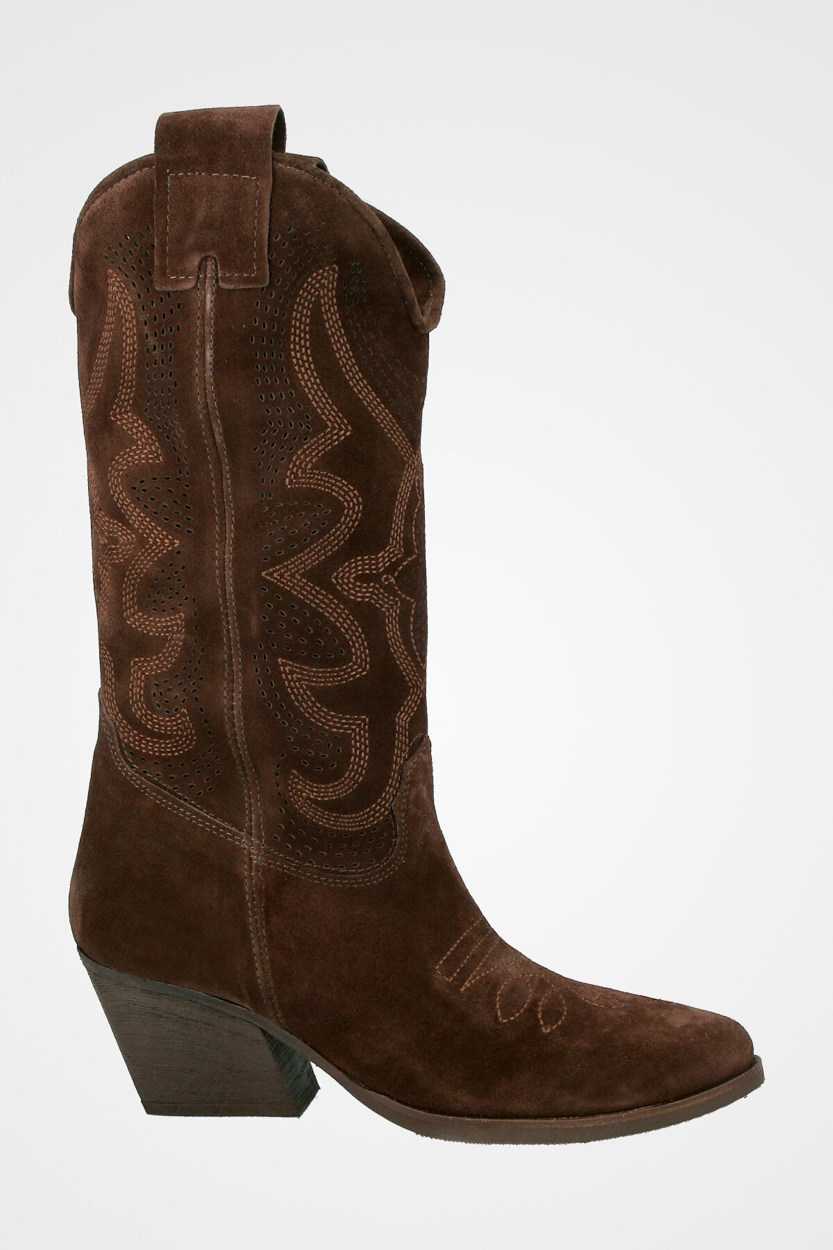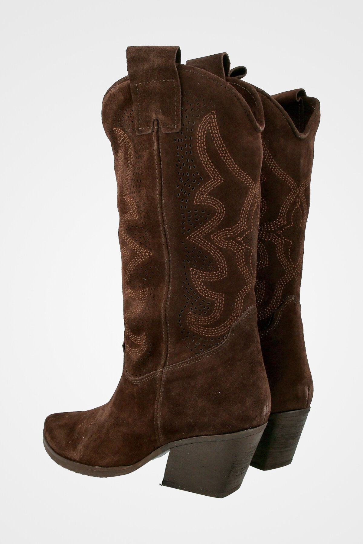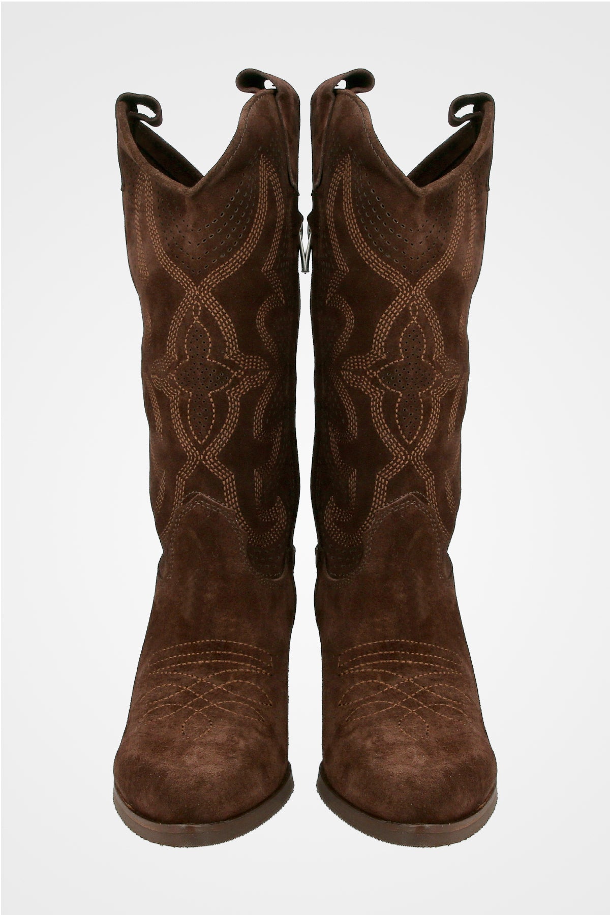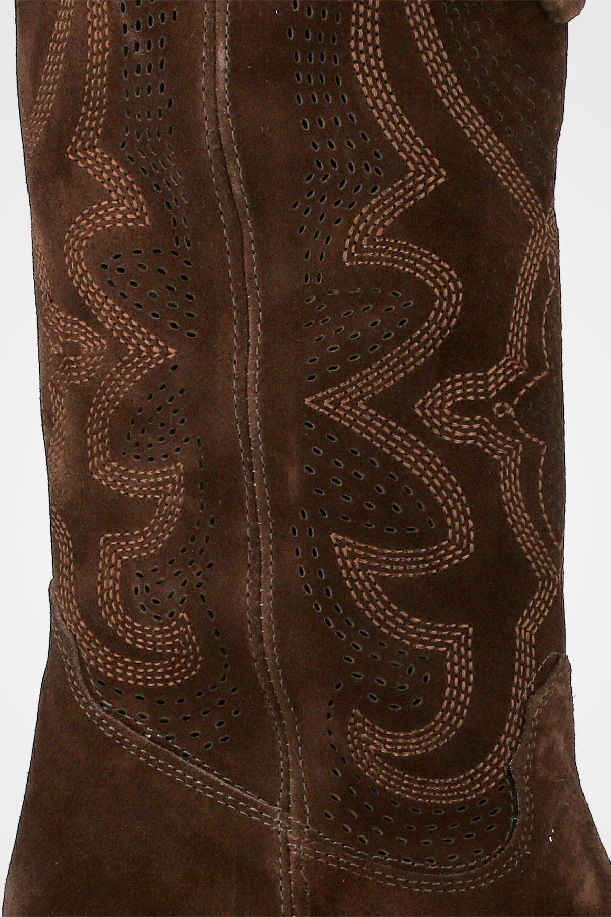 מגף קאובוי חום זמש , עם עיטורים מחוררים דקורטיביים, חזית מחודדת ועקב בינוני