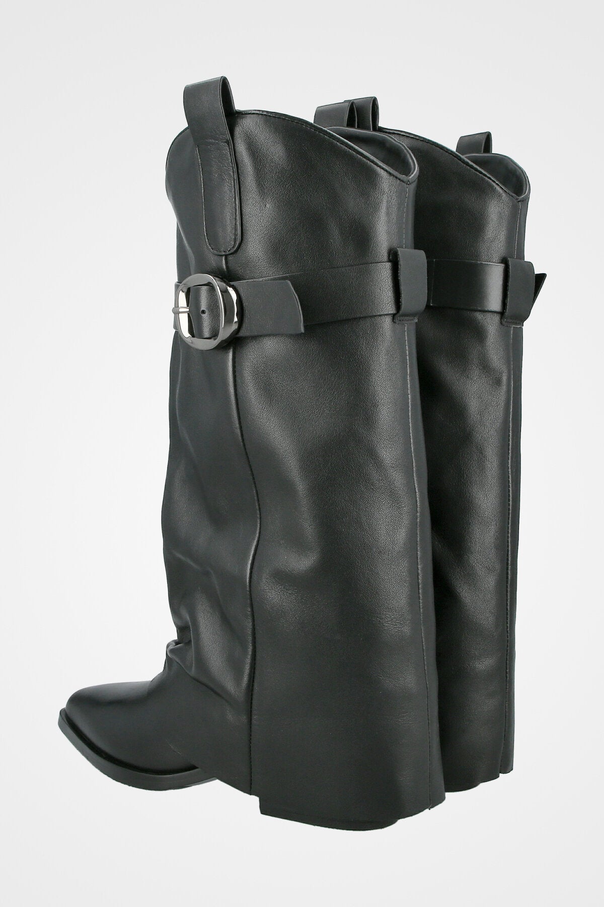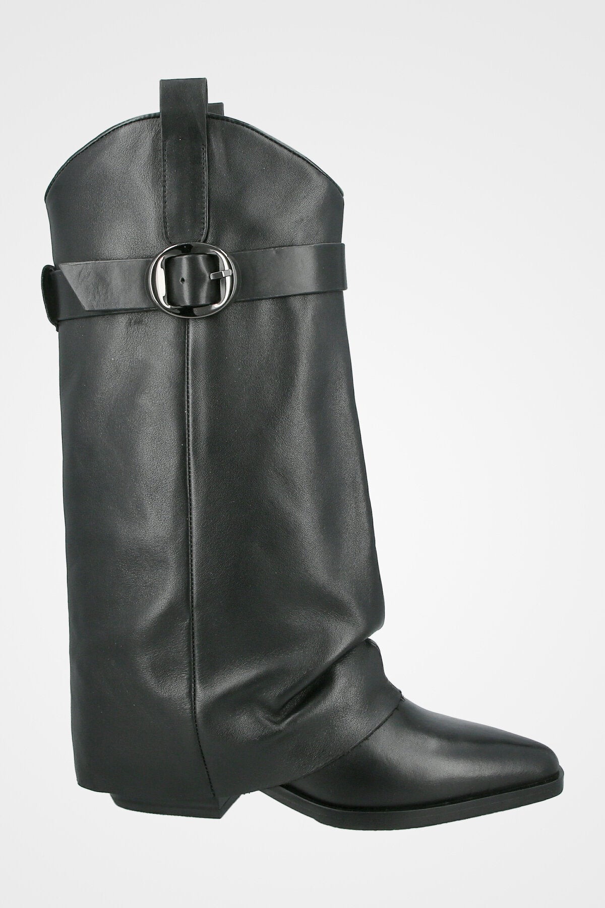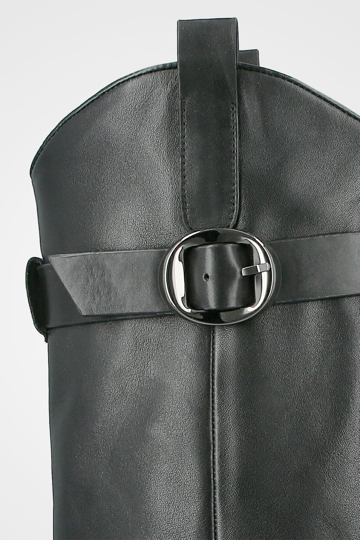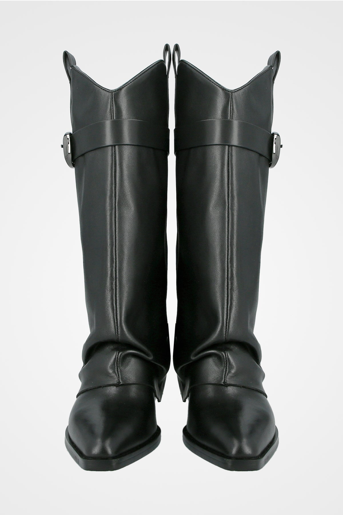 מגף בוקרים שחור עור, עם חזית שפיצית, עקב מרובע מחודד ורצועת אבזם כסופה מסביב לשוק