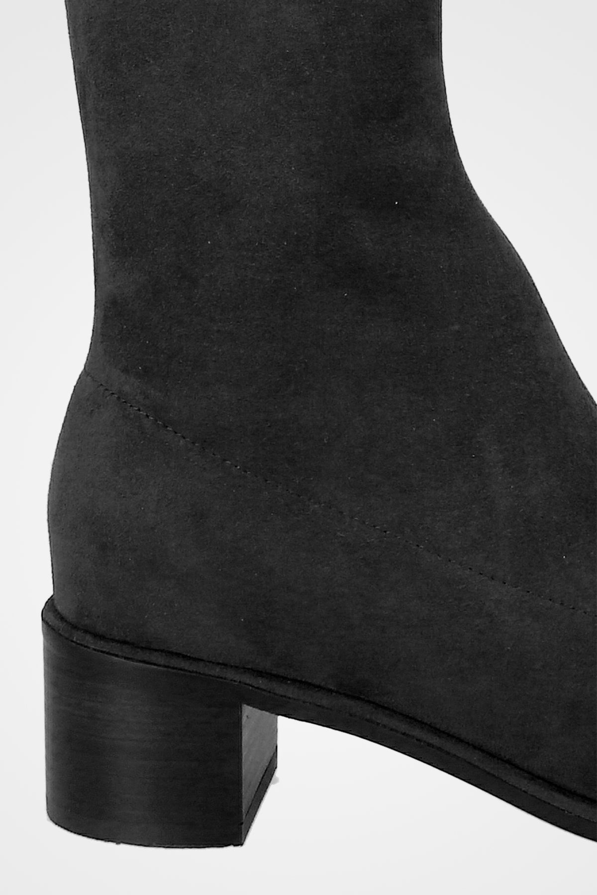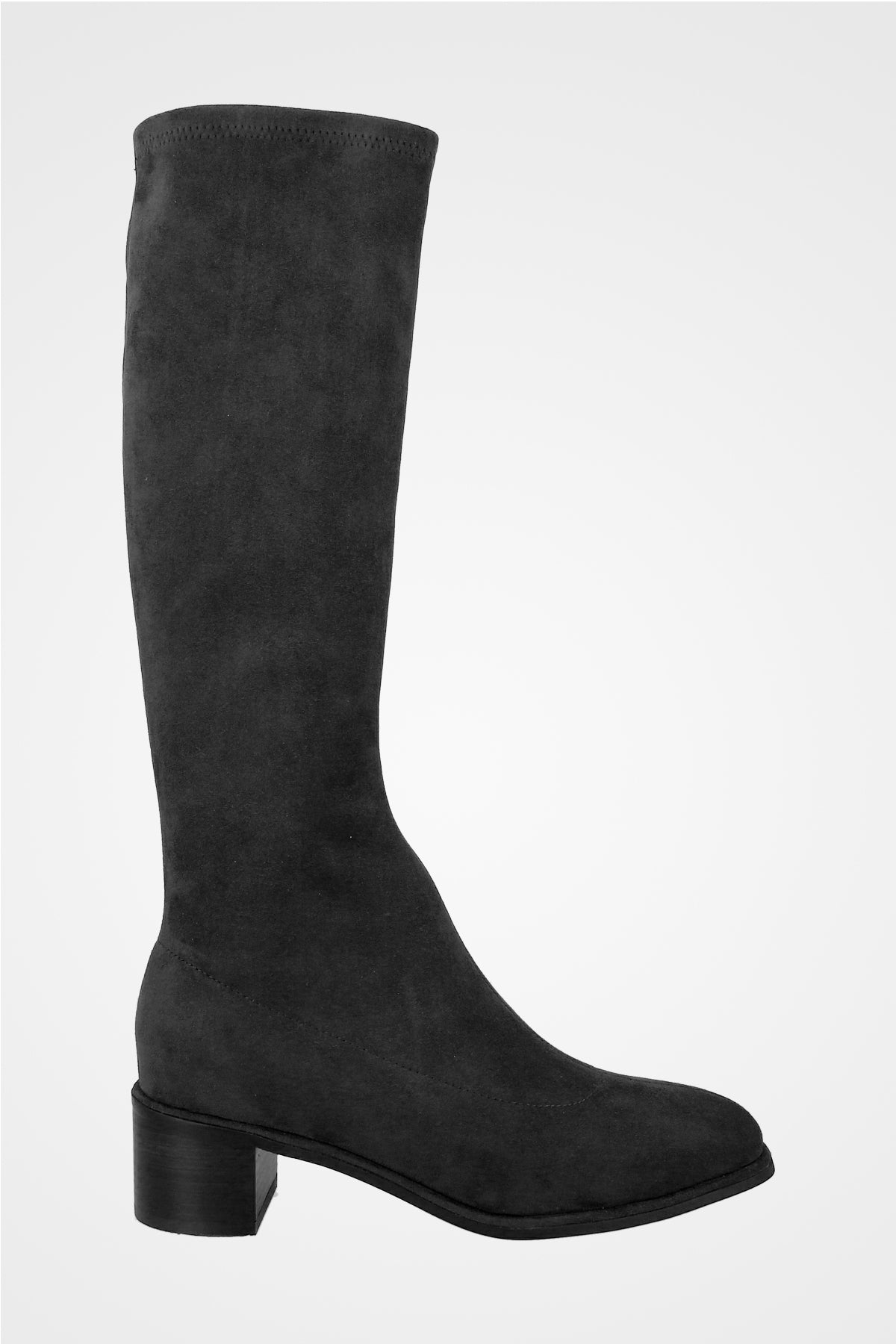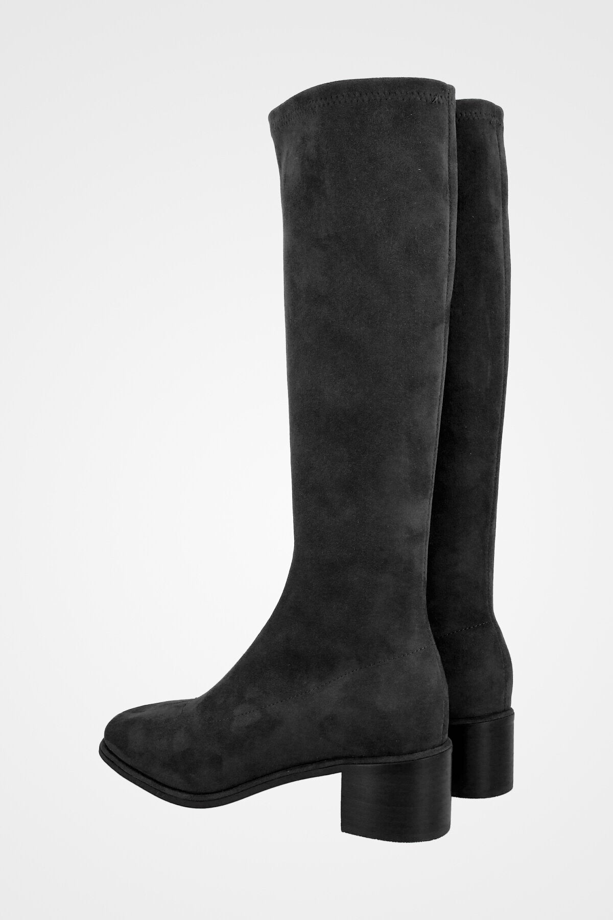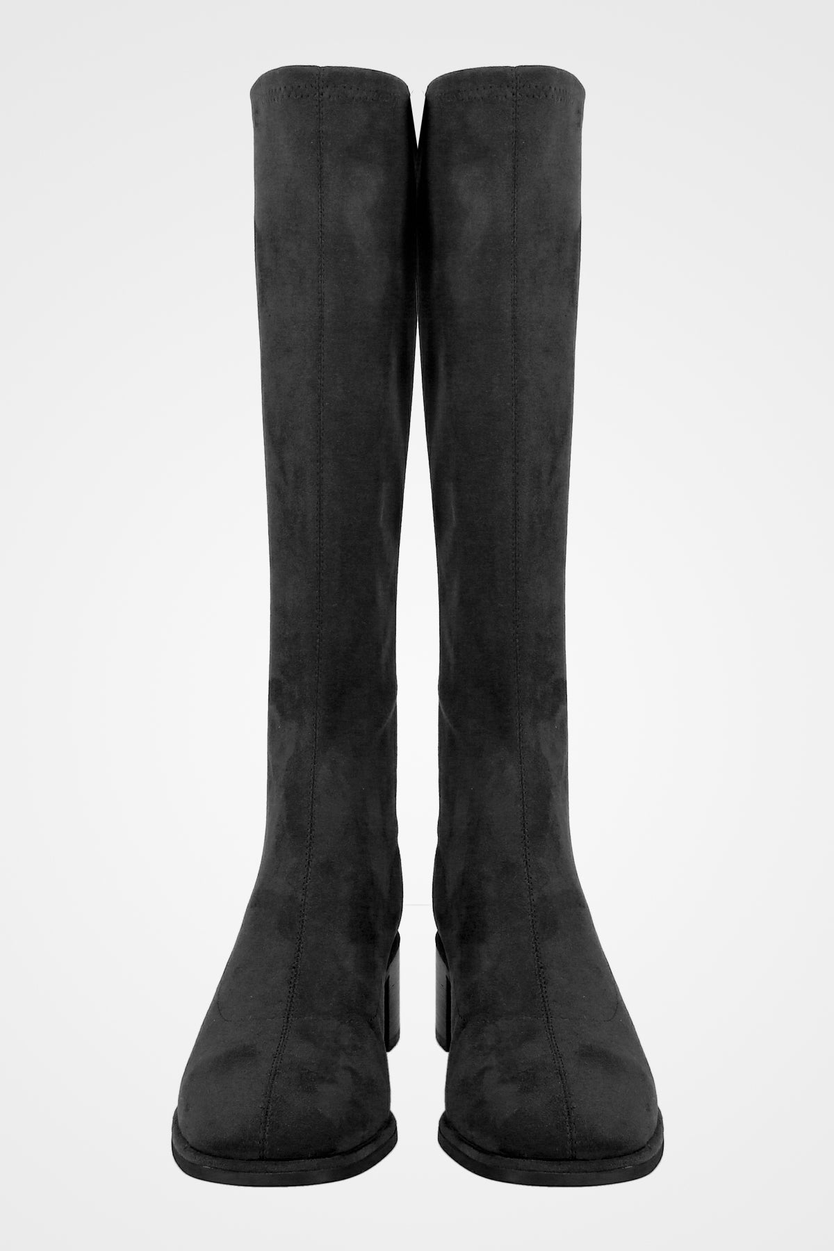 מגף גבוה גרב שחור זמש, בעיצוב חלק ואלגנטי עם עקב בנוני רחב נוח ליום יום