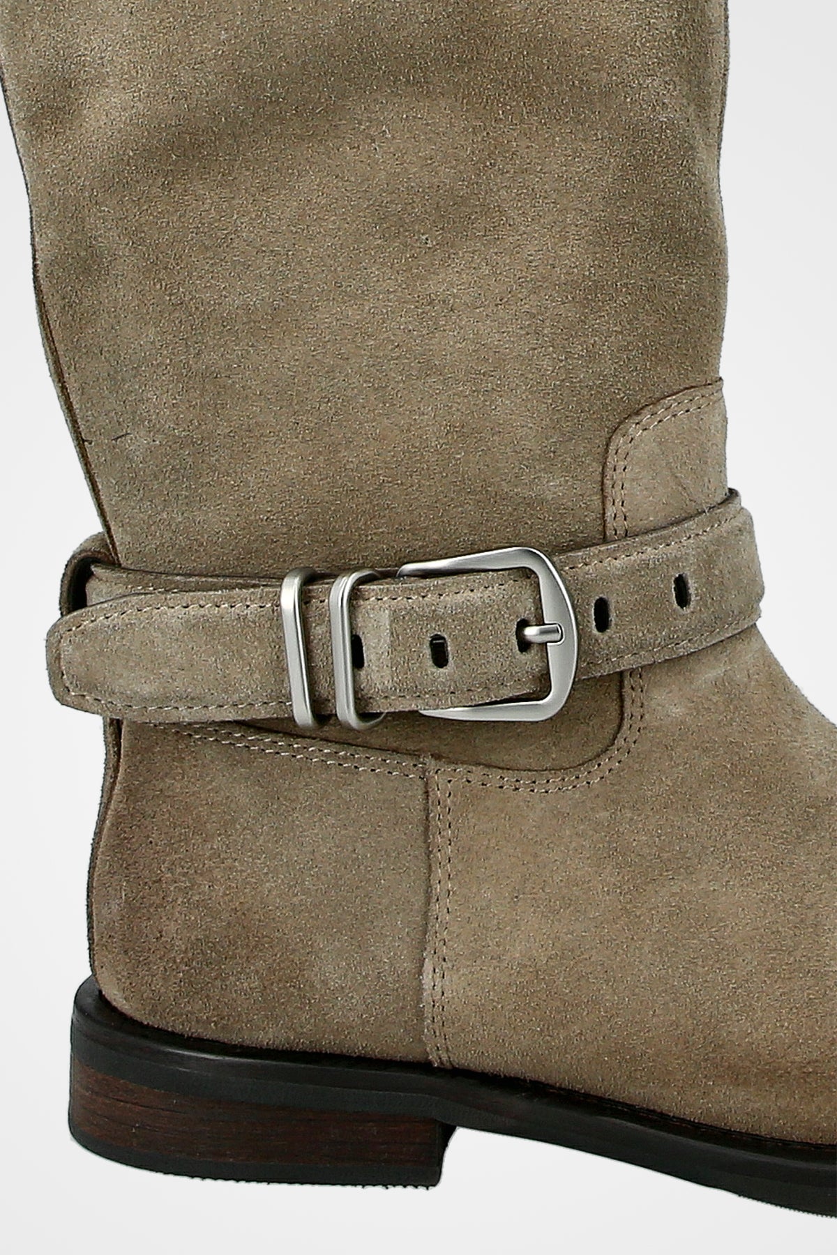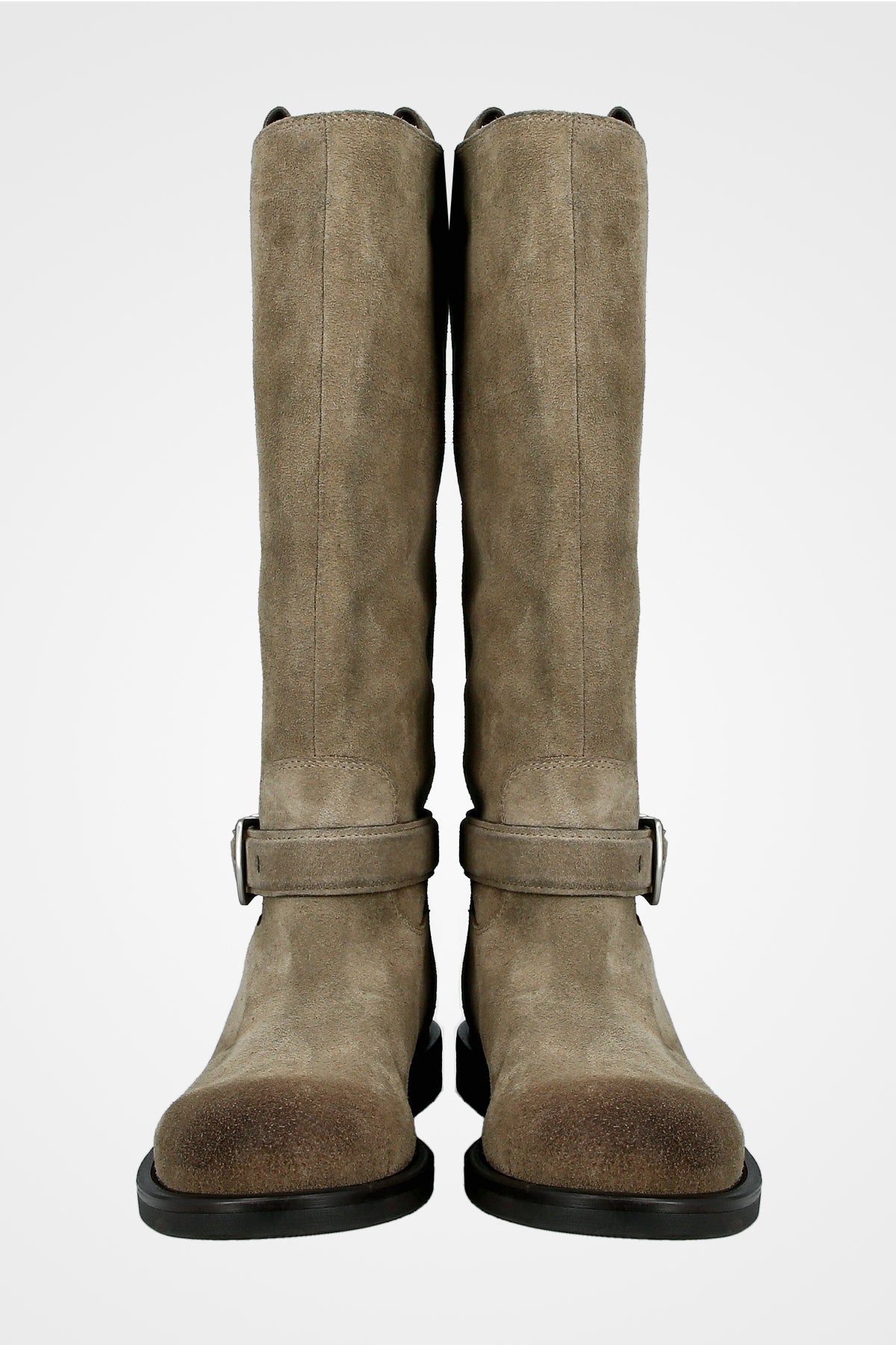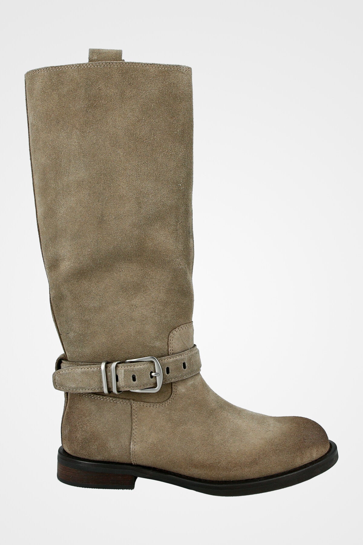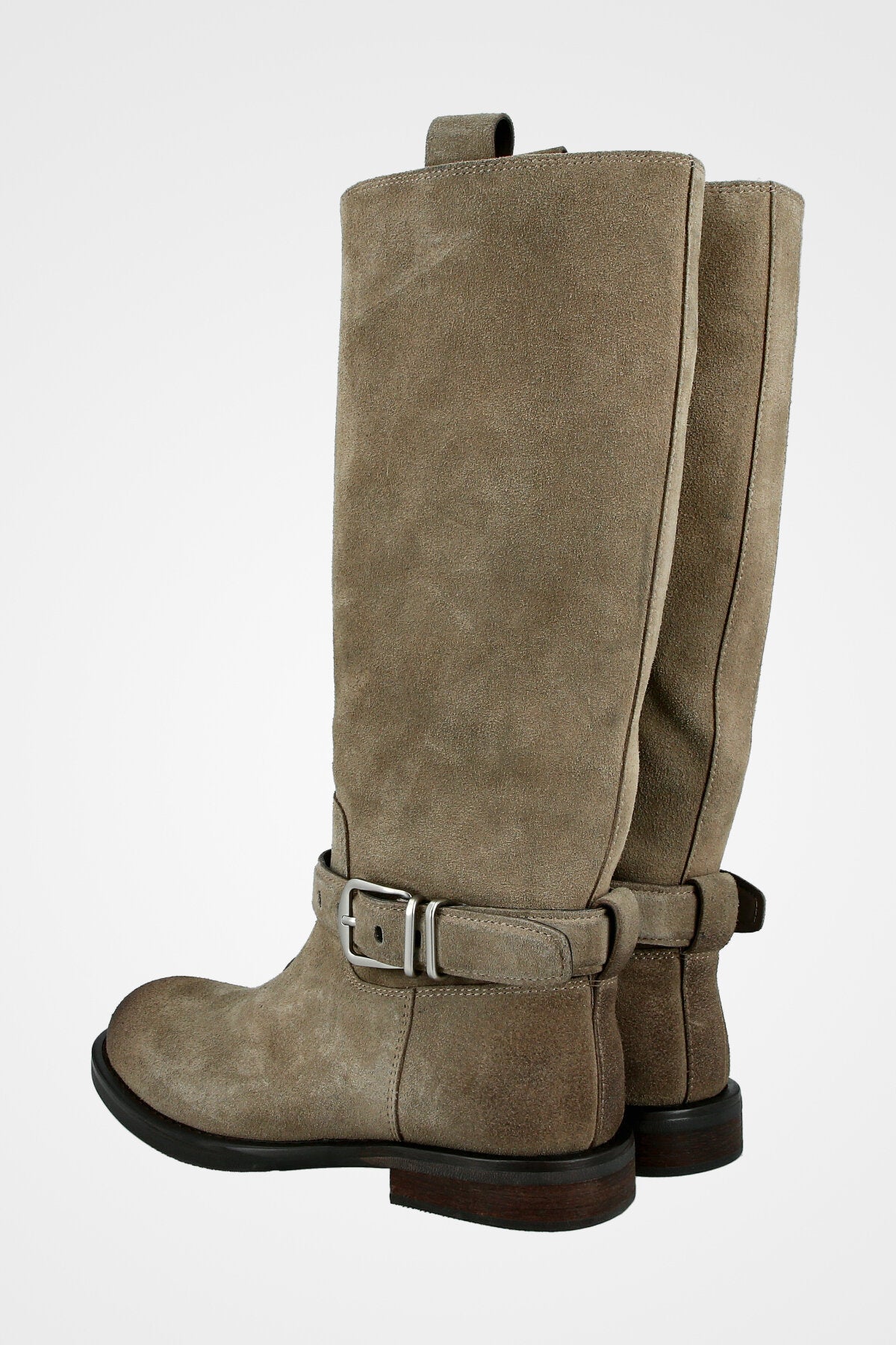 מגף גבוה בצבע חאקי זמש, בשילוב אבזם מתכת כסוף סוליה שטוחה וגזרה קלאסית