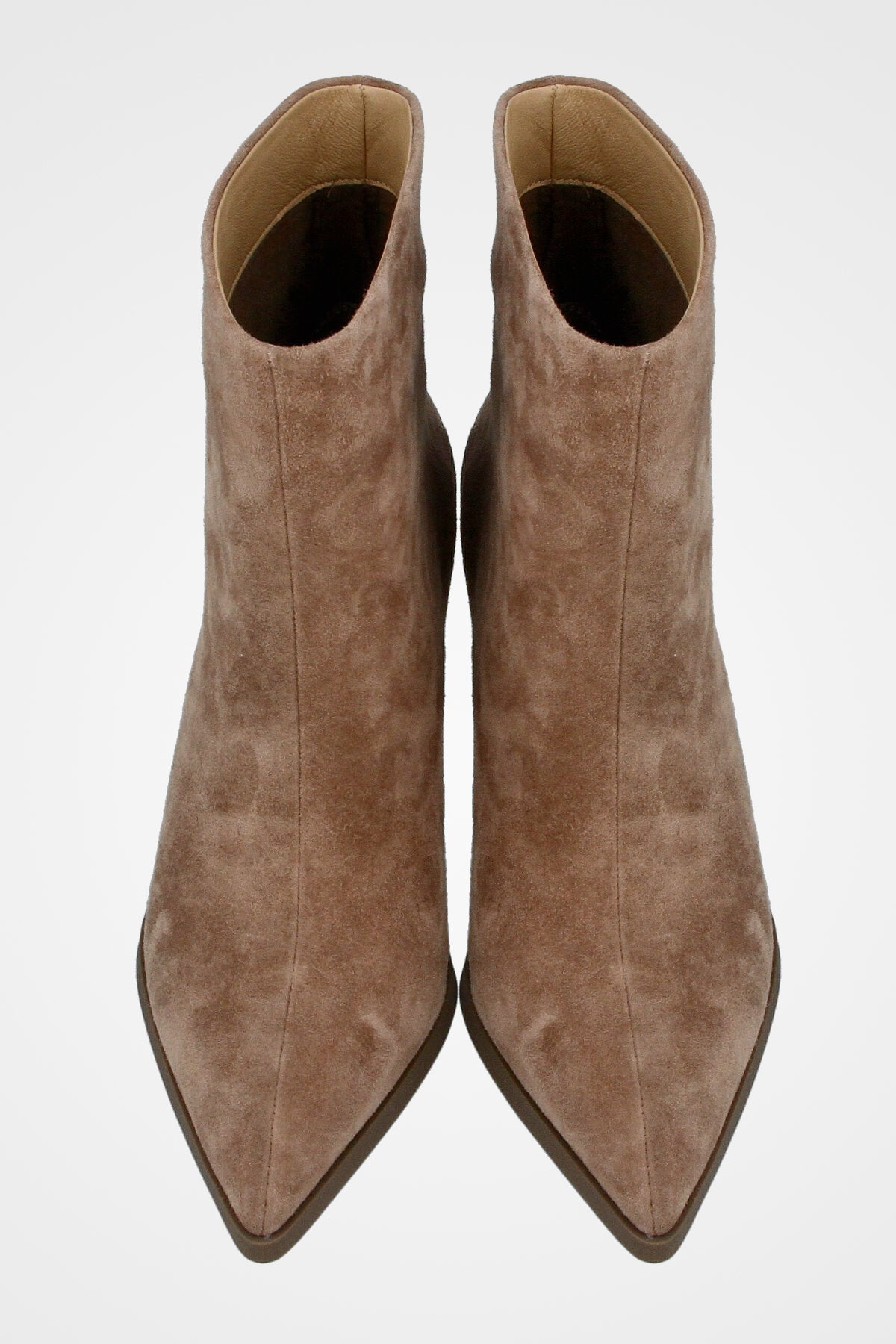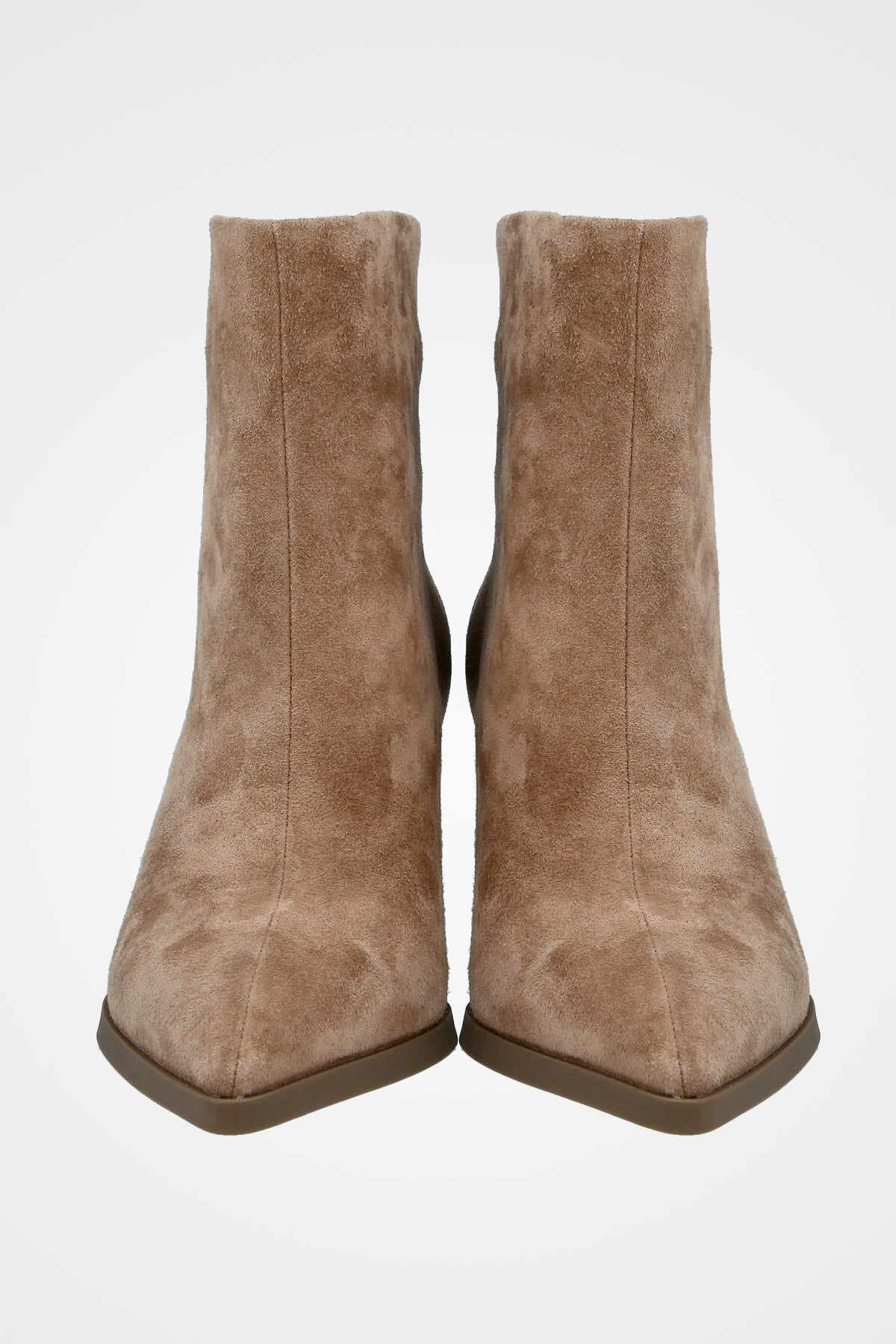 מגף קרסול עשוי מעור זמש בצבע בז, עם עיצוב שפיצי עם עקב בינוני