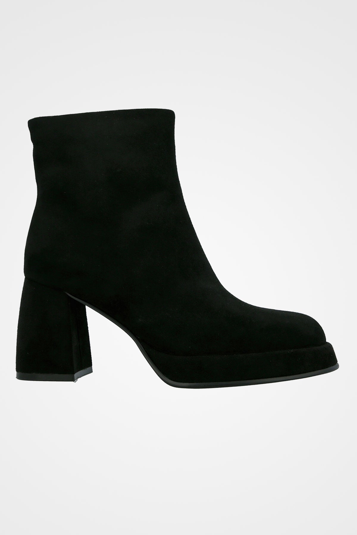 מגף זמש שחור קצר, בעיצוב נקי ואלגנטי, עם עקב רחב ובינוני ליציבות ונוחת