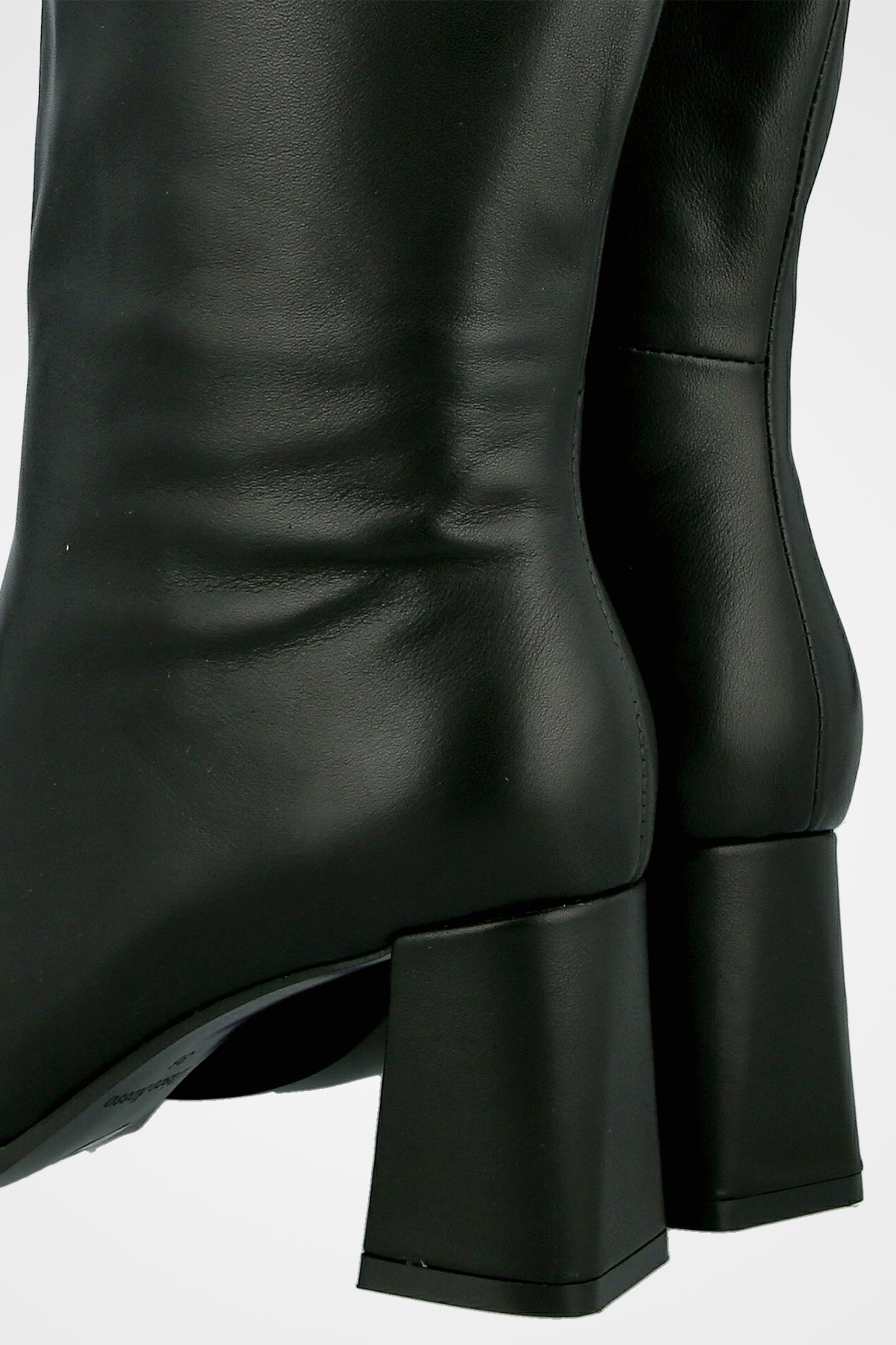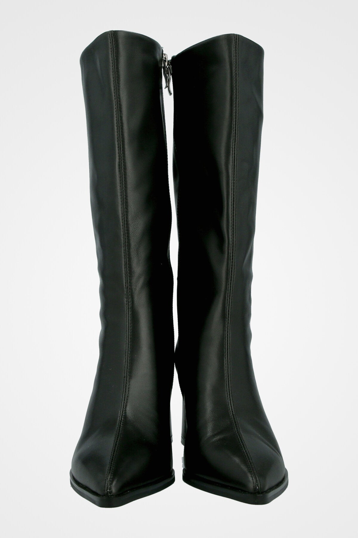 מגף שחור גבוה עד מתחת לברך, עם חזית מחודדת ועקב רחב ויציב בינוני-גבוה