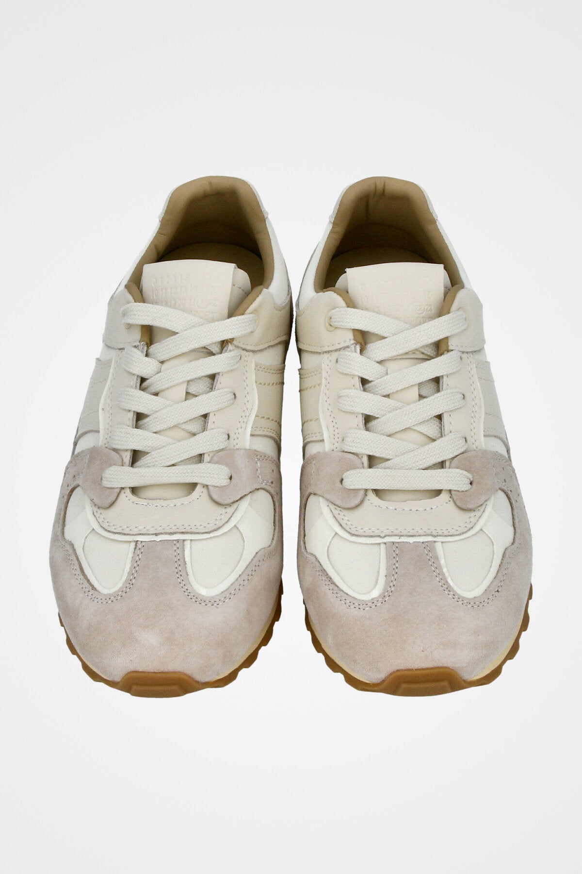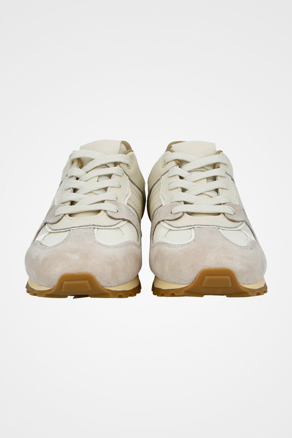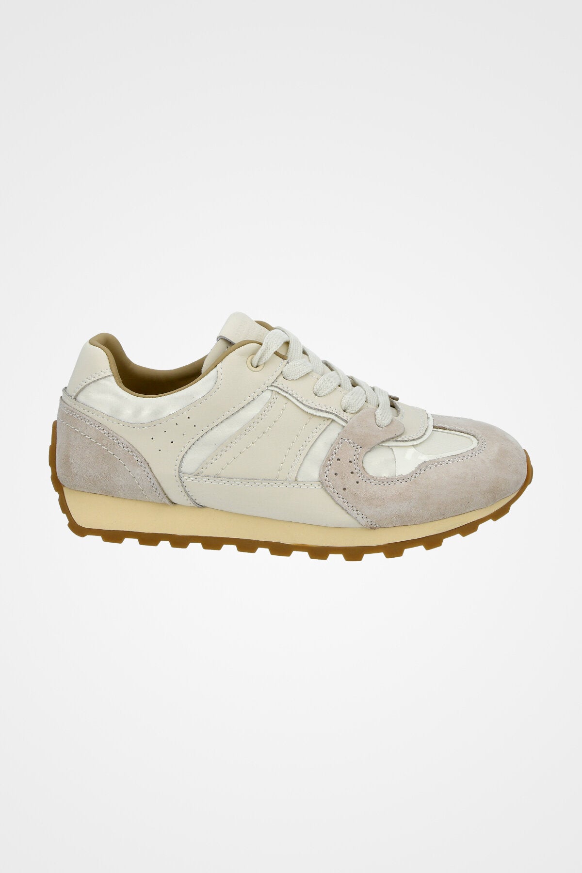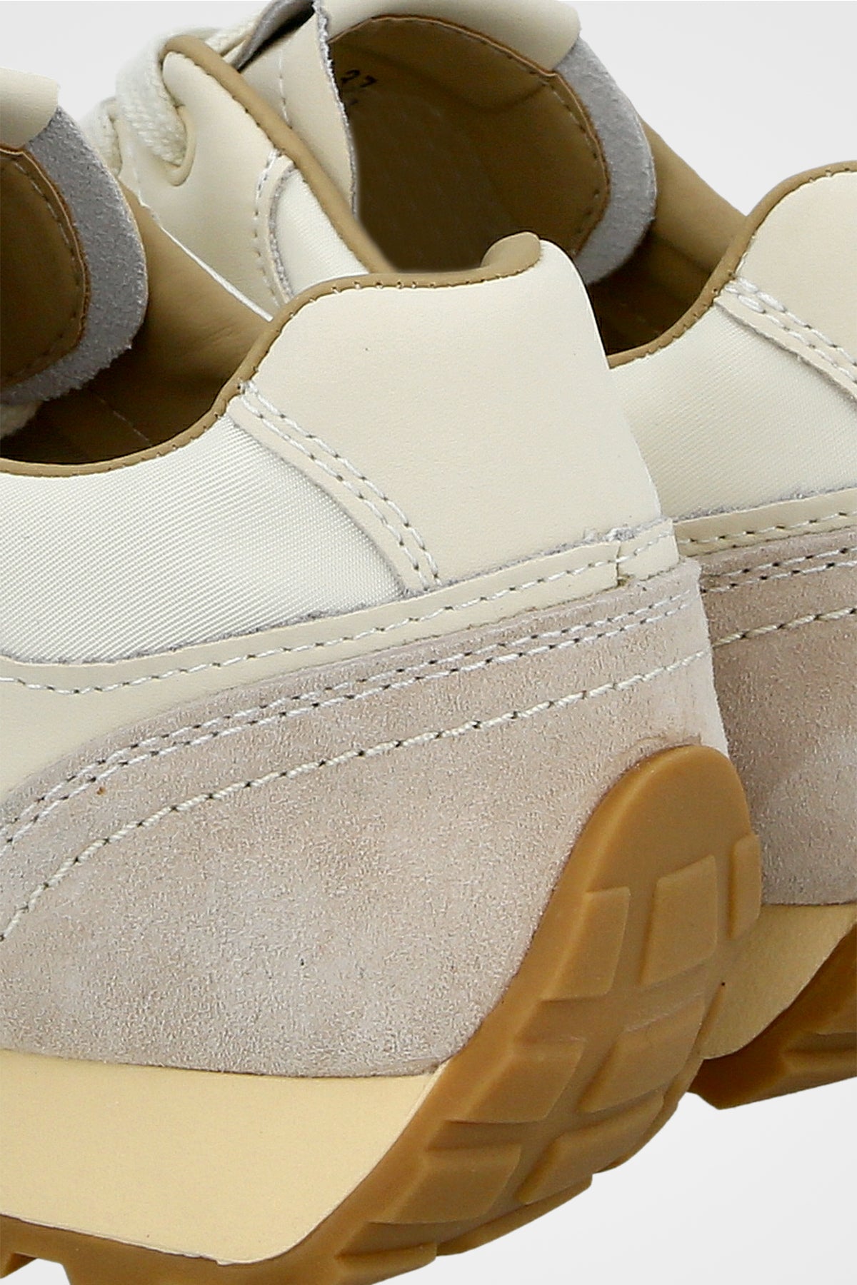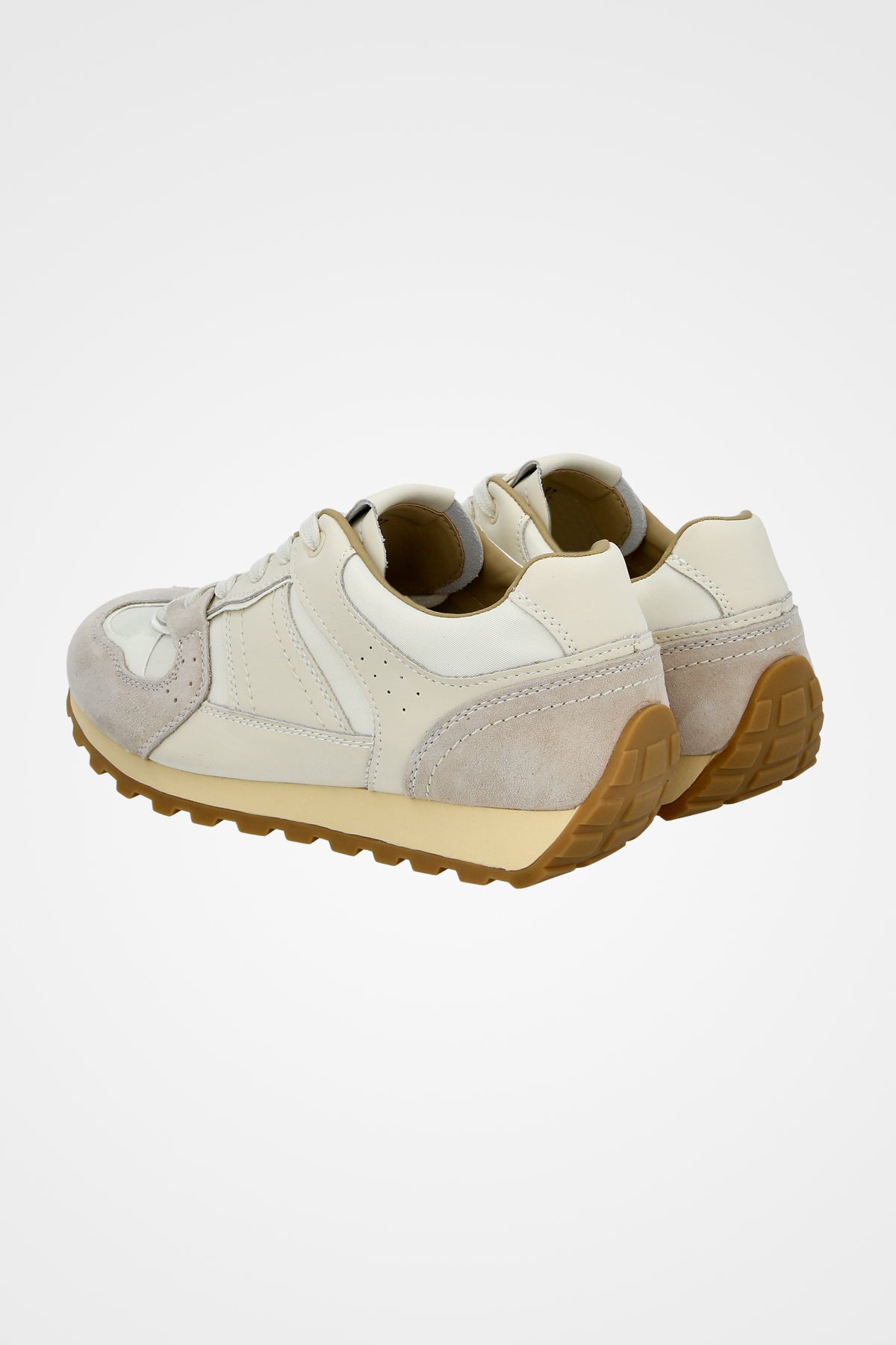 נעלי סניקרס ספוטיביות בצבע שמנת ואפור בשילוב זמש תואם עם עיטור פס לבן בצד הנעל וסולייה משוננת