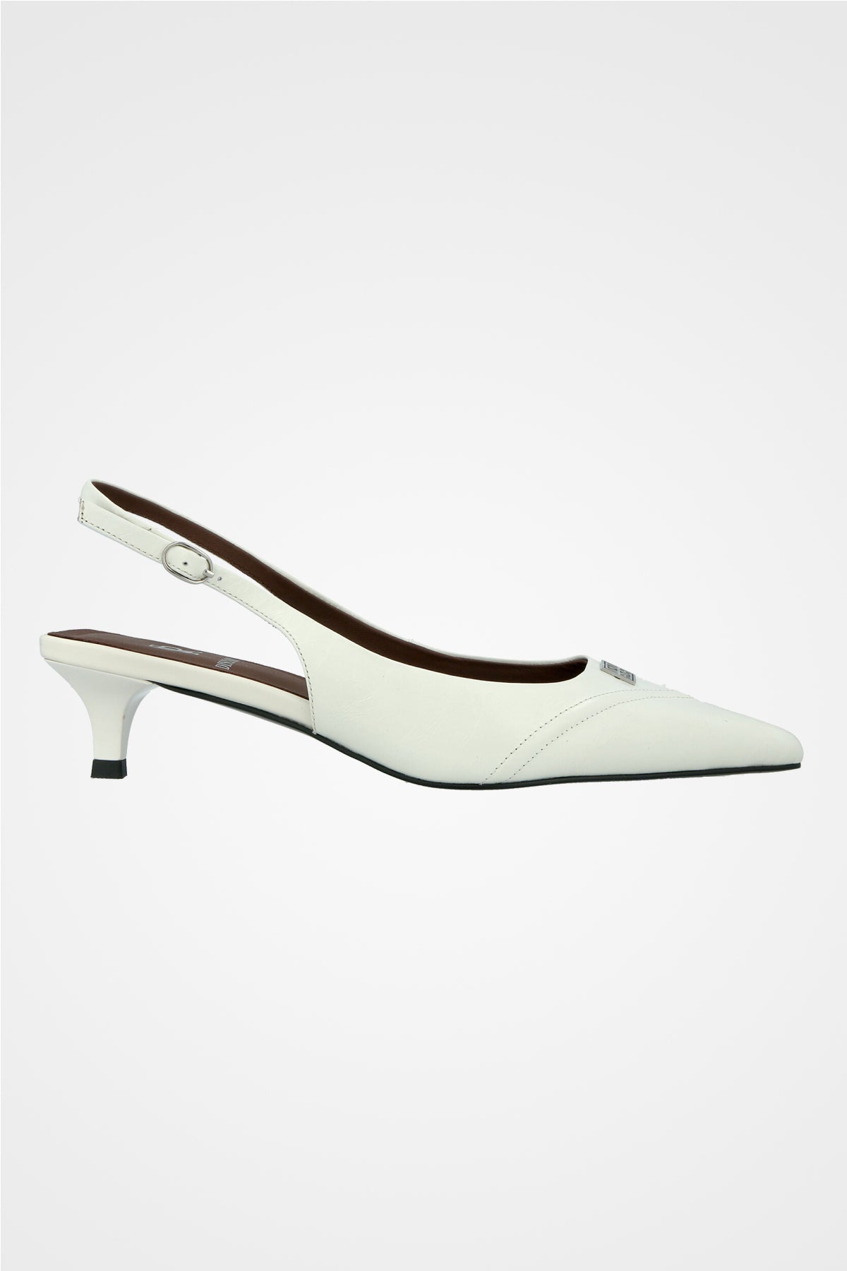 נעלי שפיץ לבנות מחודדות, עם סמל מתכתי קטן בחזית, רצועת עקב דקה וסגירת אבזם צדדית