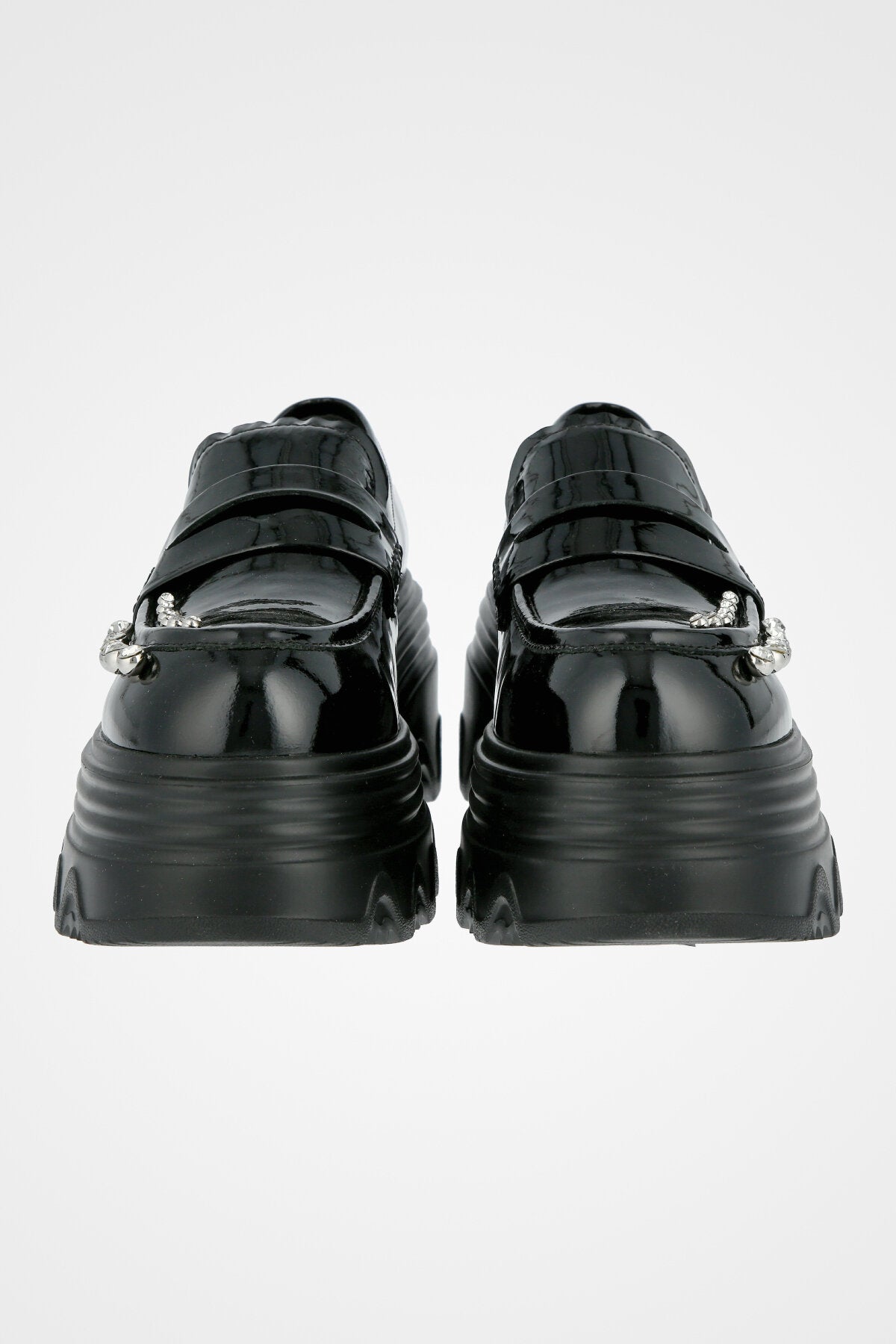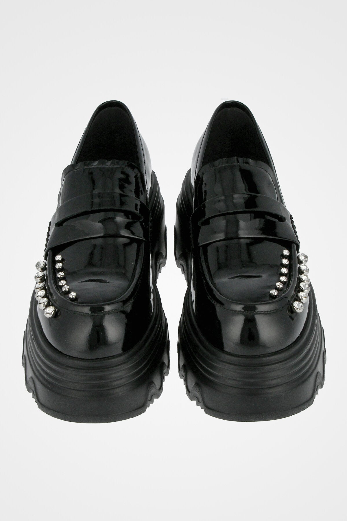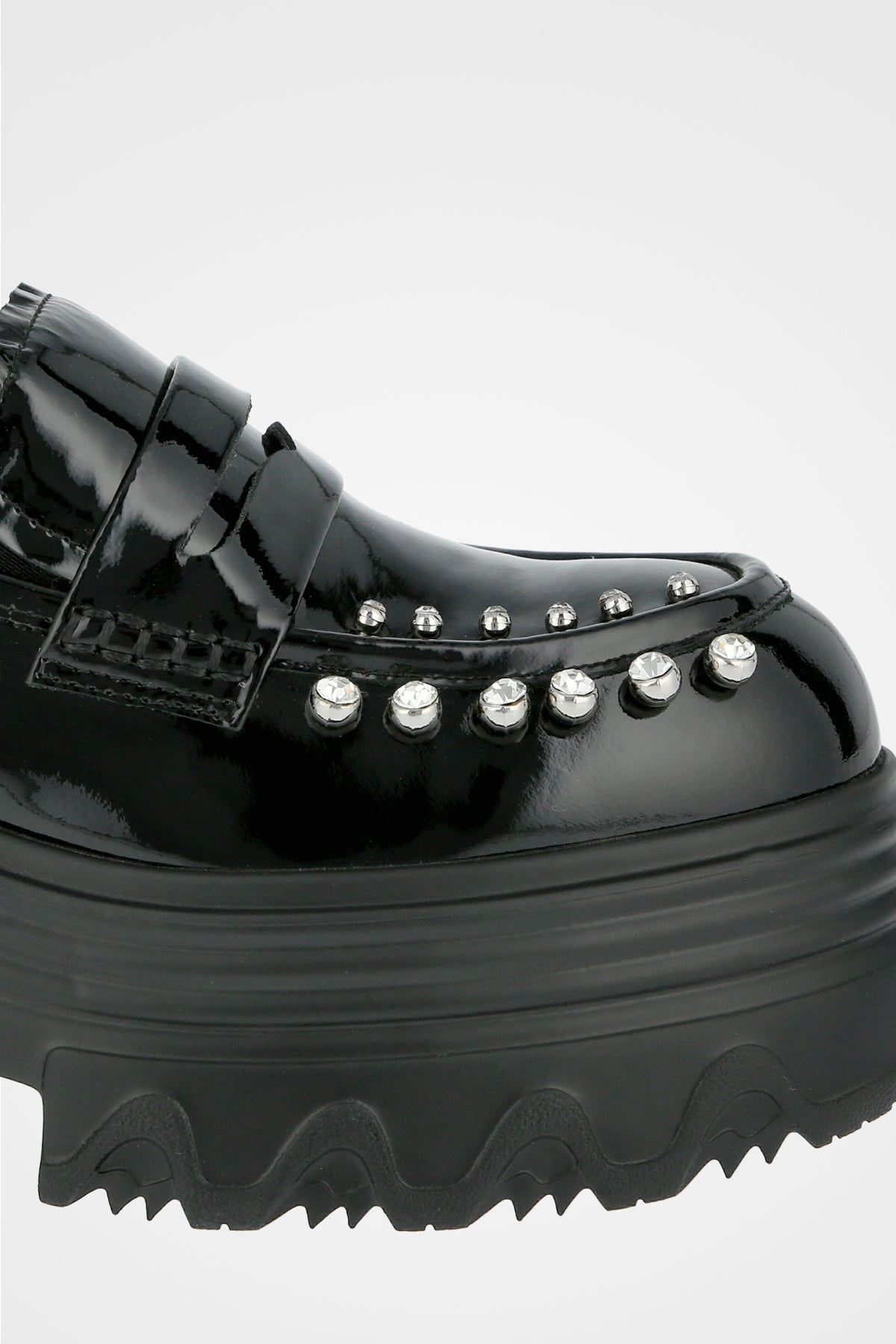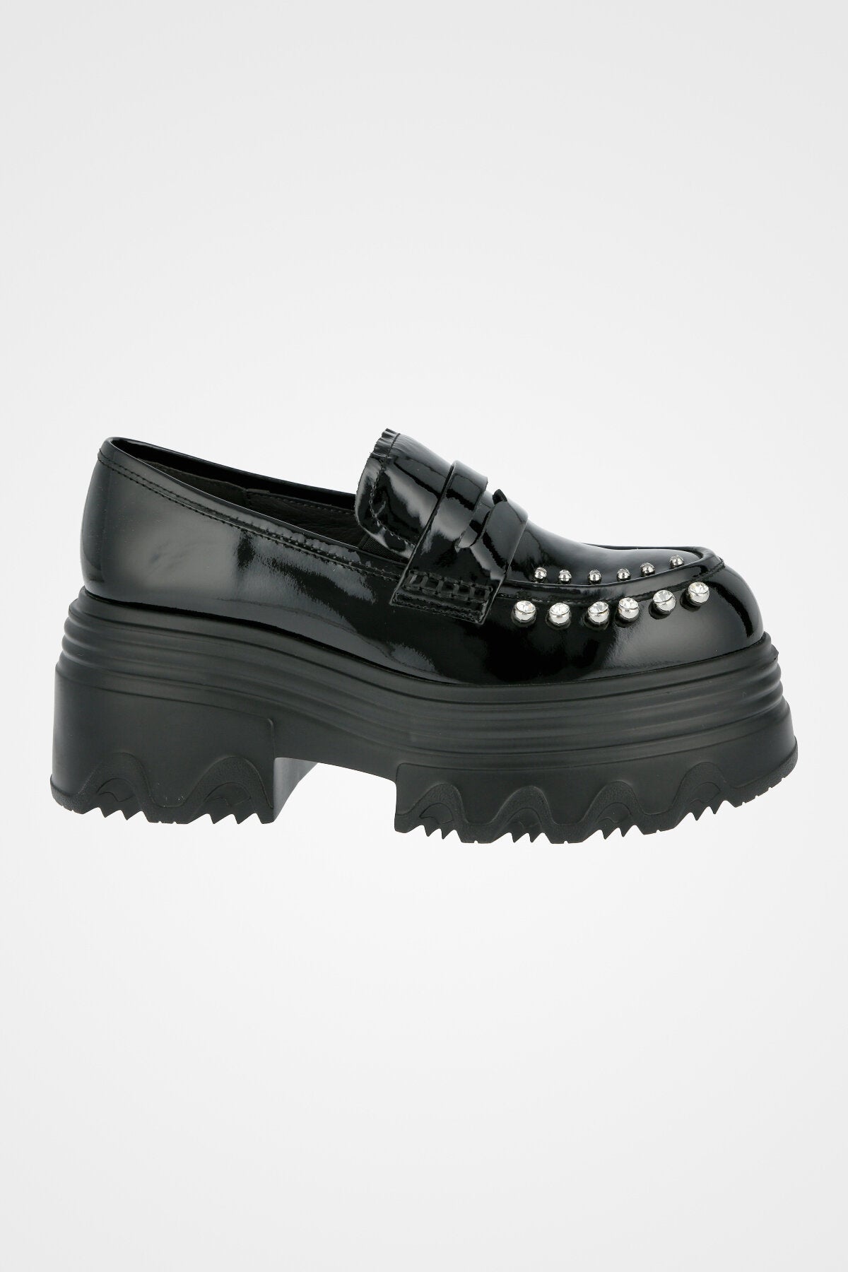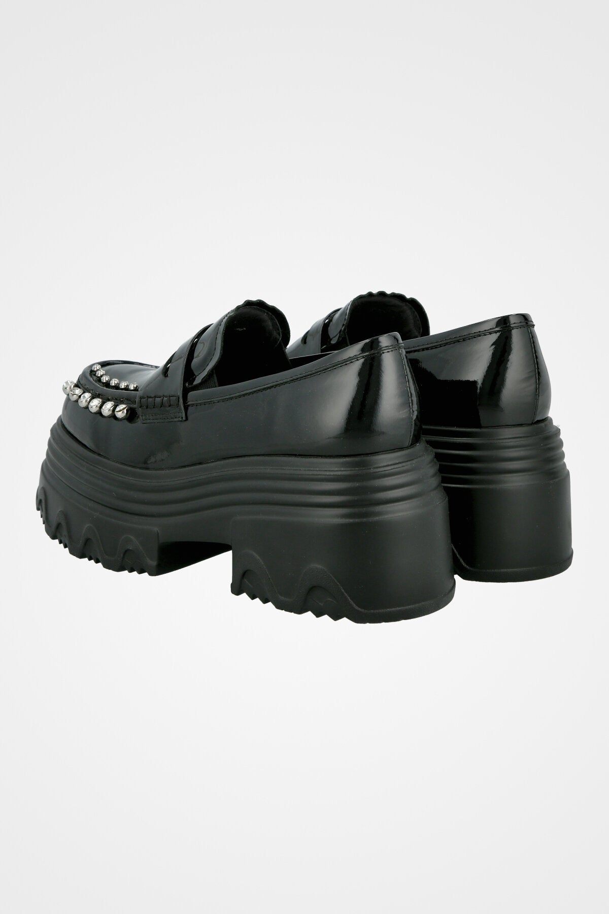 מוקסין שחור מבריק עם חרטום מעוגל, רצועה קדמית, שורת ניטים כסופים בחזי וסוליה עבה ומשוננת
