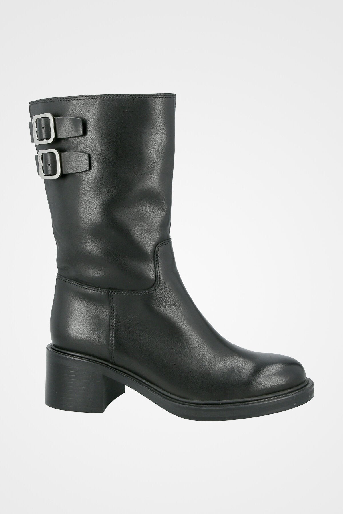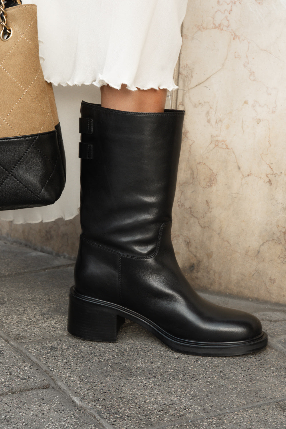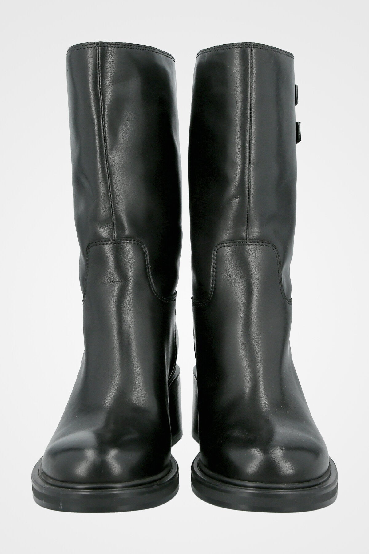 מגף בצבע שחור עור עד אמצע השוק, עם שני אבזמים מתכתיים בצד חזית מעוגלת ועקב נמוך