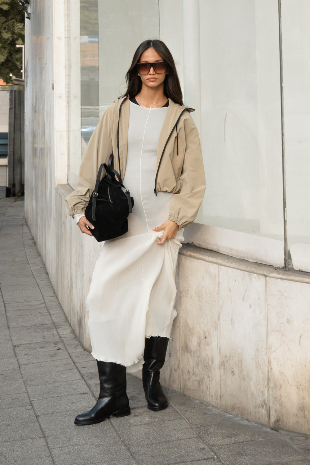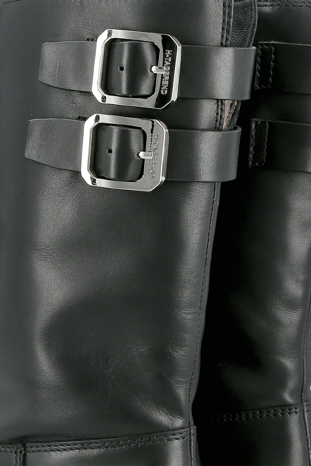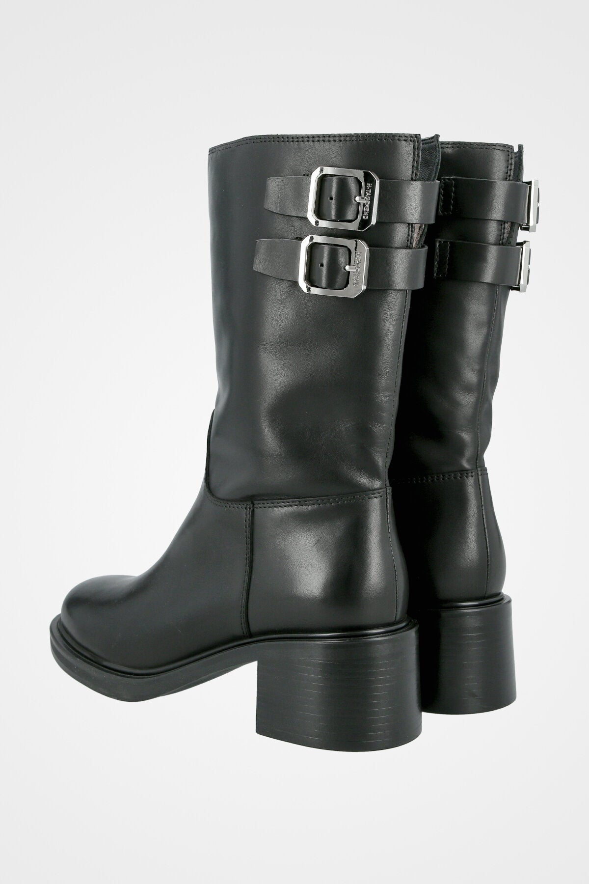מגף בצבע שחור עור עד אמצע השוק, עם שני אבזמים מתכתיים בצד חזית מעוגלת ועקב נמוך