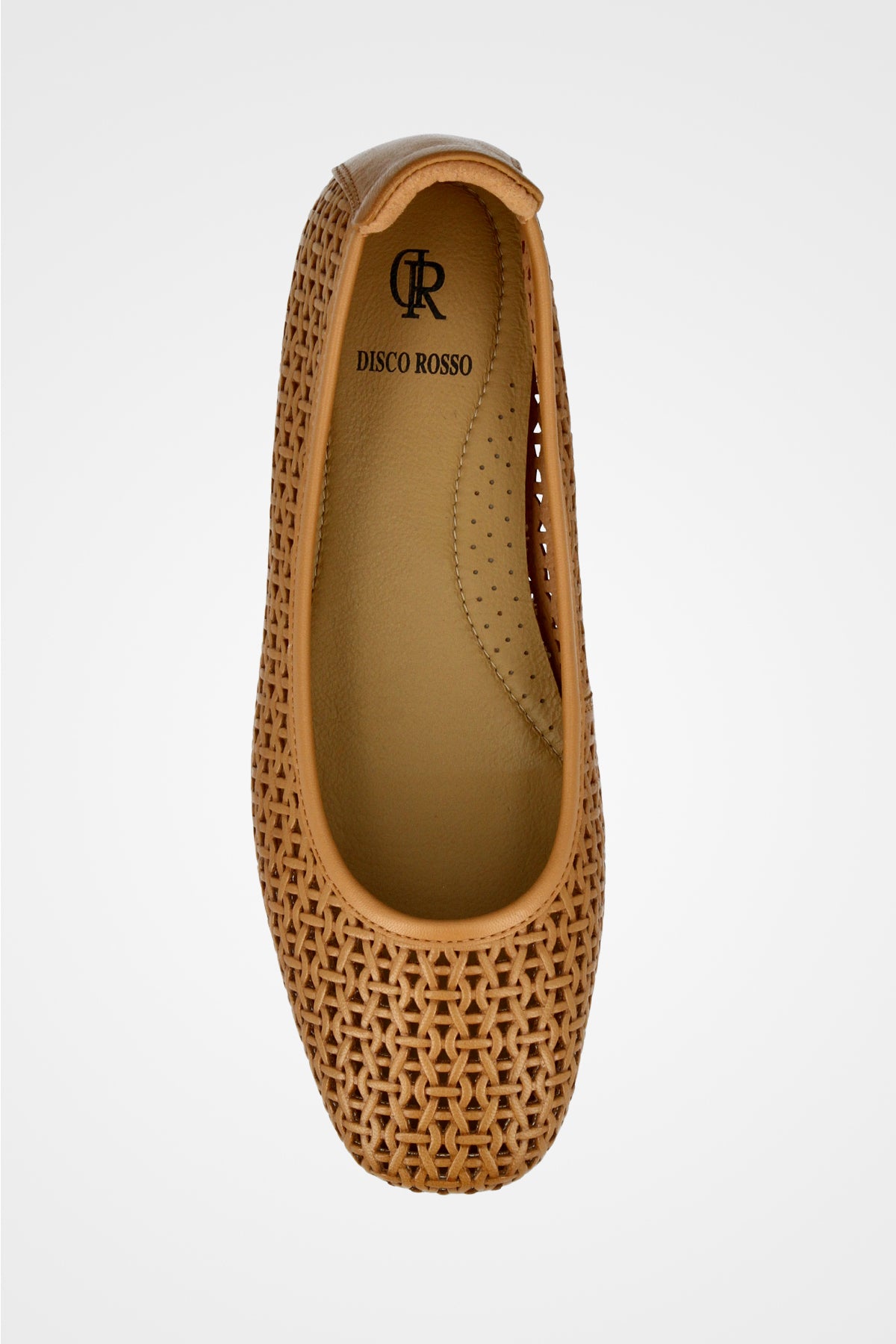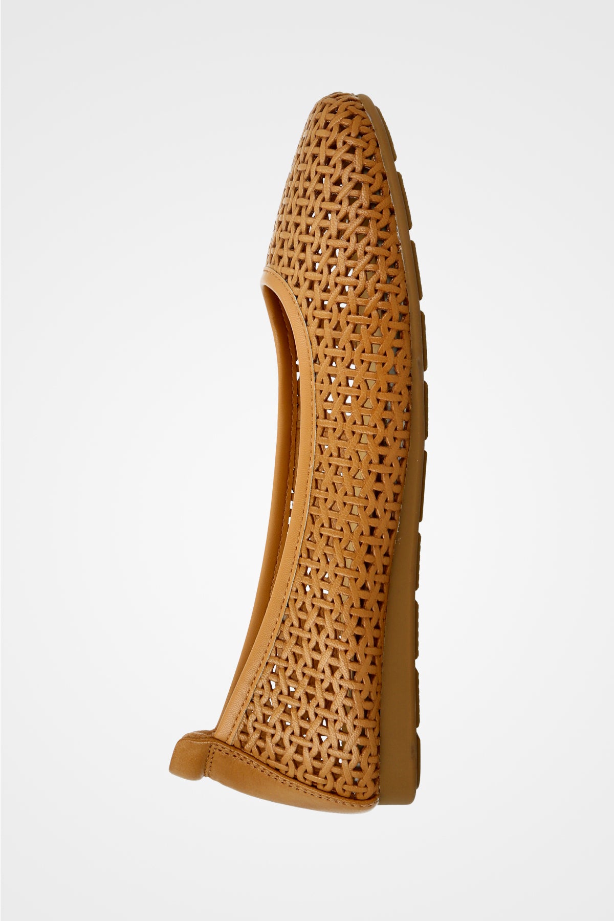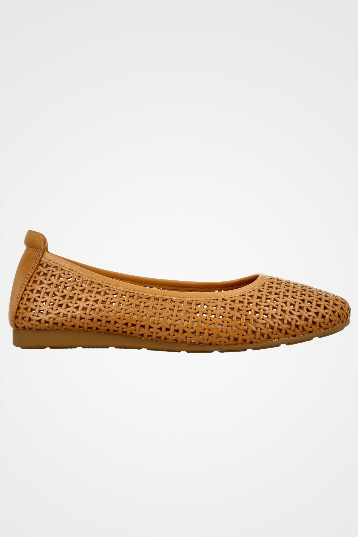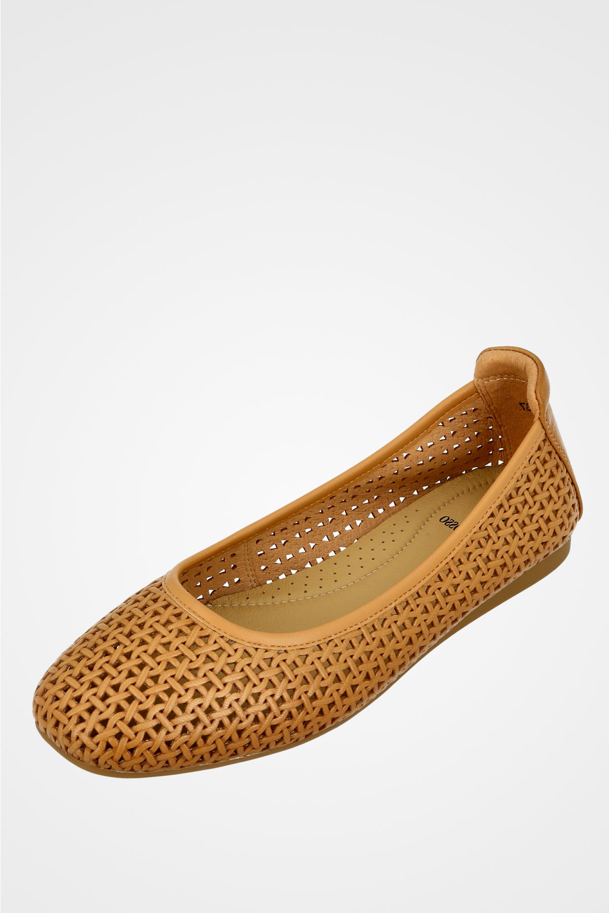 נעל בובה שטוחה בצבע בז, עשויה חומר קלוע ומחורר, עם עיצוב עגול ופשוט למראה קיצי יומיומי נוח