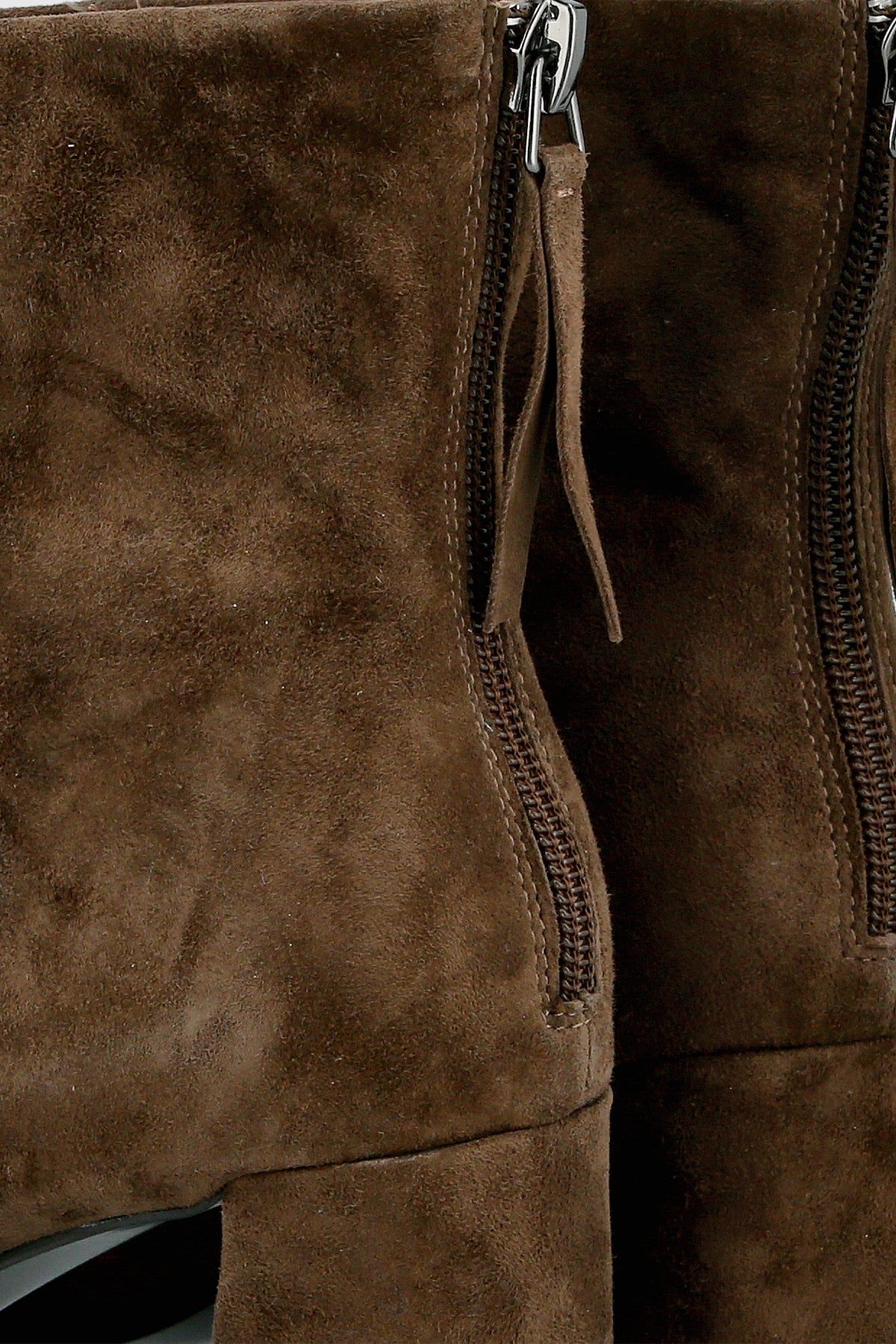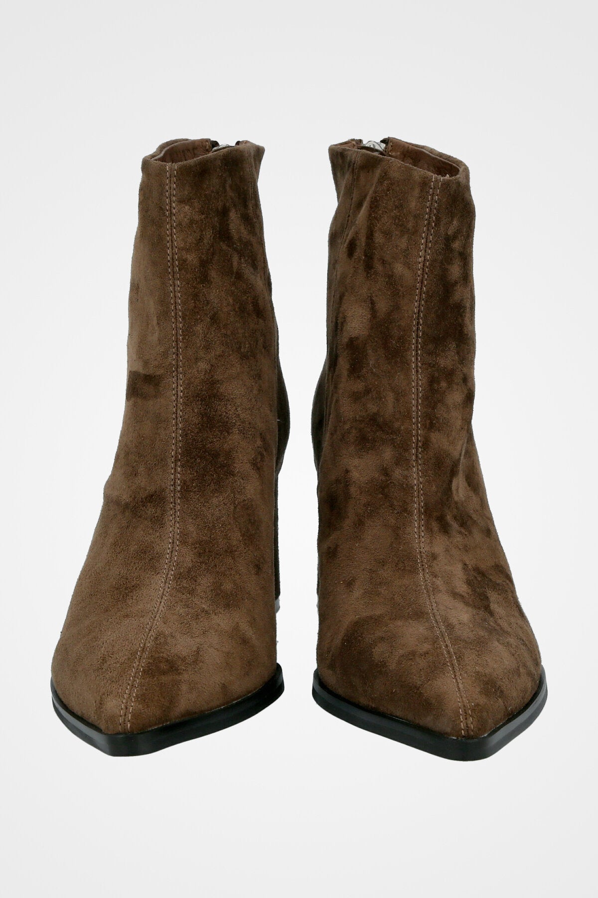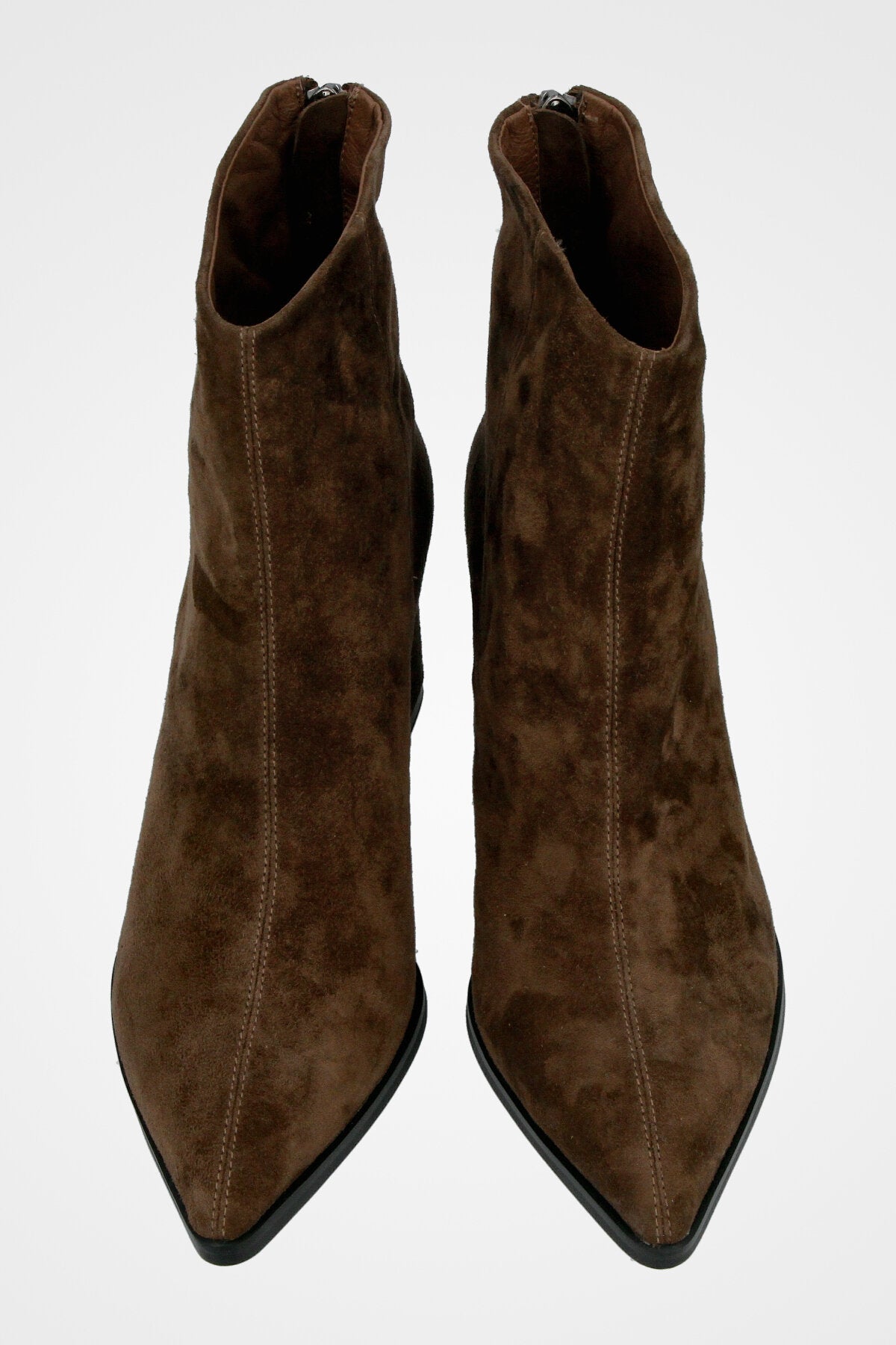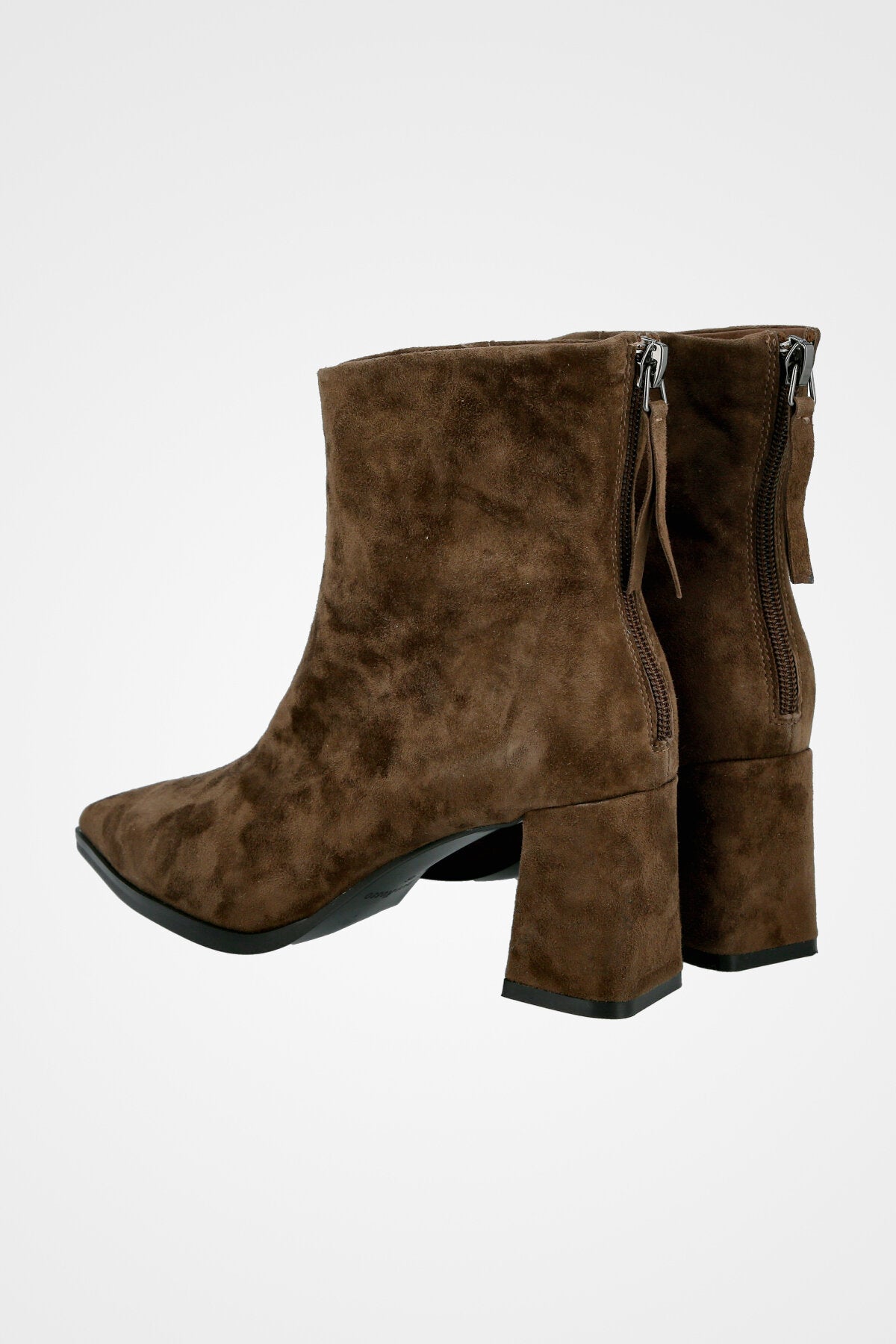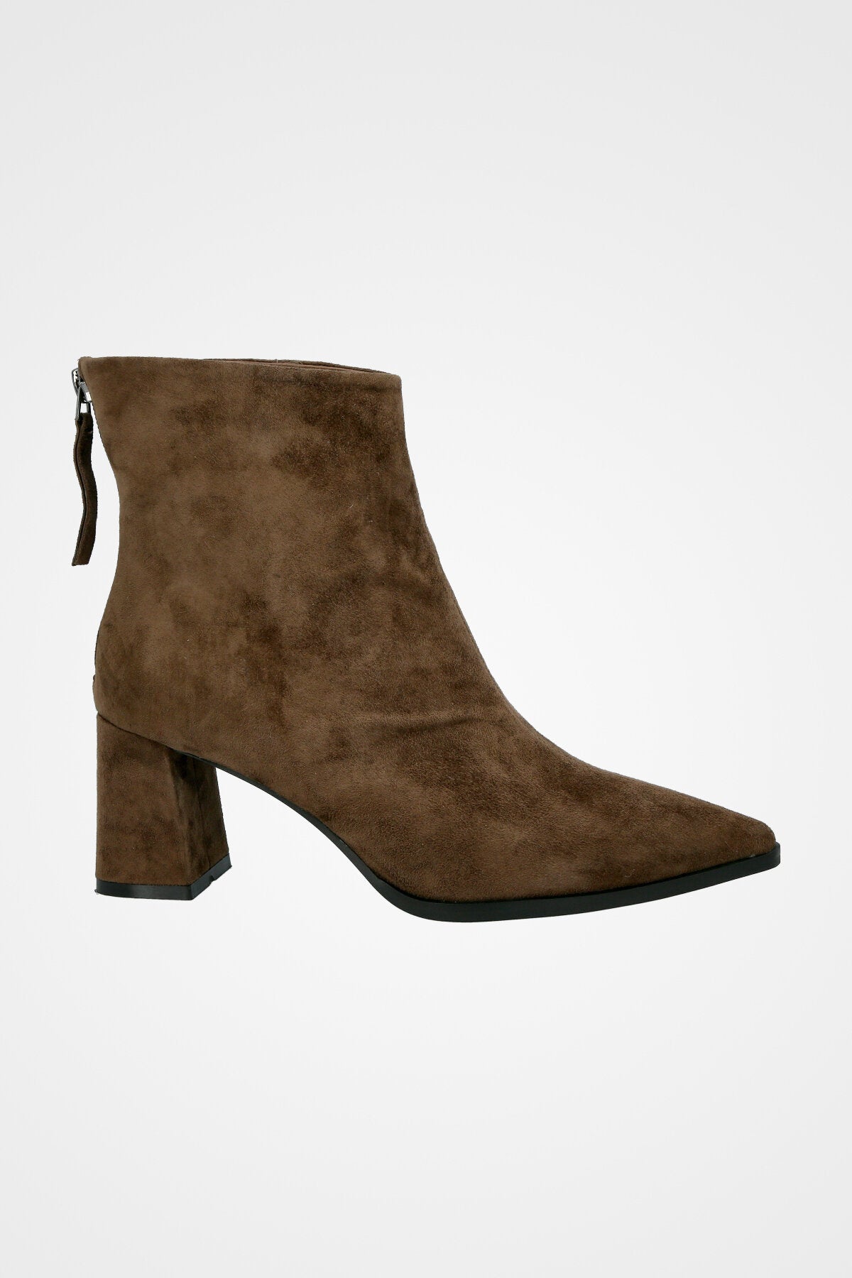 מגף קרסול שחור קלאסי עשוי עור זמש חום, עם קדמת נעל מחודדת, עקב רחב בינוני ורוכסן אחורי לנוחות