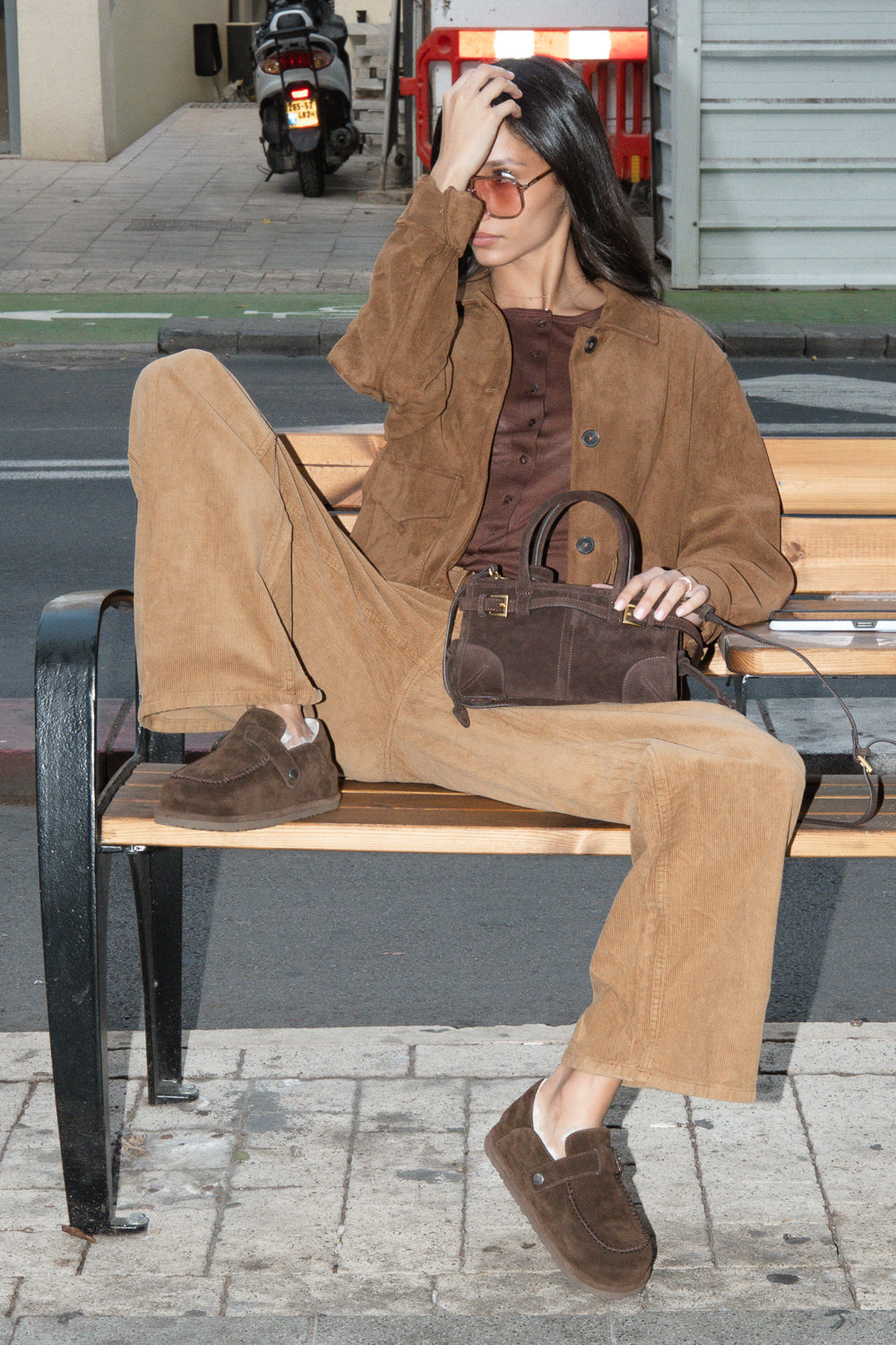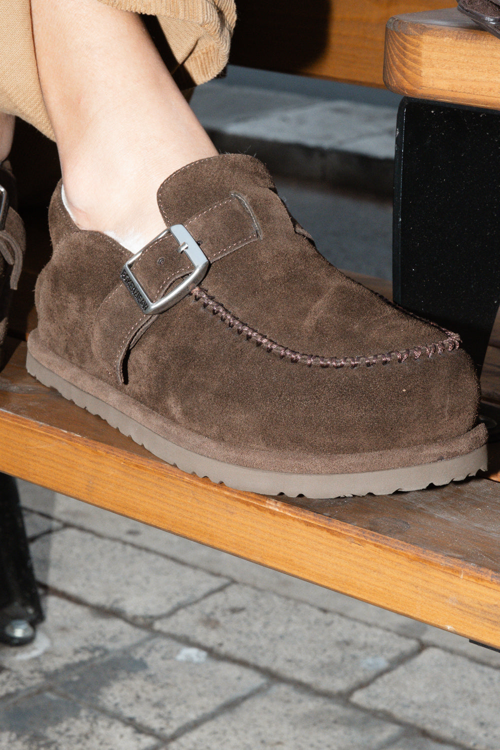 נעל מוקסין בצבע חום כהה מעור זמש עם פרווה מבפנים בצבע לבן, רצועה בקדמת הנעל ואבזם לסגירה