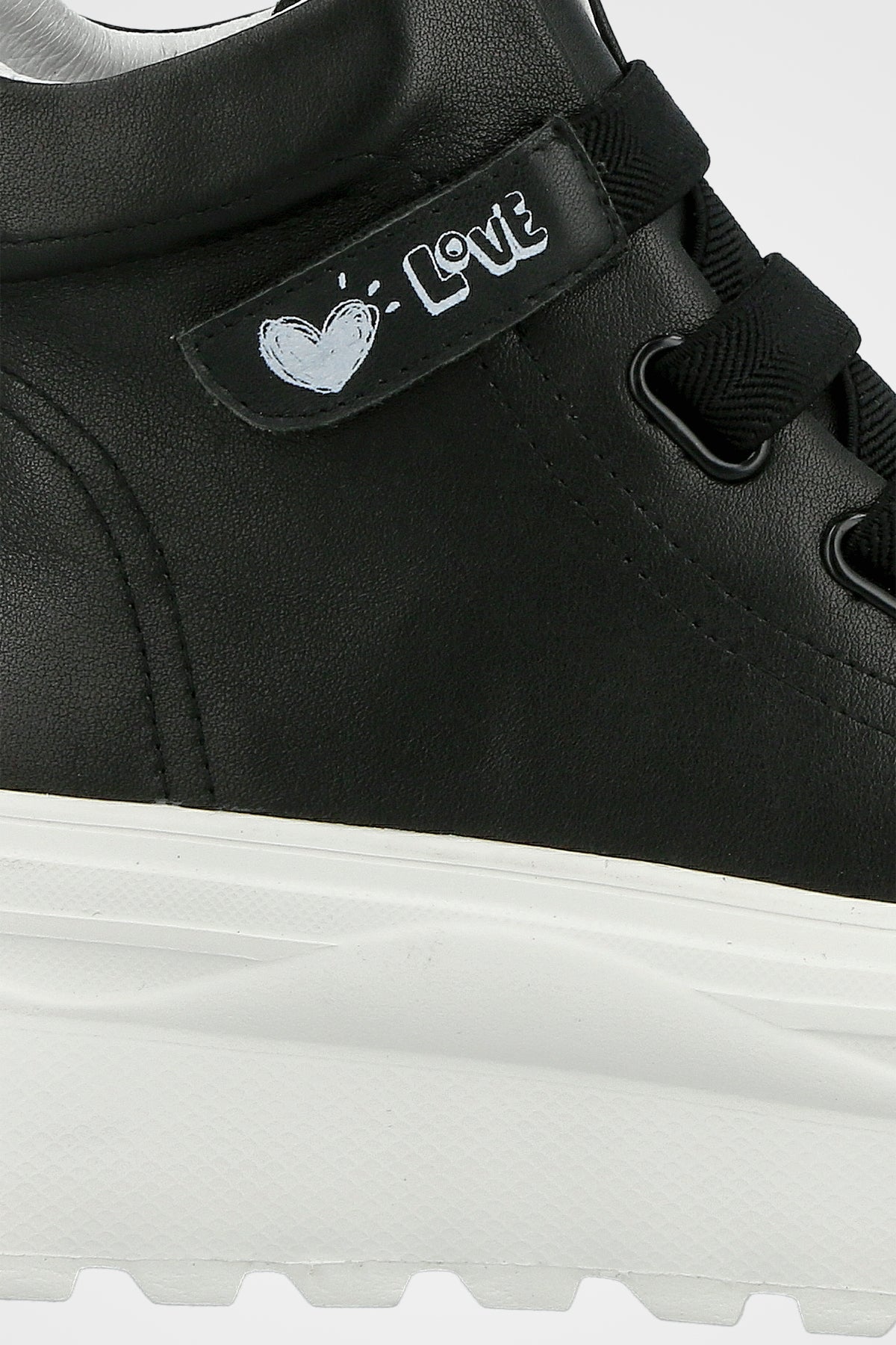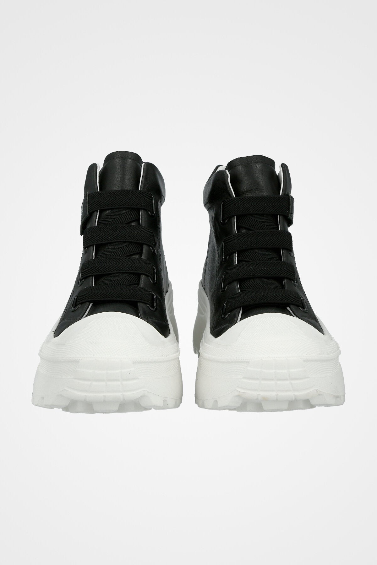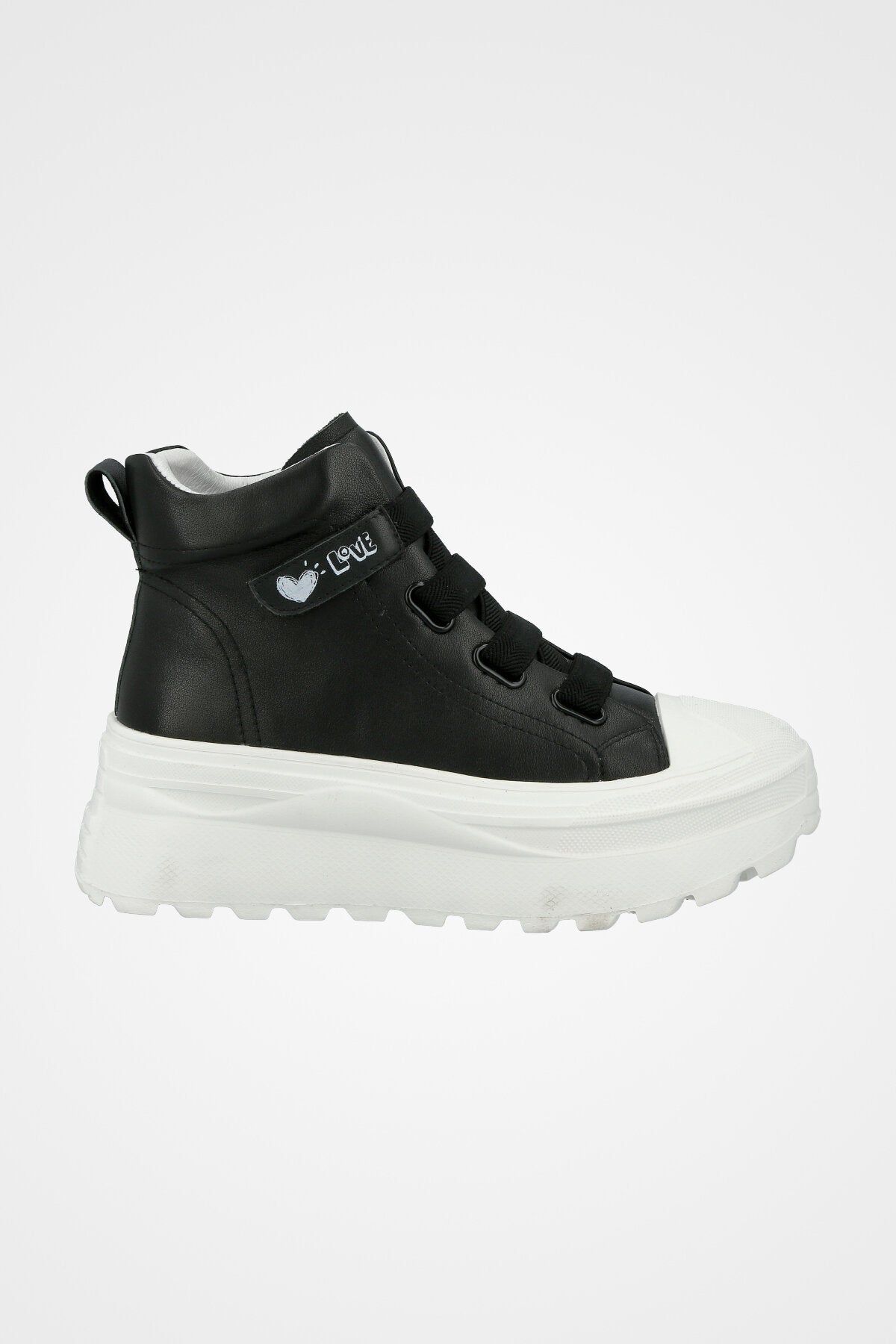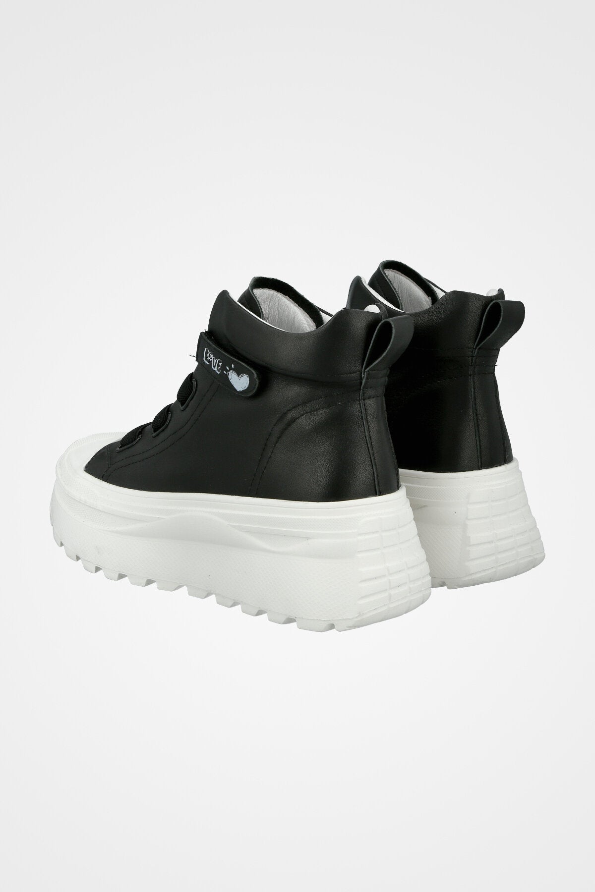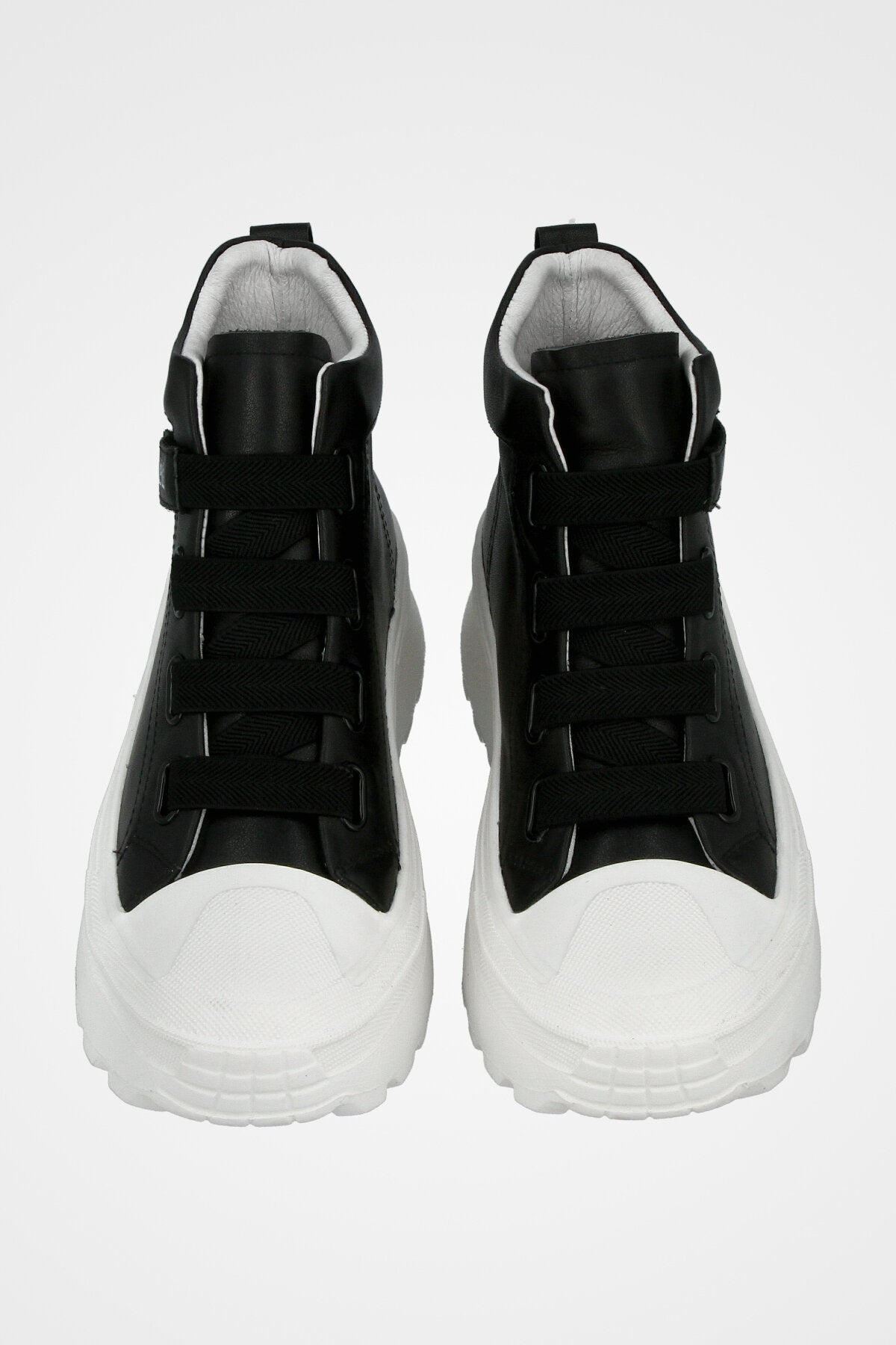 סניקרס גבוהות בצבע שחור, בעלות סולייה משומנת ושרוכי גומי בשילוב סגירת סקוץ׳ עם כיתוב