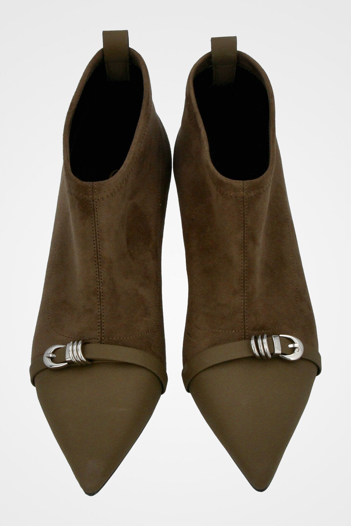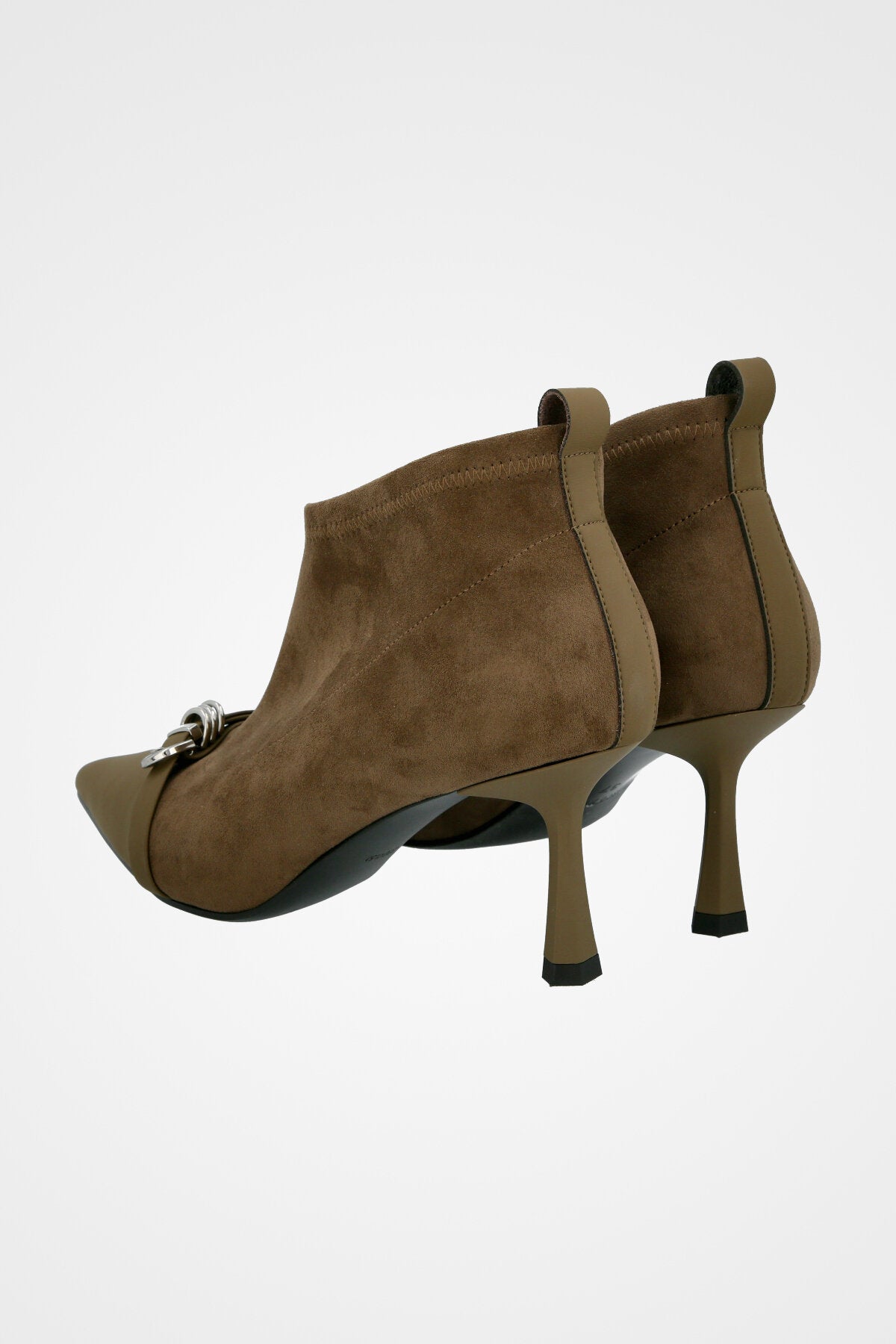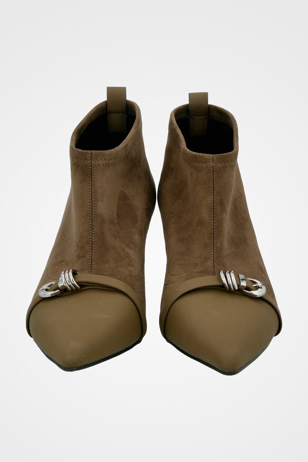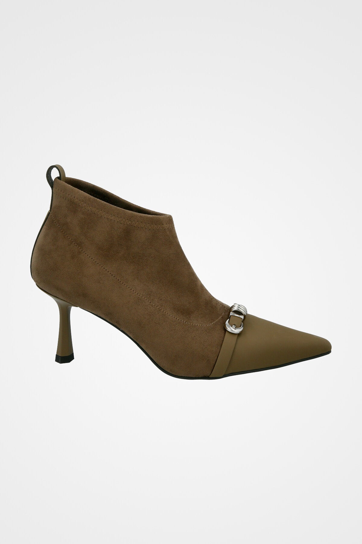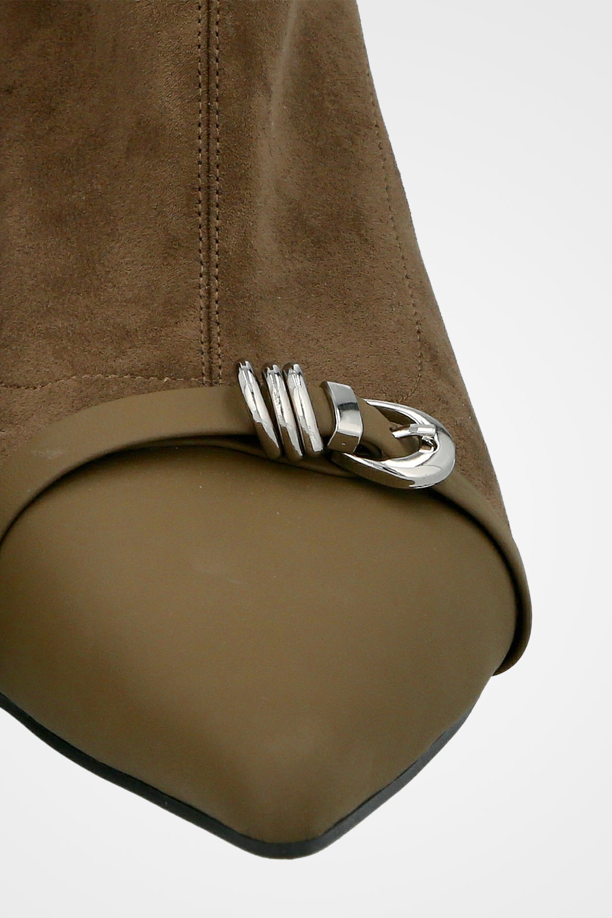 מגפון שפיץ בצבע חאקי אלגנטי מלייקרה, עקב דק בינוני ורצועת פירסינג מתכתית
