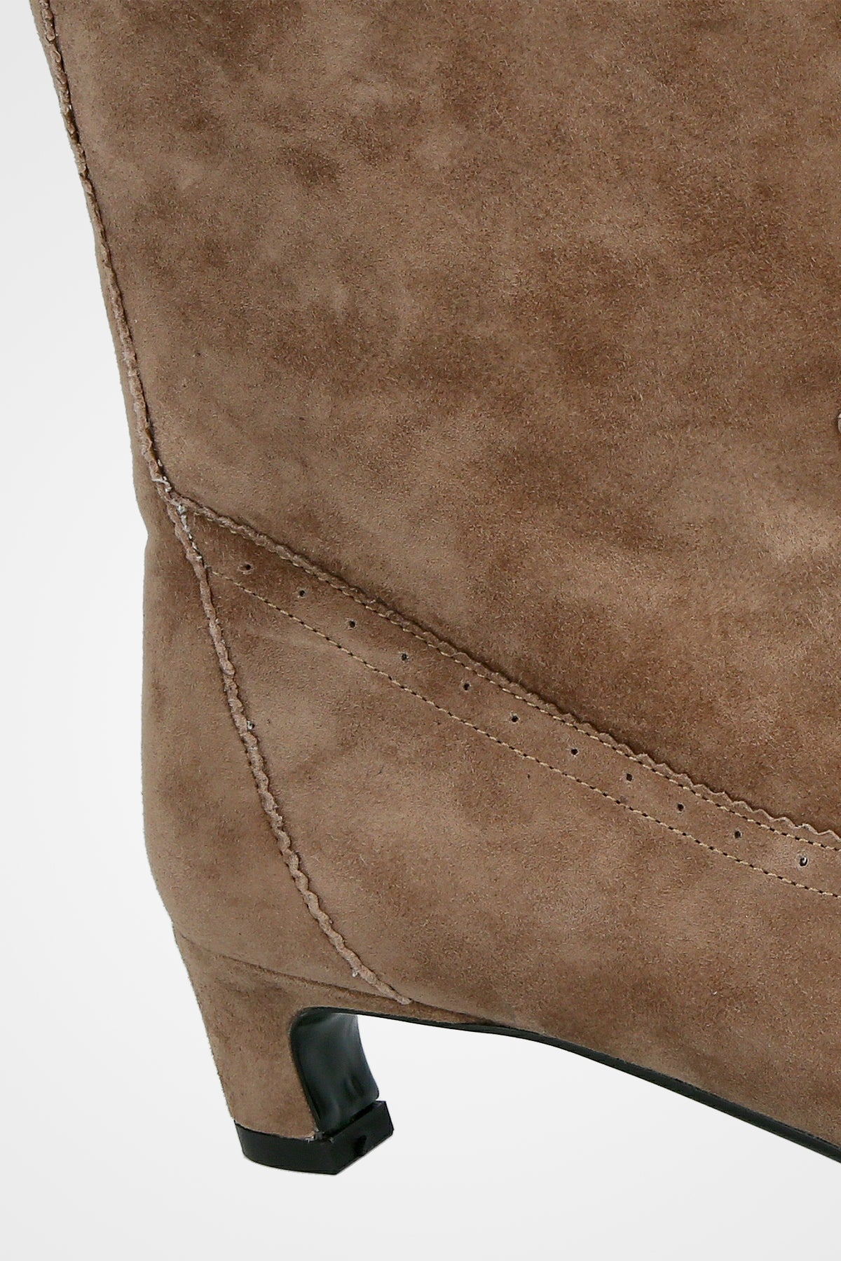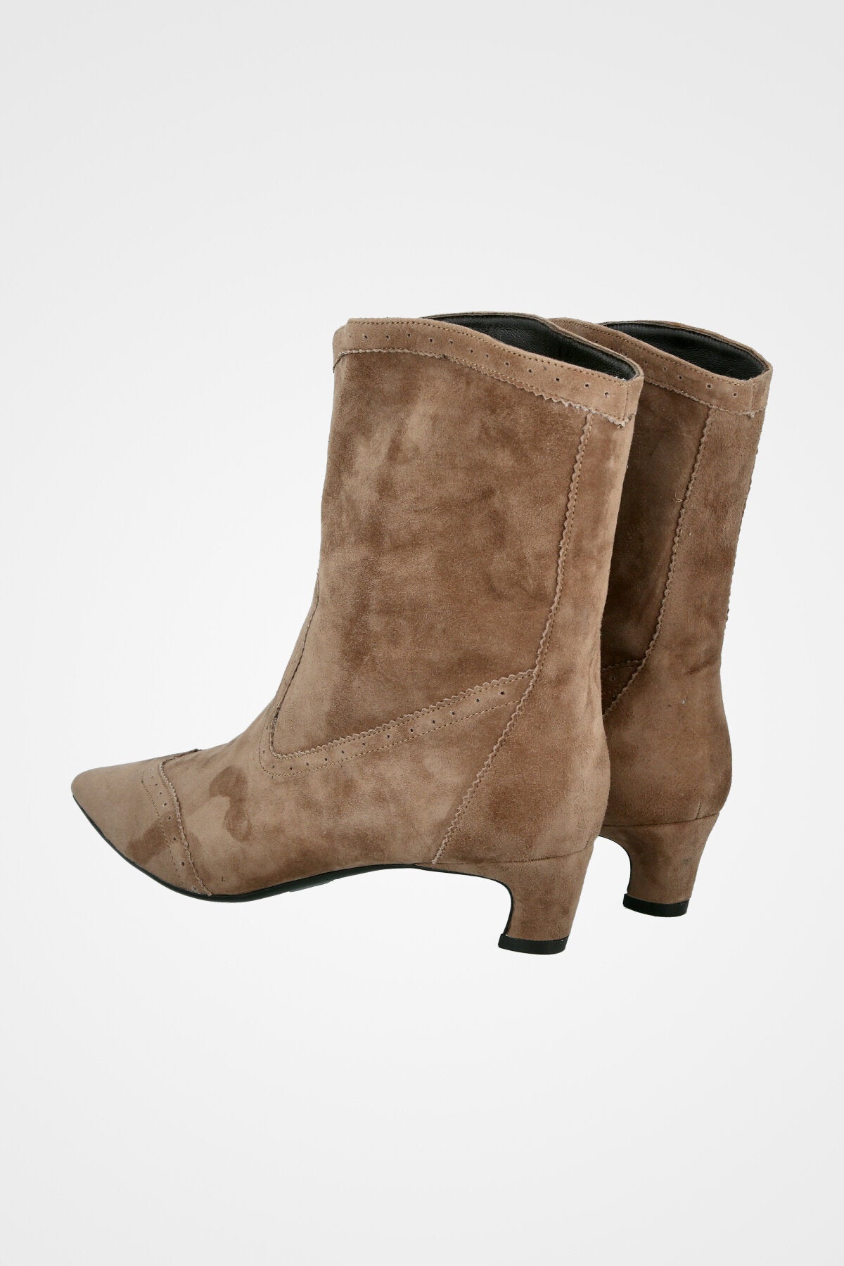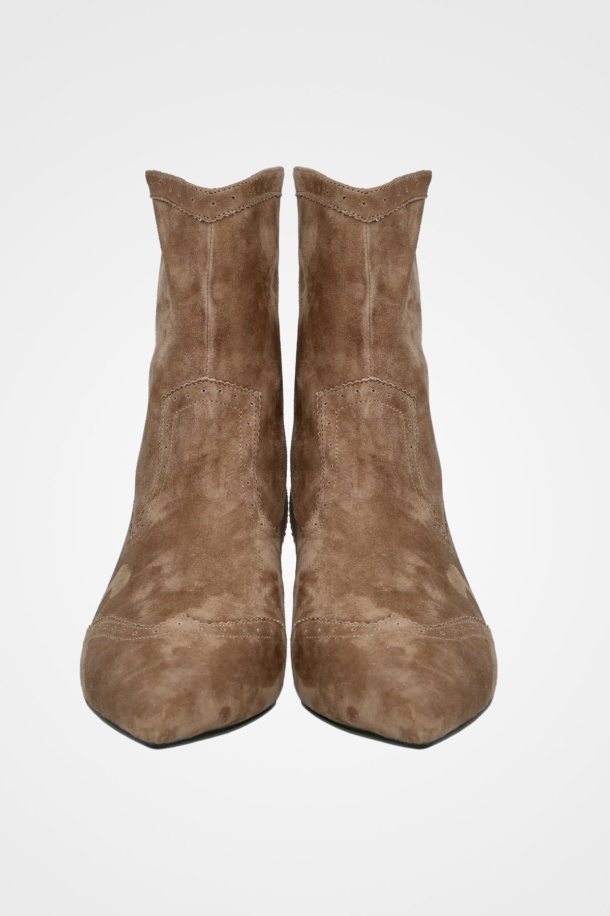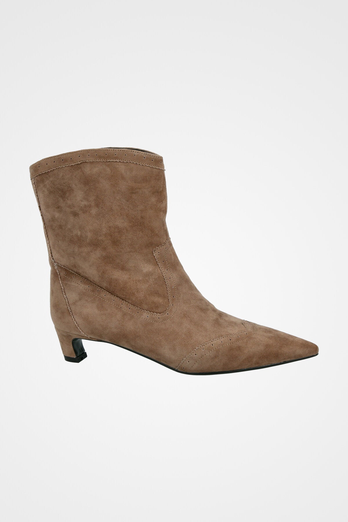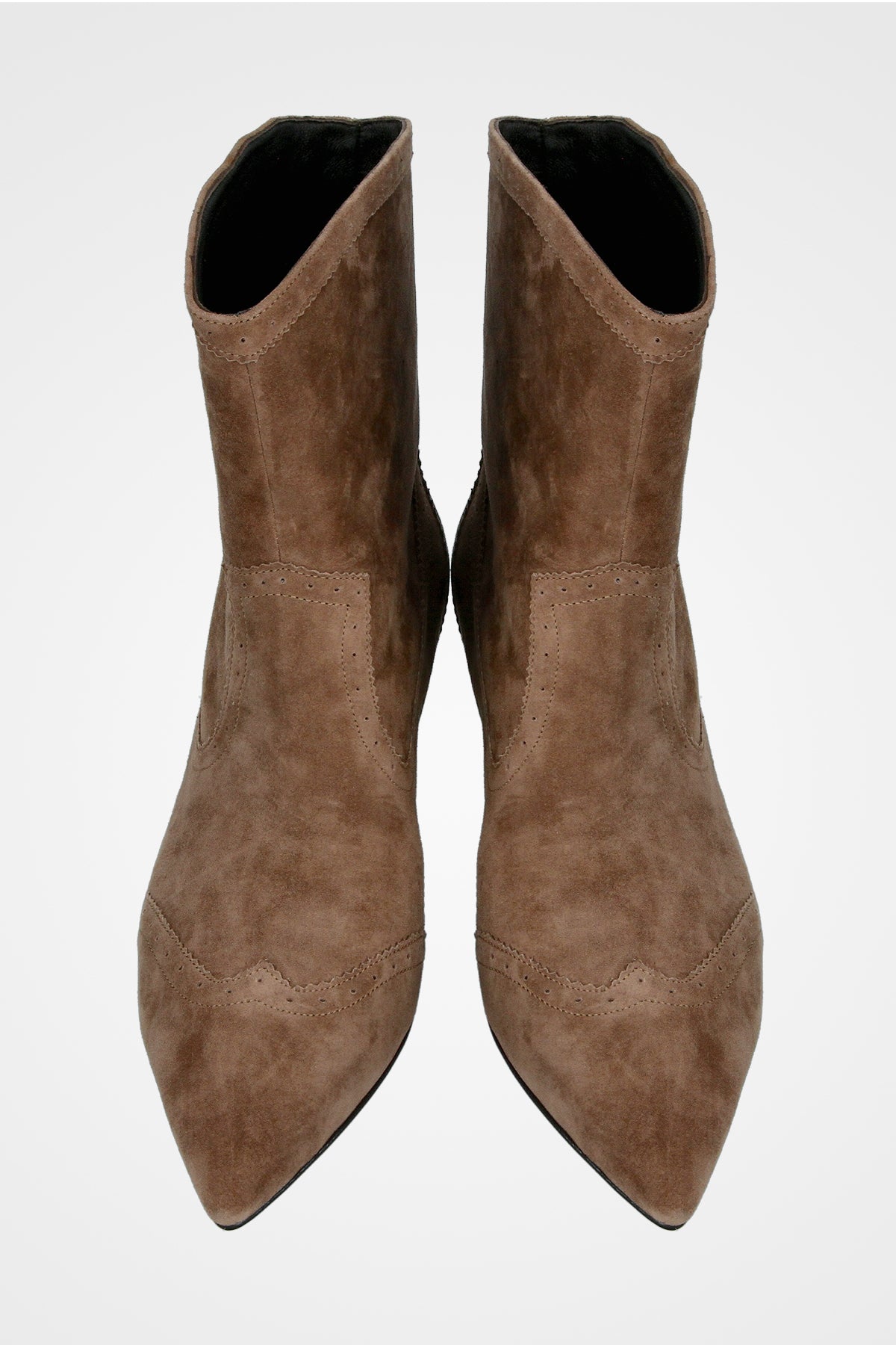 מגף קרסול בצבע חום אפרפר מזמש, בעיצוב מחודד עם עקב נמוך אלגנטי