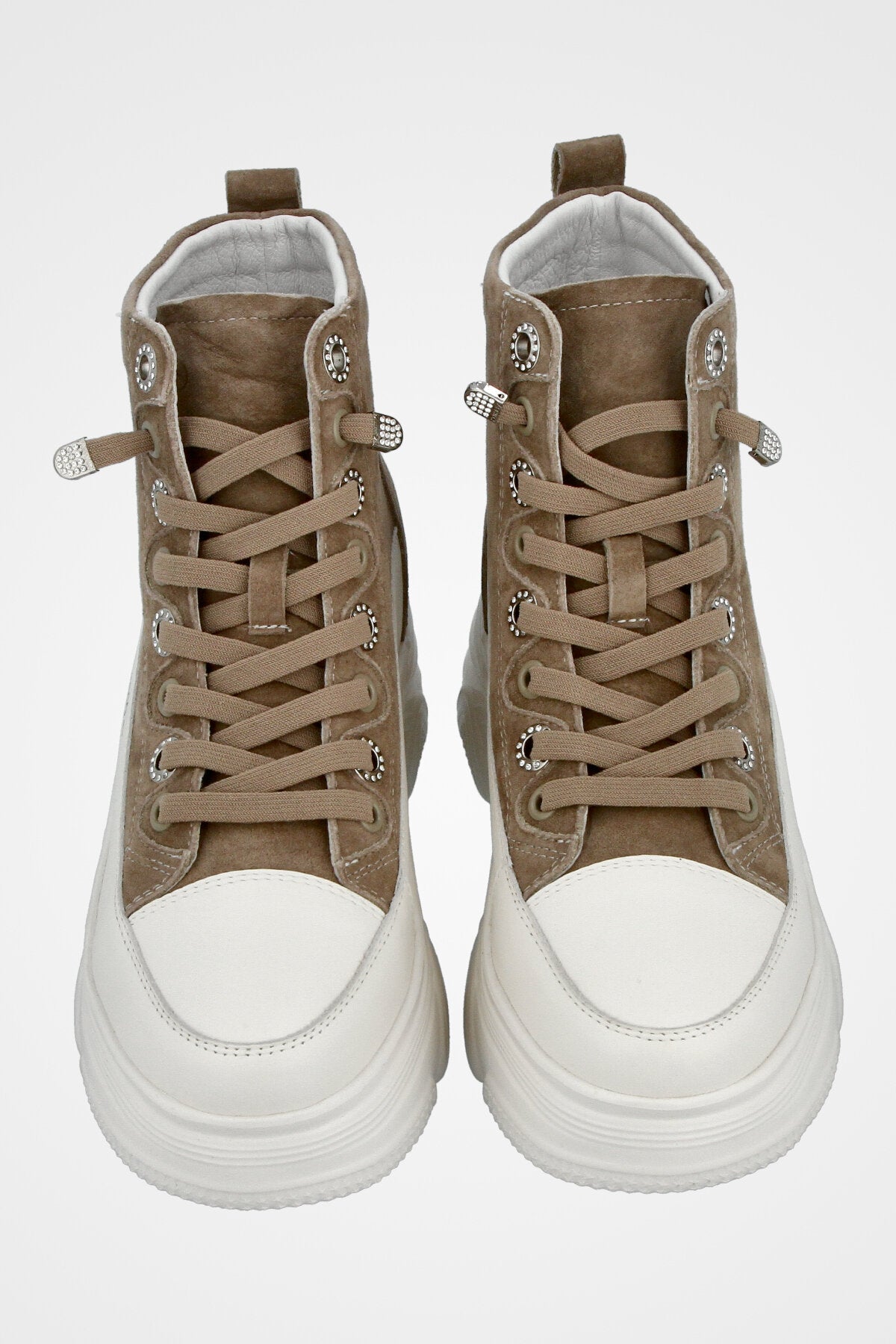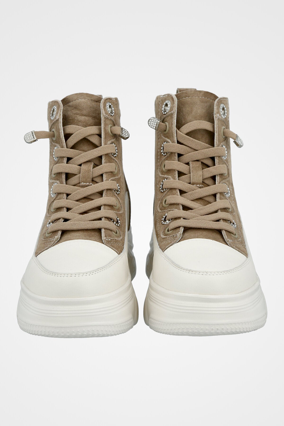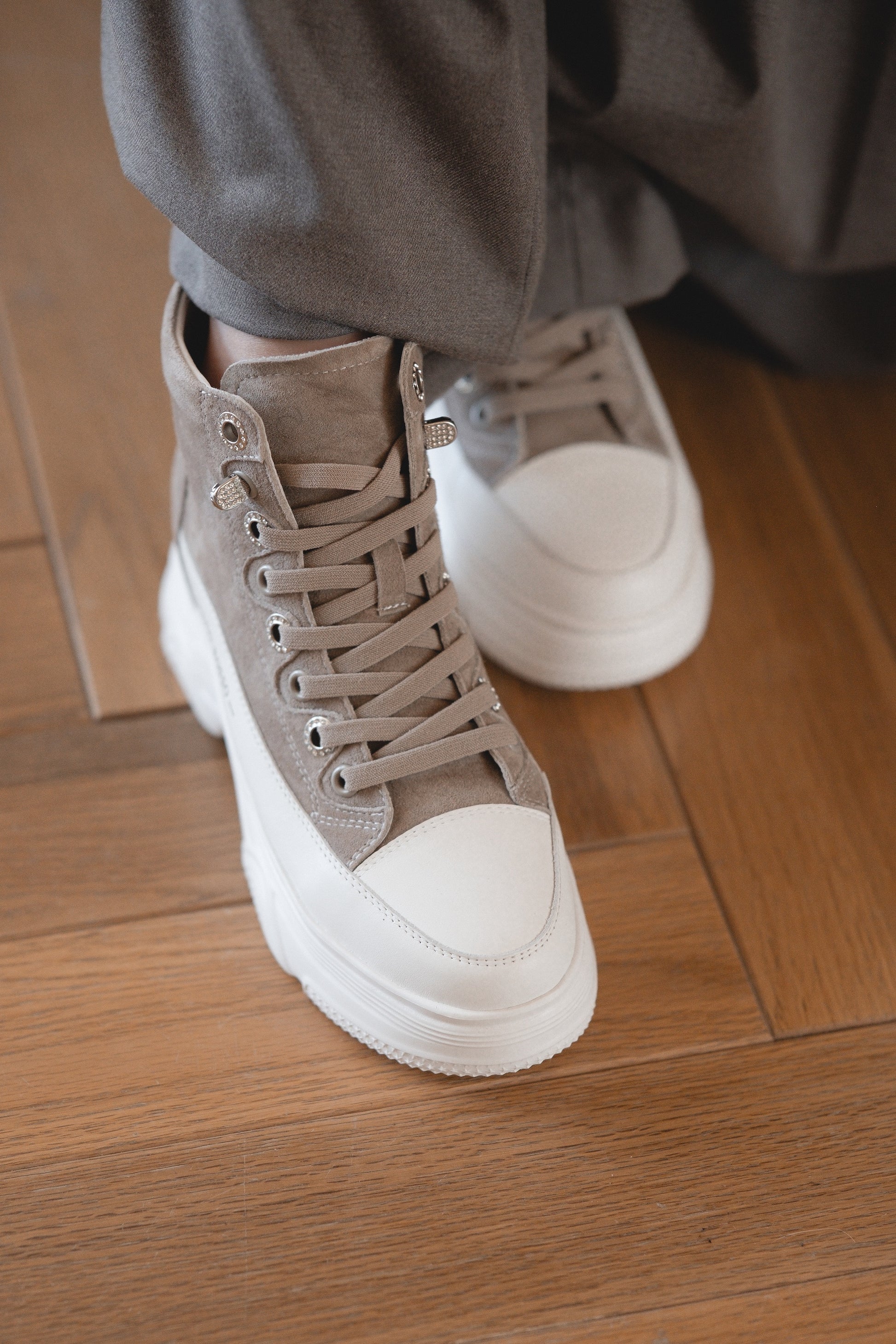 נעל סניקרס גבוהה בצבע קאמל זמש בעלת שרוכים מגומי, עיטורים בצידי הנעל וסוליה לבנה עבה ומחורצת