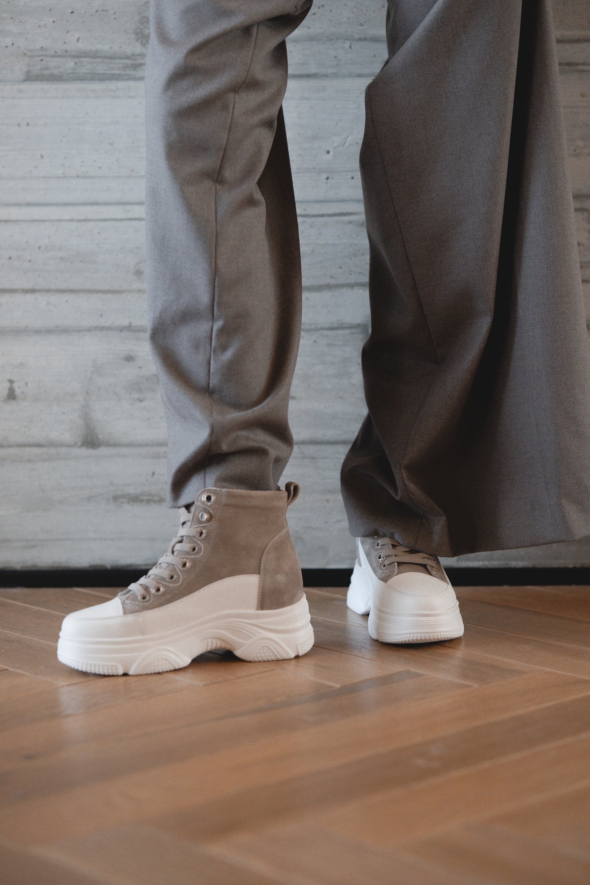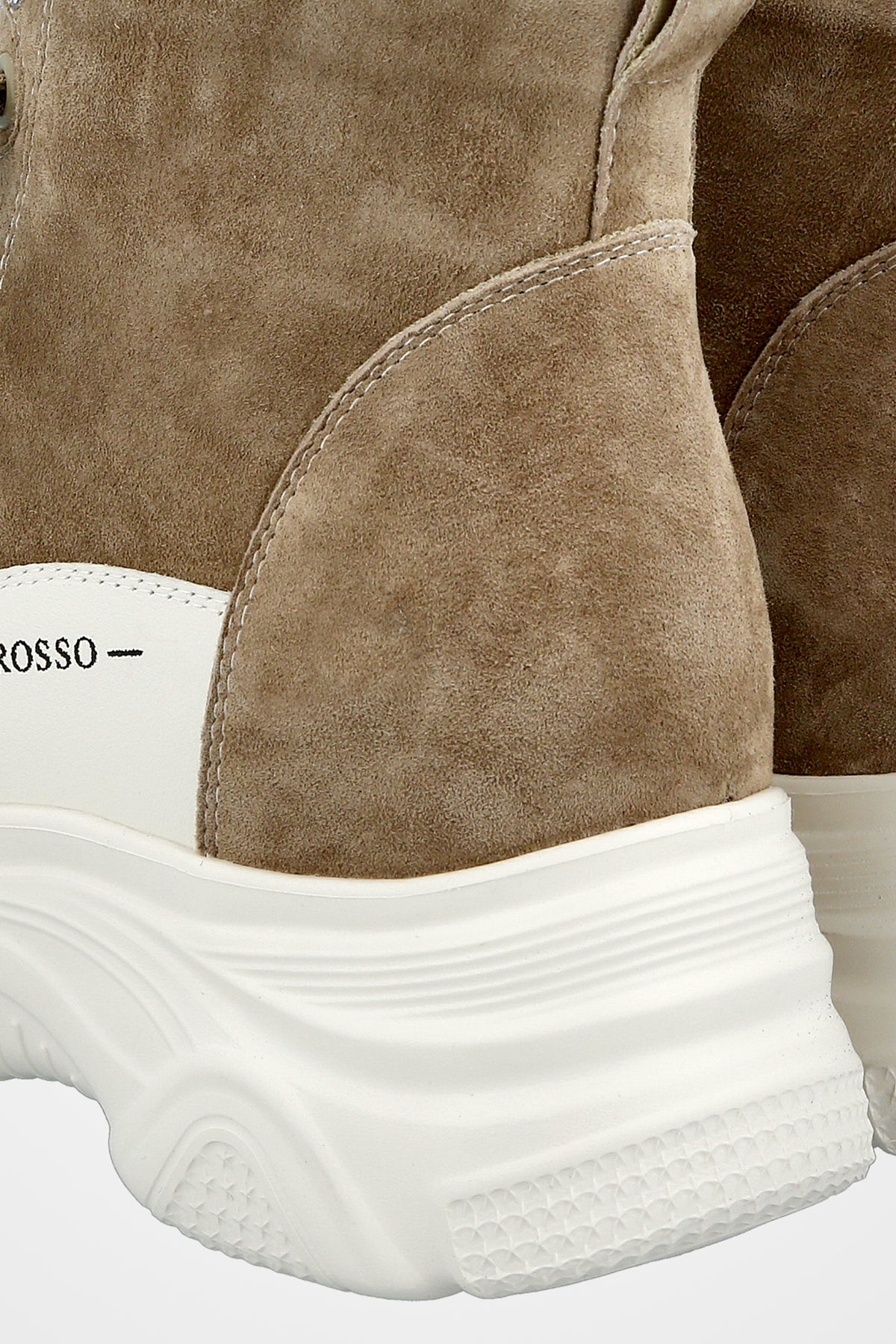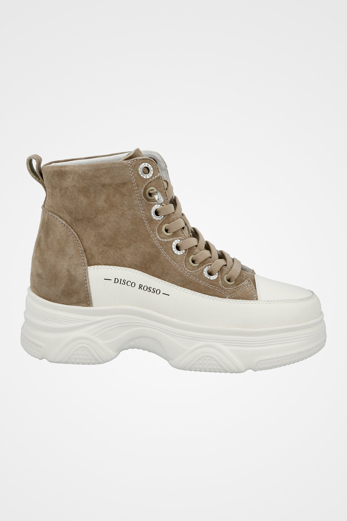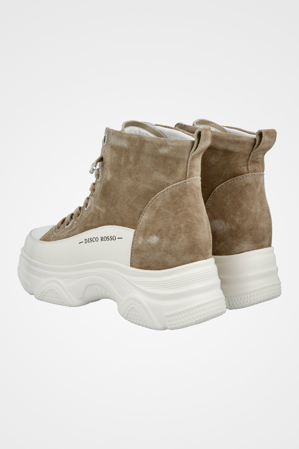 נעל סניקרס גבוהה בצבע קאמל זמש בעלת שרוכים מגומי, עיטורים בצידי הנעל וסוליה לבנה עבה ומחורצת