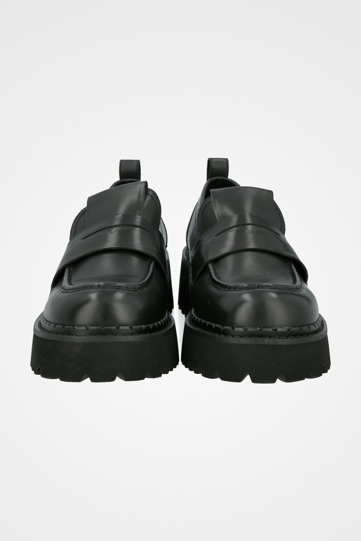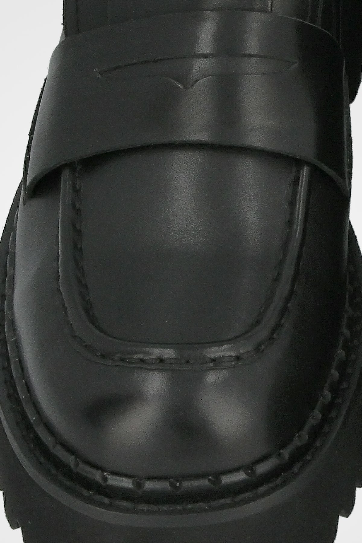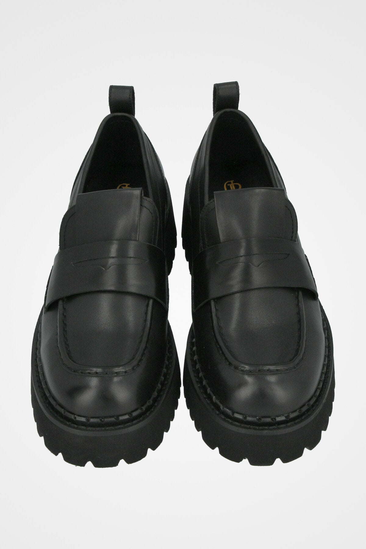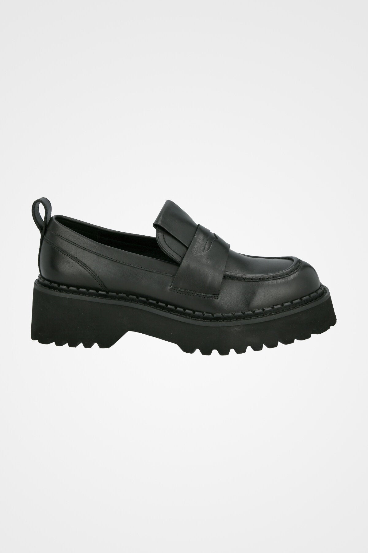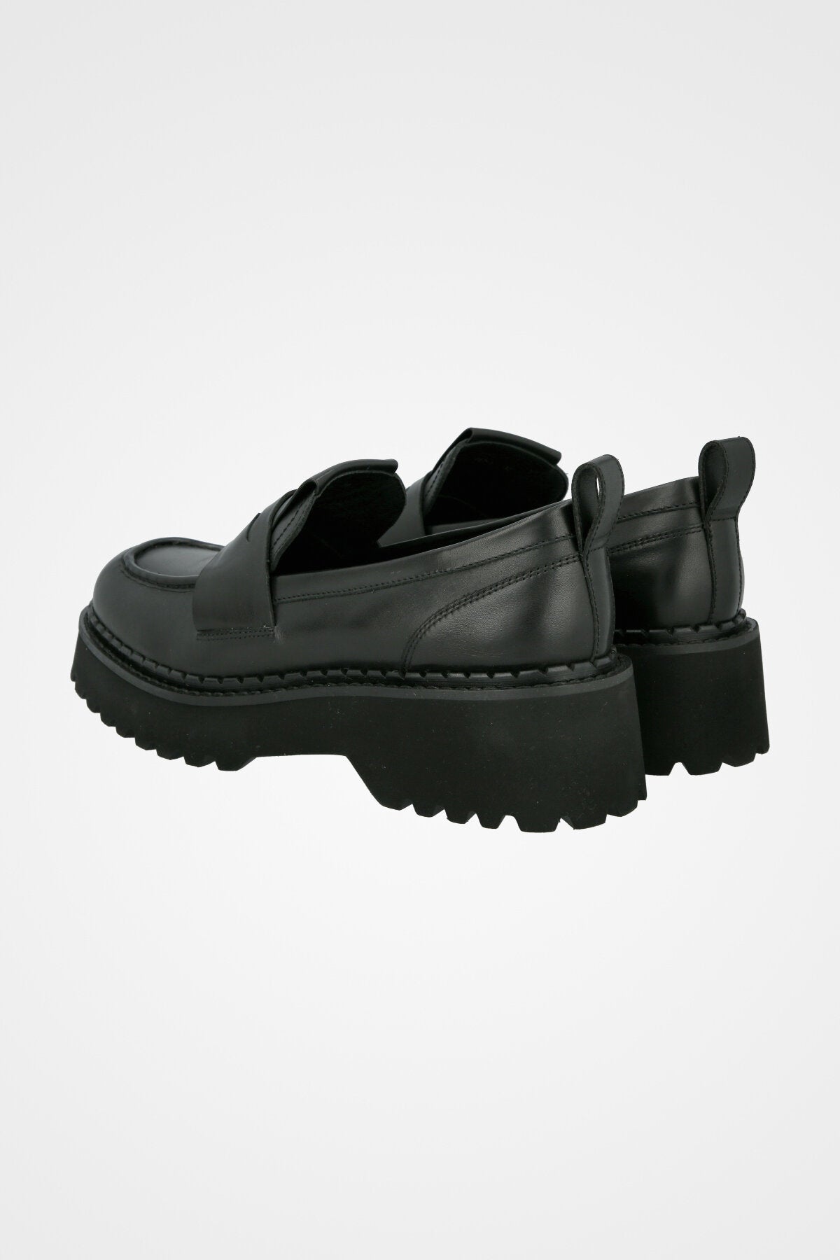 נעל מוקסין בצבע שחור מעור, בעלת עיטור פס בלשונית בצבע תואם וסוליה שחורה משוננת