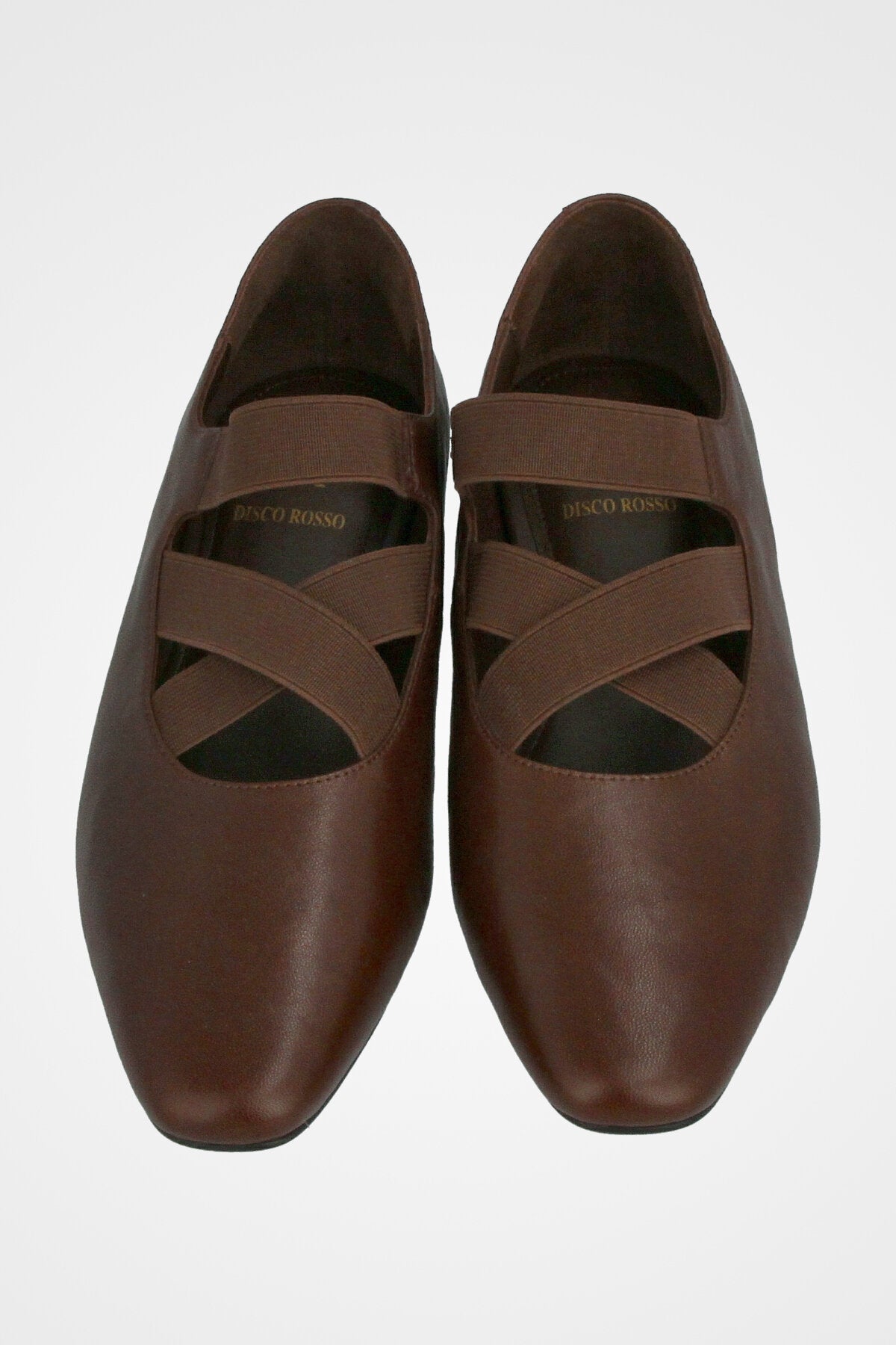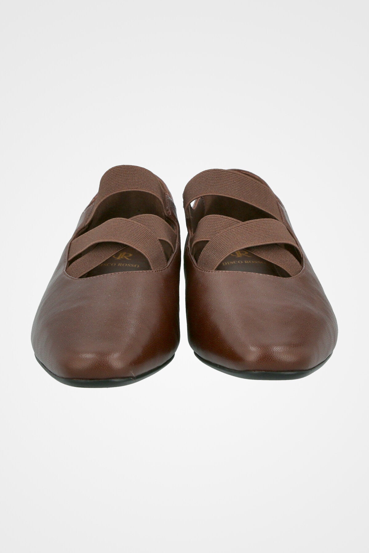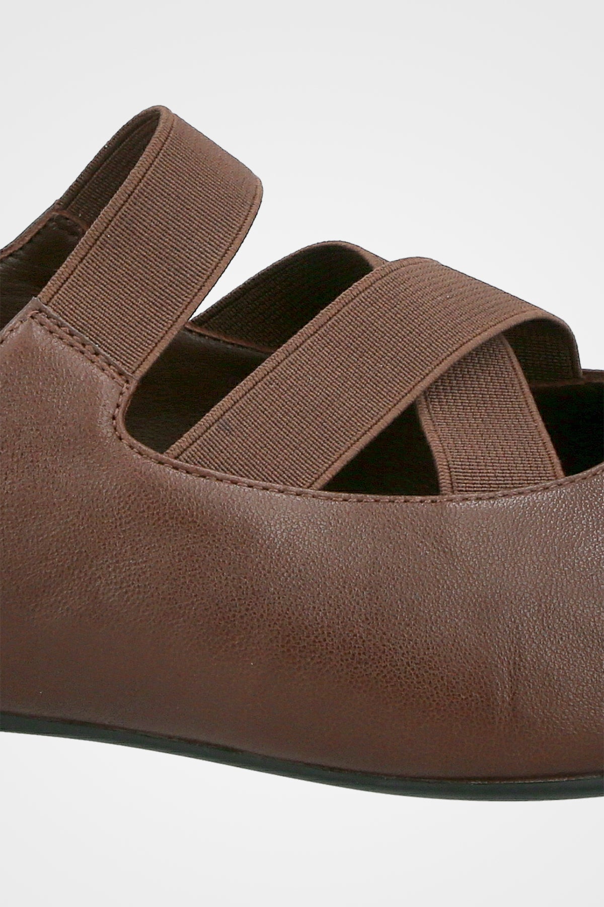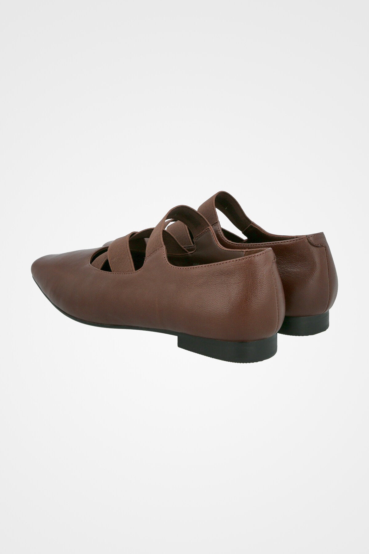נעל שטוחה בצבע חום, חרטום מחודד, שלוש רצועות אלכסוניות בחזית וסוליה שחורה ודקה