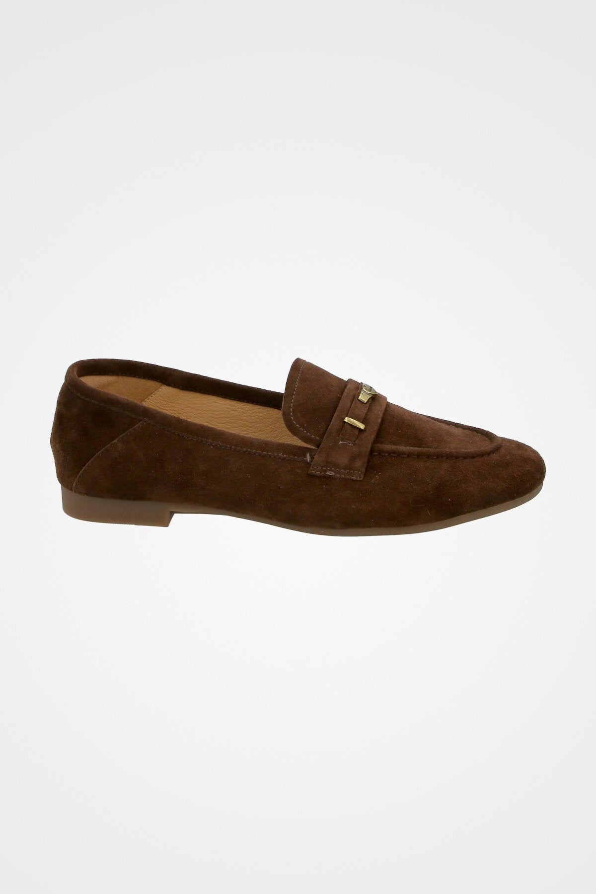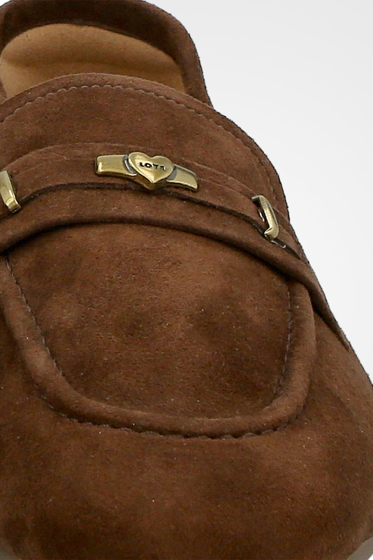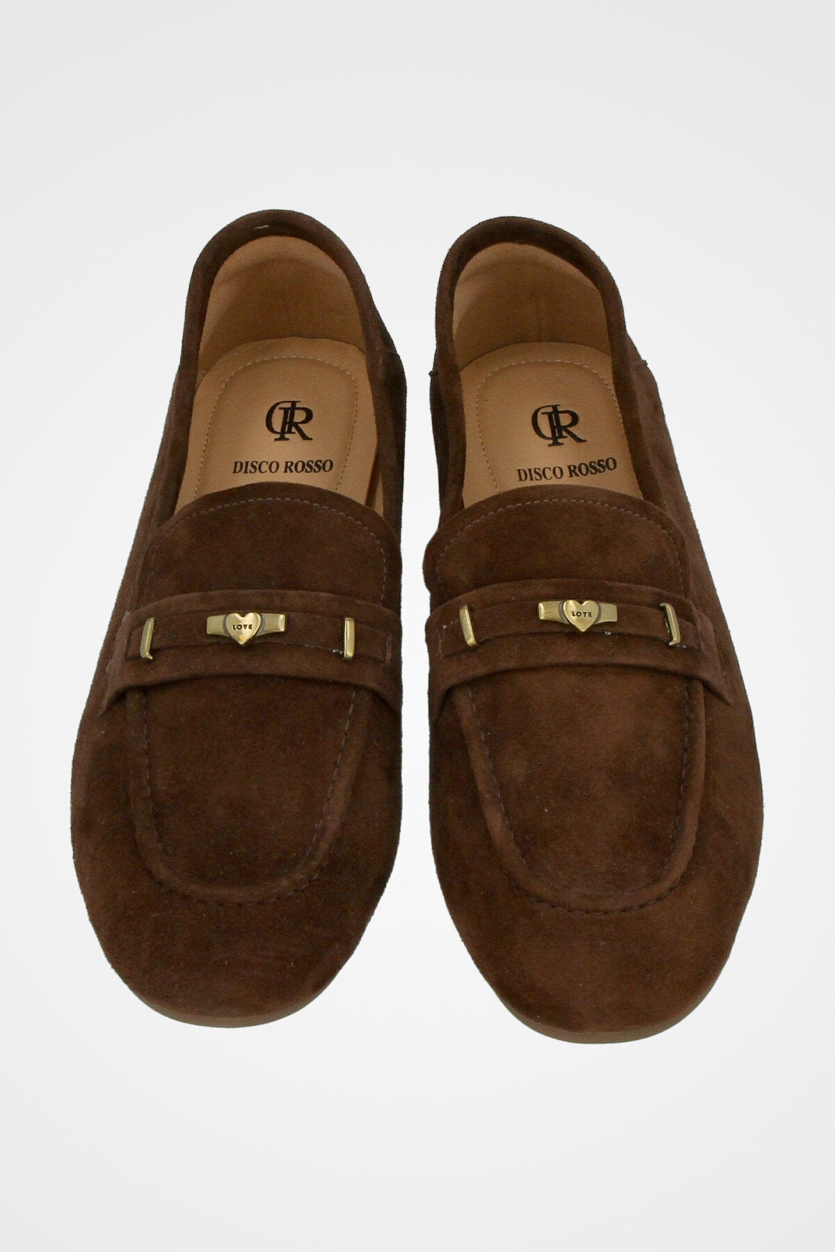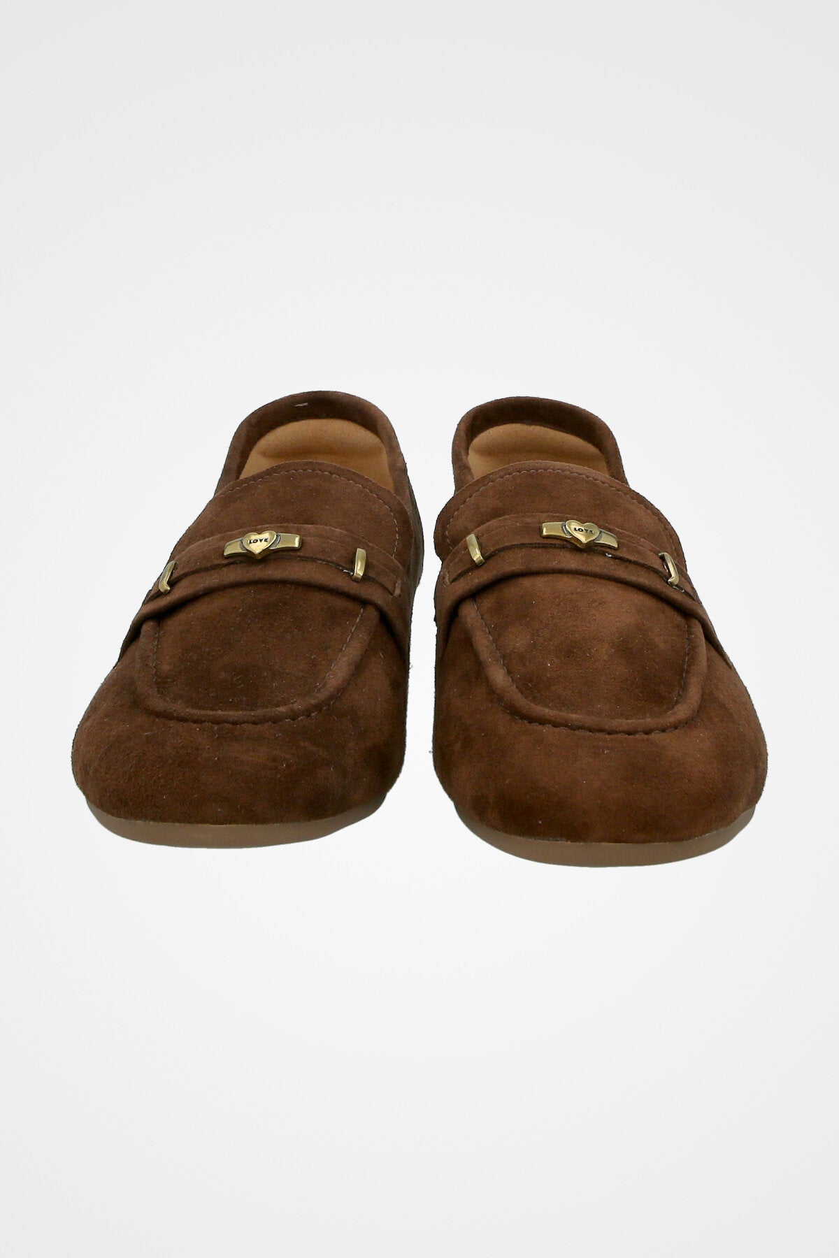 נעל מוקסין עור זמש חומה, בעלת חרטום מעוגל עם תפר קדמי, רצועה קדמית ועיטור מתכת זהוב בצורת לב