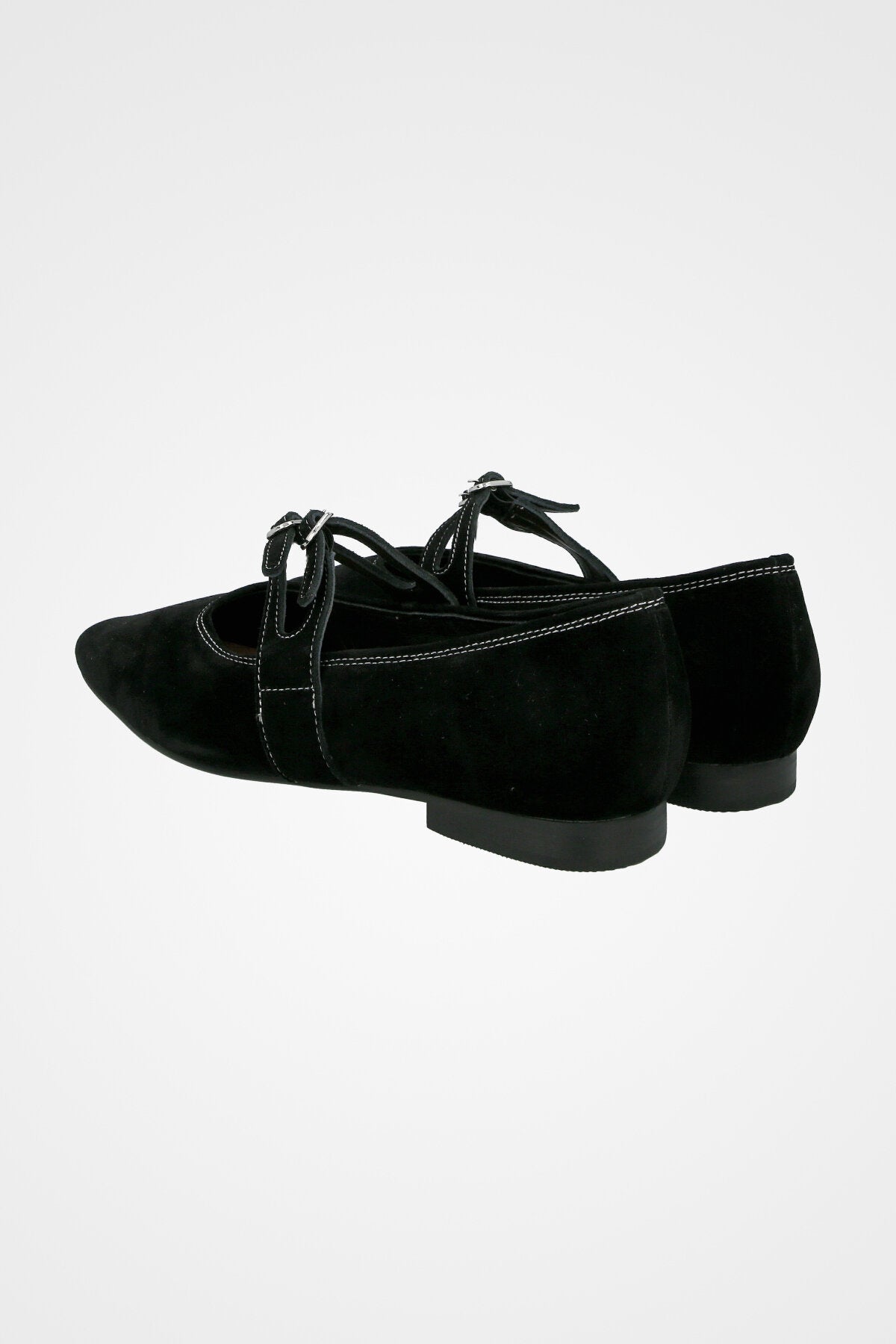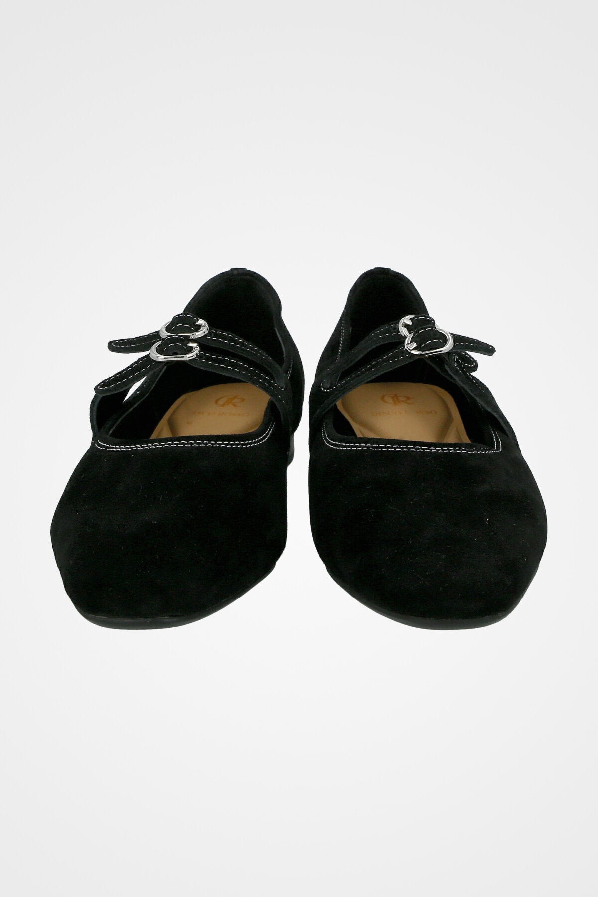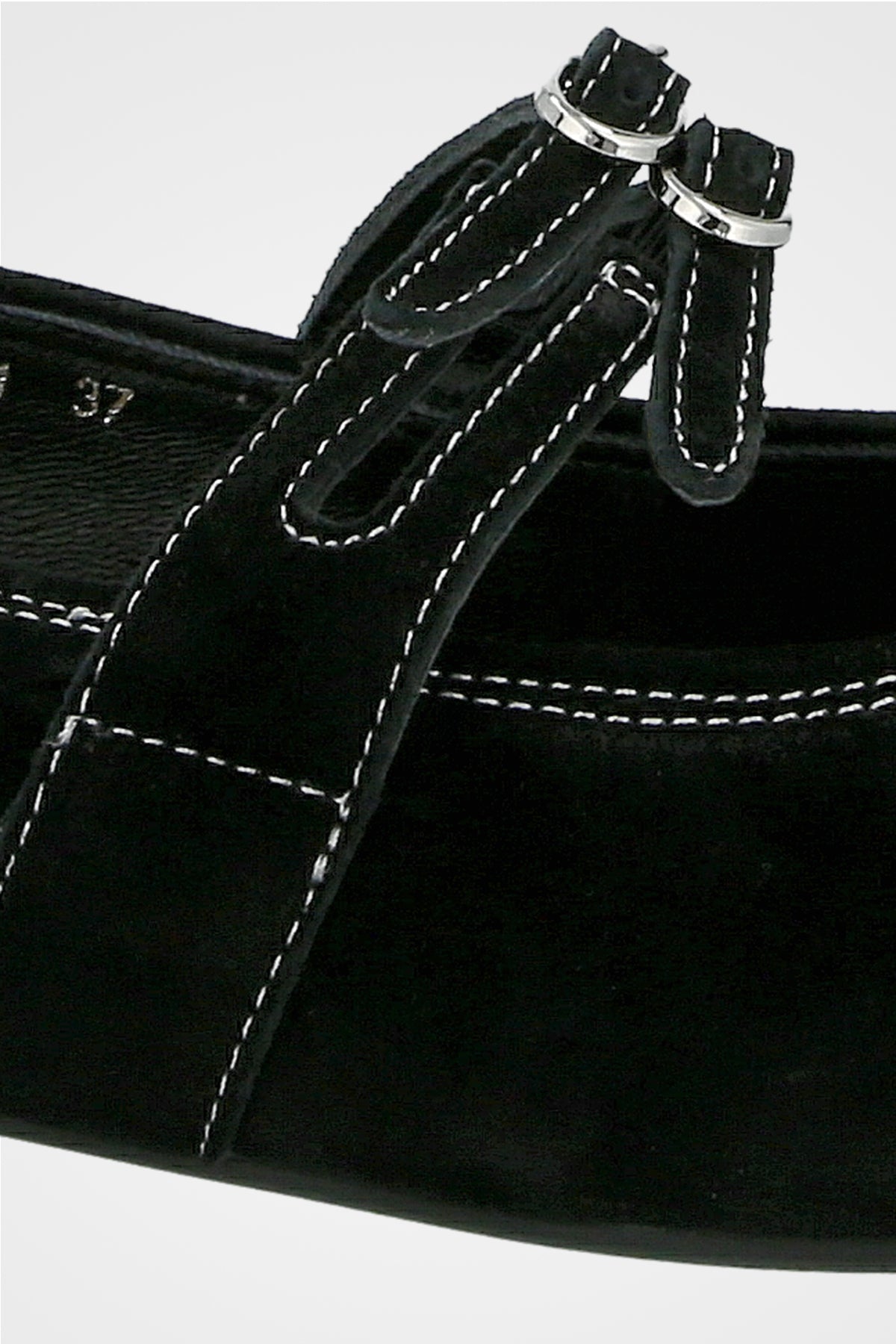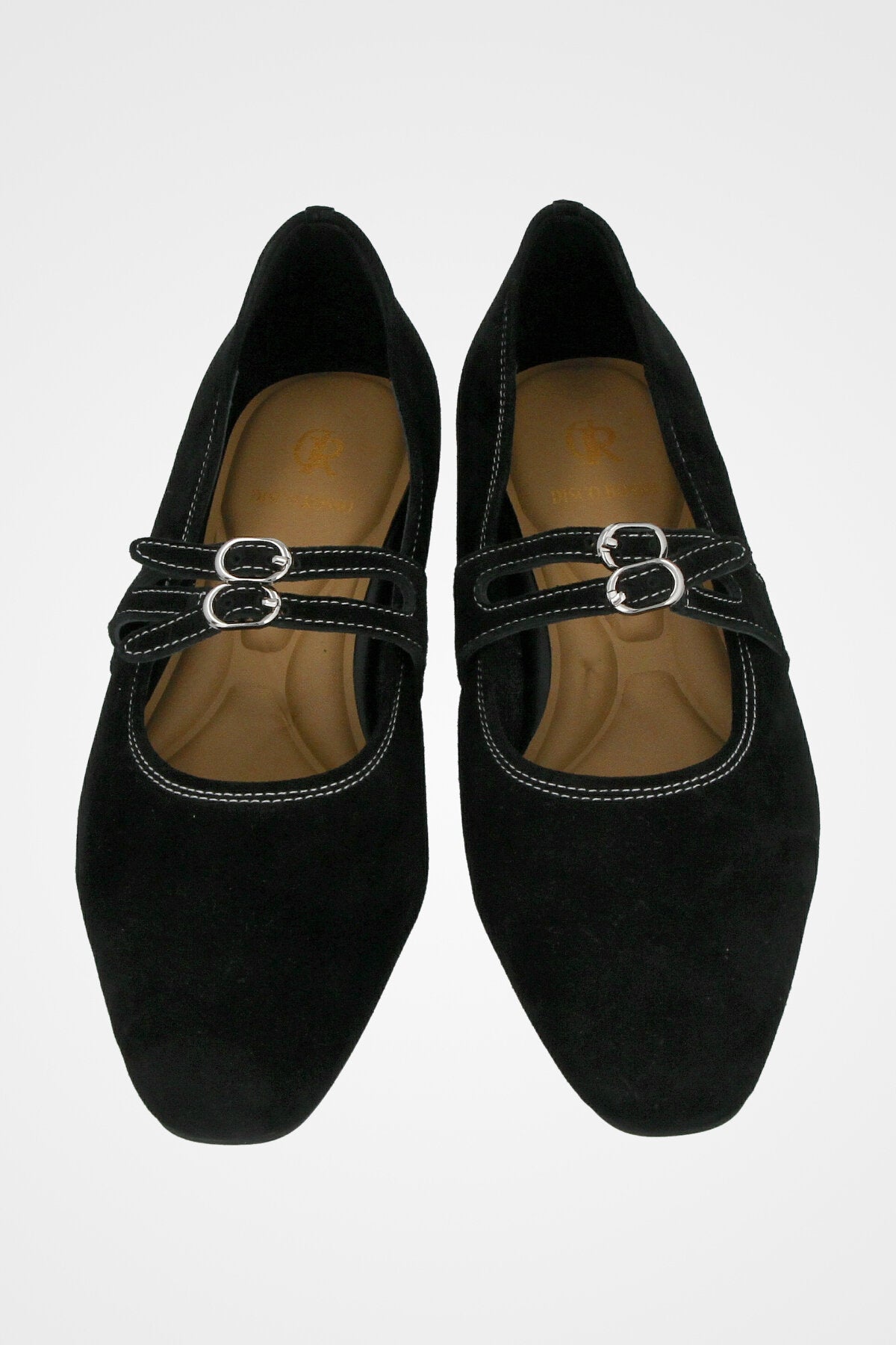 נעל בלרינה שחורה זמש, עם שתי רצועות וסוגרי אבזם כסף כפולים לעיטור אלגנטי