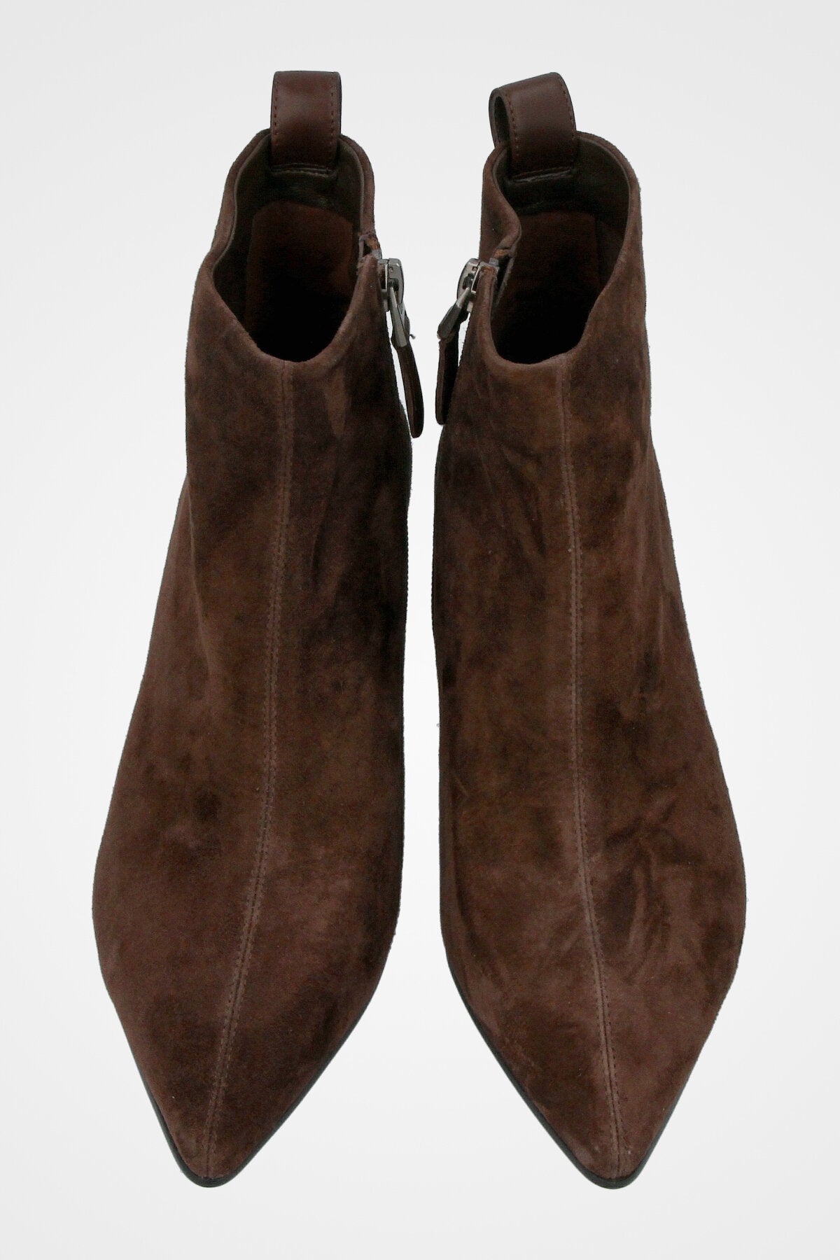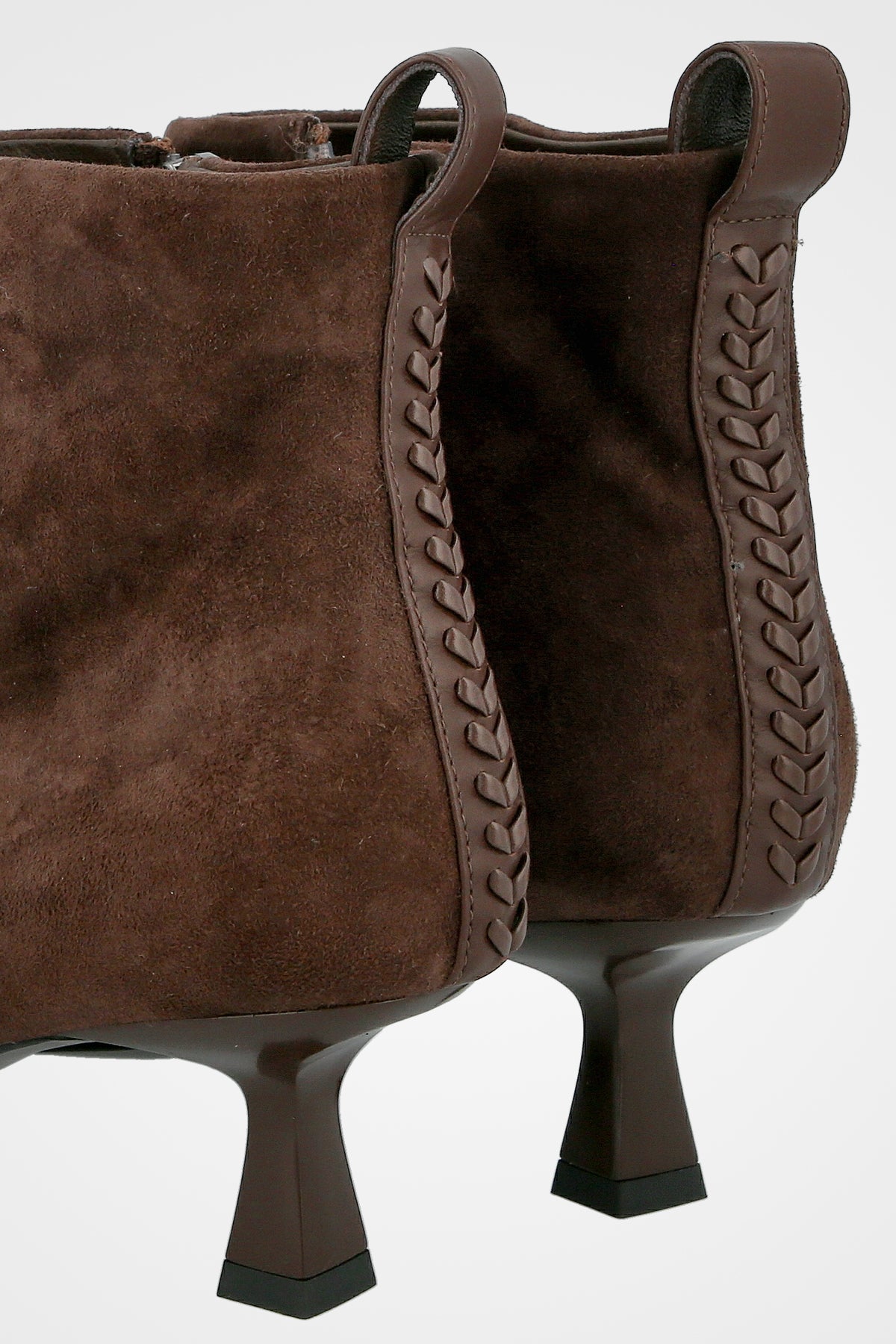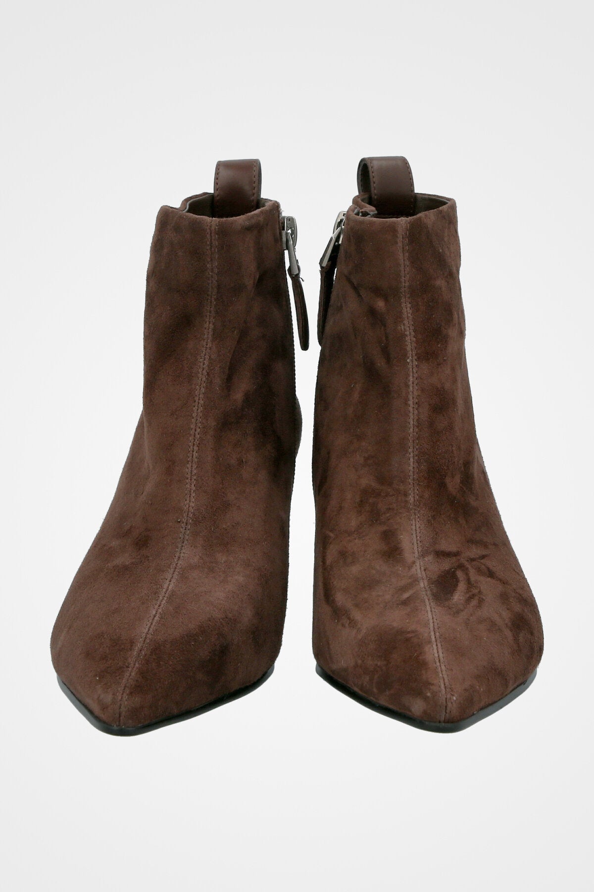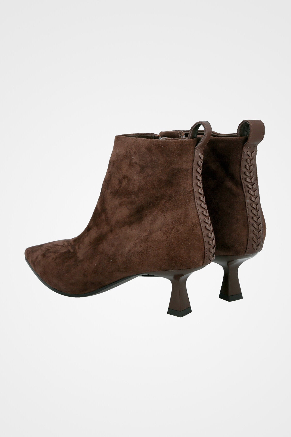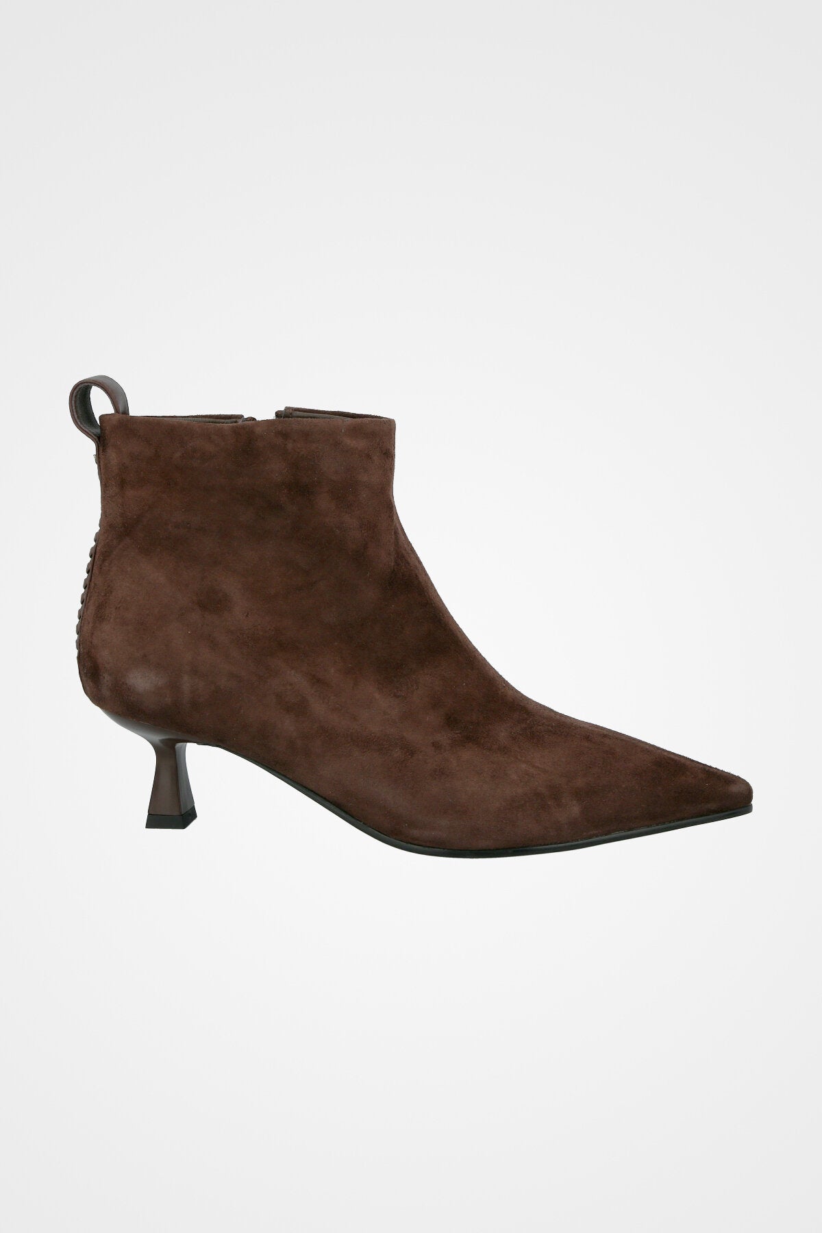 מגף קרסול מעור זמש חום, שפיץ קדימי ועקב דק בינוני, רוכסן צד וצמה אחורית