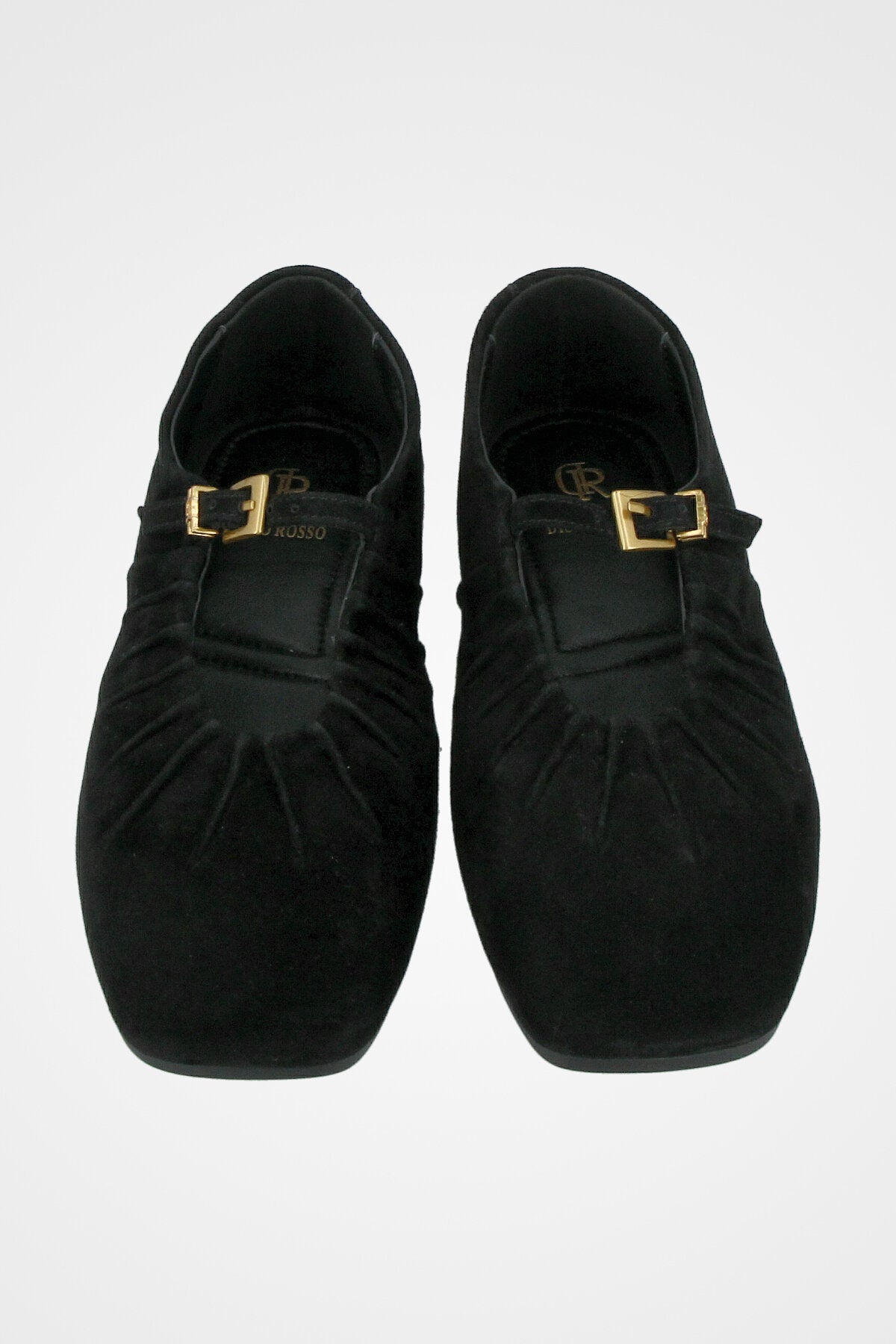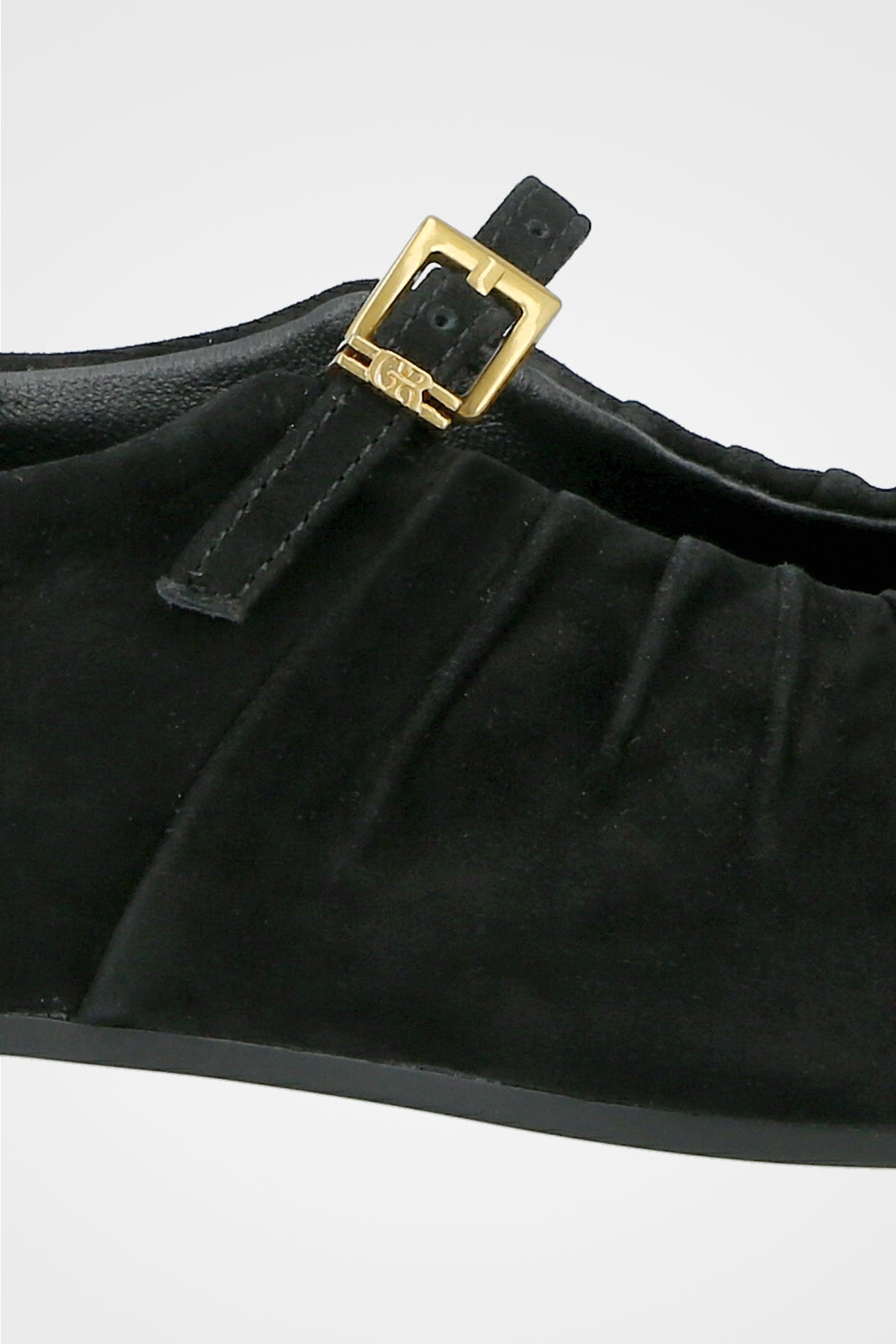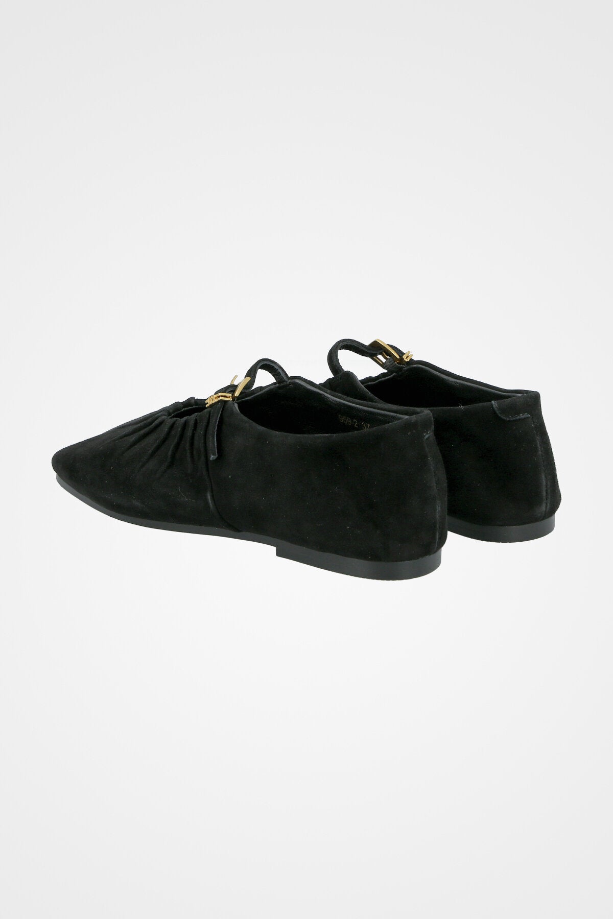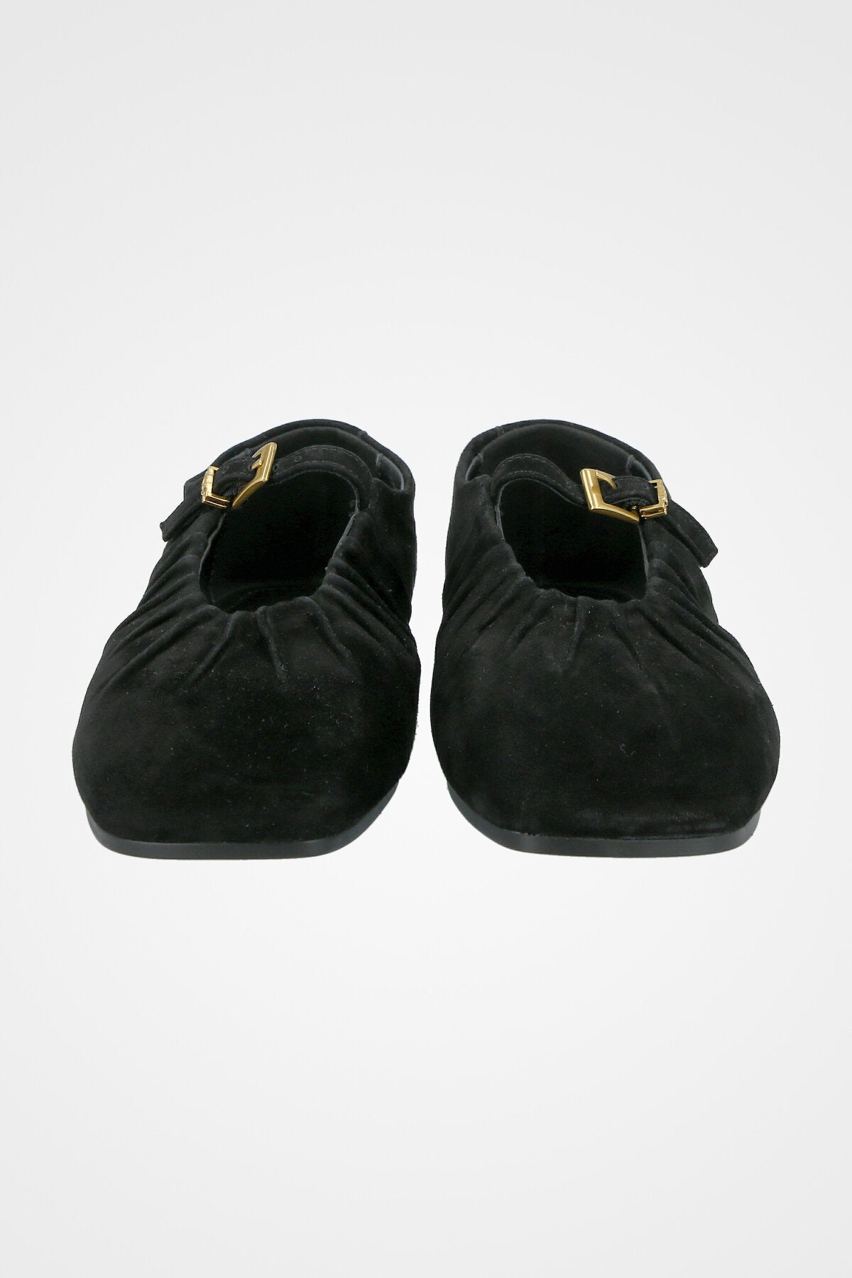 נעל שטוחה שחורה מבד זמש, עם קדמת נעל מעוגלת, כיווצים עדינים ורצועה דקה עם אבזם מוזהב לעיטור