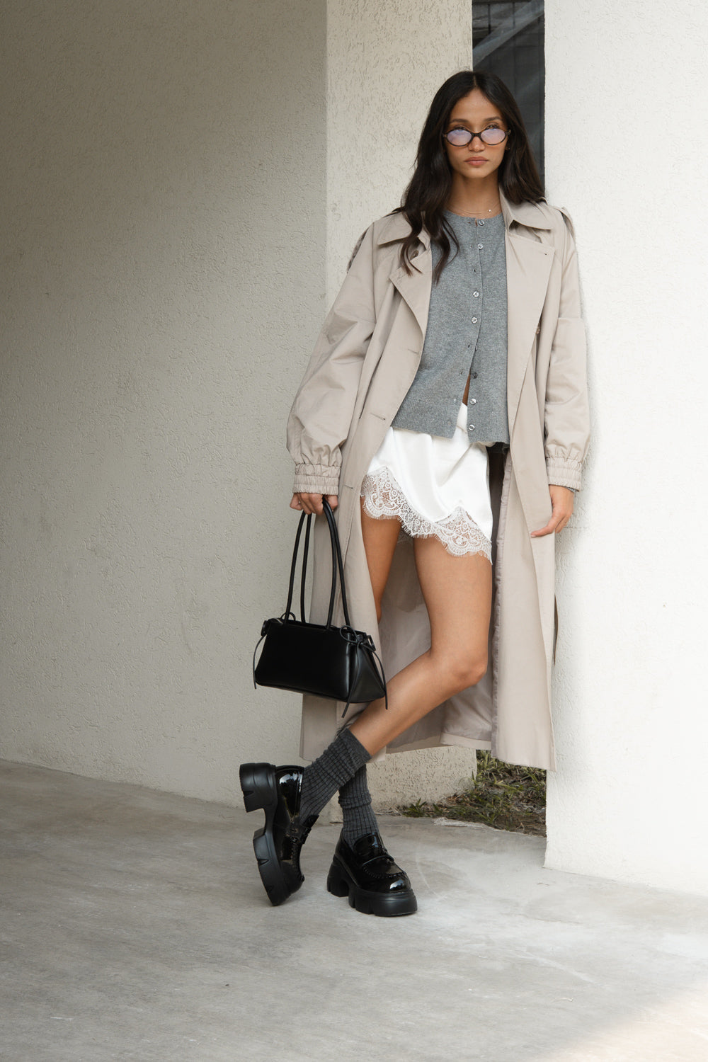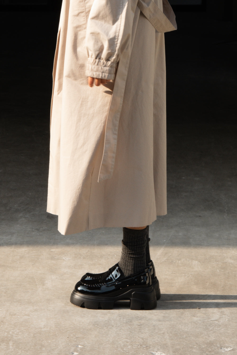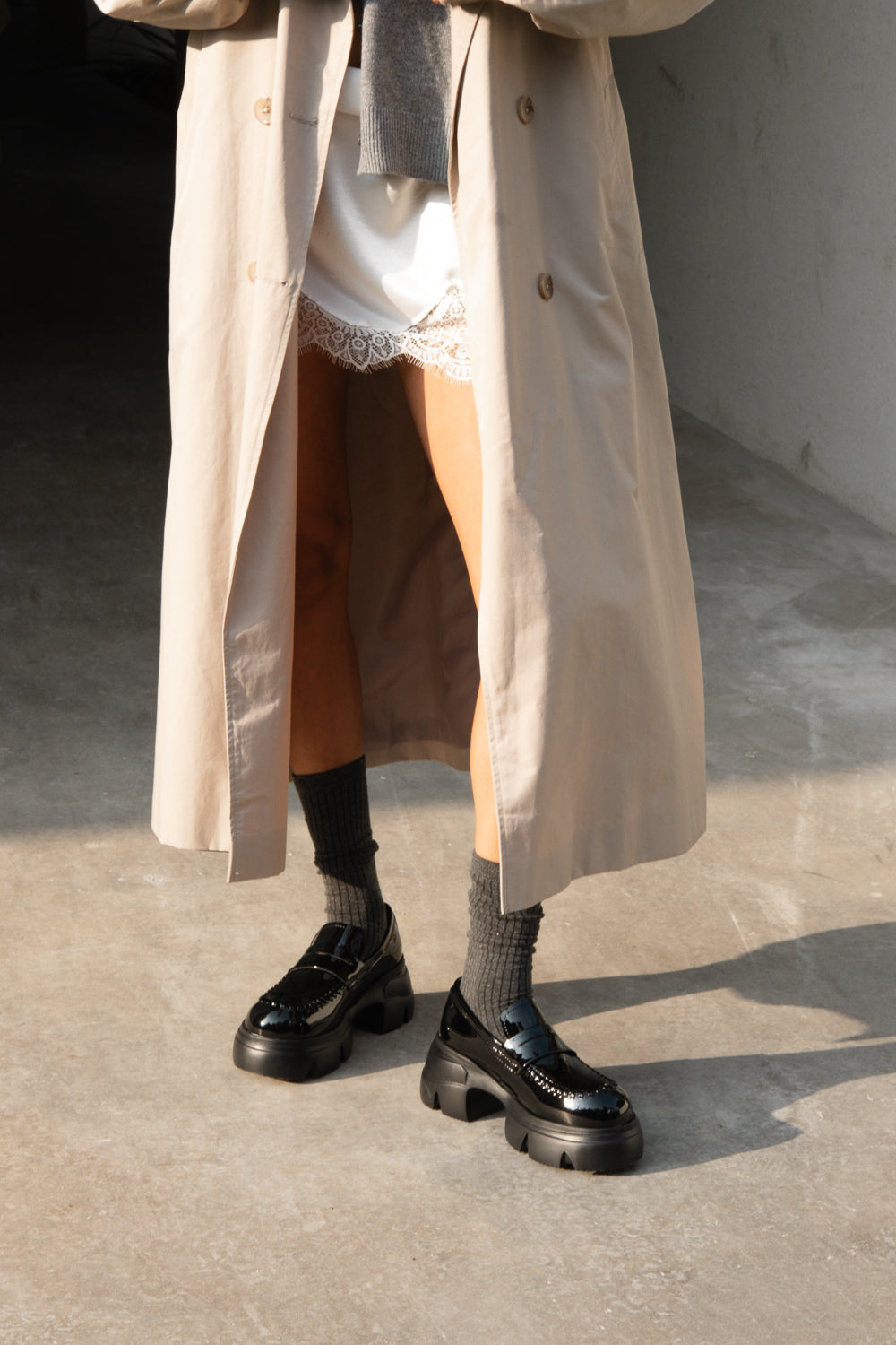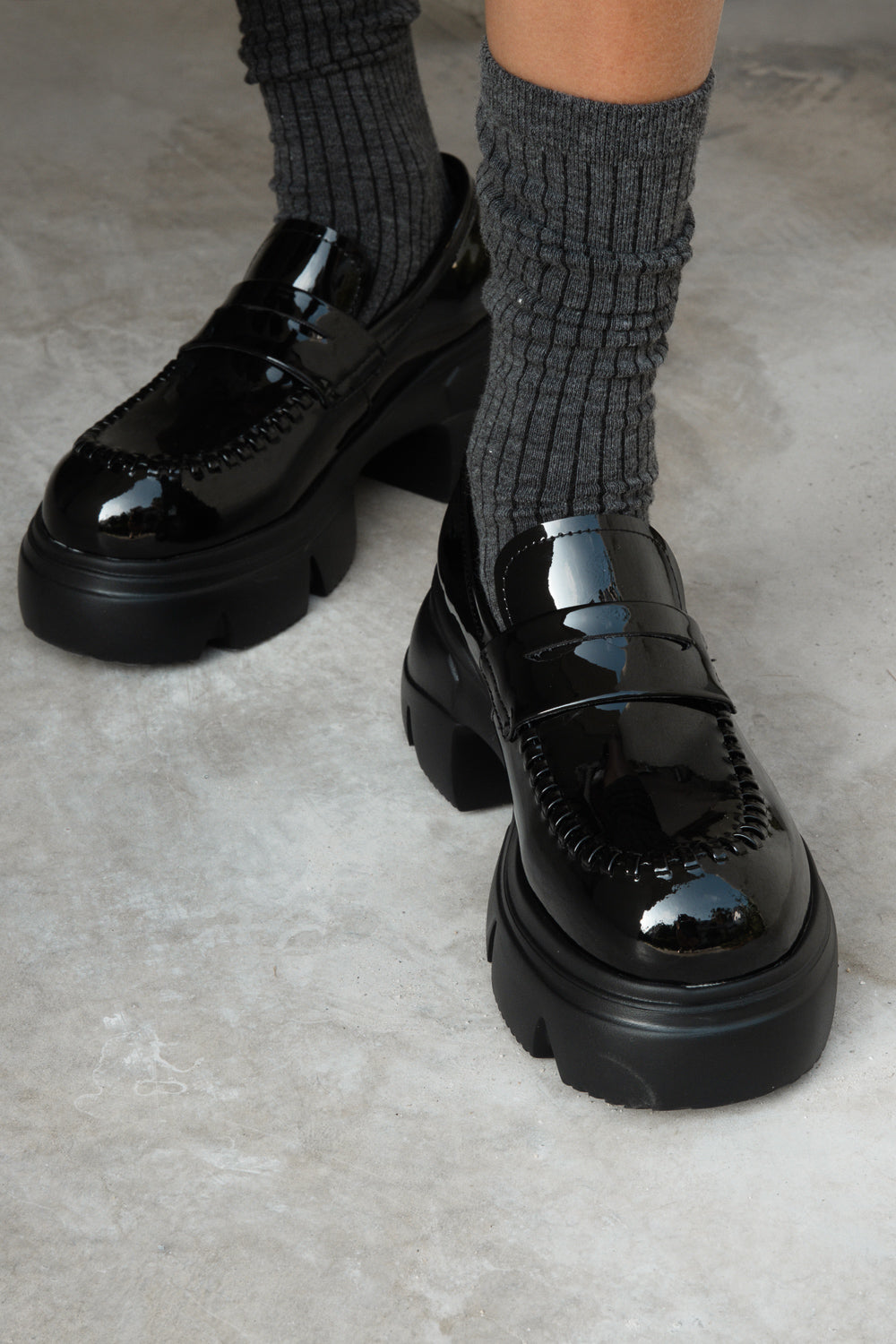 נעל מוקסין שחורה ומבריקה, חרטום מעוגל, רצועת עור בחזית, וסוליה עבה ומשוננת בגובה 6 ס"מ