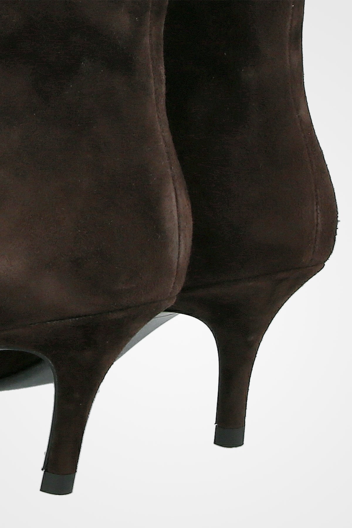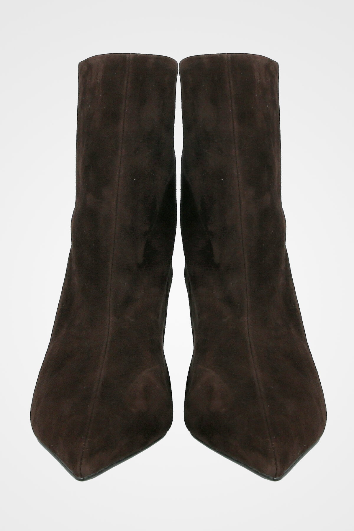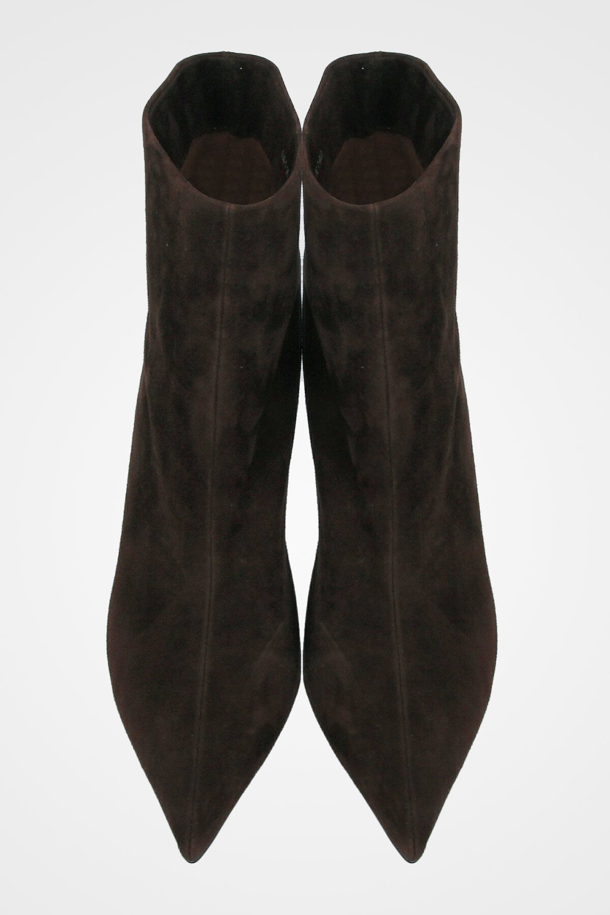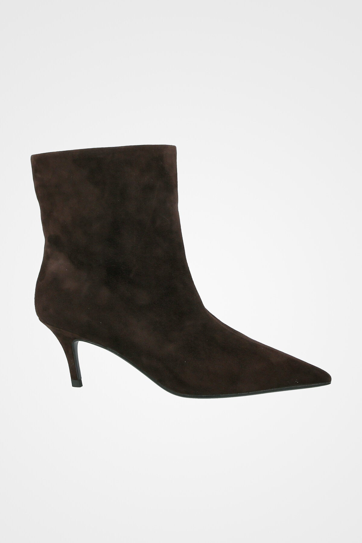 מגף קרסול עשוי מעור זמש בצבע חום בגוון קפה, עם עיצוב שפיצי עם עקב בינוני