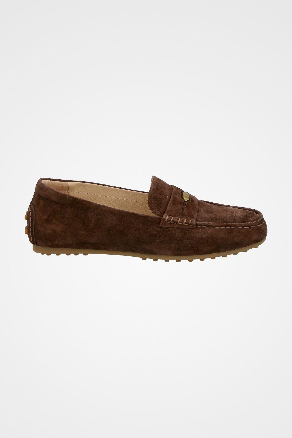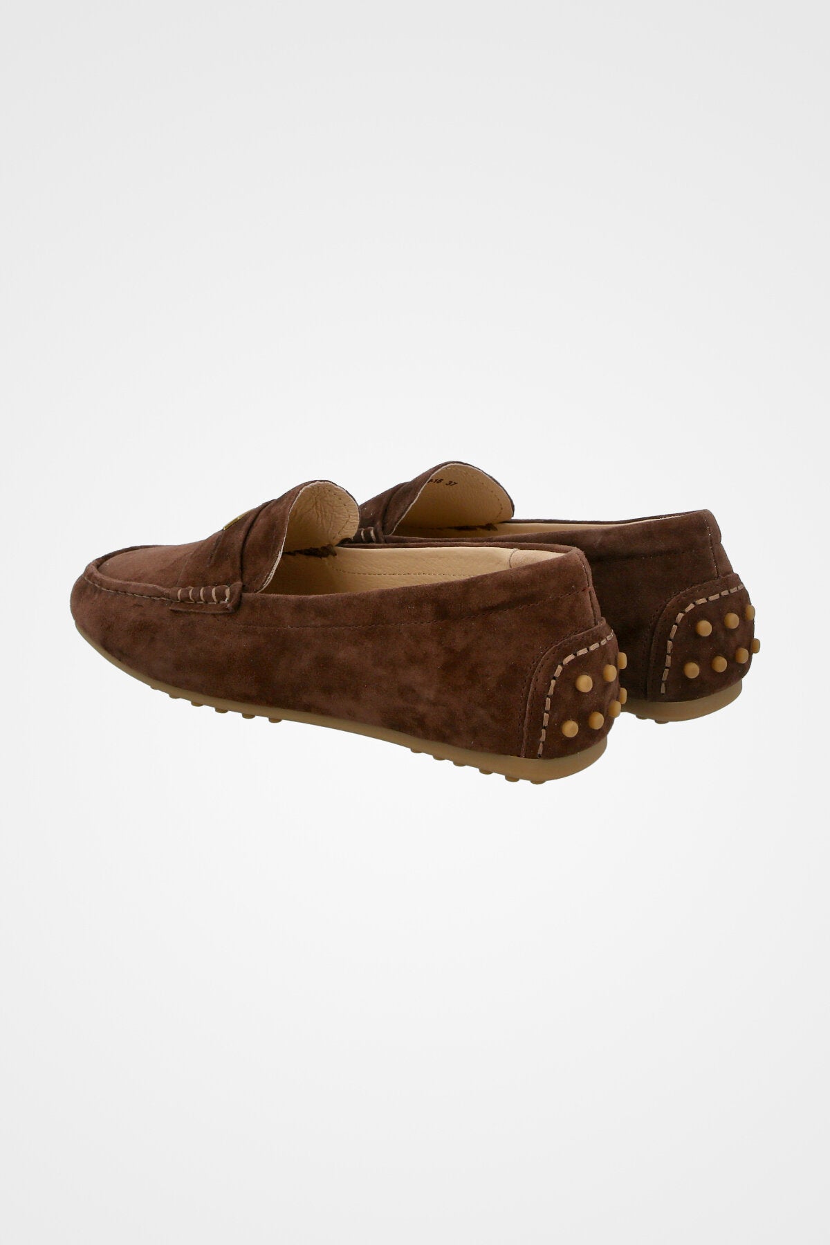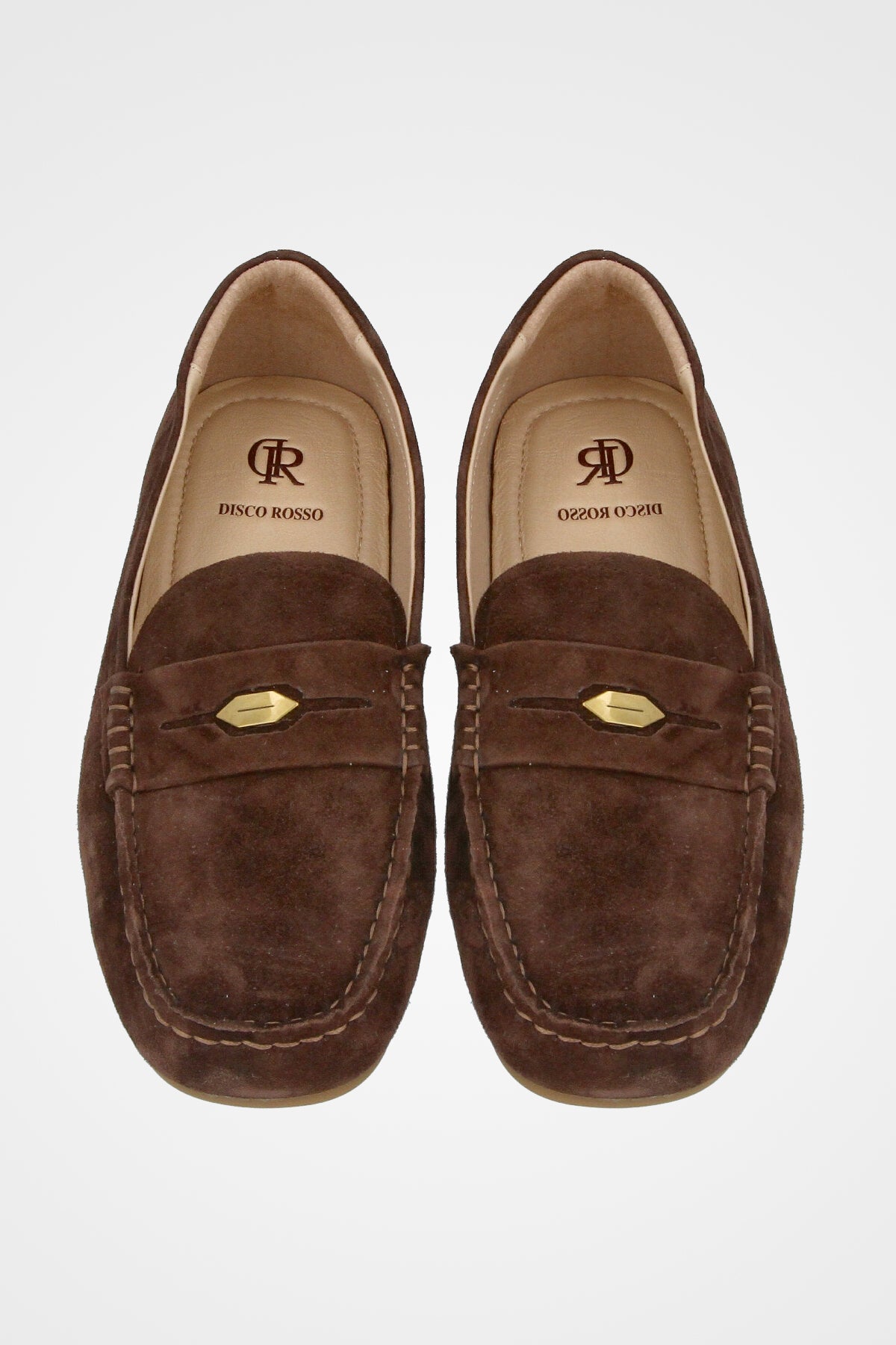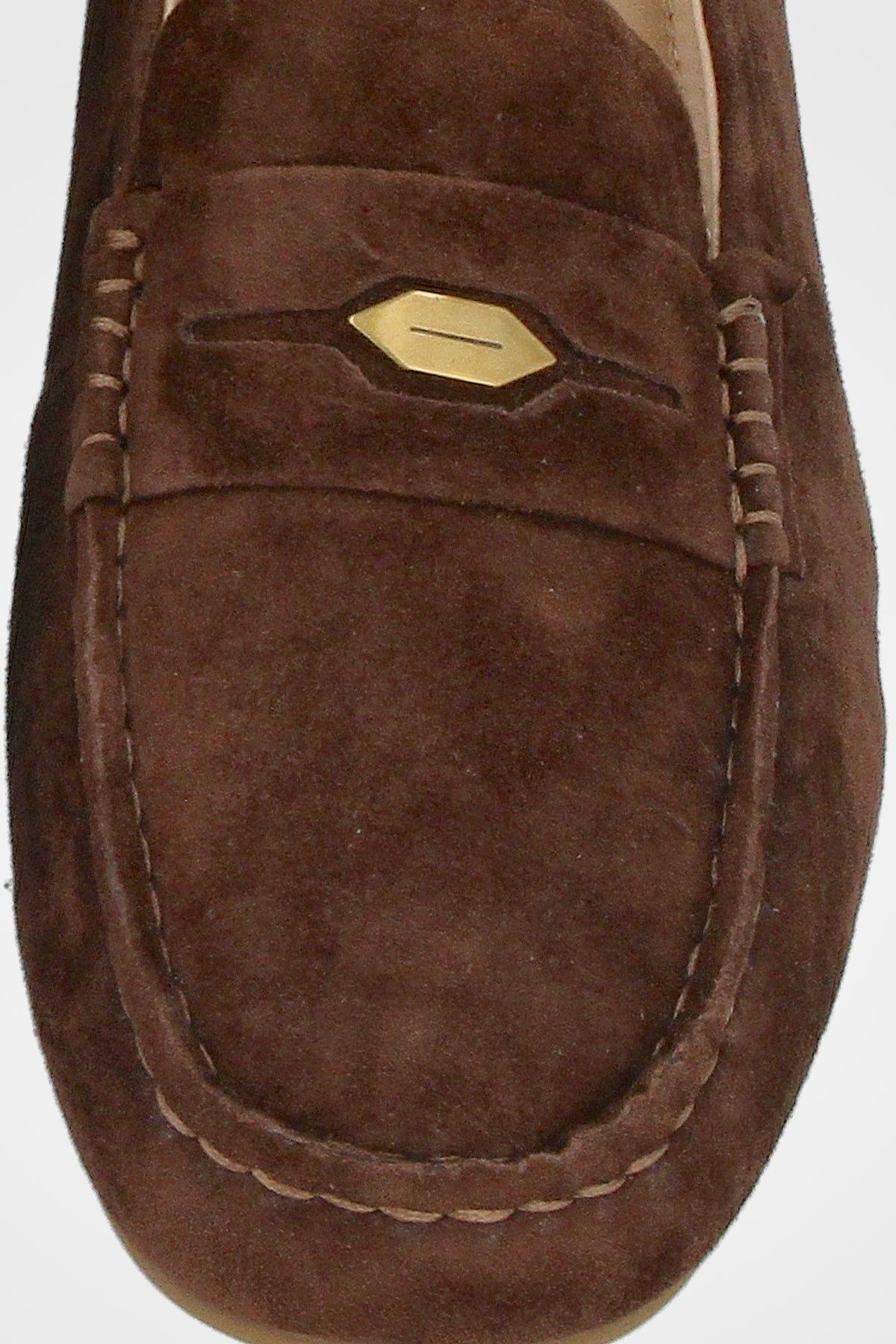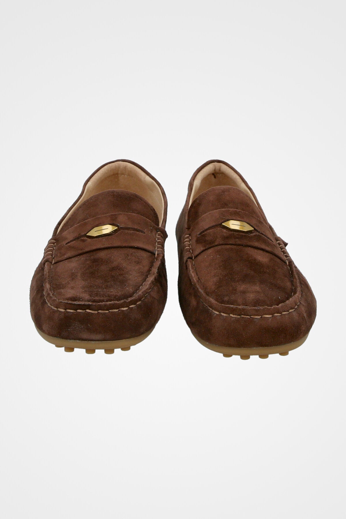 נעל מוקסין זמש בצבע חום כהה, חרטום מעוגל, תפרים עליוניים בולטים ורצועת עור עם אבזם מתכת זהוב