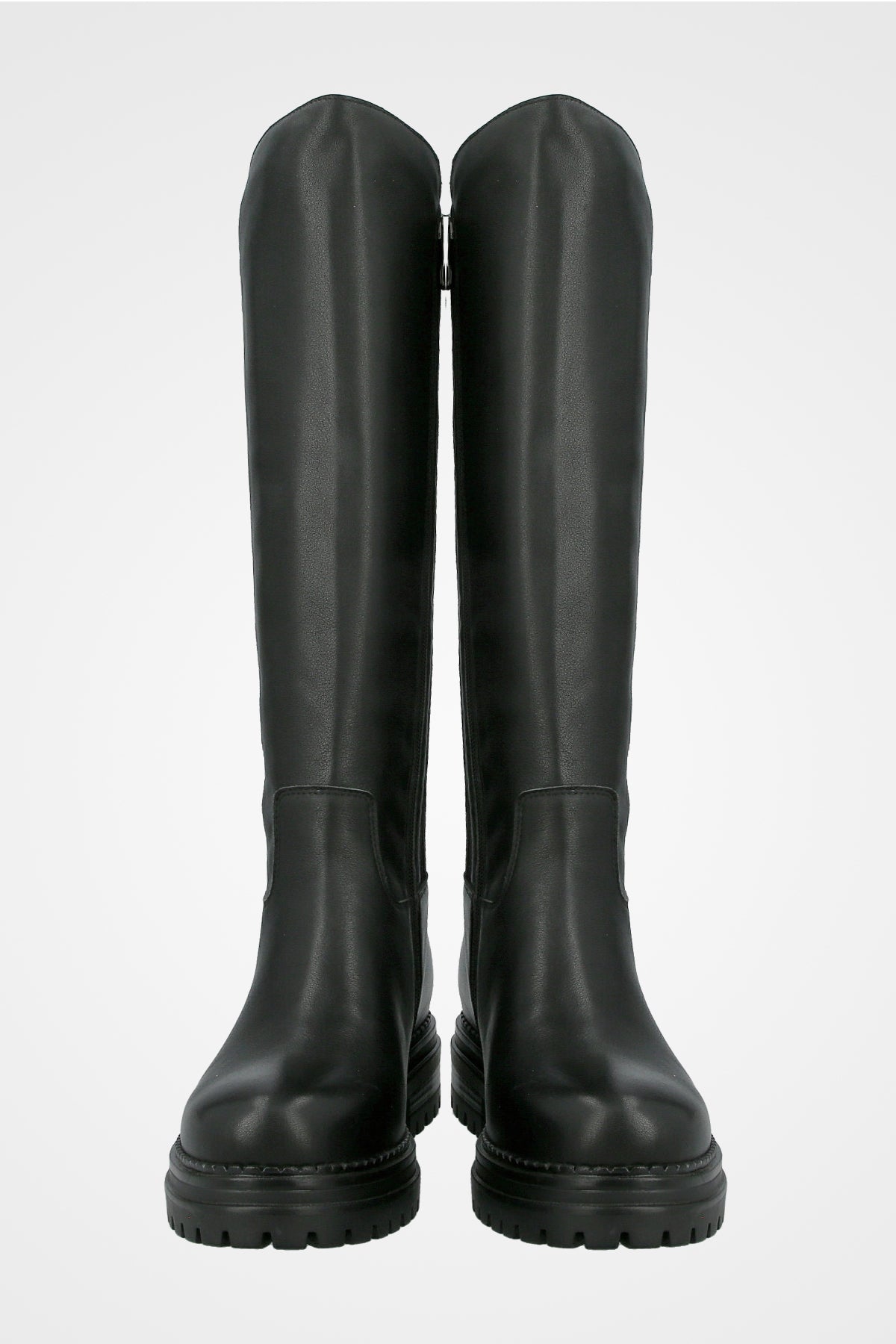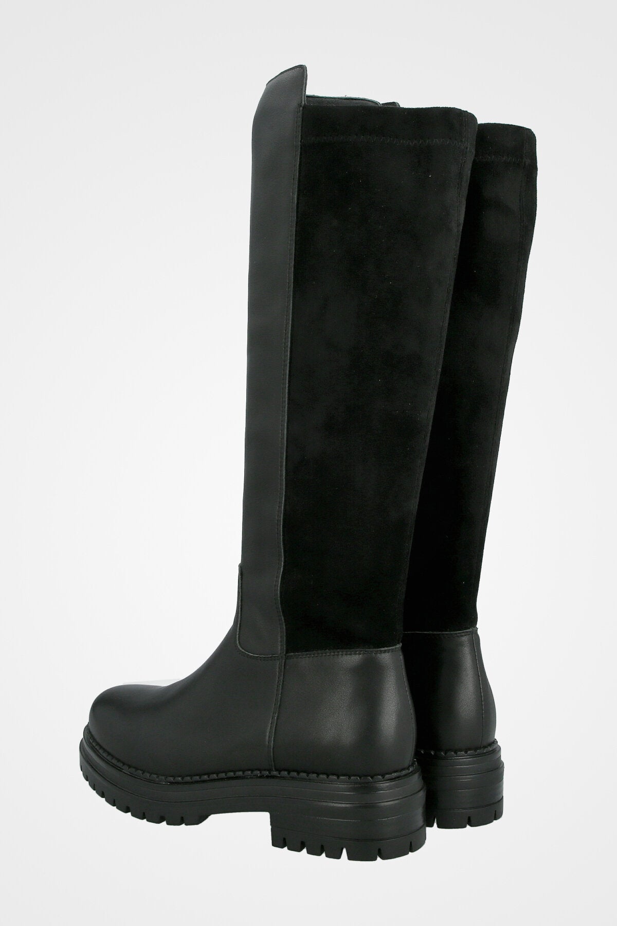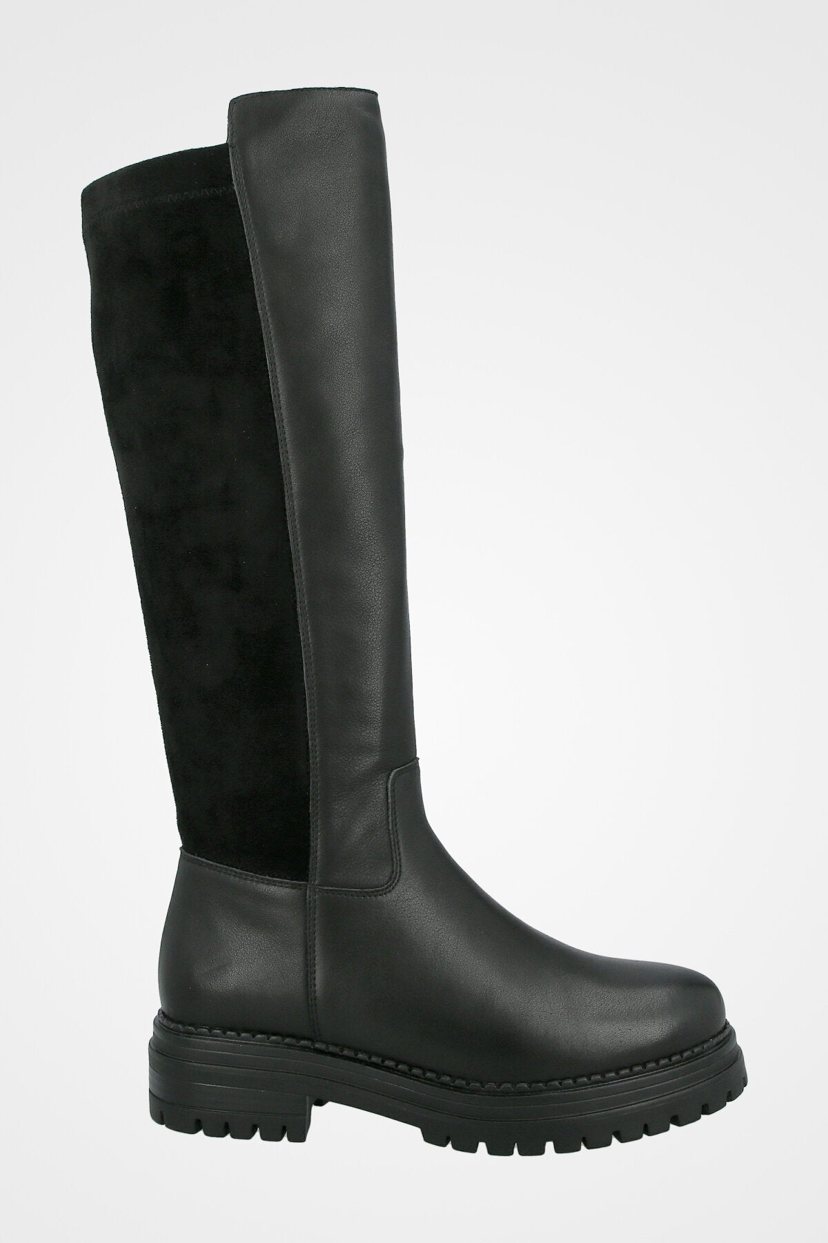 מגף גבוה שחור , משלוב עם עור וקטיפה, עם סוליה טרקטור עבה וחרטום עגול