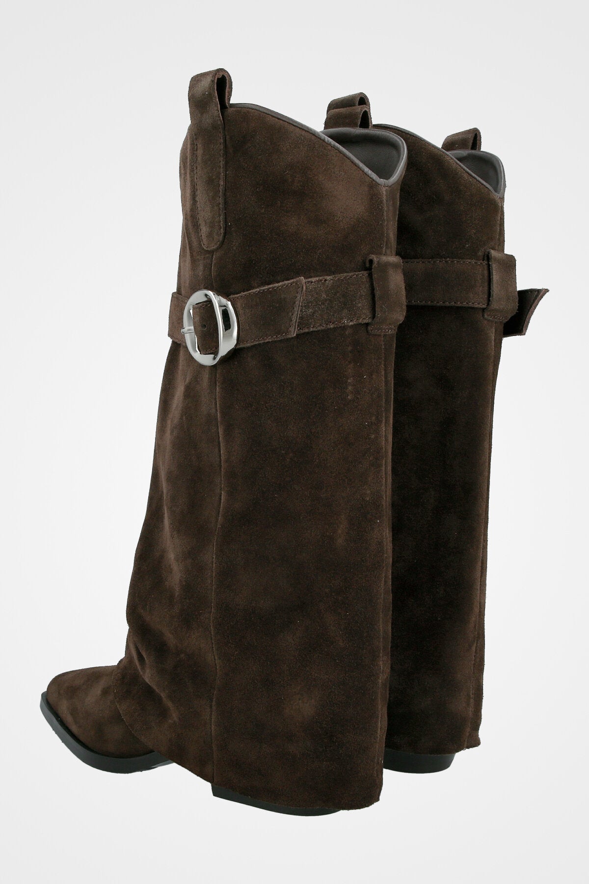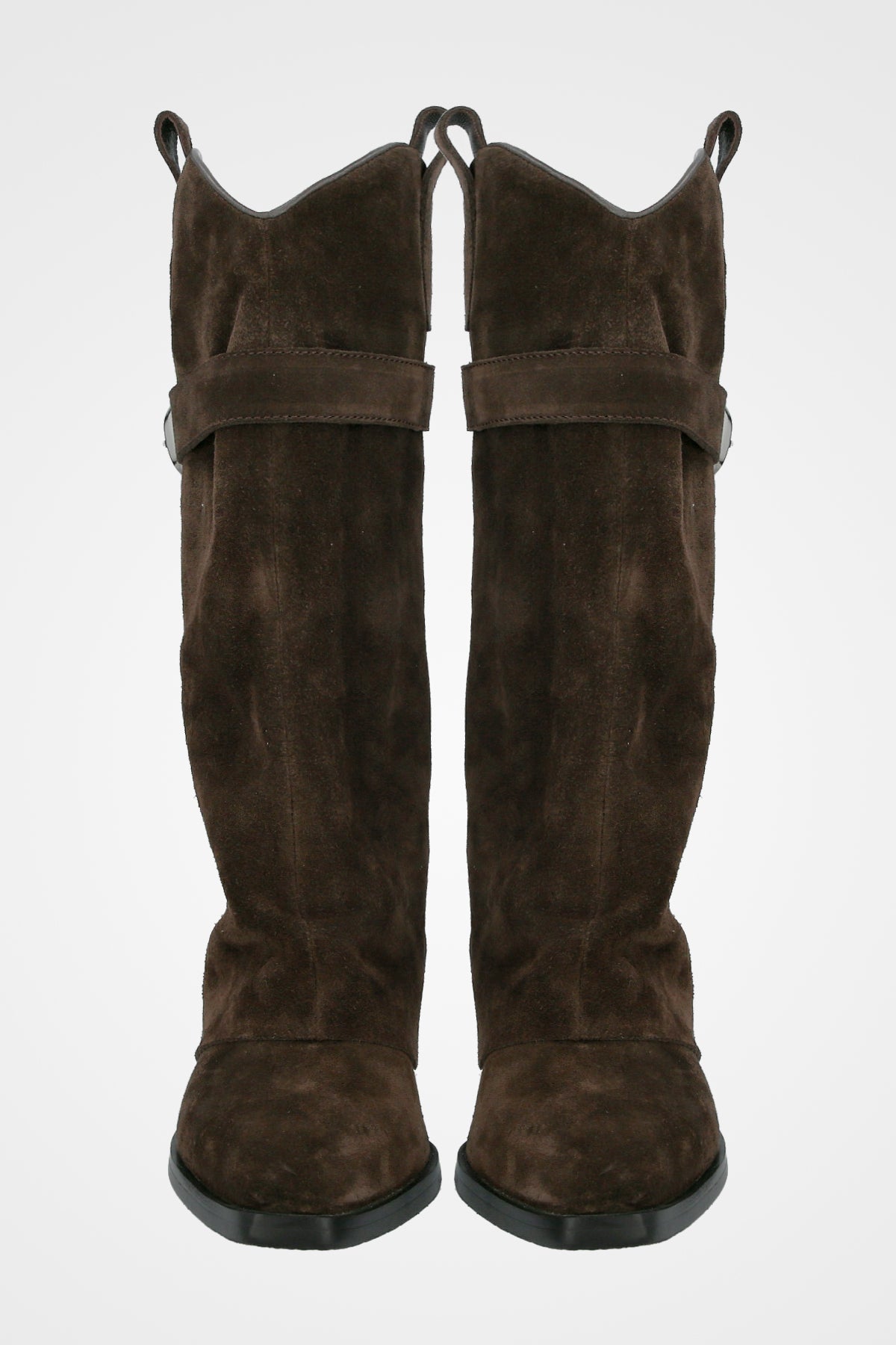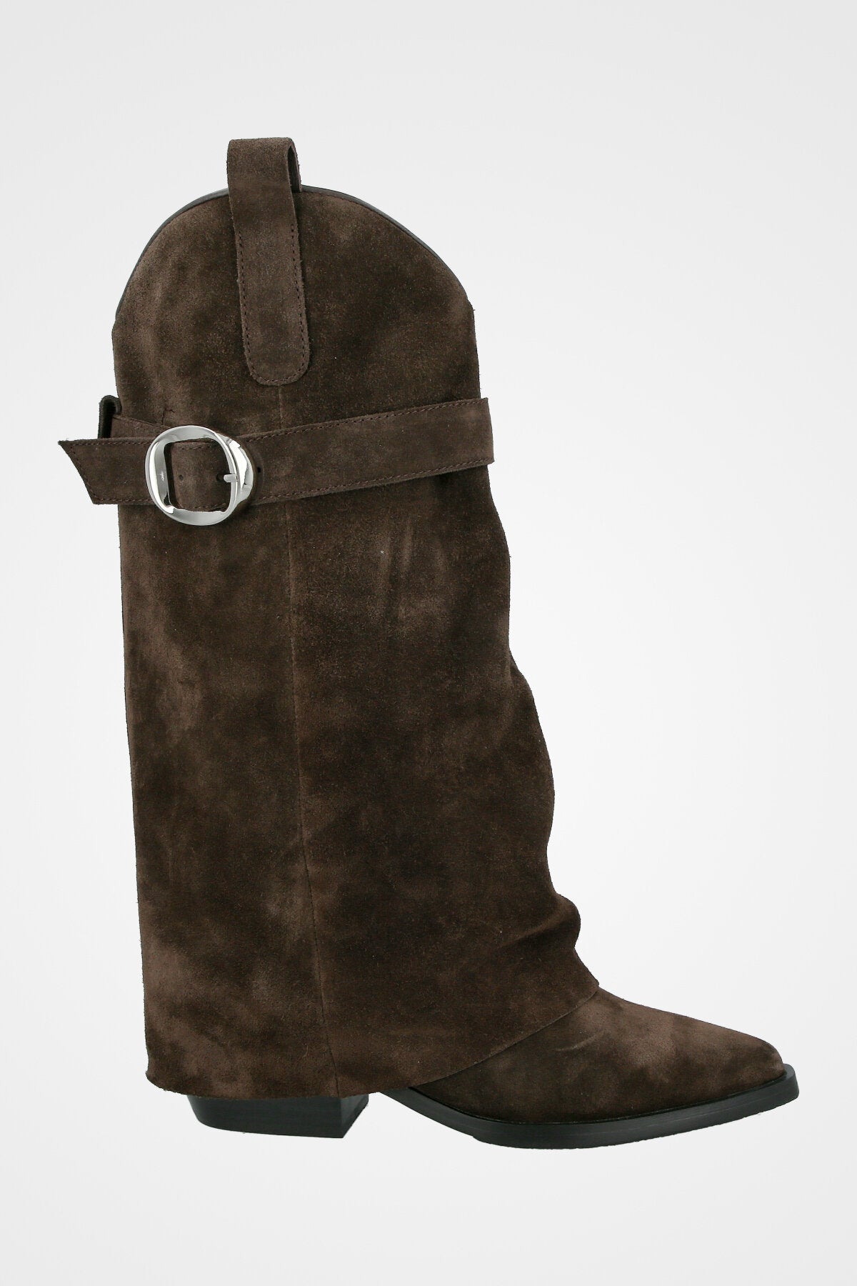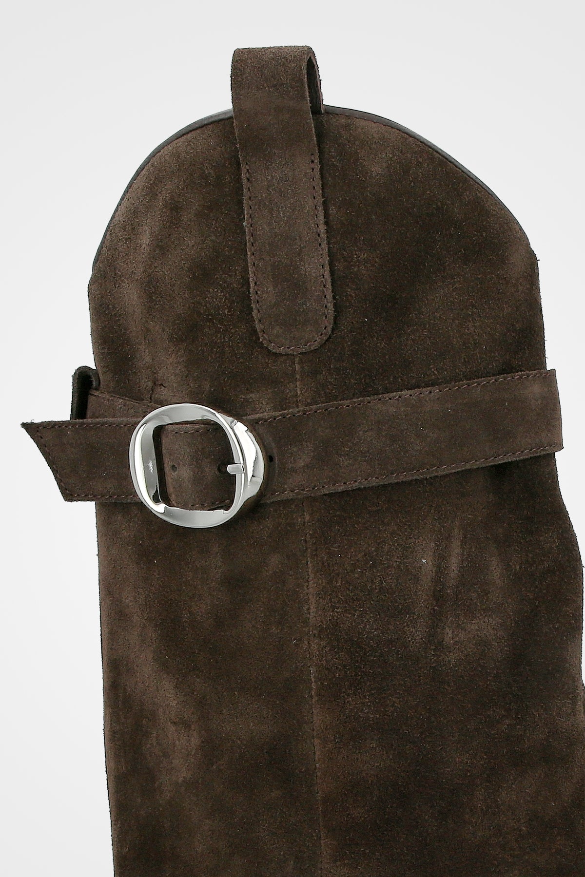 מגף בוקרים חום זמש, עם חזית שפיצית, עקב מרובע מחודד ורצועת אבזם כסופה מסביב לשוק