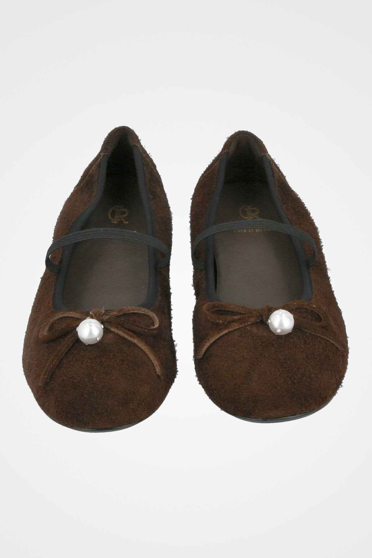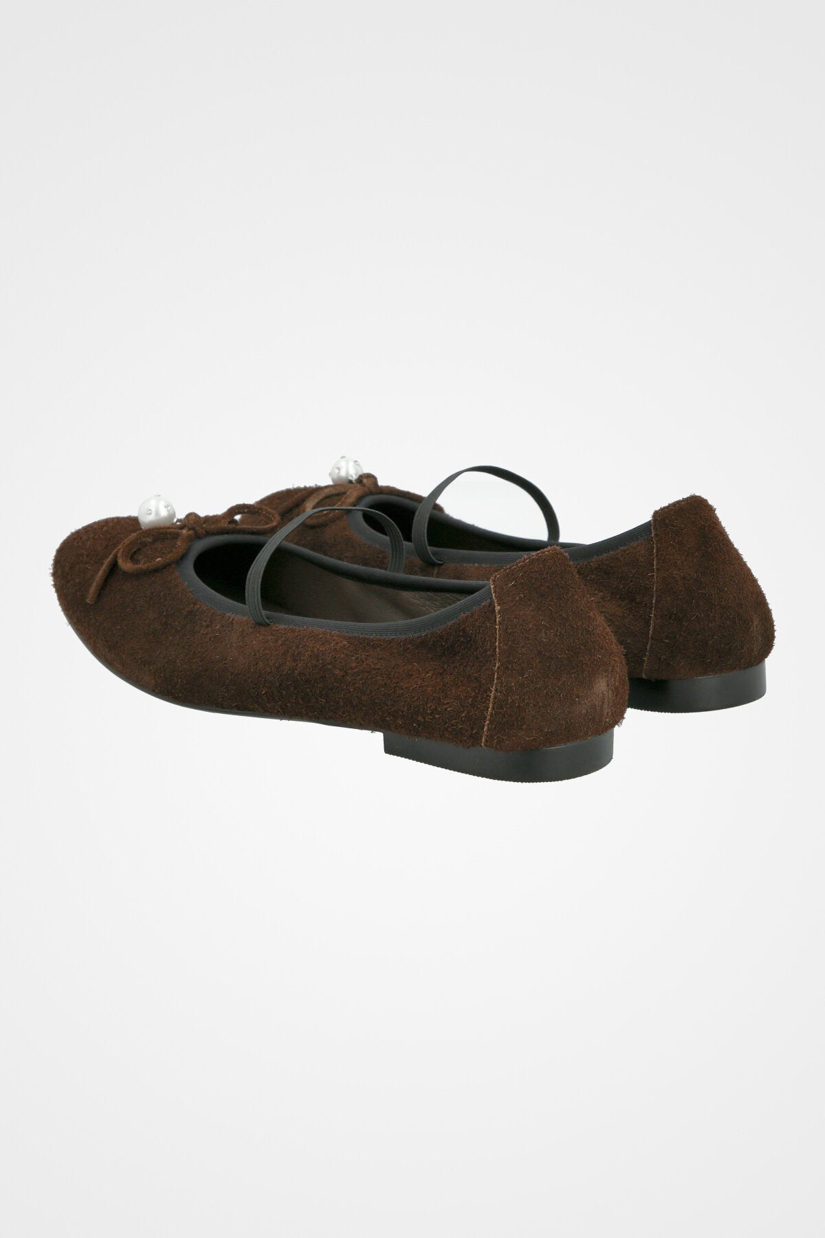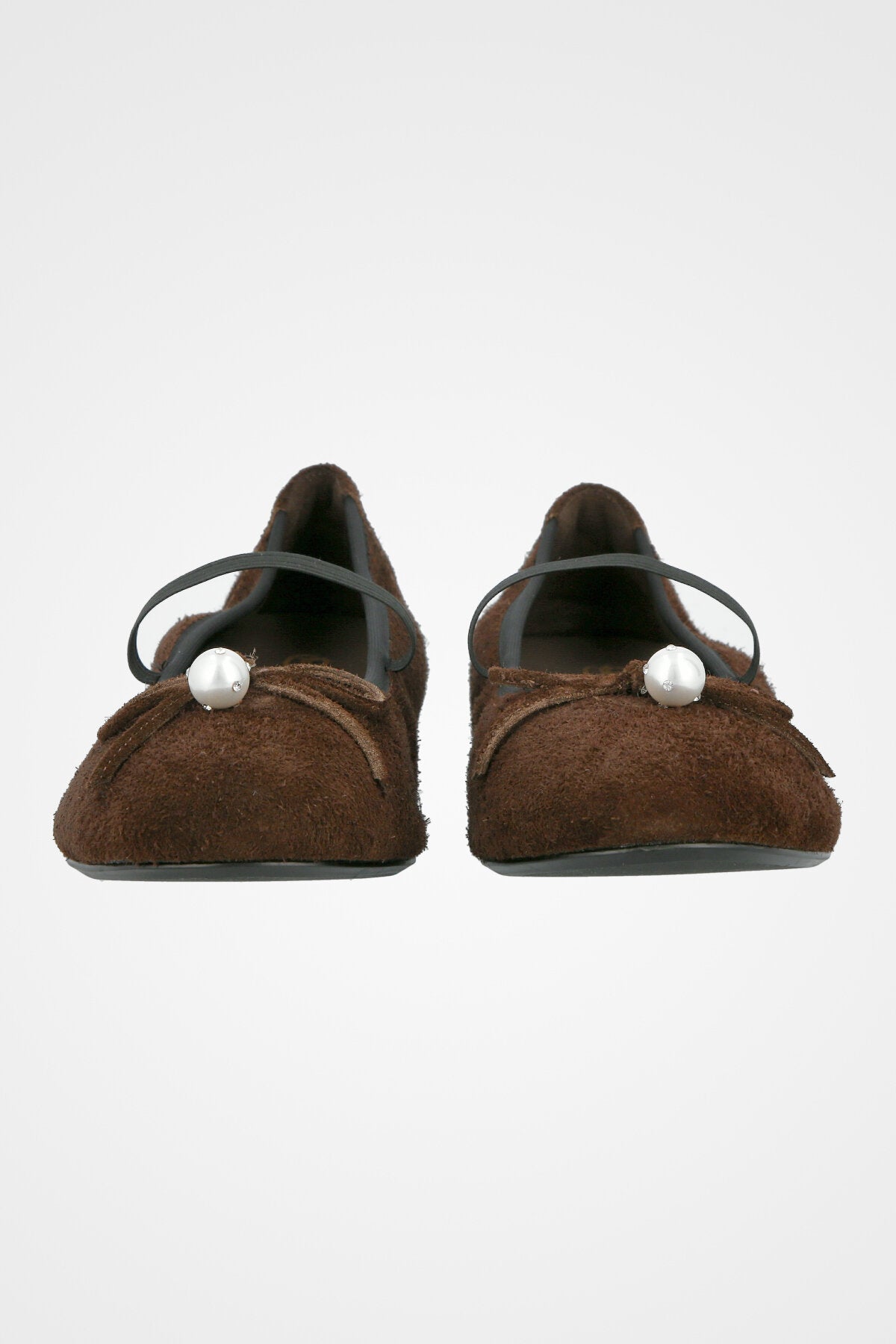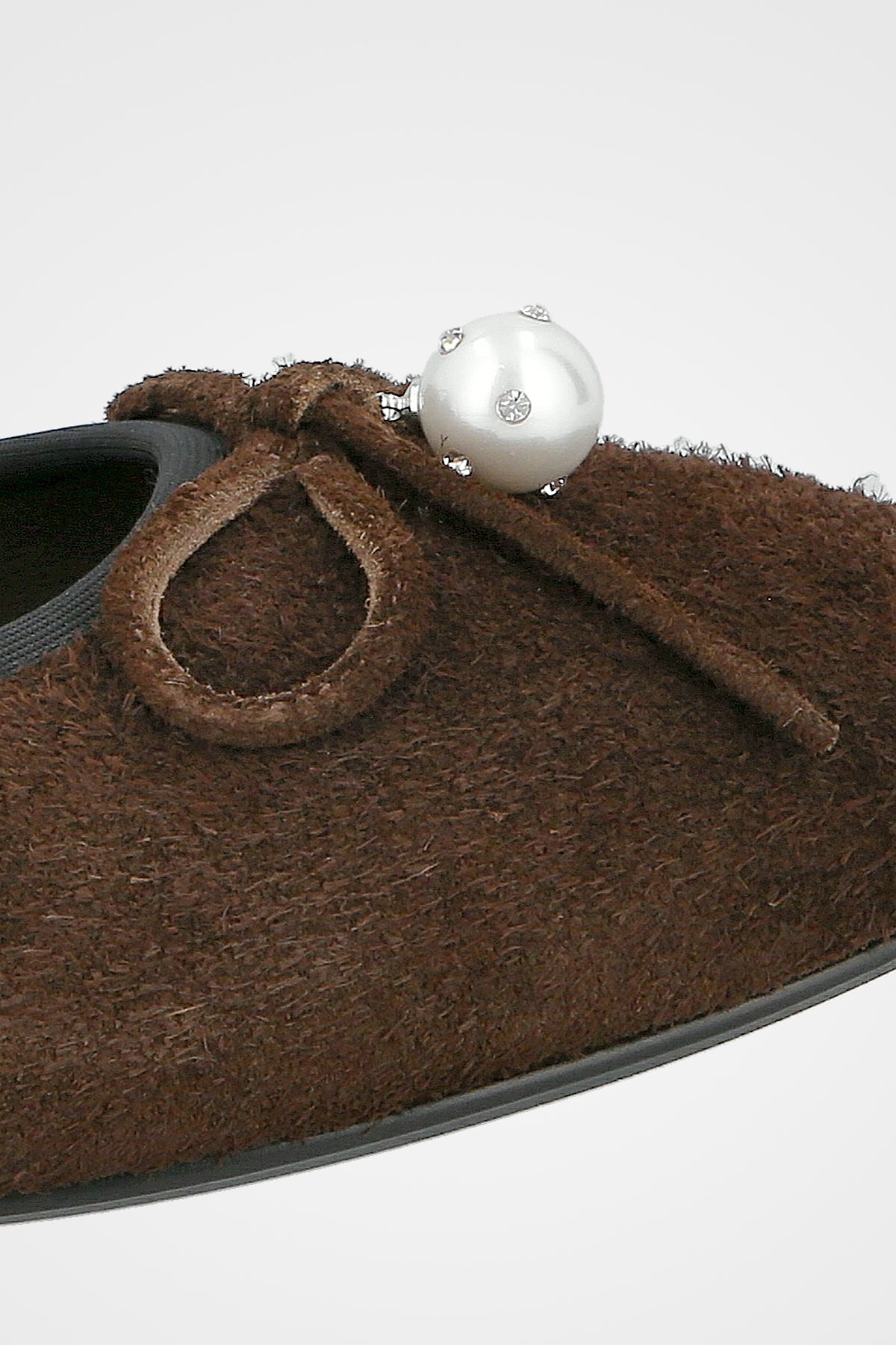 נעל בובה חומה זמש, בעלת חרטום מעוגל, רצועה עליונה, פפיון תואם, וקישוט פנינה עגולה בחזית