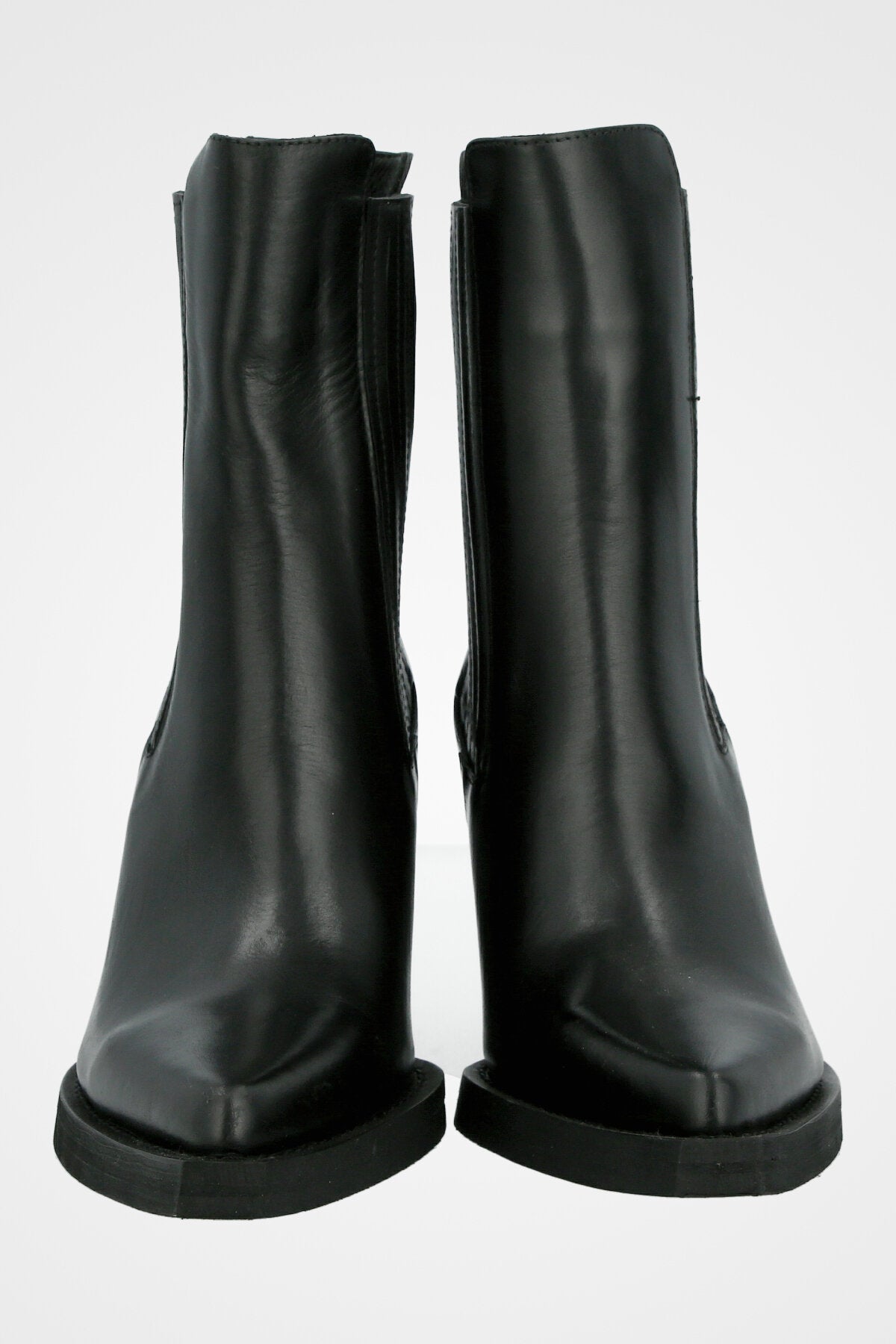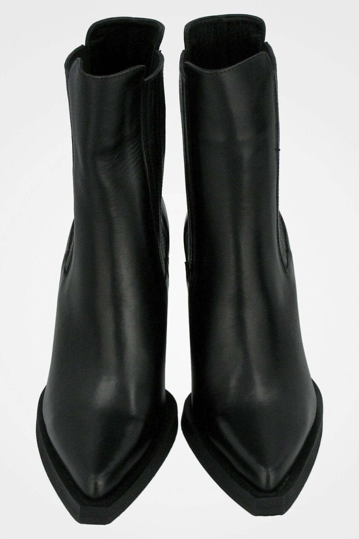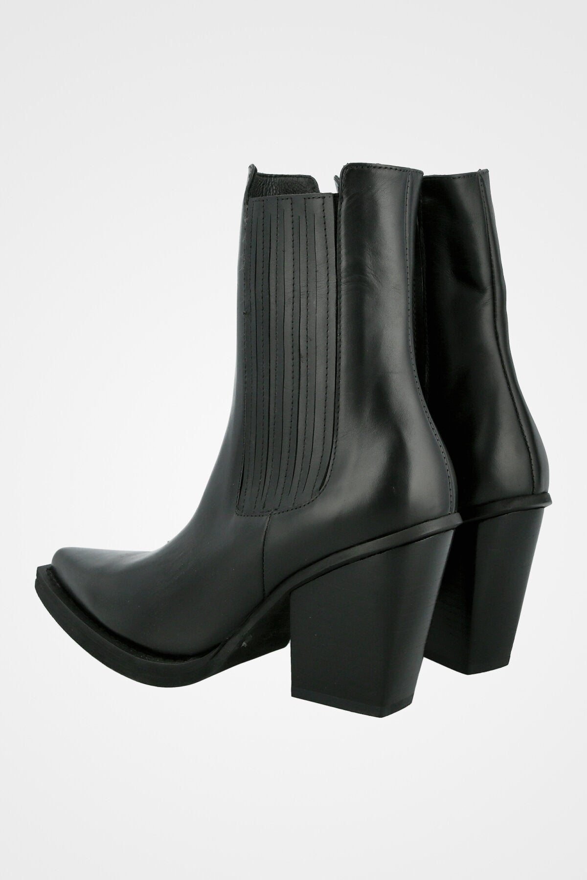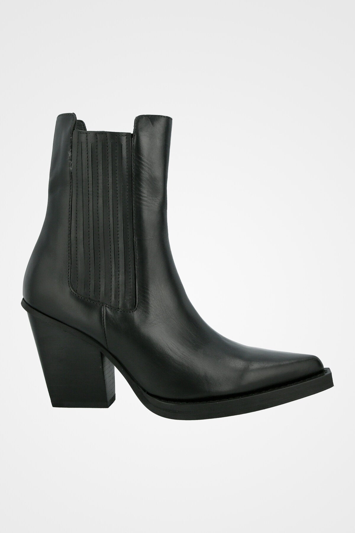 מגפון בוקרים שחור מעור, עם חרטם שפיץ ,עקב רחב בינוני ועיטור תפרים קלאסי בסגנון מערב פרוע