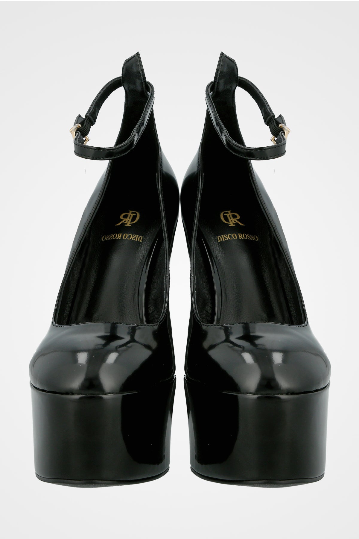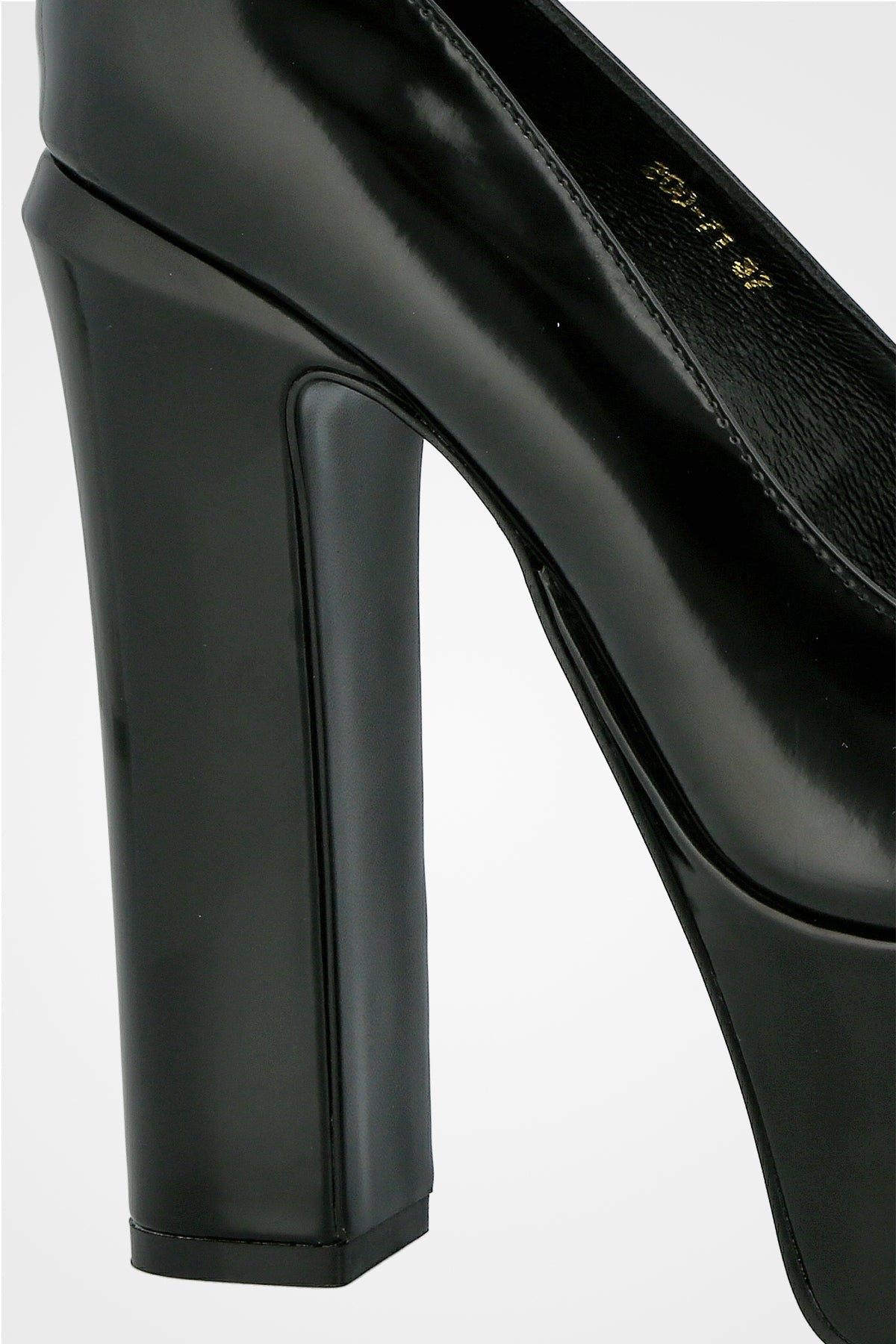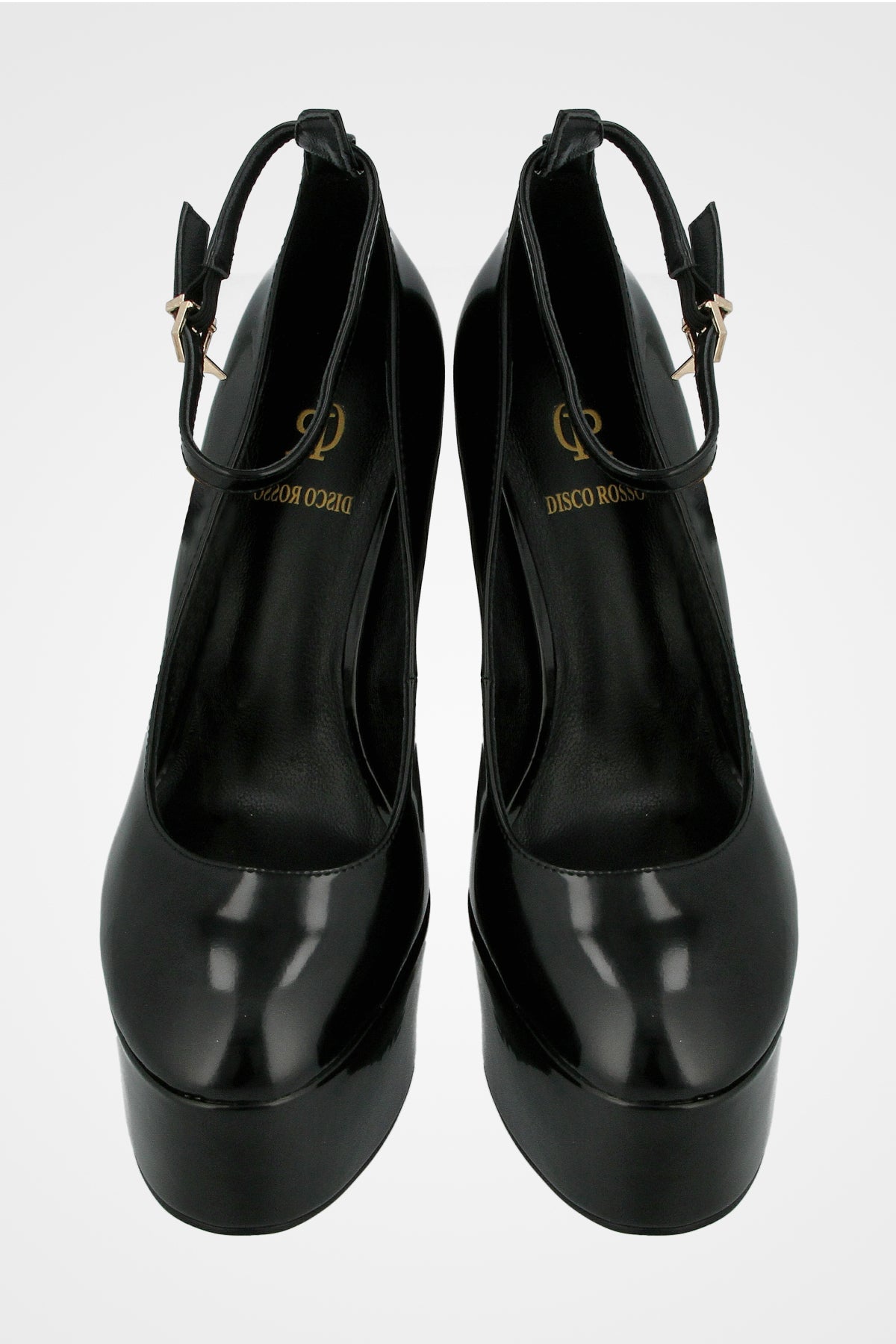 נעל עקב גבוהה בצבע שחור מבריק, עם פלטפורמה עבה, רצועת קרסול עדינה וסגירה עם תליון קטן ואלגנטי