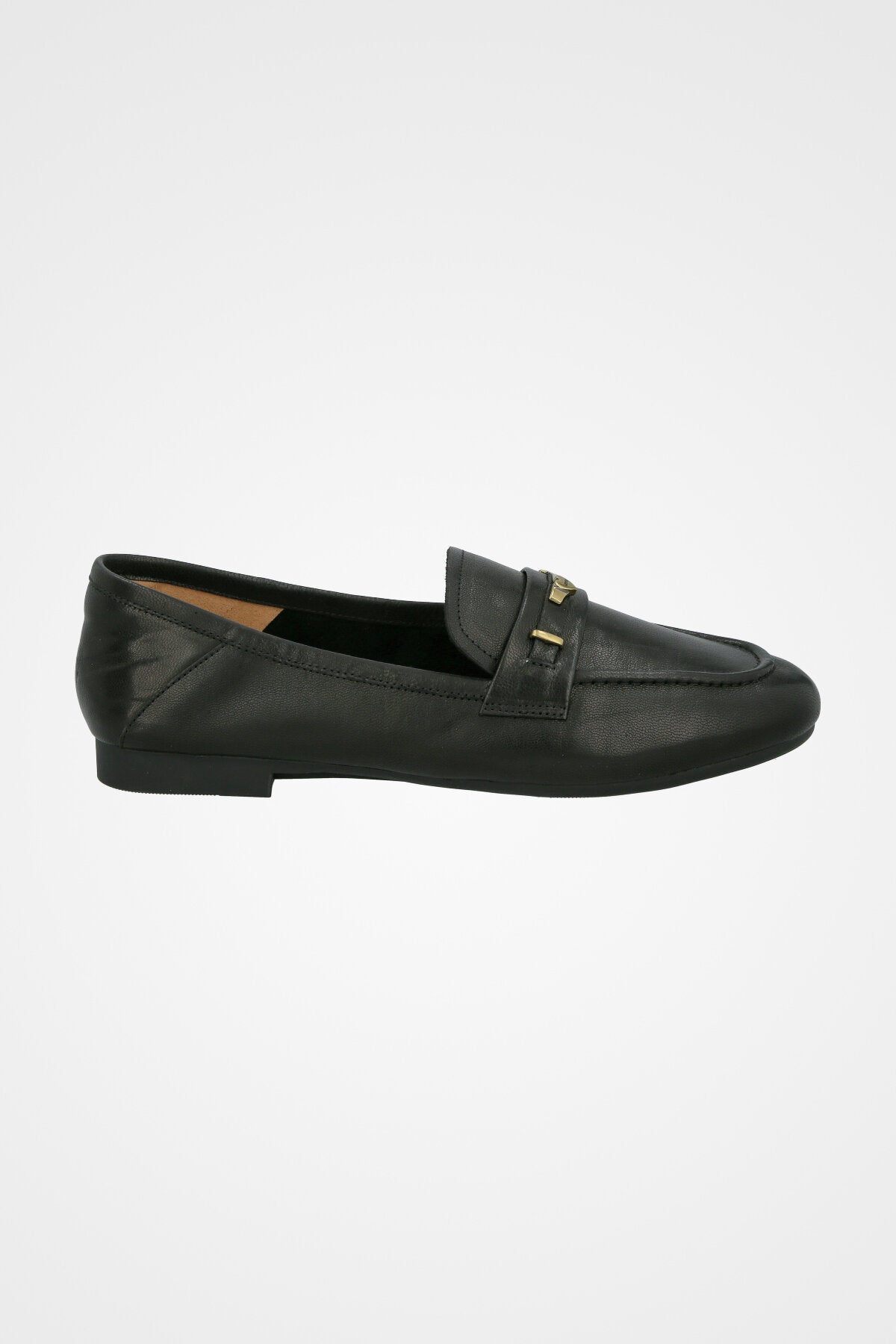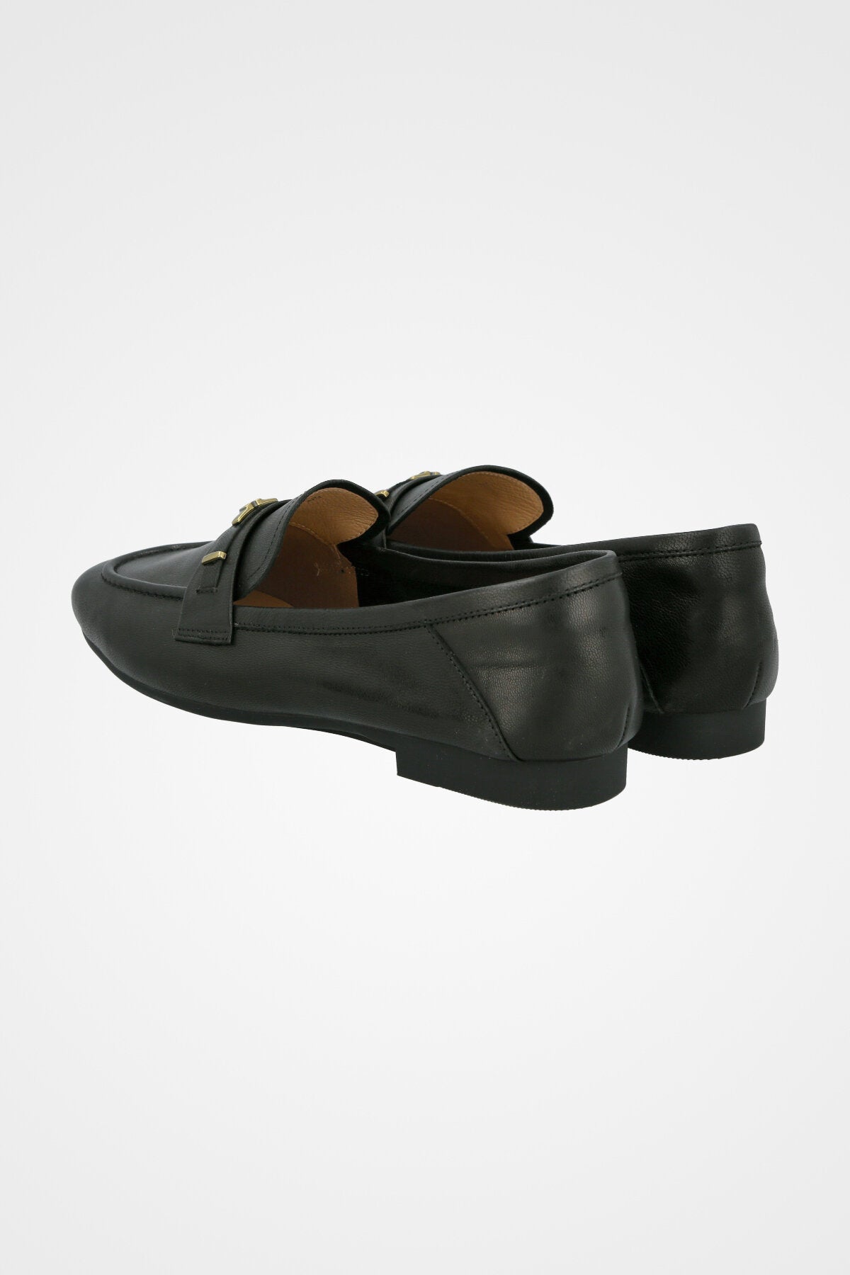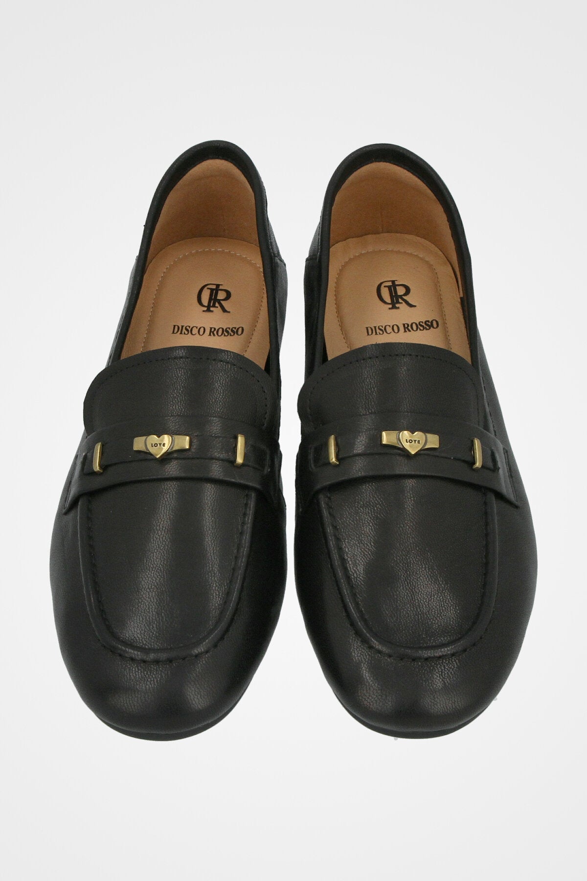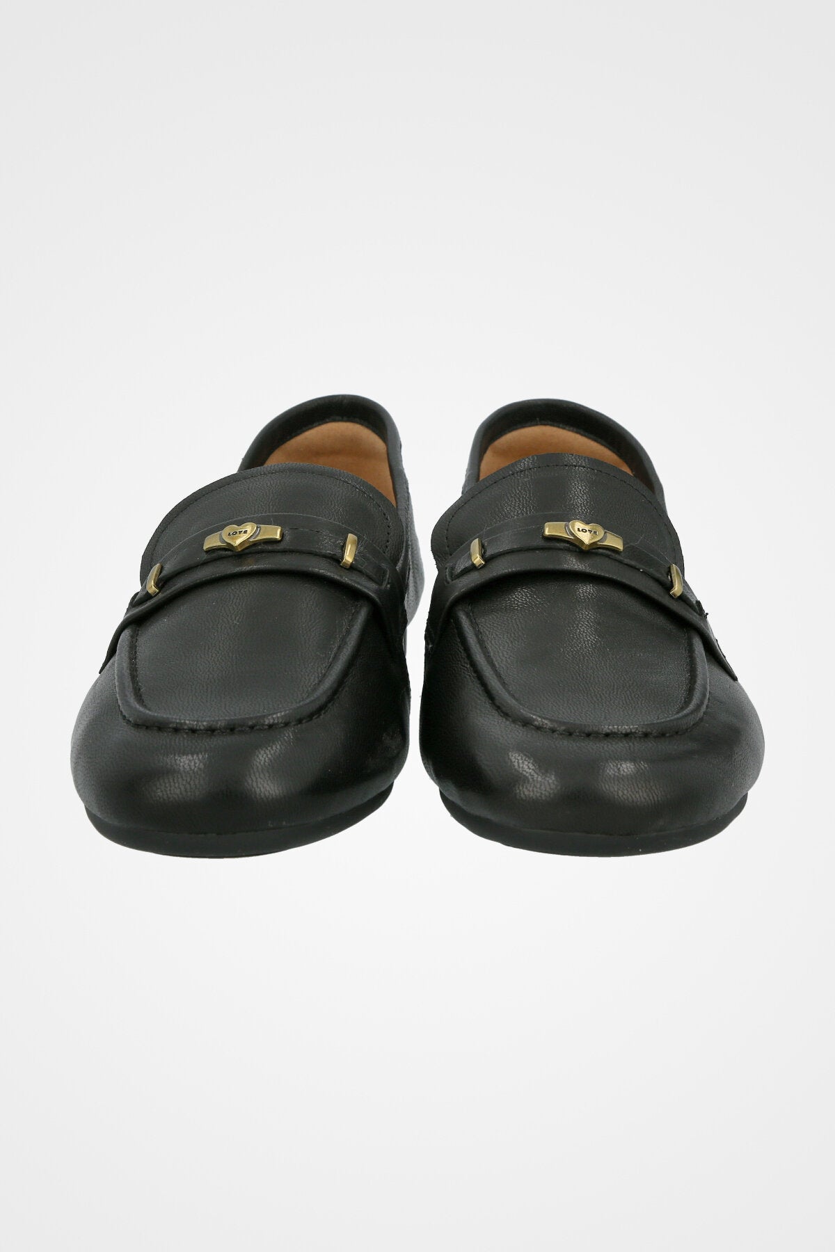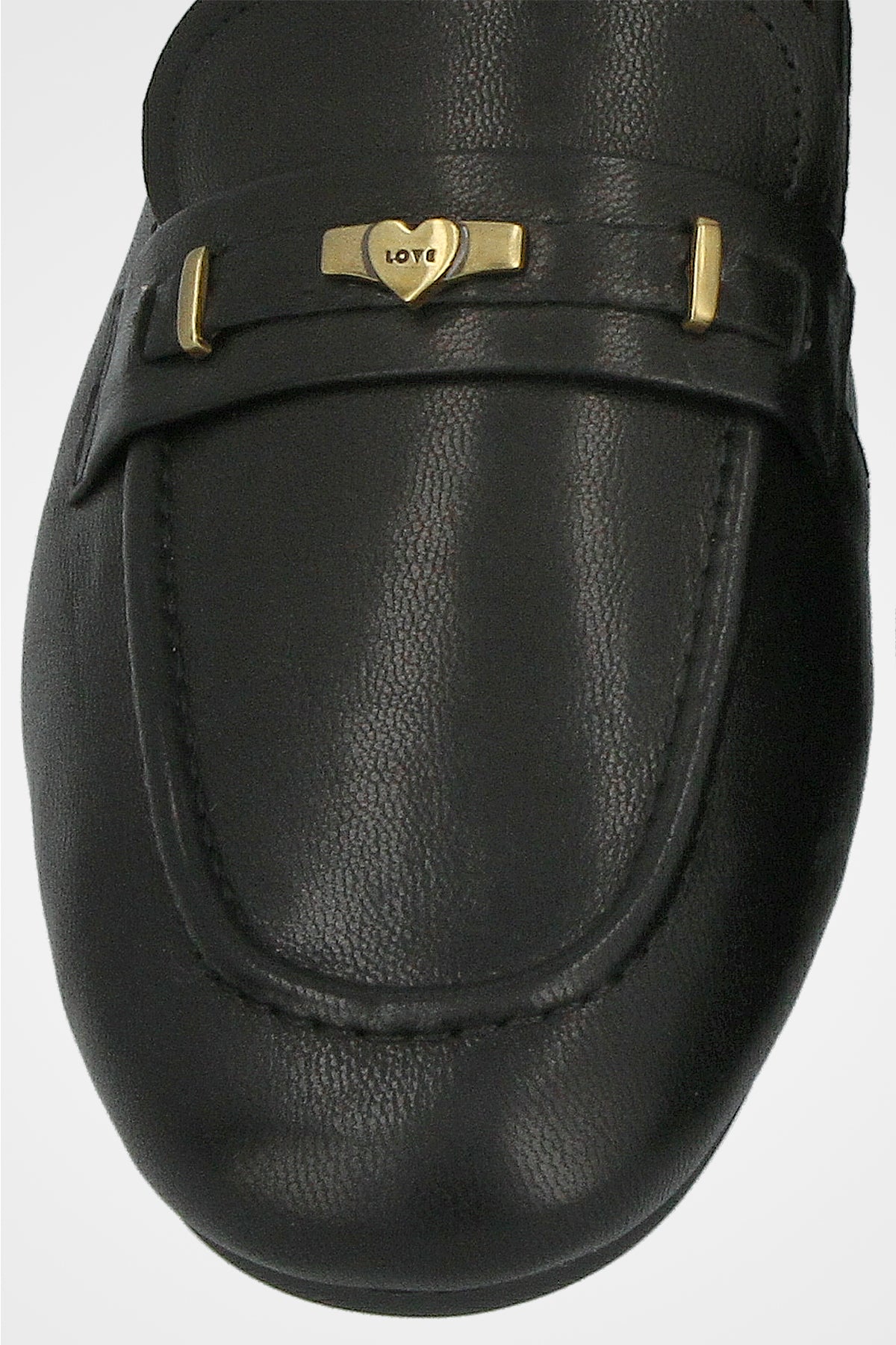 נעל מוקסין עור שחורה, בעלת חרטום מעוגל עם תפר קדמי, רצועה קדמית ועיטור מתכת זהוב בצורת לב
