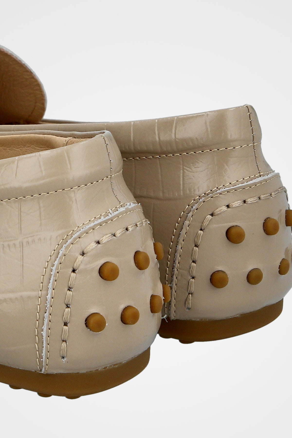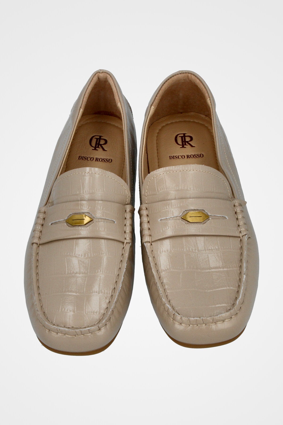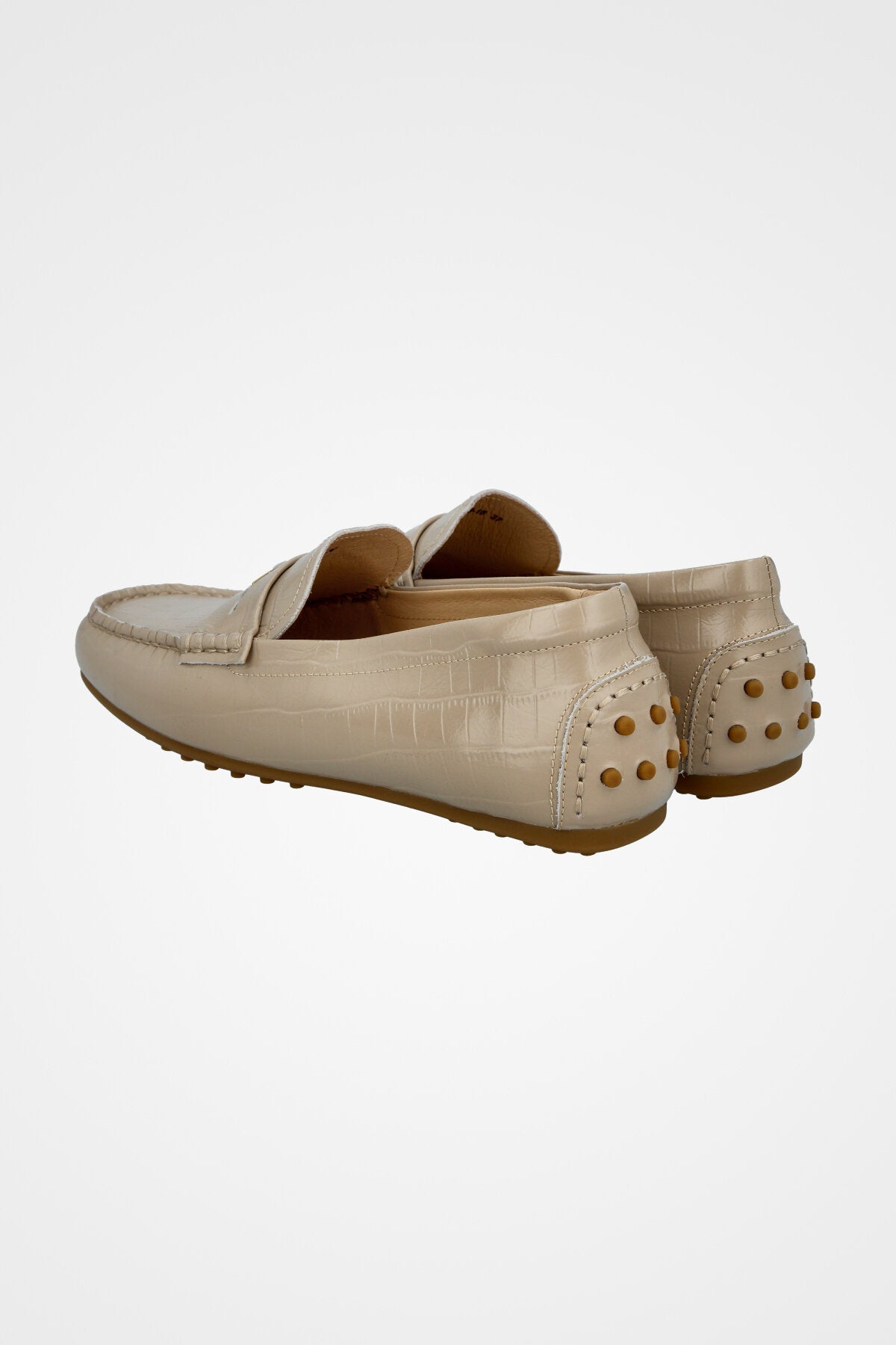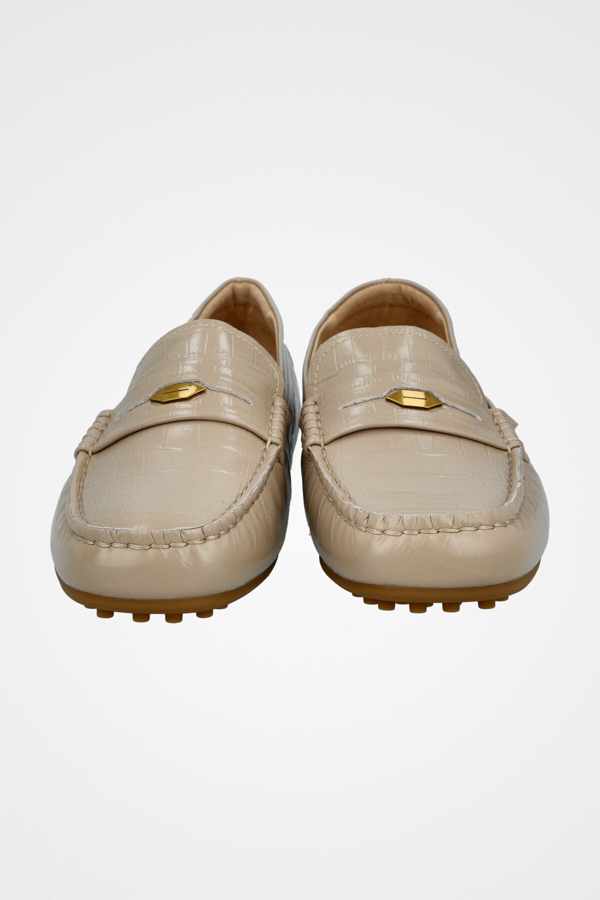 נעל מוקסין בצבע בז׳ בהיר, חרטום מעוגל, תפרים עליוניים בולטים ורצועת עור עם אבזם מתכת זהוב