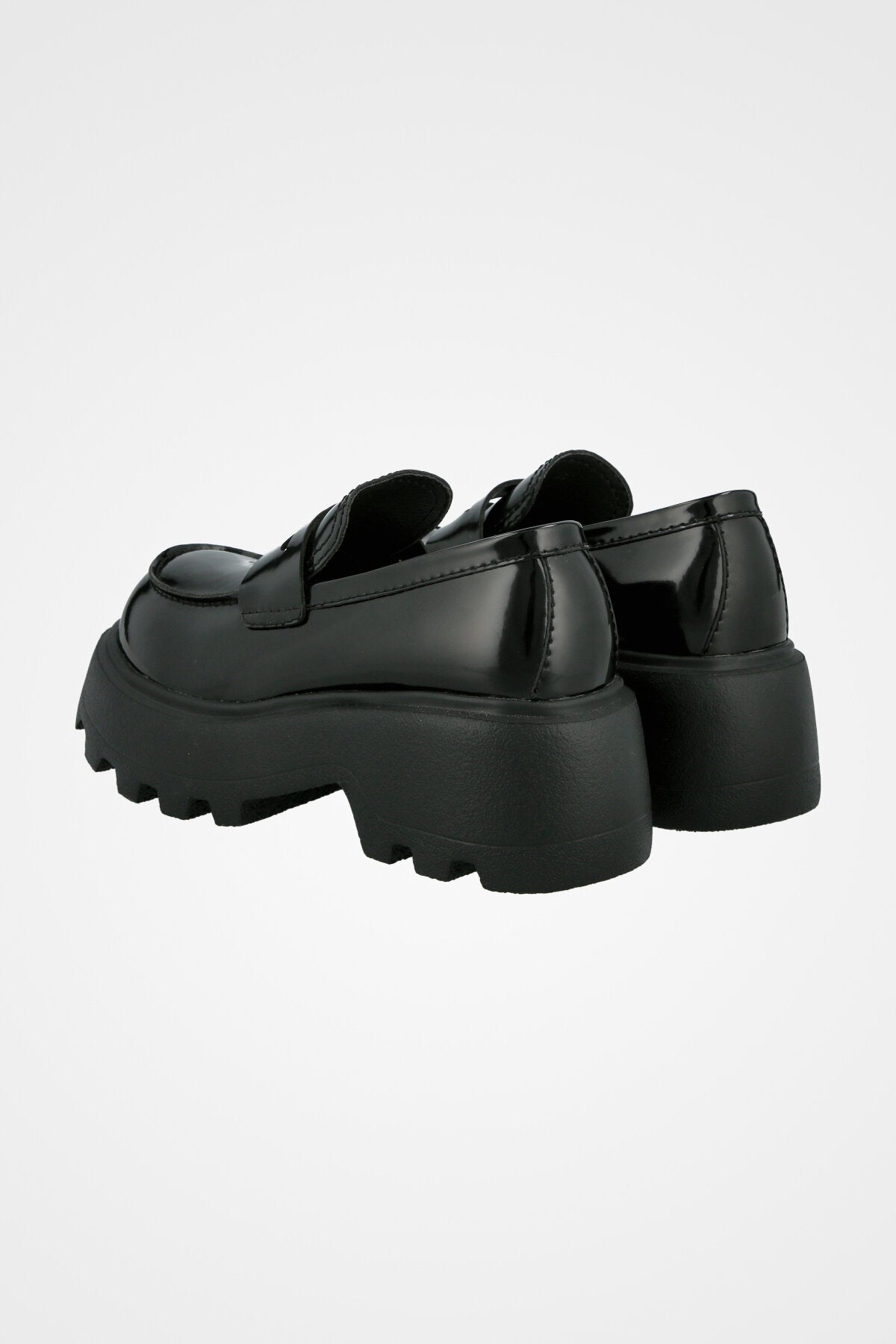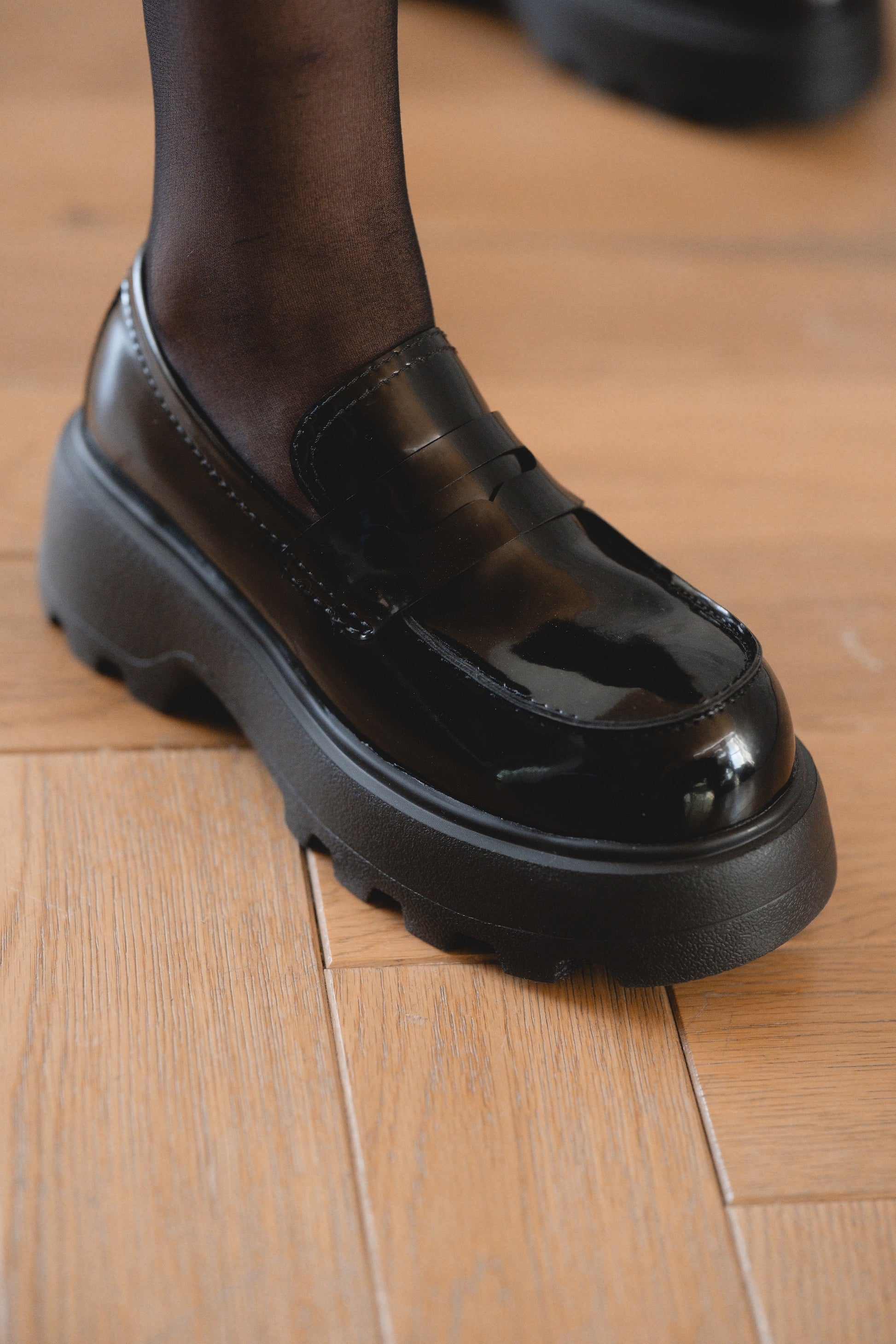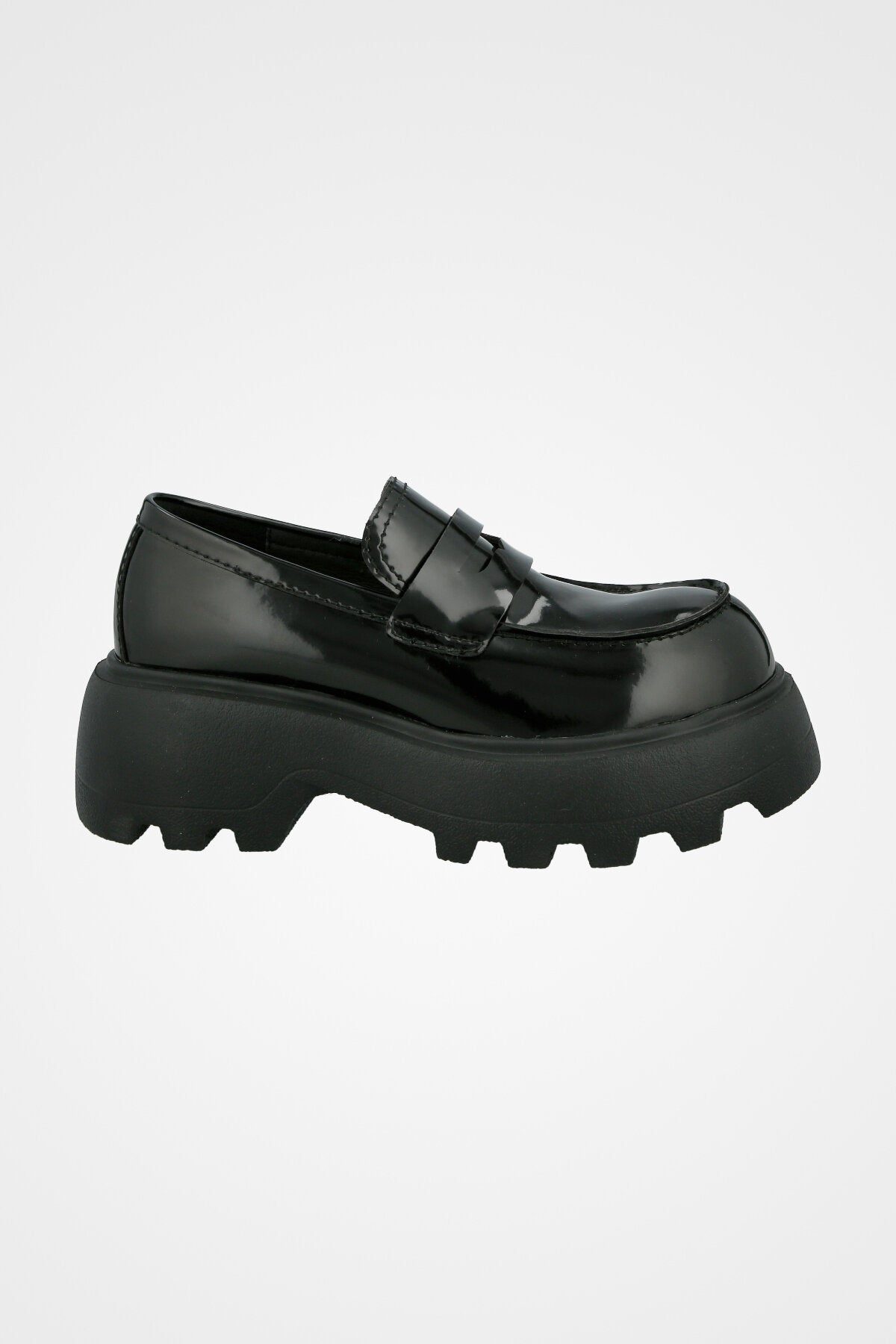 נעל מוקסין טרק שחורה מבריקה, בעלת חרטום מעוגל, רצועת עור בחזית וסוליה שחורה, עבה ומשוננת