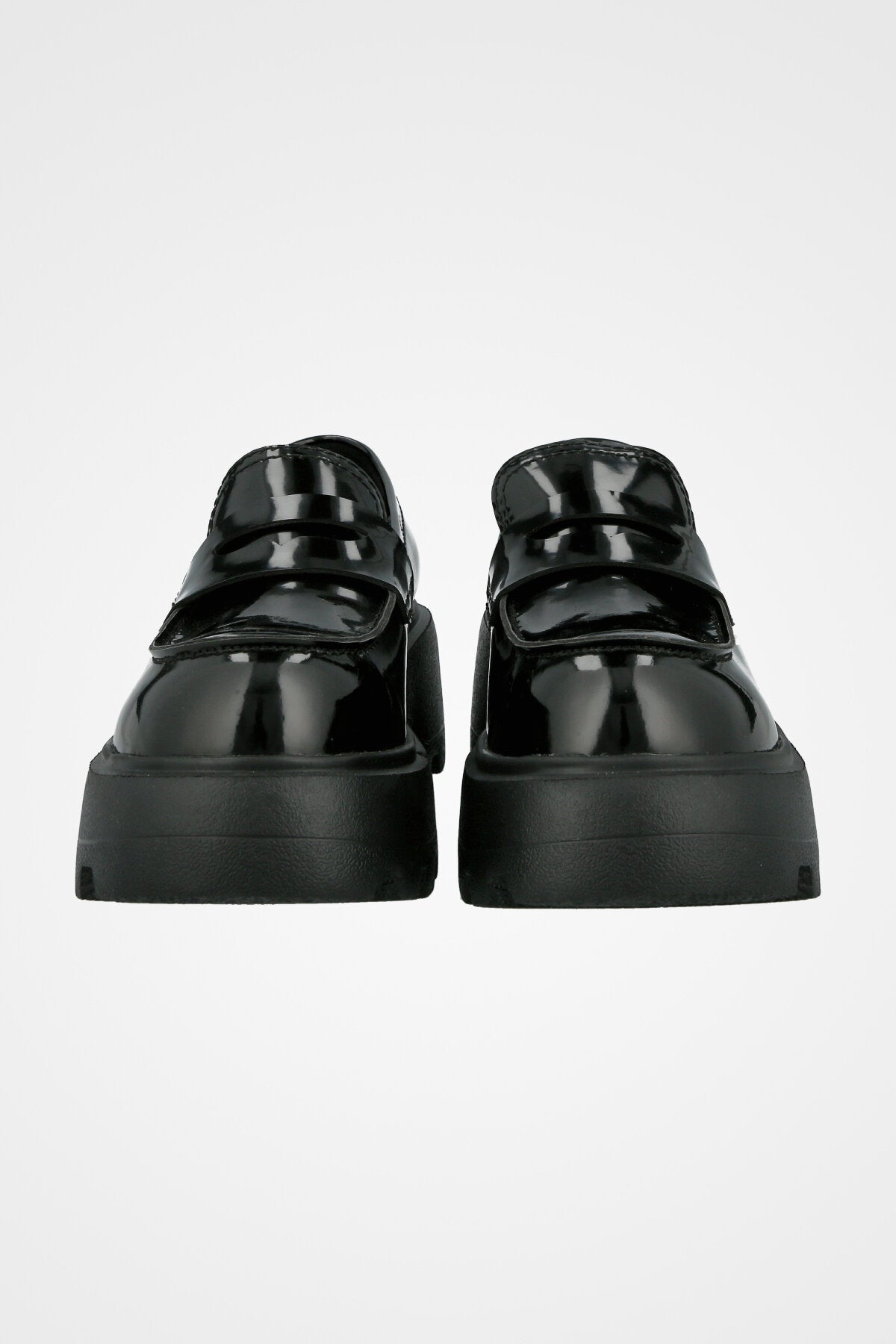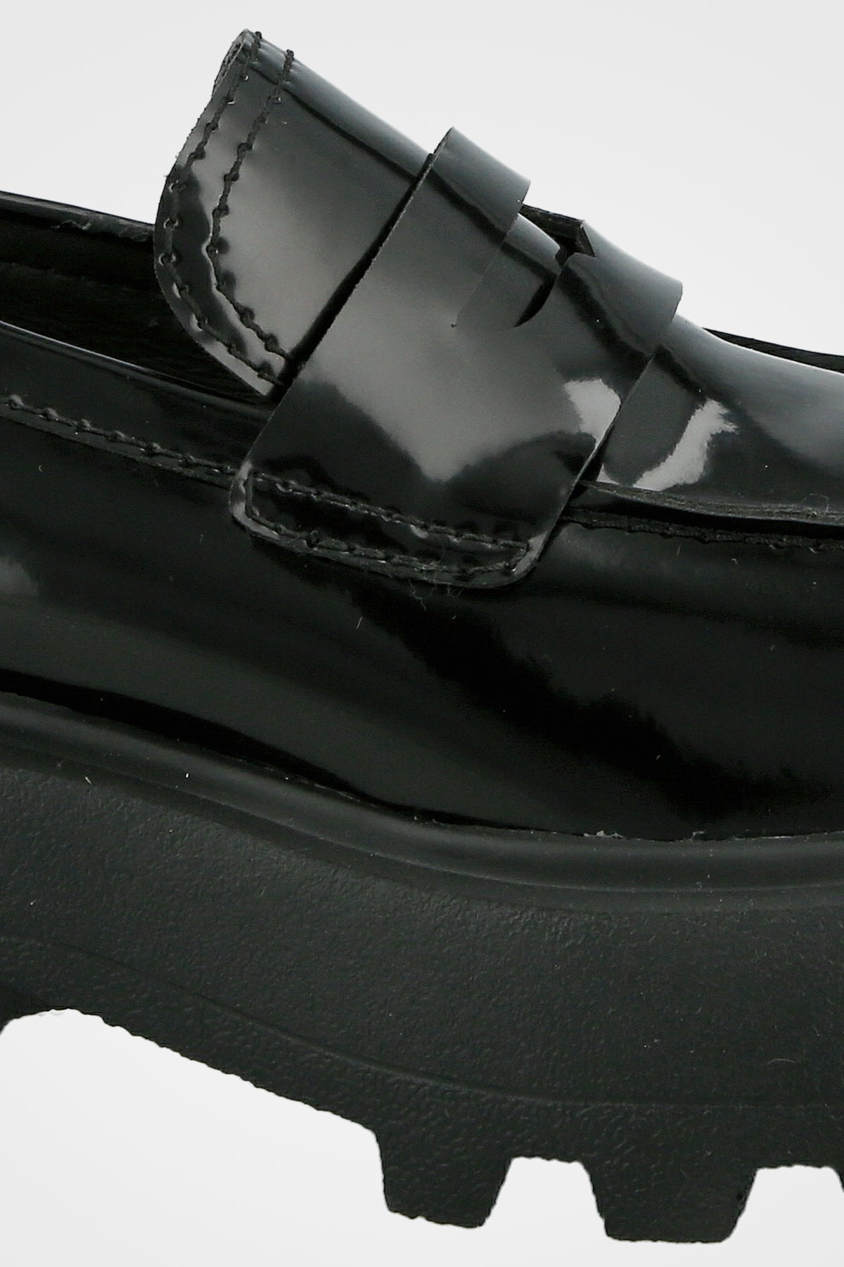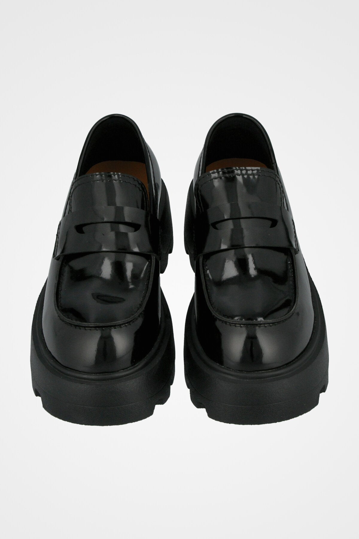 נעל מוקסין טרק שחורה מבריקה, בעלת חרטום מעוגל, רצועת עור בחזית וסוליה שחורה, עבה ומשוננת