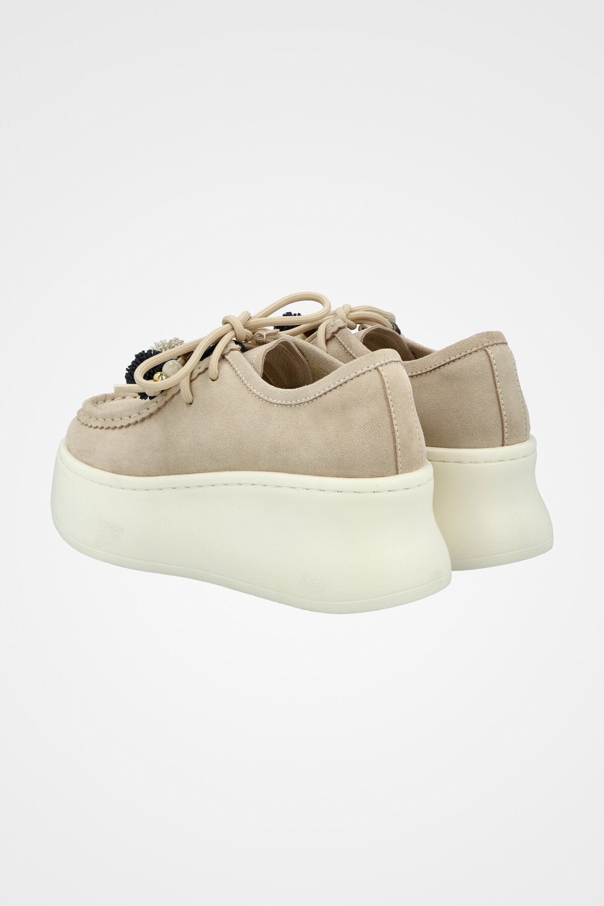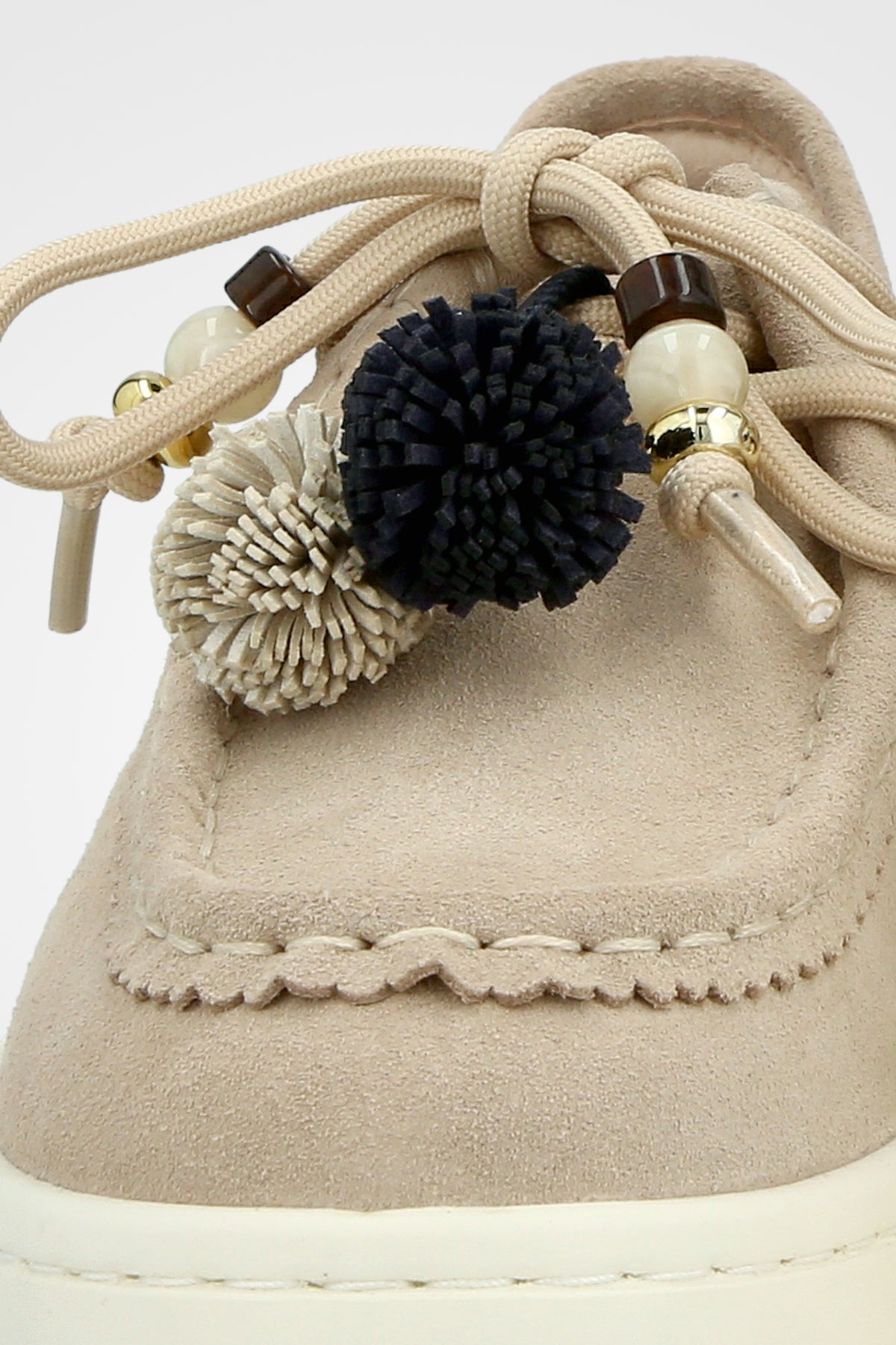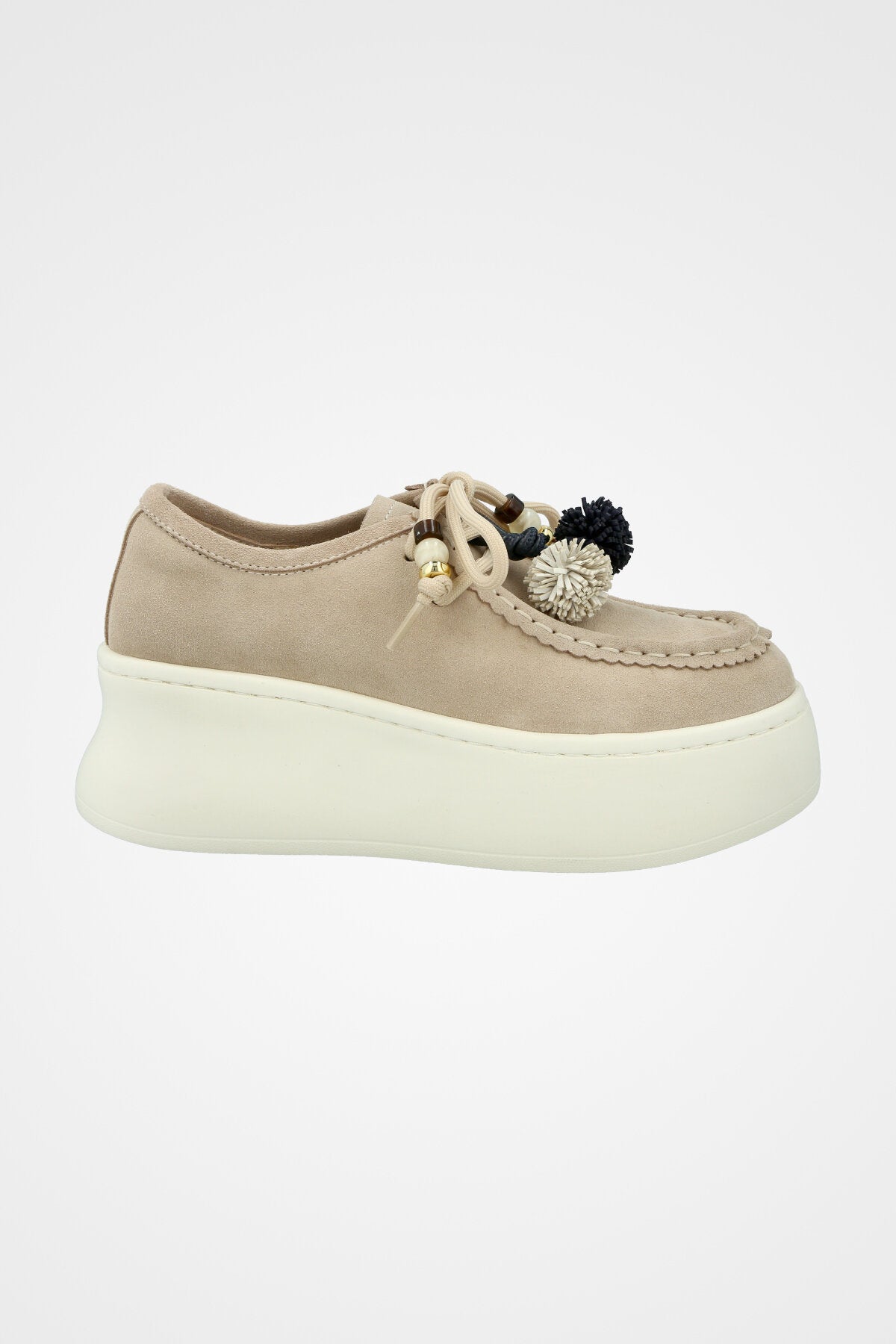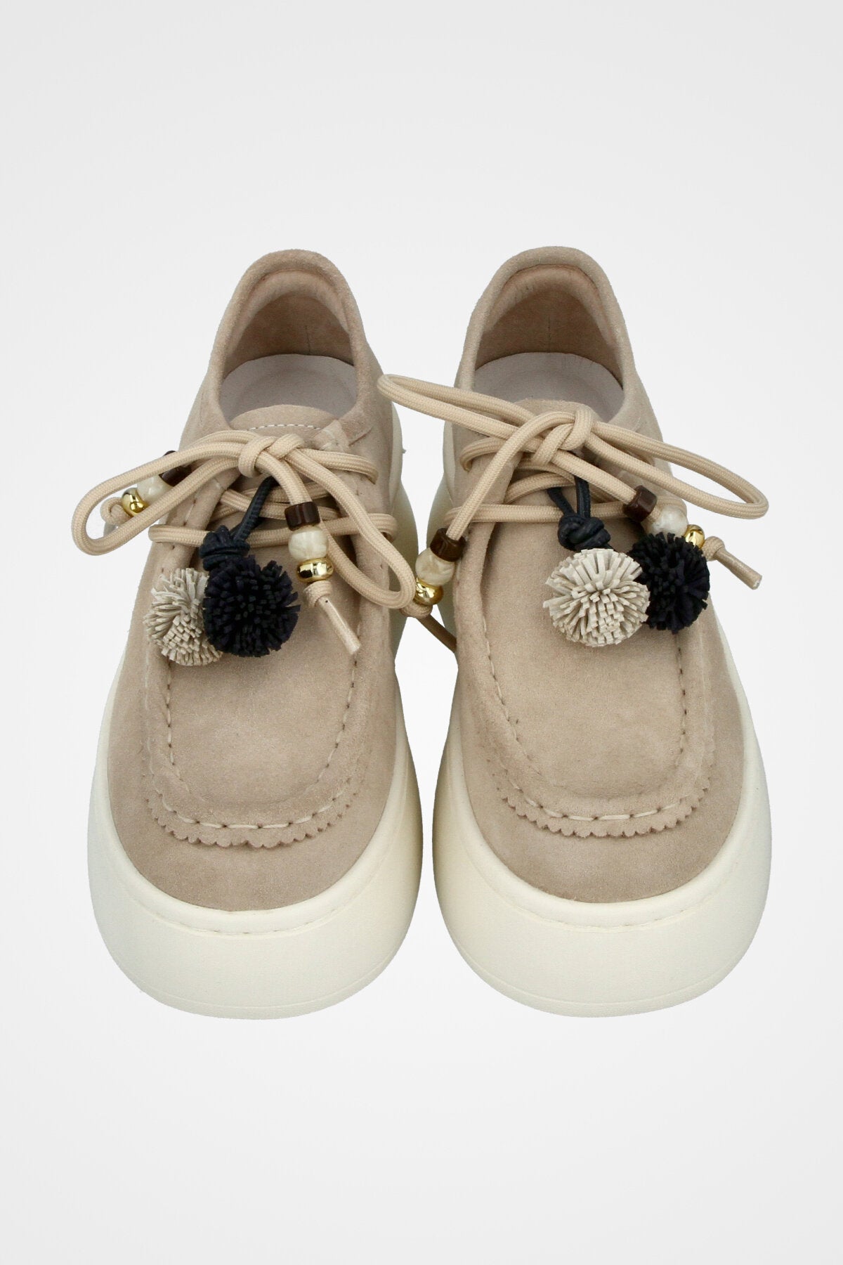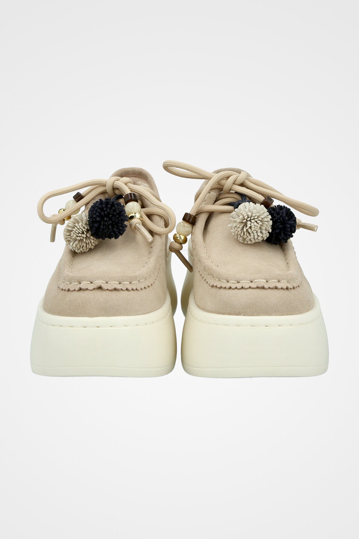 נעל מוקסין בצבע בז׳ עם סולייה לבנה עבה, גפה זמשית, וקישוטי פונפונים וחרוזים בחזית