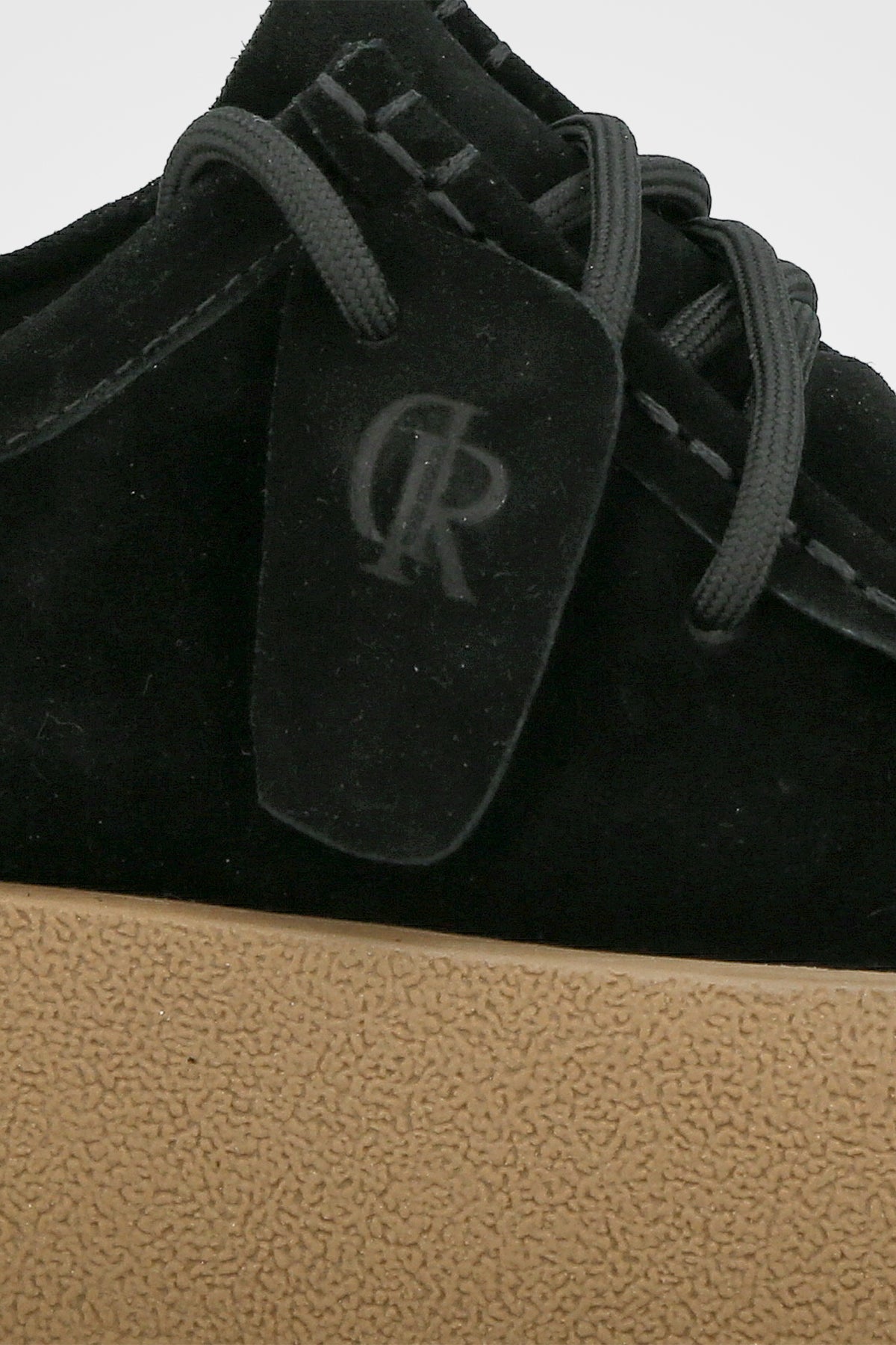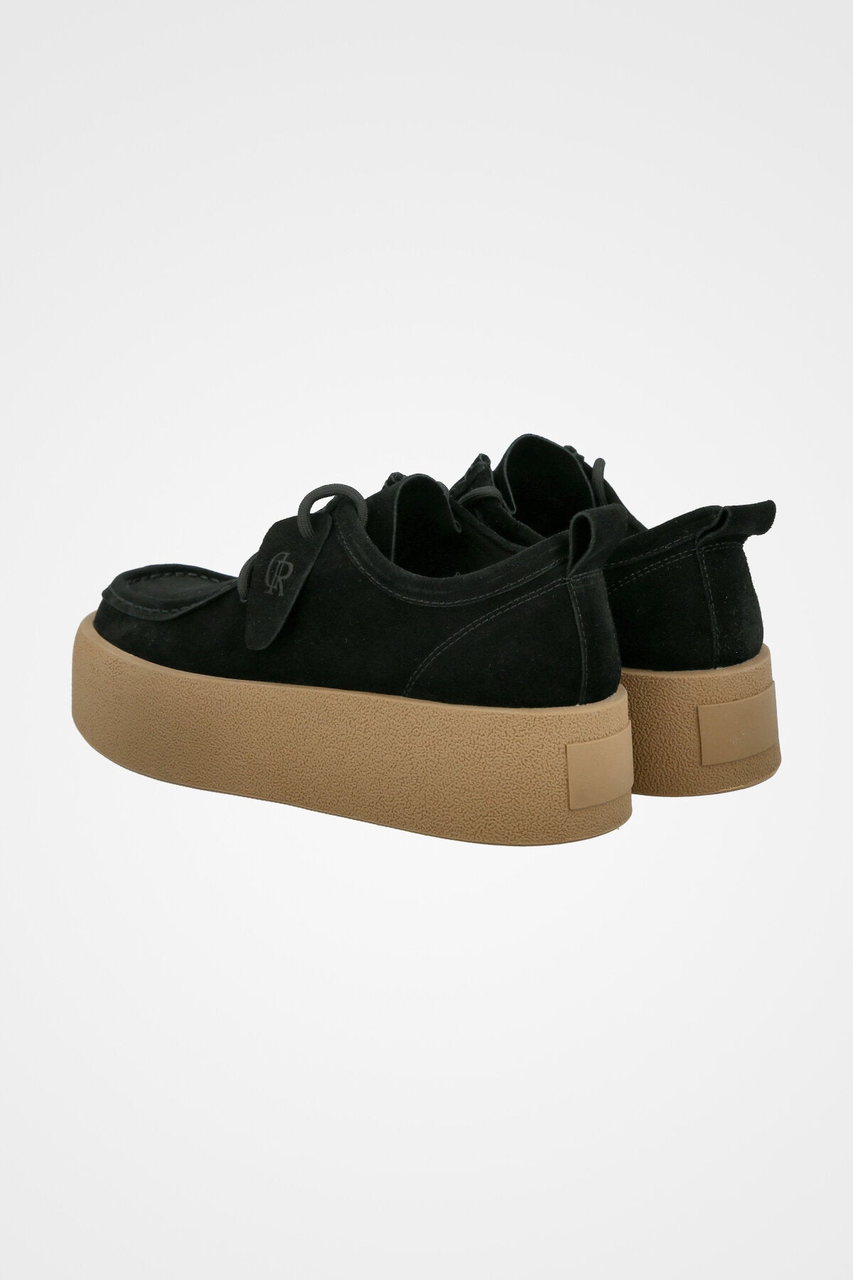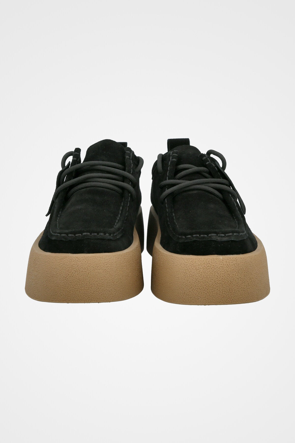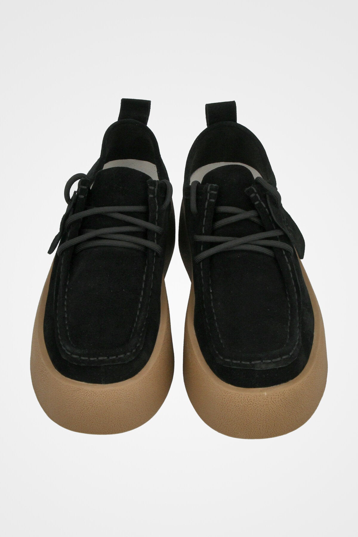 נעל מוקסין בצבע שחור מעור זמש, בעלת שרוכים קדמיים, חרט ומעוגל ותפר עליון, עם סוליה עבה בגוון בז׳ טבעי
