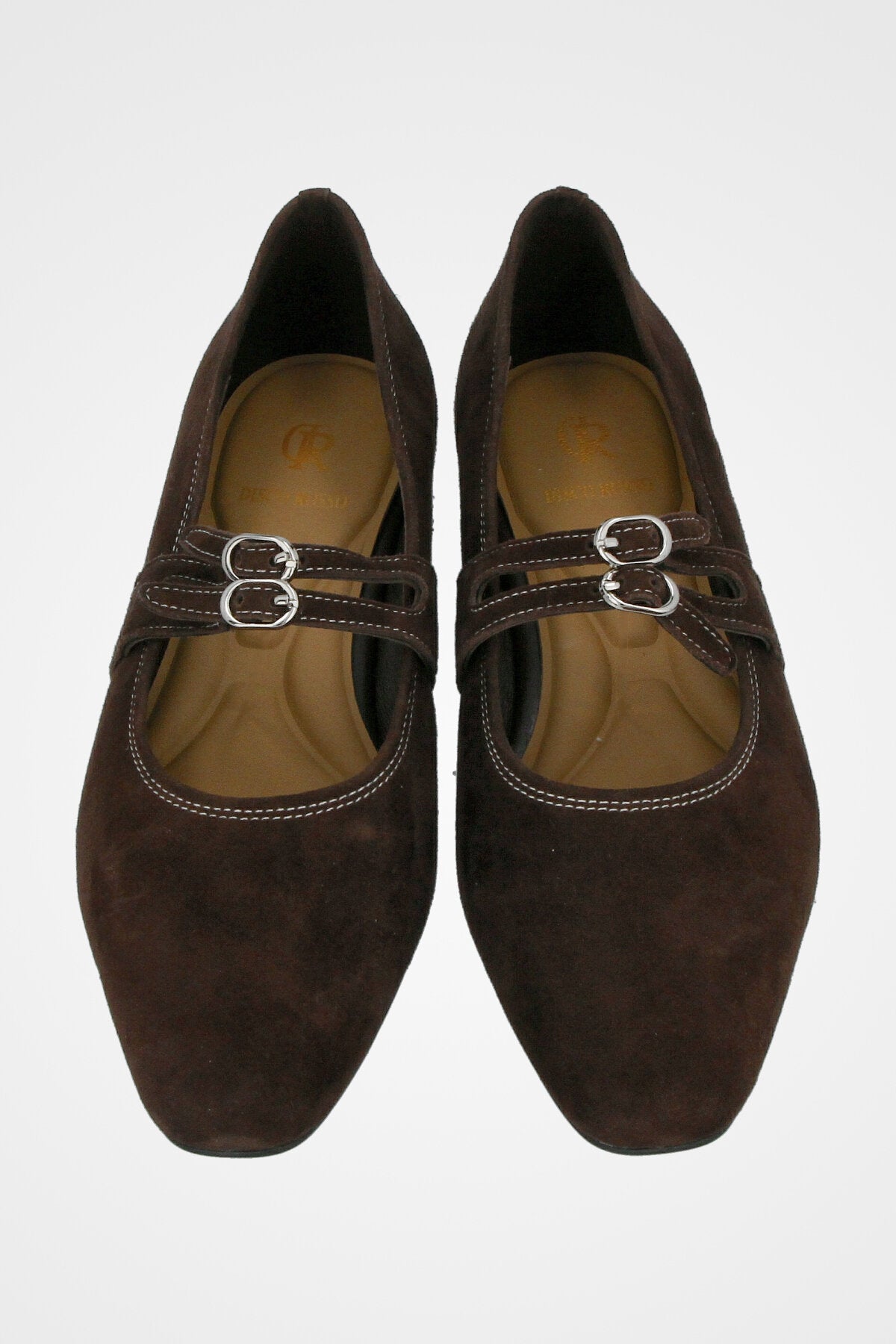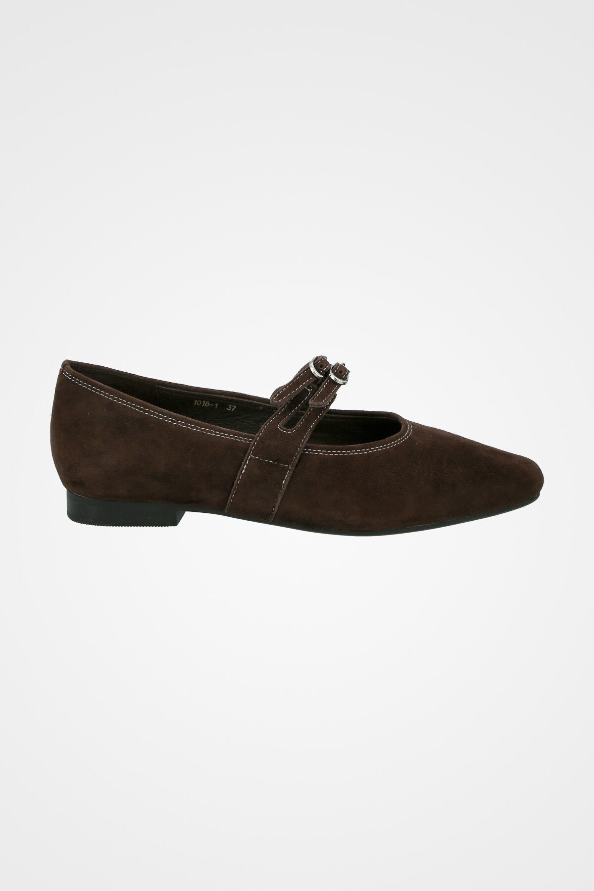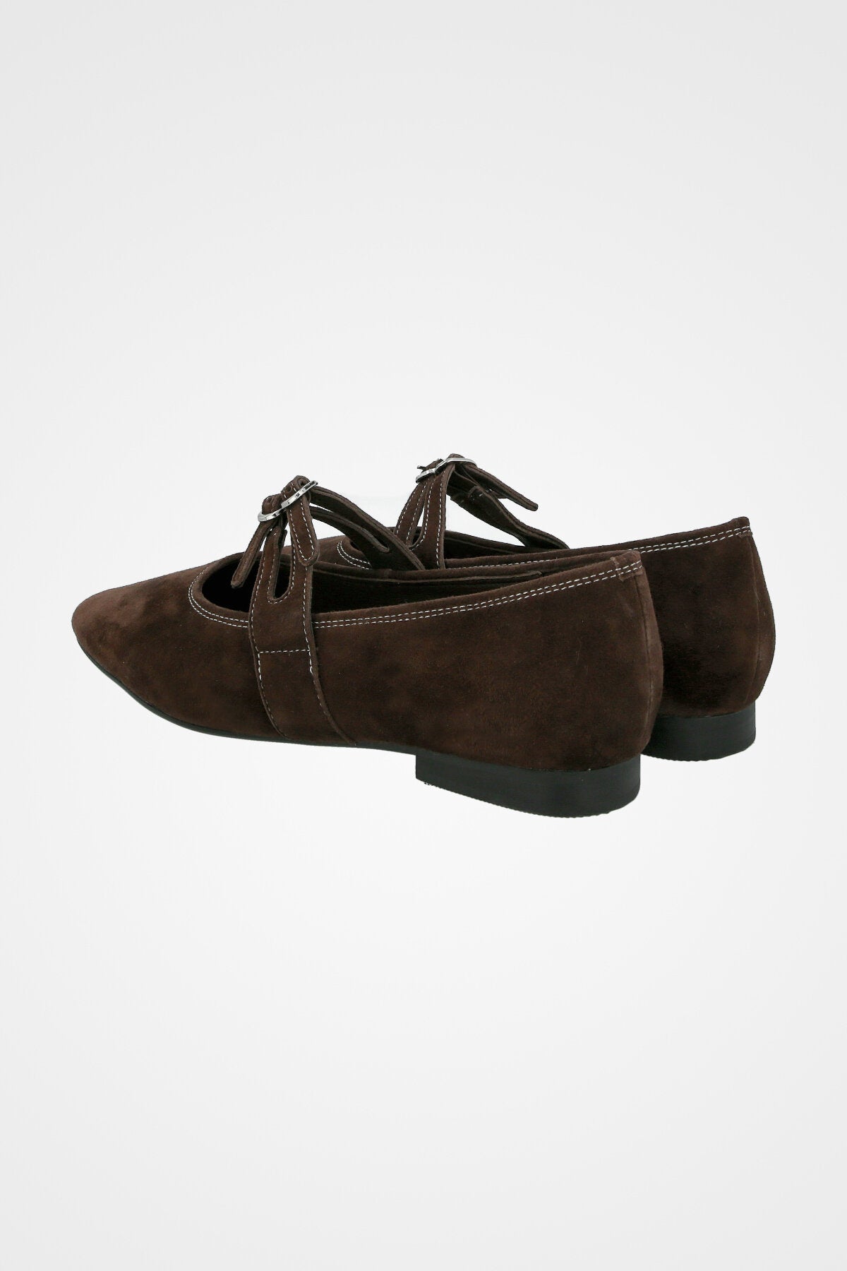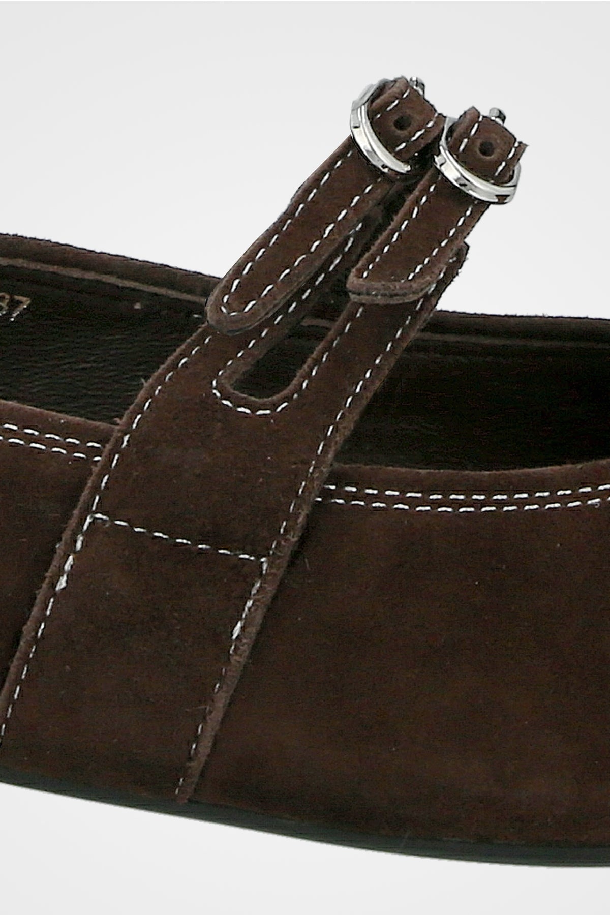 נעל בלרינה חומה זמש, עם שתי רצועות וסוגרי אבזם כסף כפולים לעיטור אלגנטי